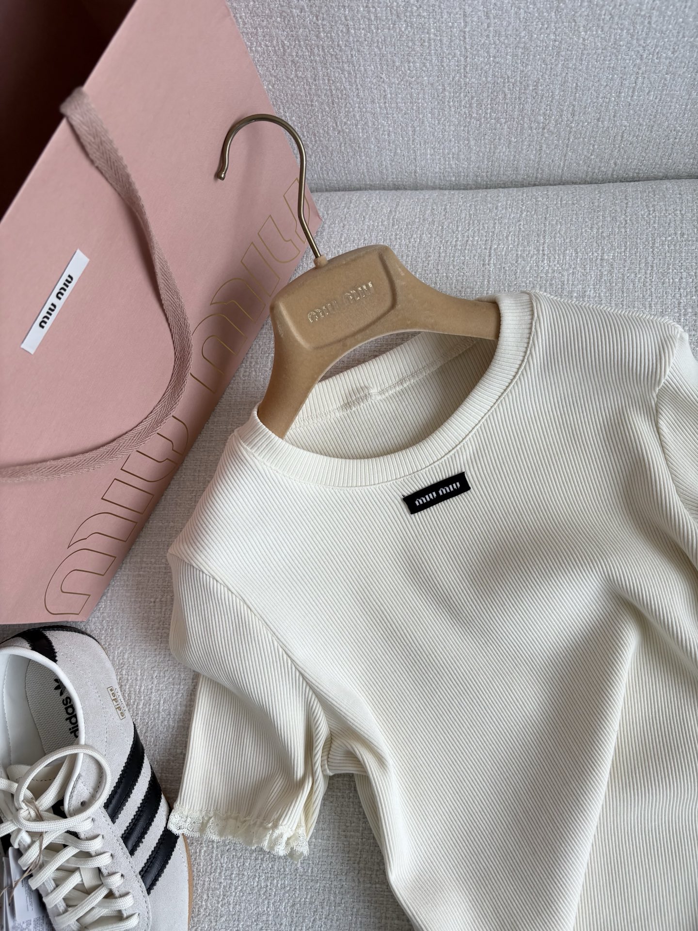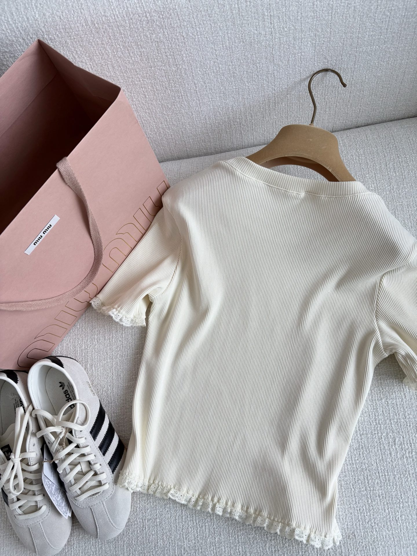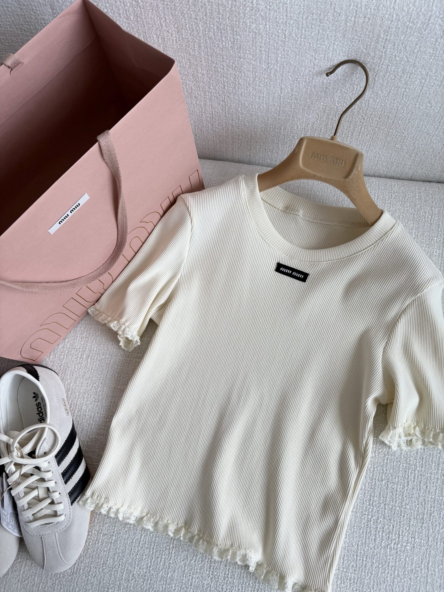 Home / T-shirt / NIGO MiuMiu Lace White Knitted T-shirt Women's Spring And Summer Fashionable And Elegant Slim Patch Logo Round Neck Short-sleeved T-shirt Tops #nigo81439