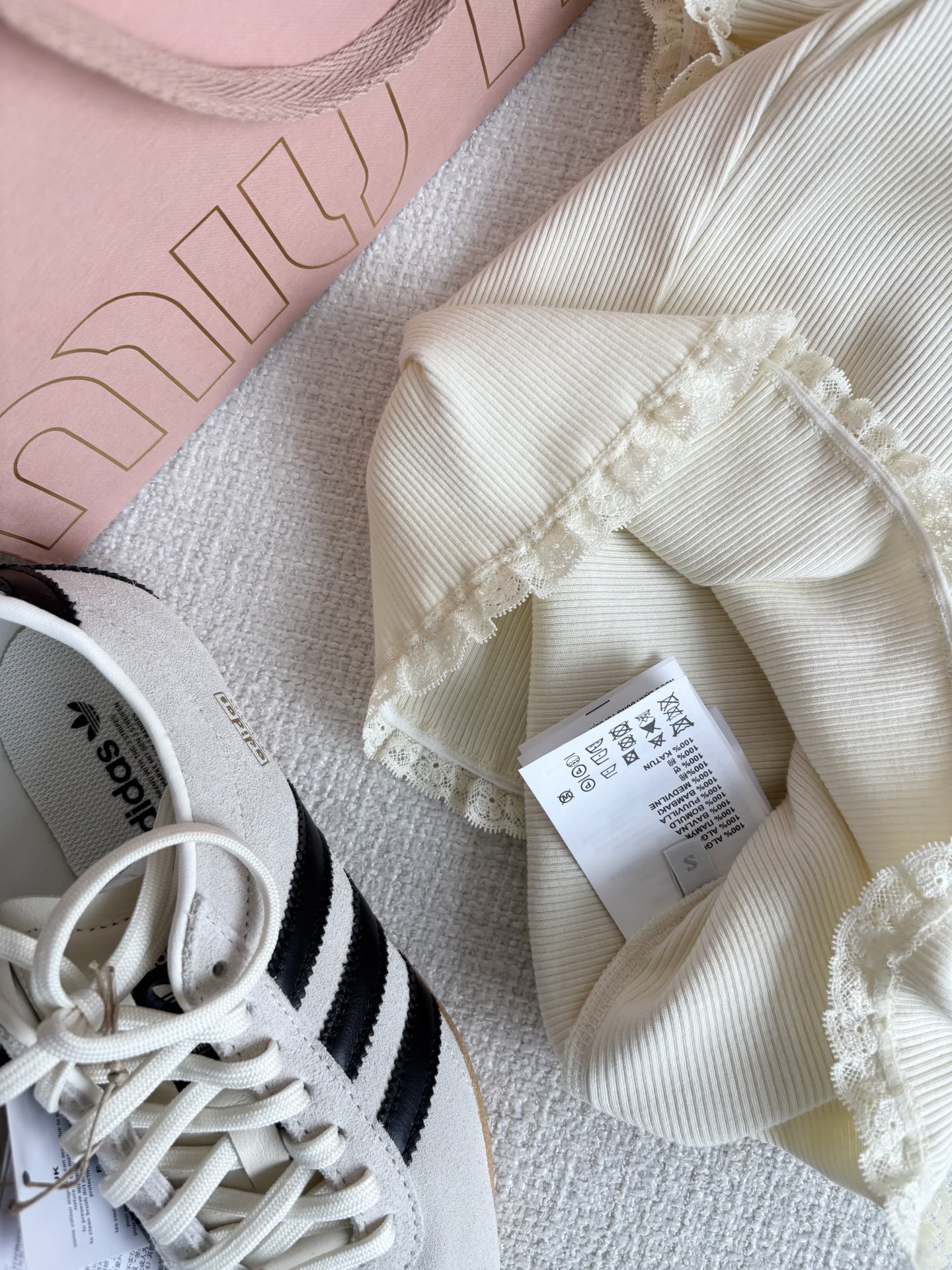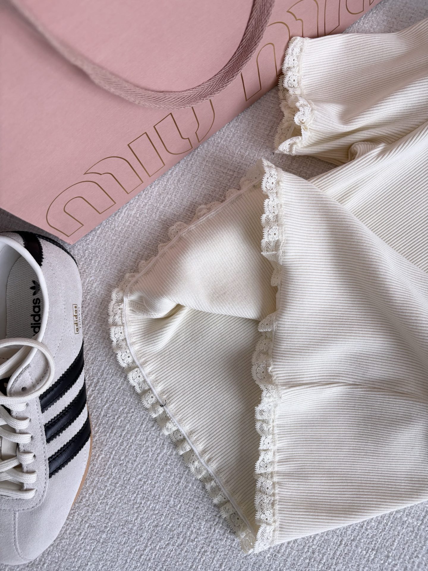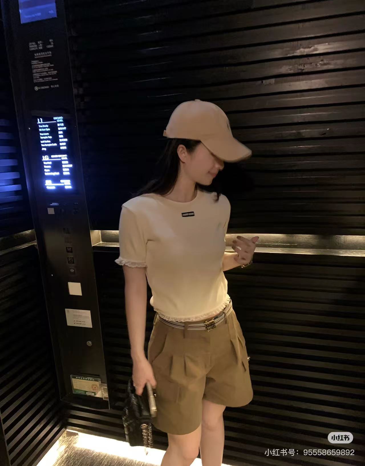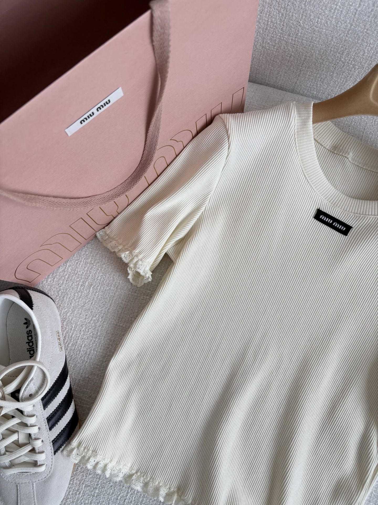 Home / T-shirt / NIGO MiuMiu Lace White Knitted T-shirt Women's Spring And Summer Fashionable And Elegant Slim Patch Logo Round Neck Short-sleeved T-shirt Tops #nigo81439