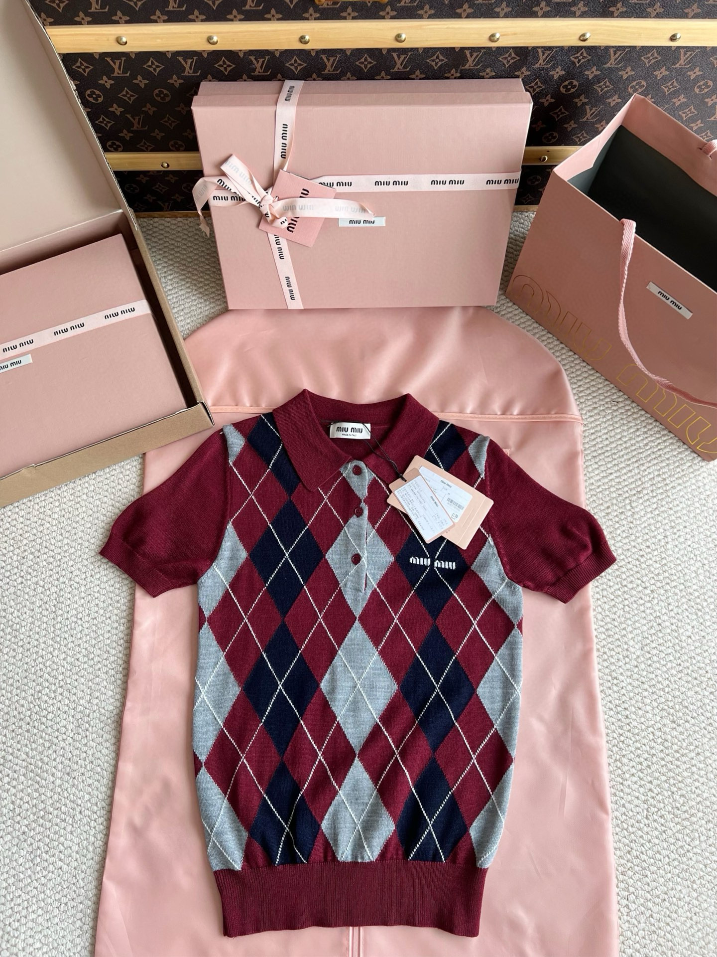 NIGO MiuMiu Women's Summer Fashion Casual Collared Diamond Pattern Wool Polo Shirt Short Sleeve T-shirt #nigo78464
