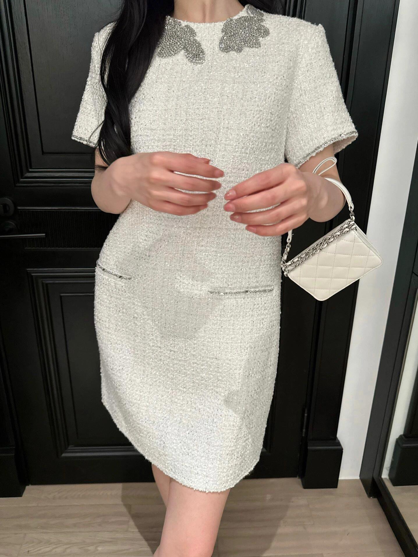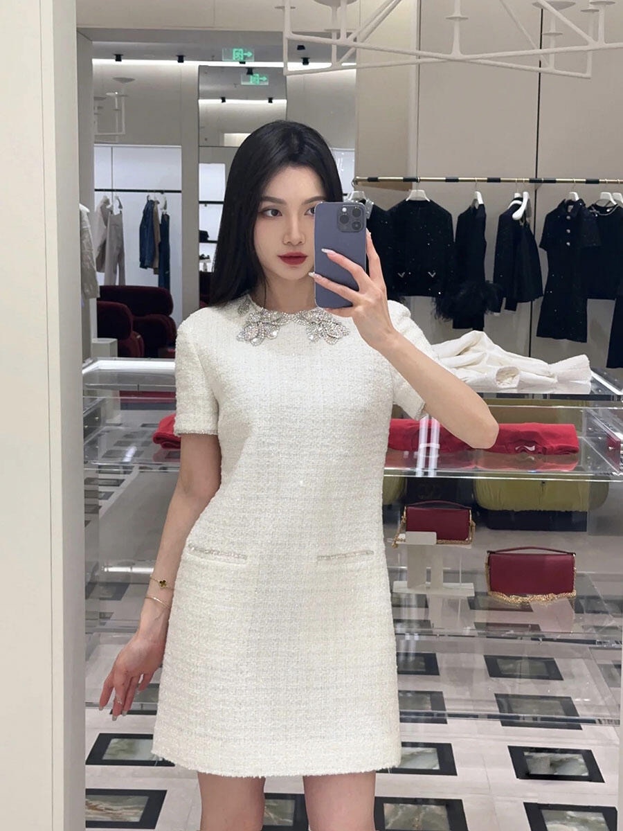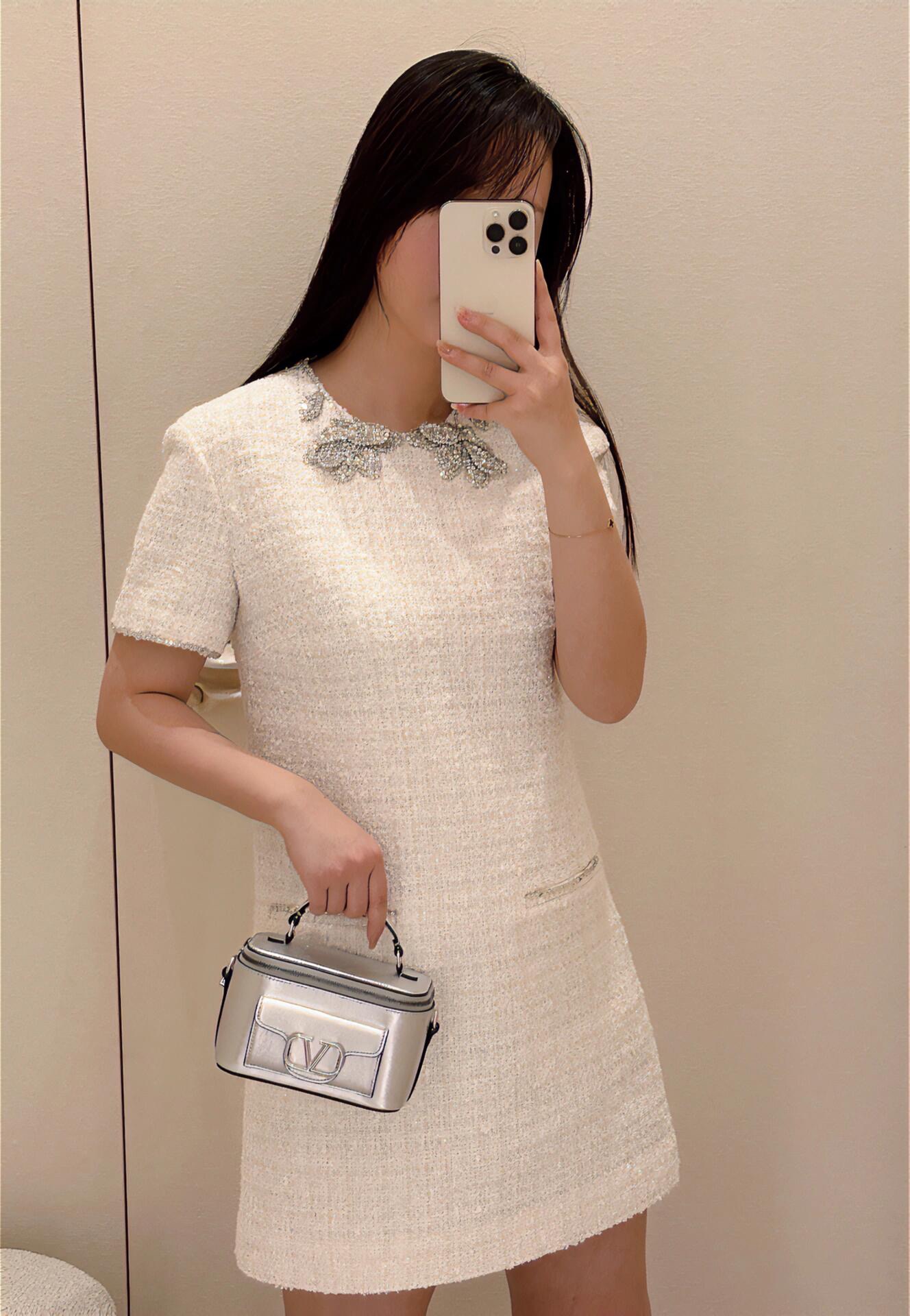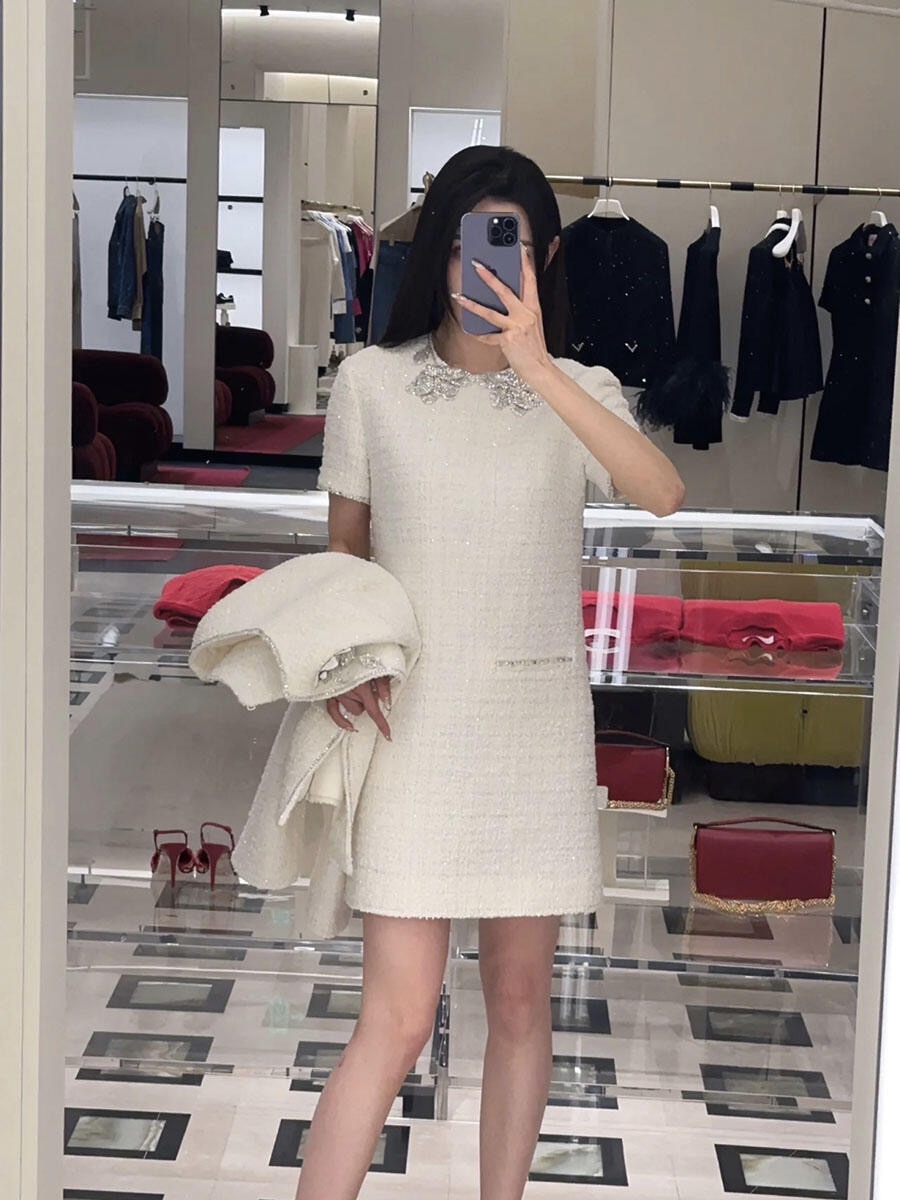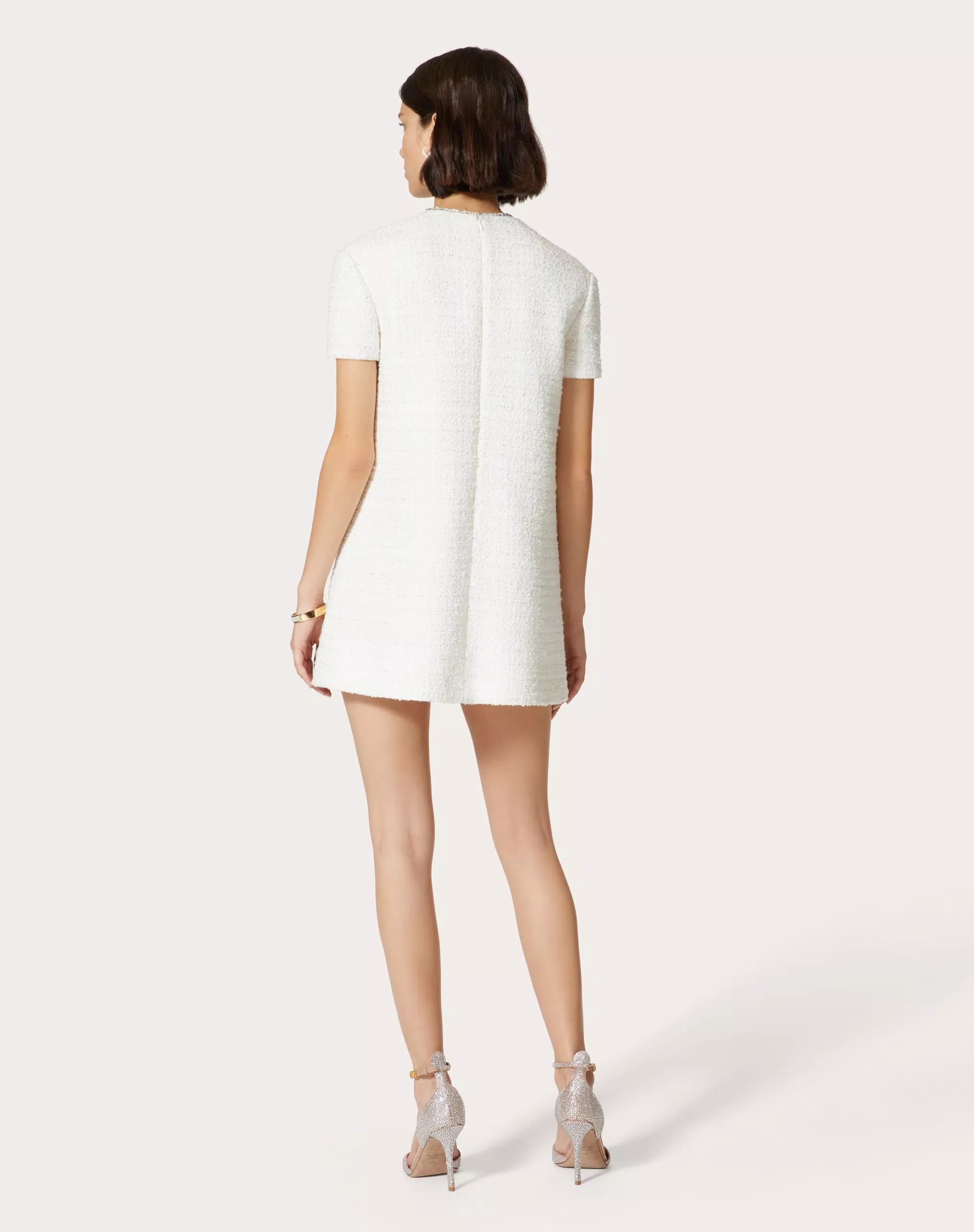 NIGO Valentino Women's Summer Zipper Round Neck Tweed Embroidered White Short Fit Dress Ngvp #nigo8684