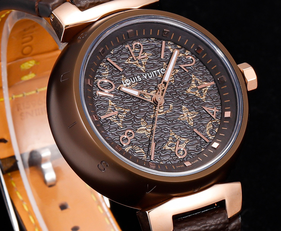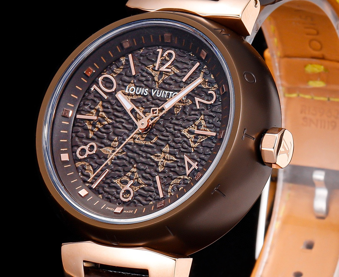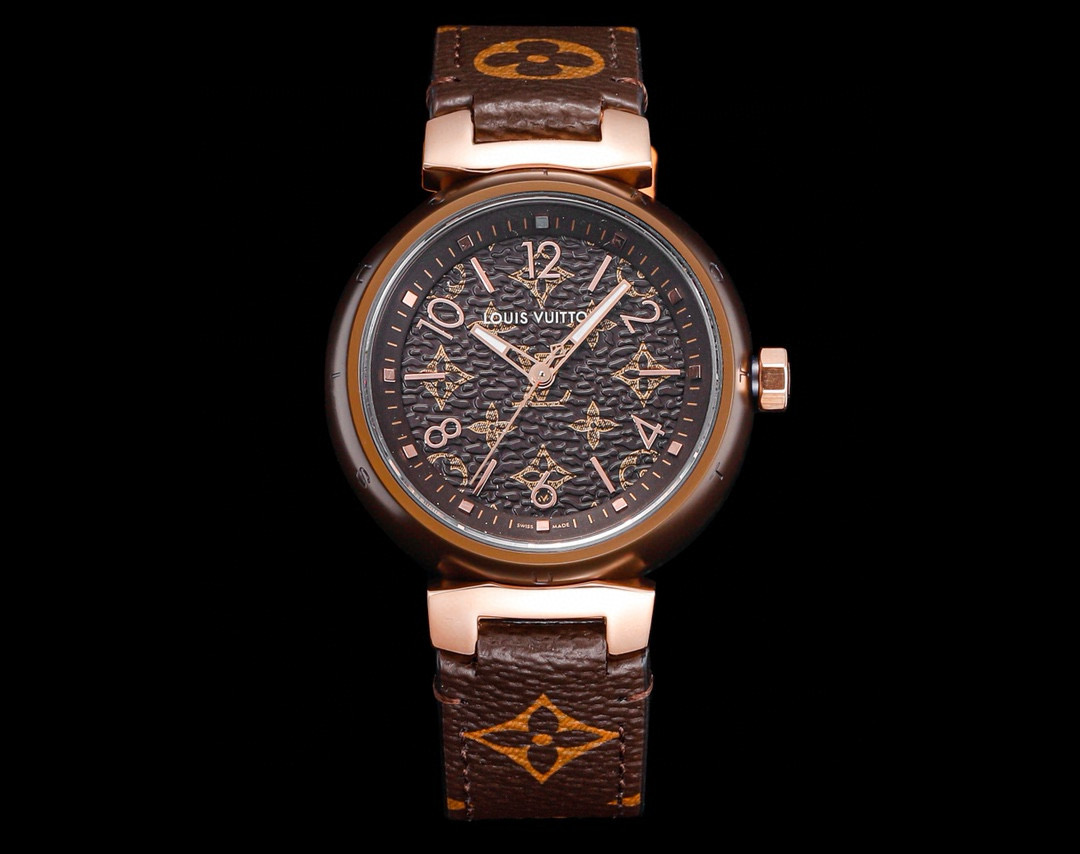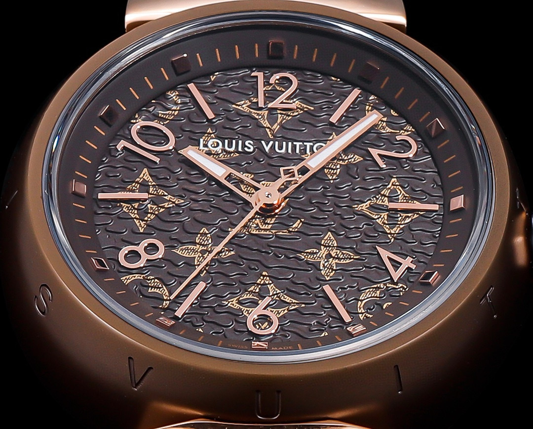 NIGO Louis Vuitton Tambour Monogram Watch Quartz Movement Canvas Strap 34mm Tan Dial 100m Water Resistant #nigo98642
