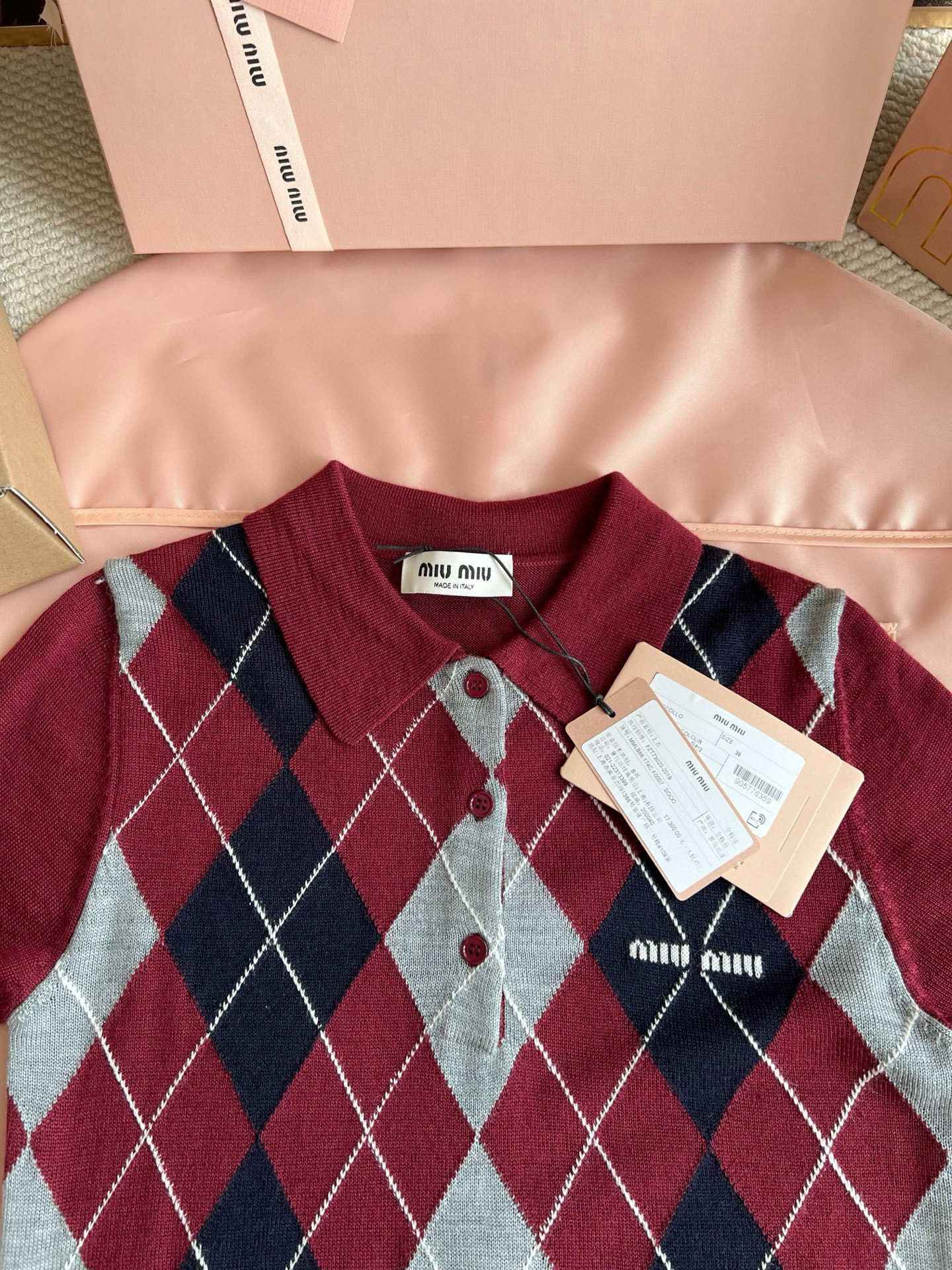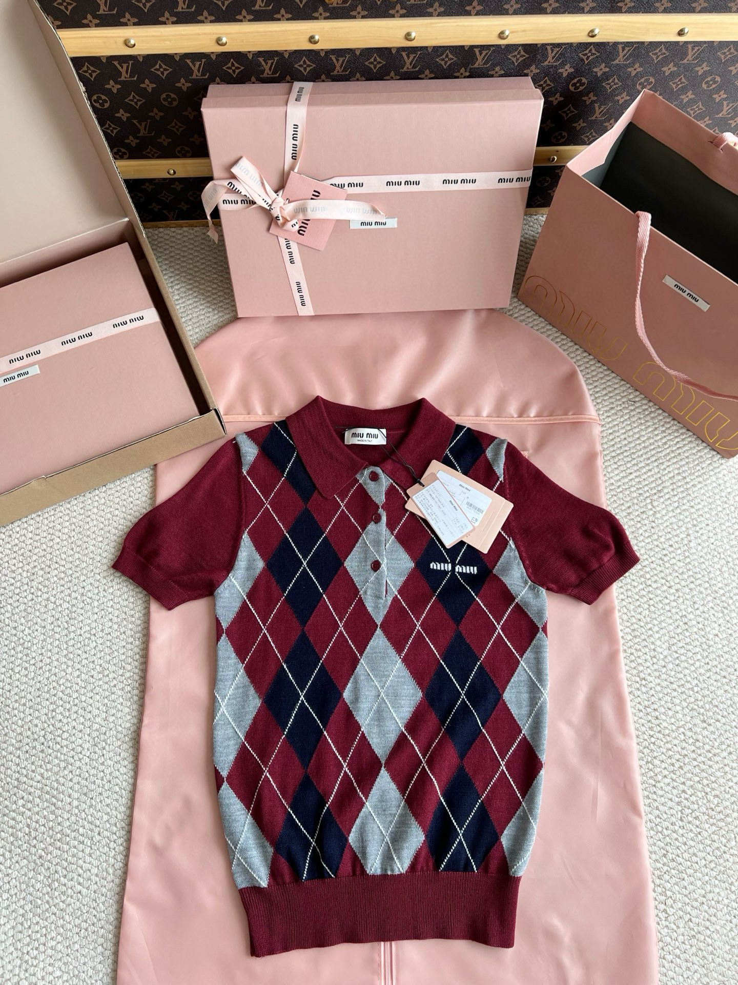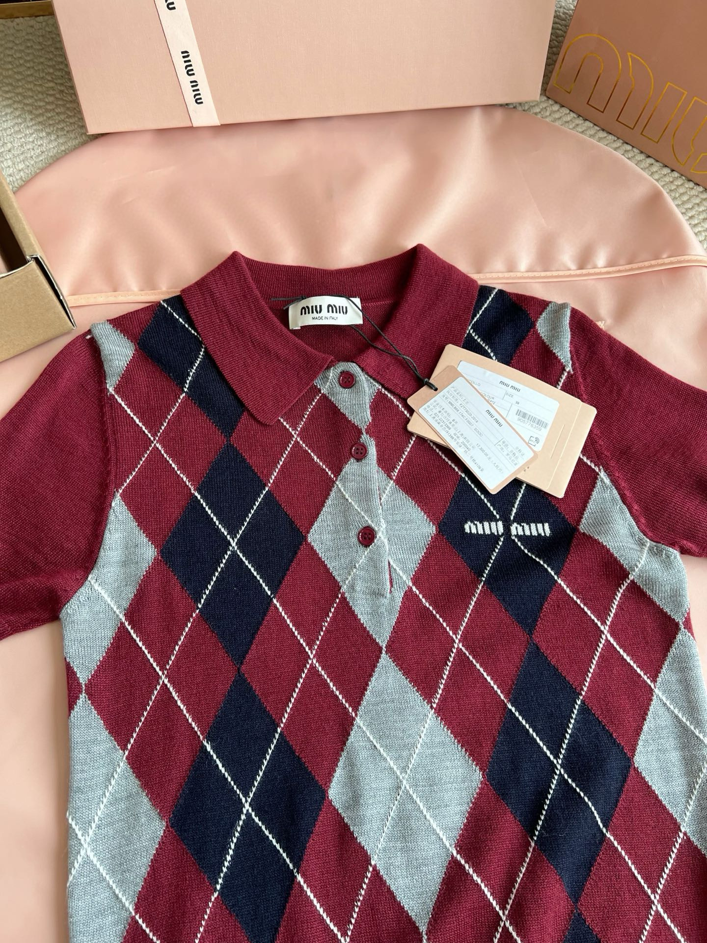 NIGO MiuMiu Women's Summer Fashion Casual Collared Diamond Pattern Wool Polo Shirt Short Sleeve T-shirt #nigo78464