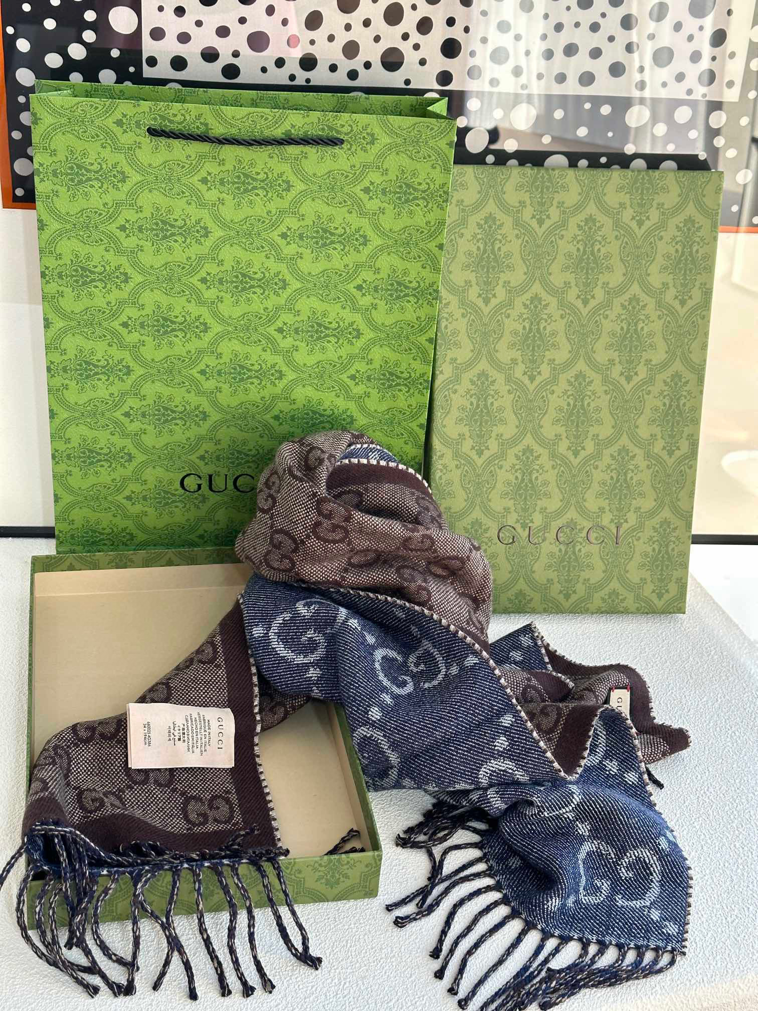 This soft jacquard wool scarf is adorned with the GG pattern on both sides, which is dynamic and playful. The scarf is made in contrasting shades of blue and light brown, with elegant navy fringes (the scarf is made in shades of grey with elegant black fringes), which adds to the charm of the whole design.