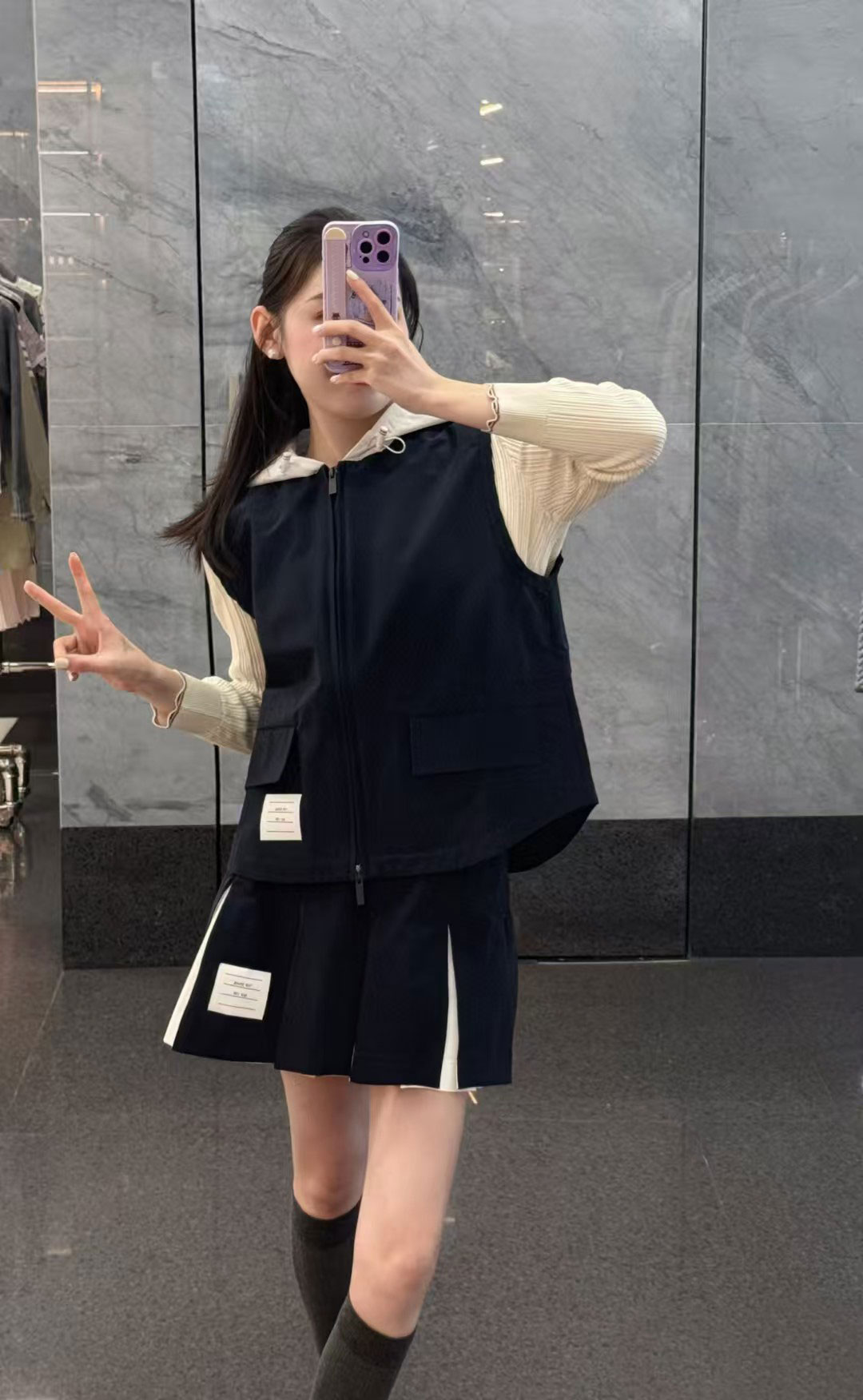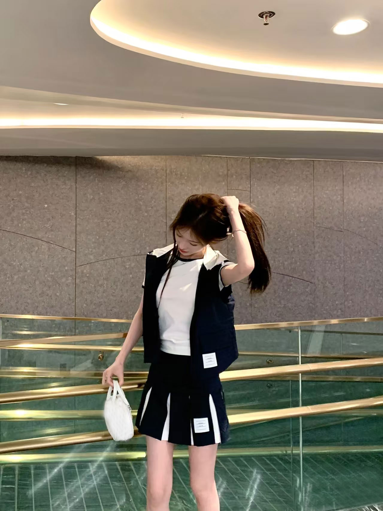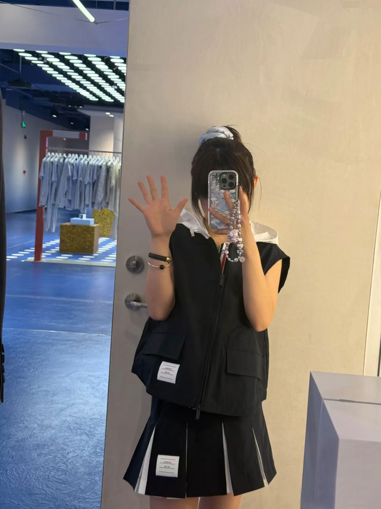 L NIGO Women's Spring/Summer Drawstring Color-Block Sleeveless Zipper Hooded Vest And Casual Pleated Mini Skirt