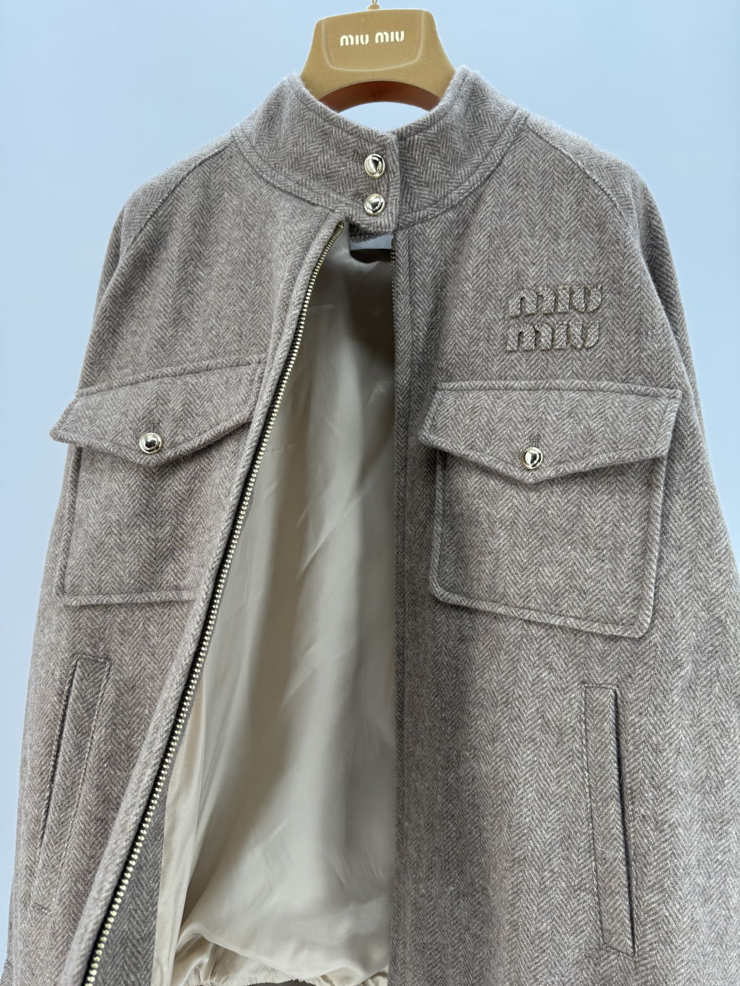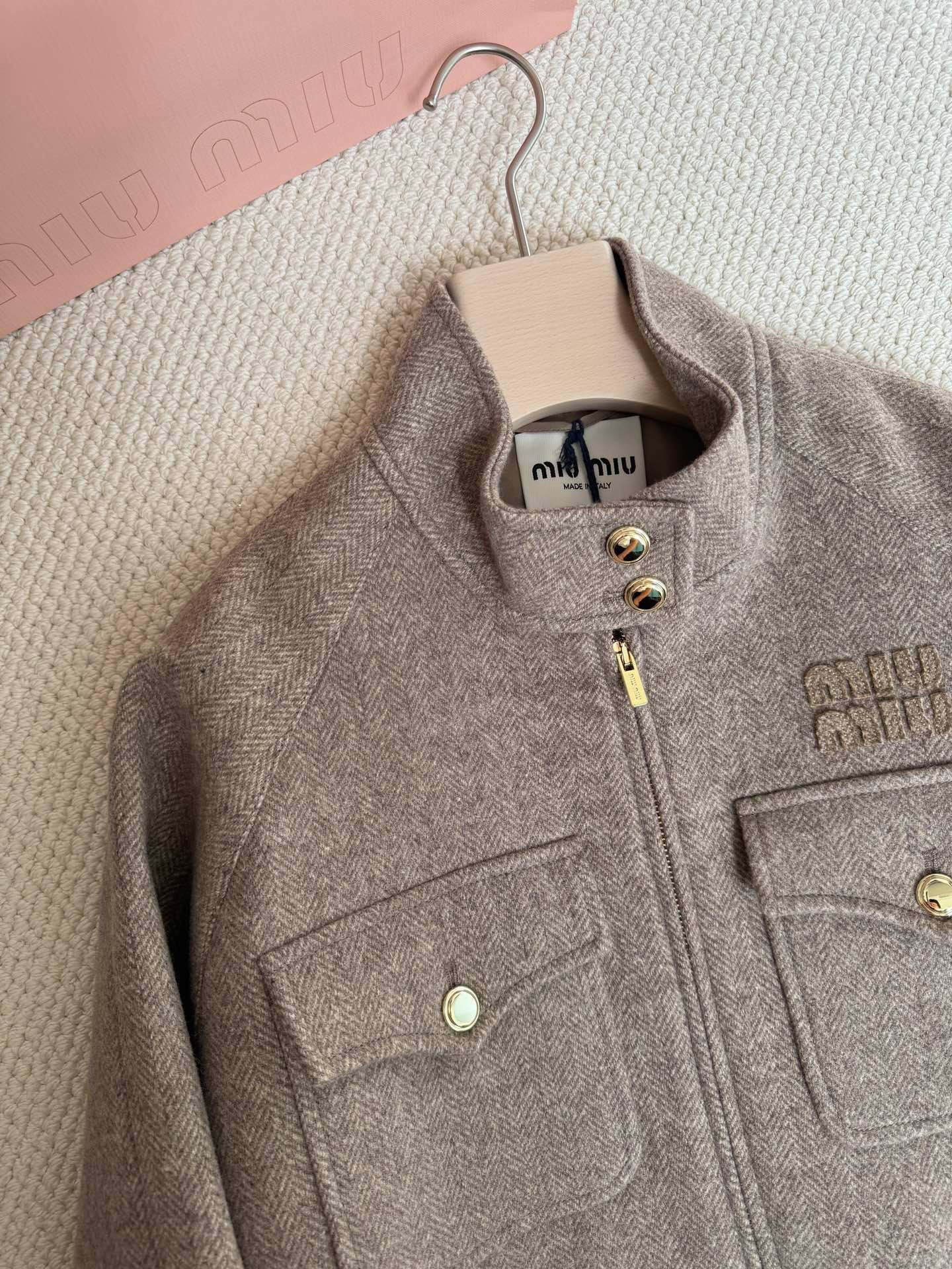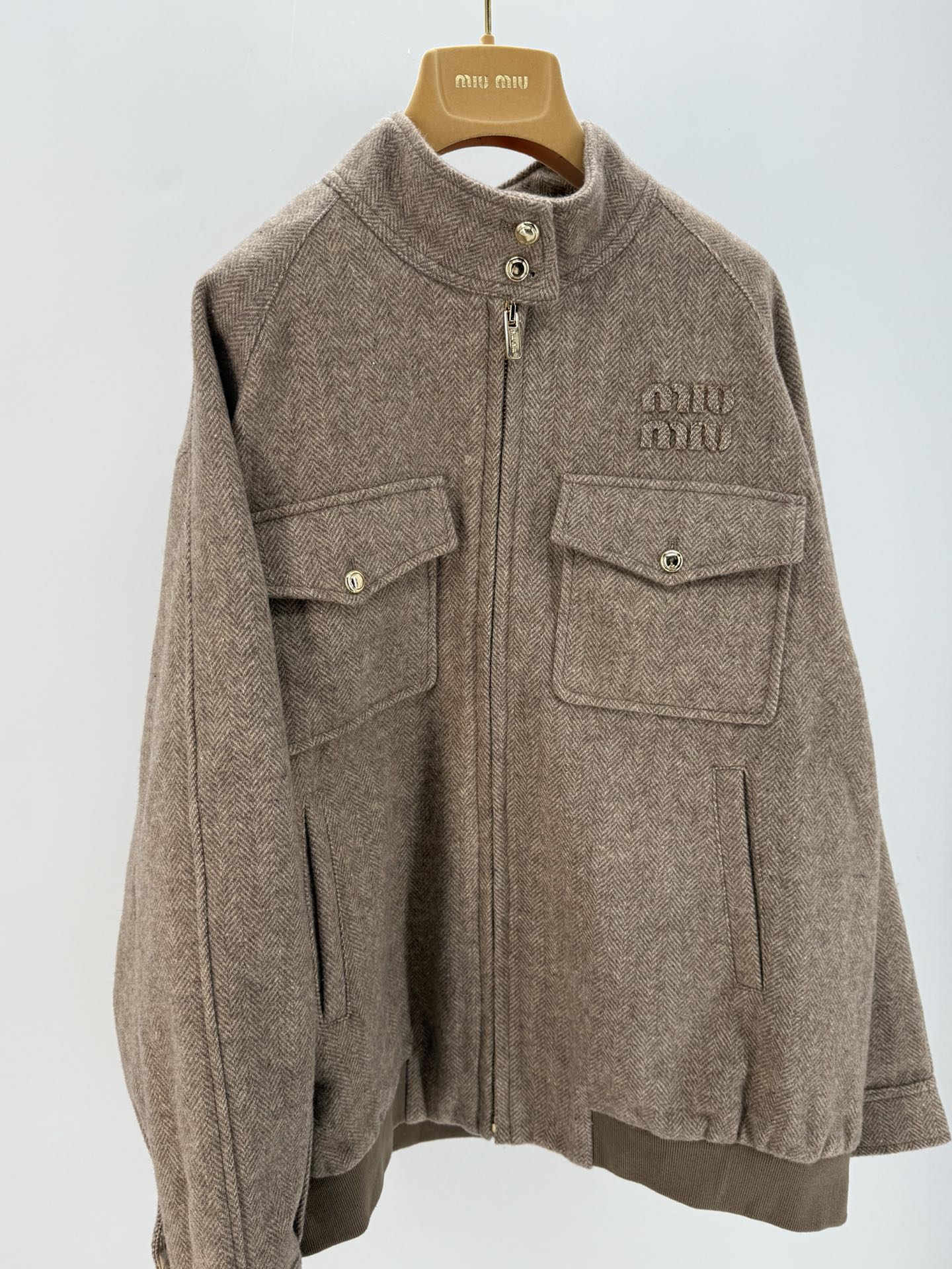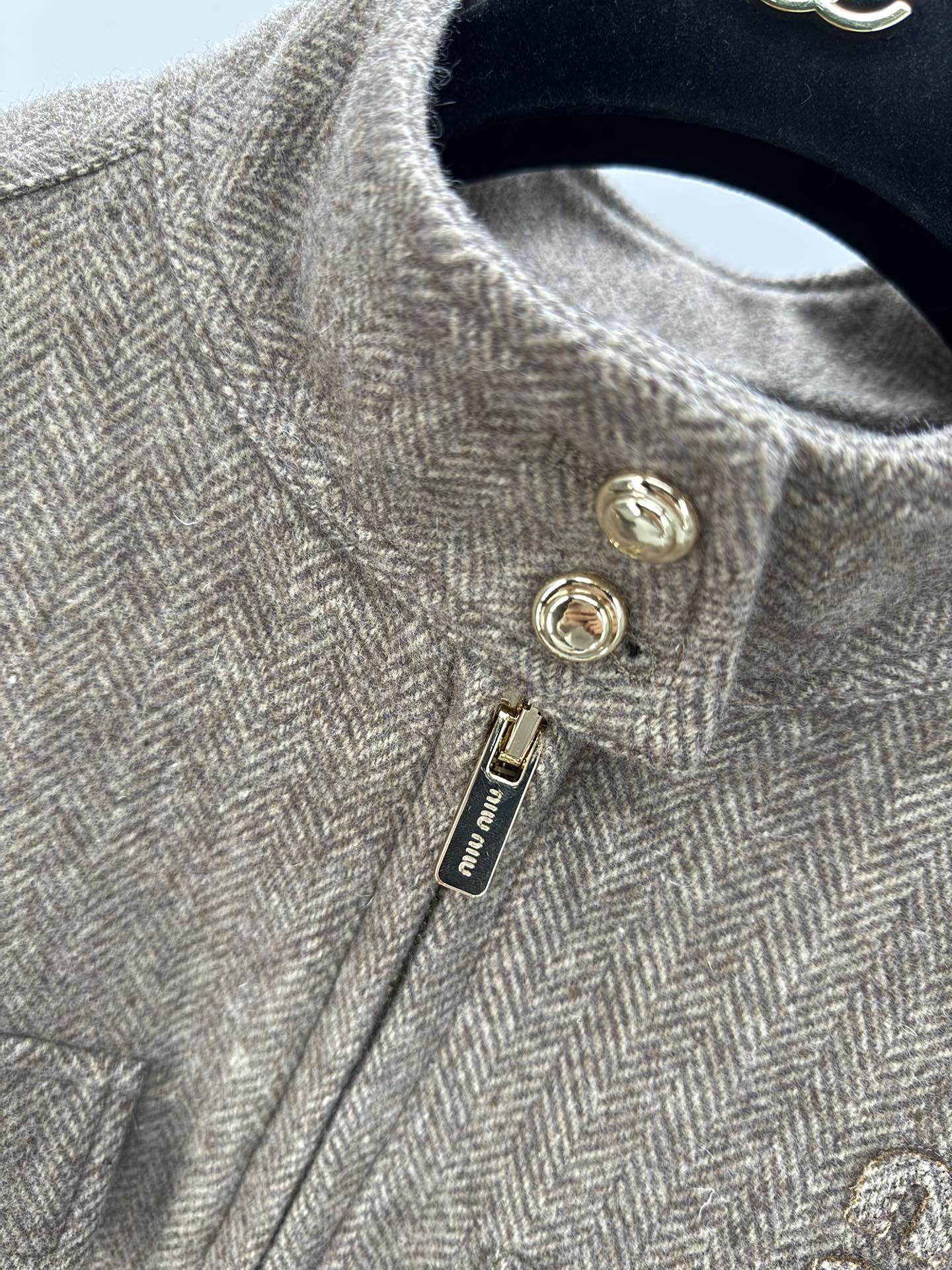 NIGO MiuMiu Women's Spring and Autumn Wool Herringbone Twill Embroidery Logo Standing Collar Zipper Long Sleeve Jacket #nigo73697