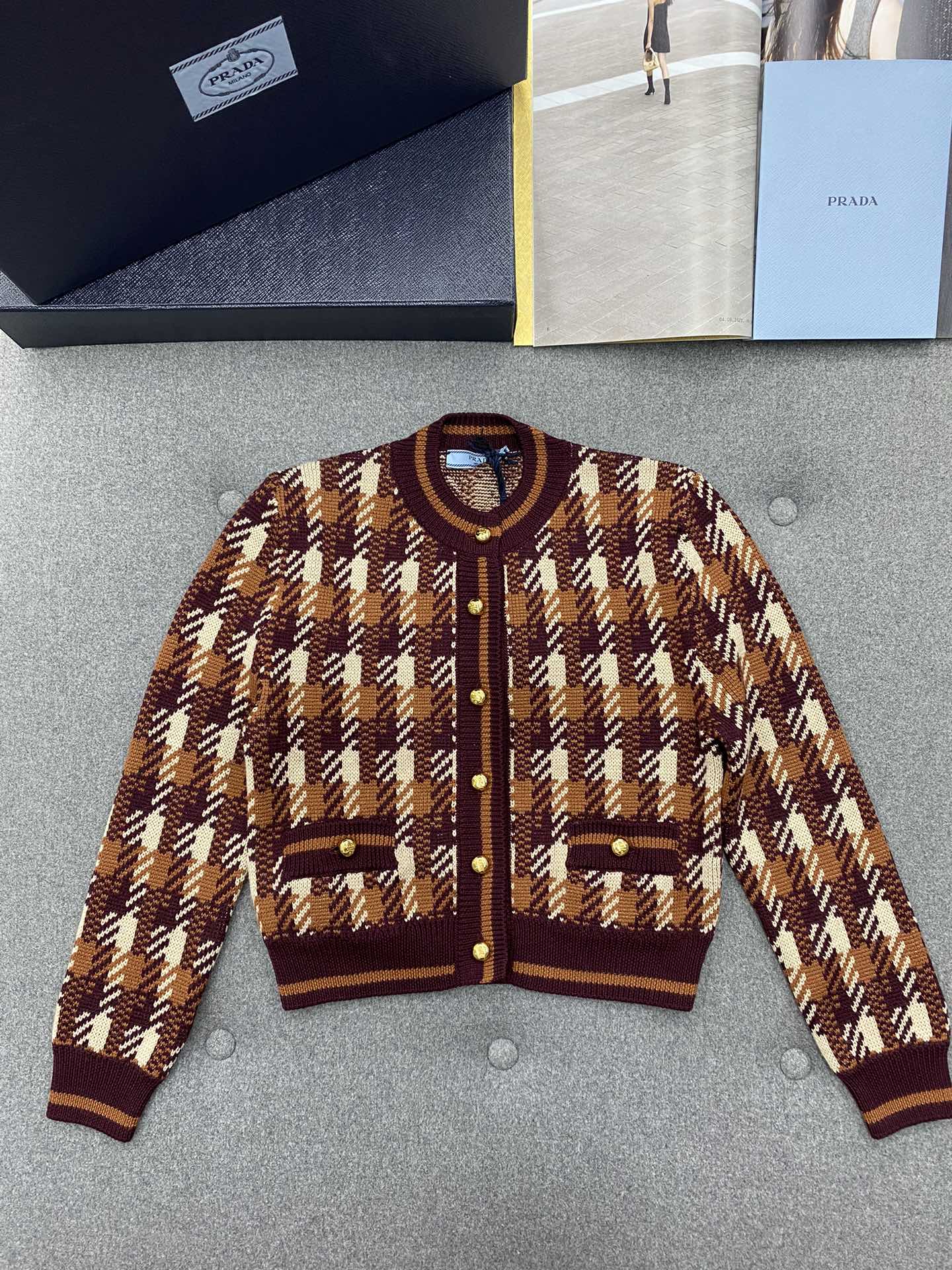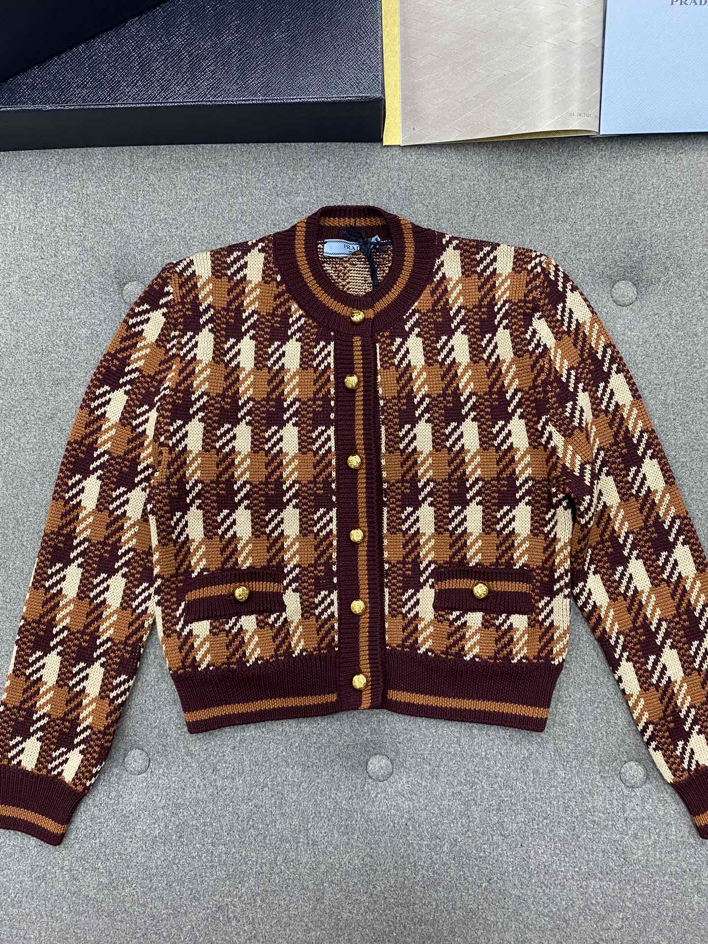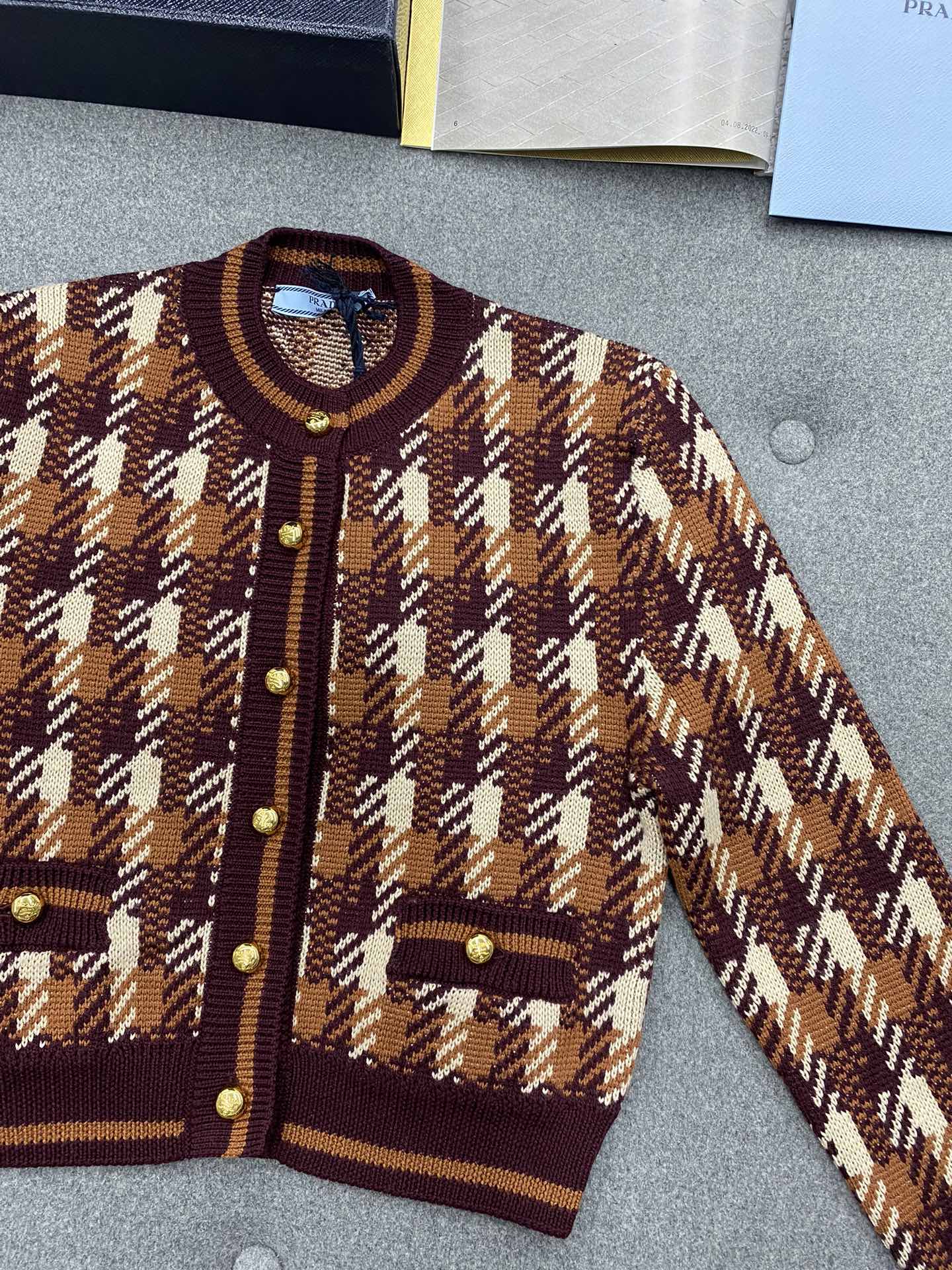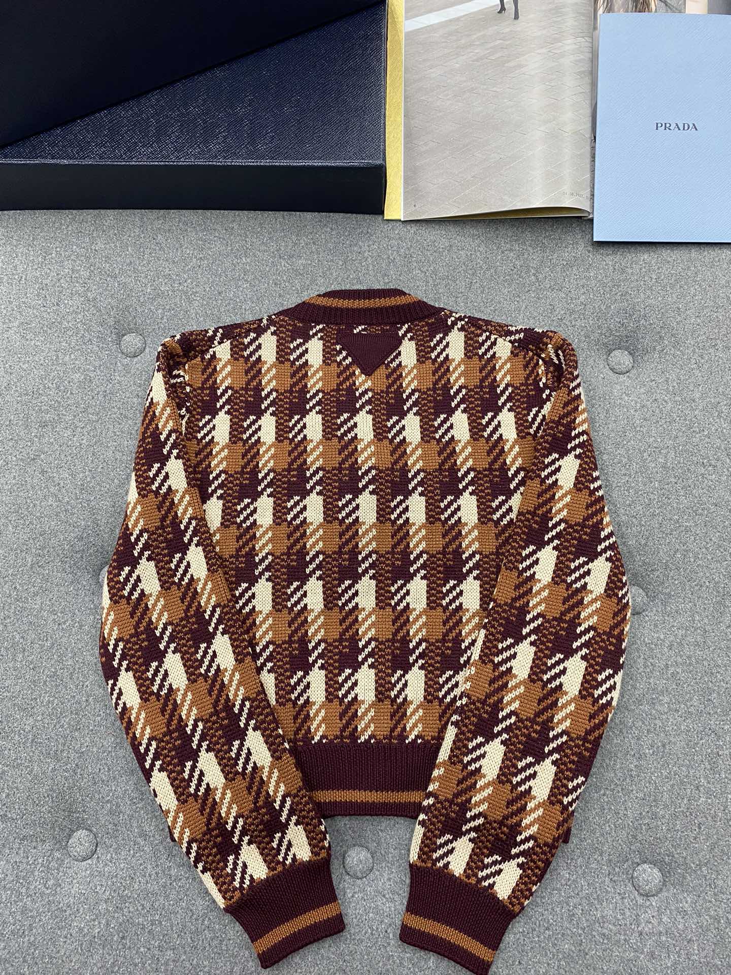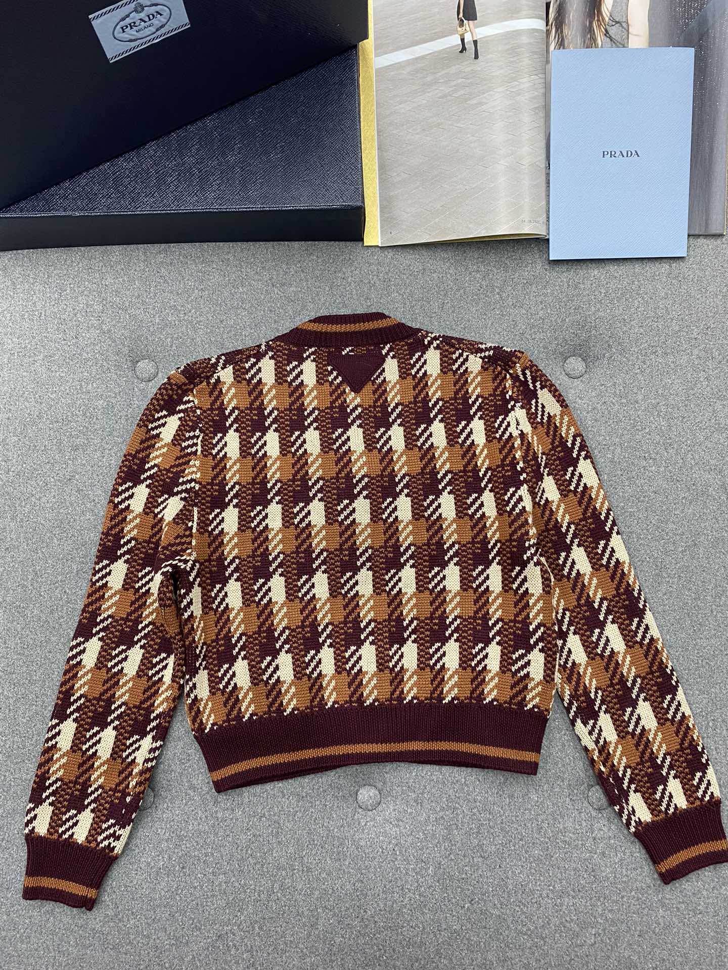 NIGO Prada Women‘s Fall And Winter Plaid Full Print Round Neck Pocket Single Breasted Wool Long Sleeved Knit Jacket #nigo73537