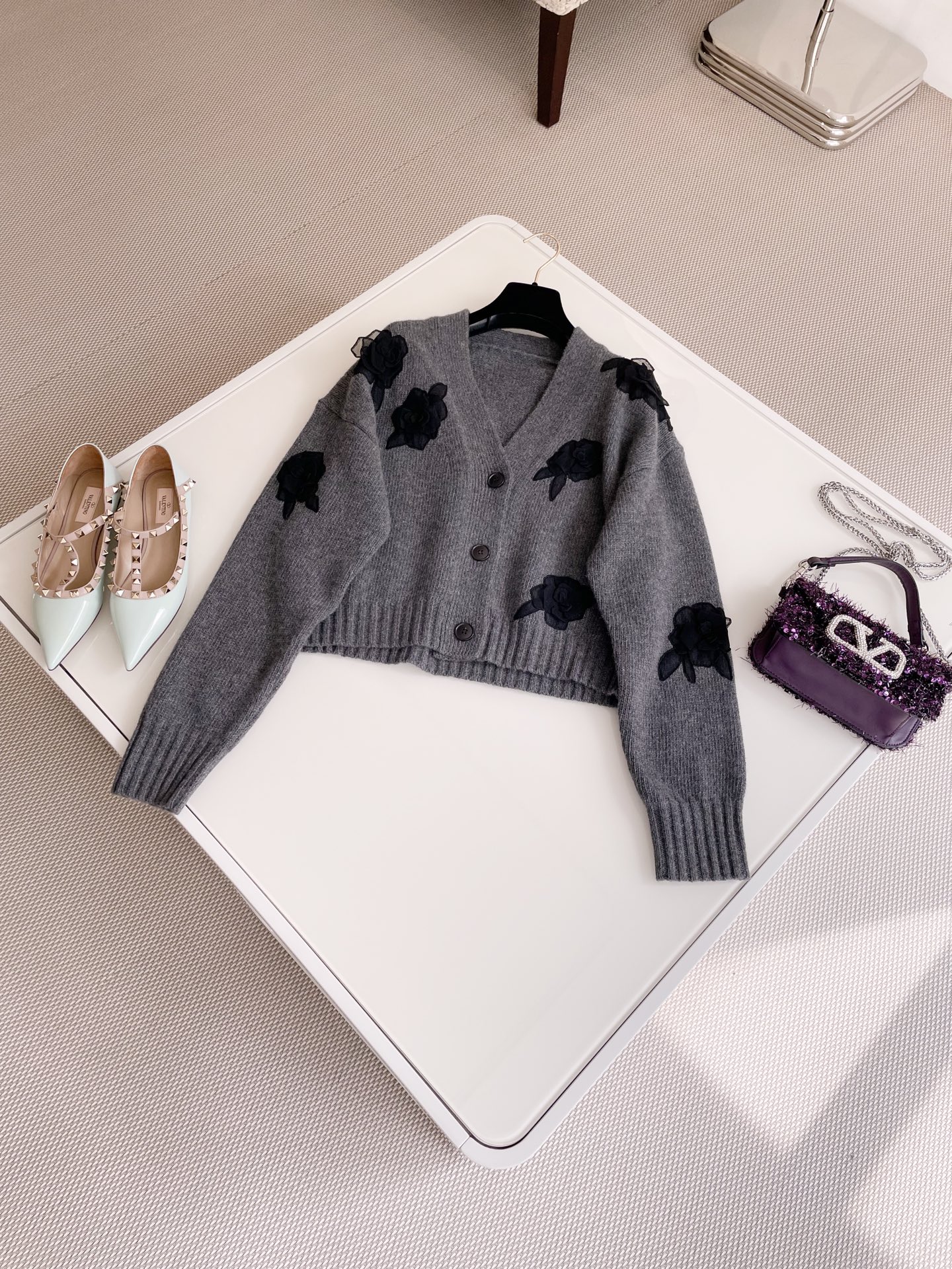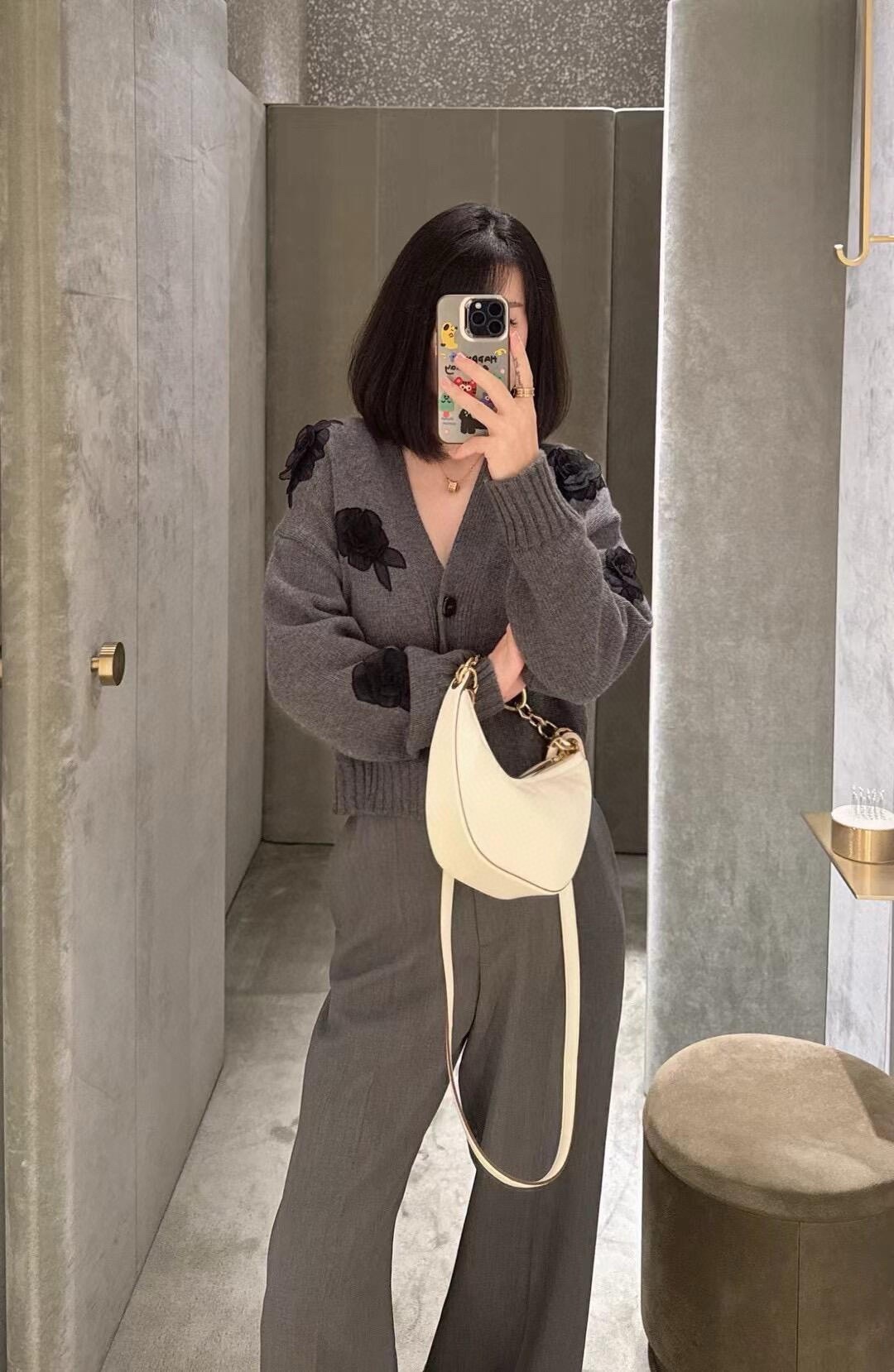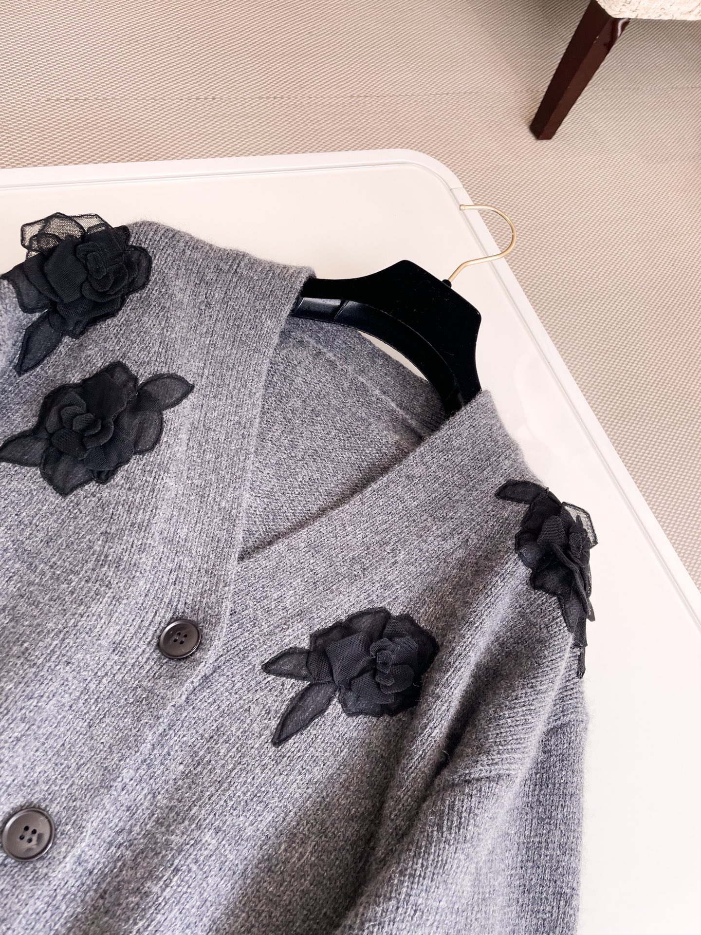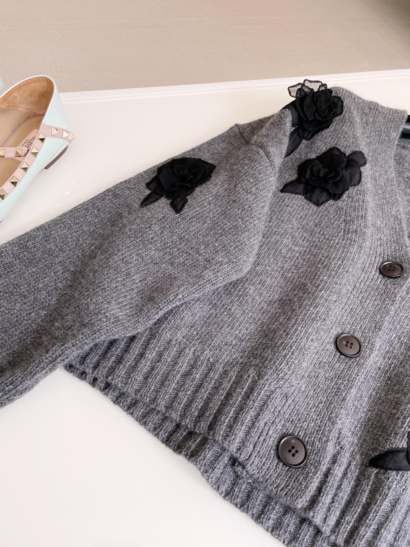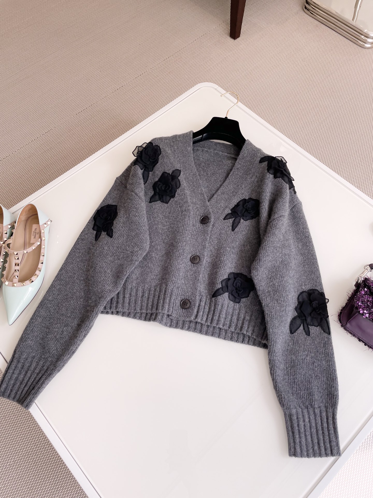 NIGO Valentino Women's Spring And Autumn Rose Embroidery Single Breasted V-Neck Gray Long Sleeve Cardigan Wool Sweater Ngvp #nigo9476