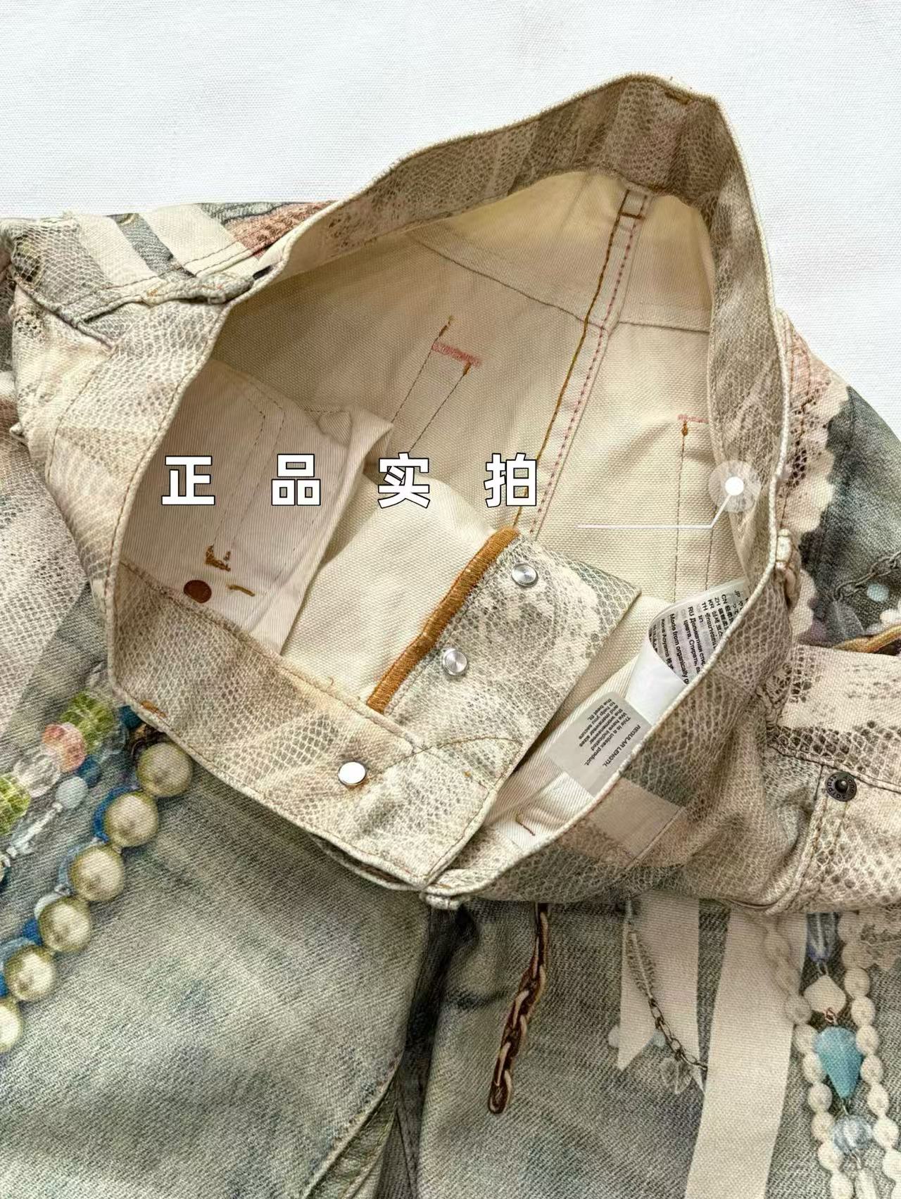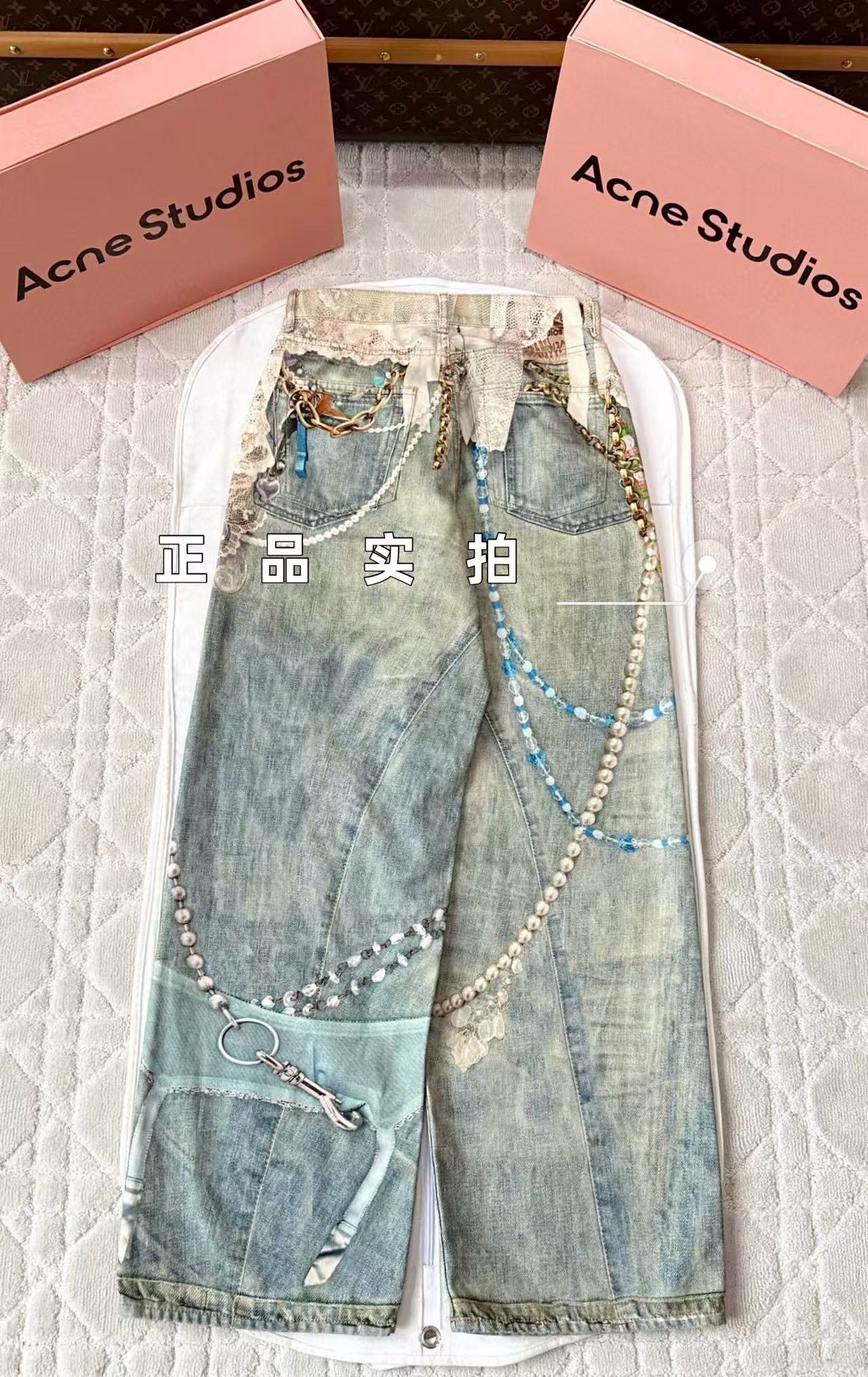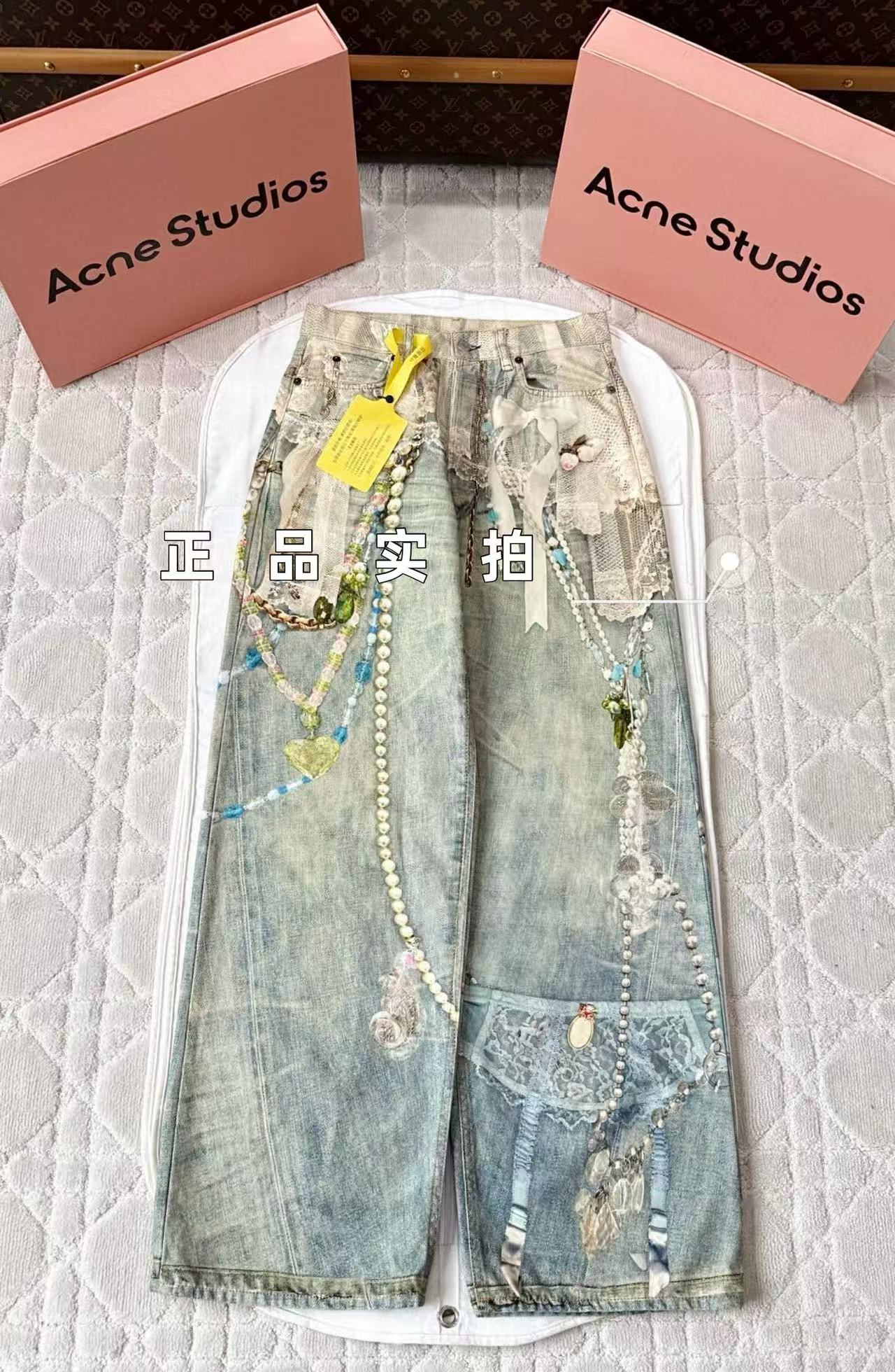 NIGO Acne Studios Men's Women's Four Seasons Lace Pearl Chain Printed Zipper Loose Low Waisted Denim Pants Wide Leg Machete Pants Ngvp #nigo1938