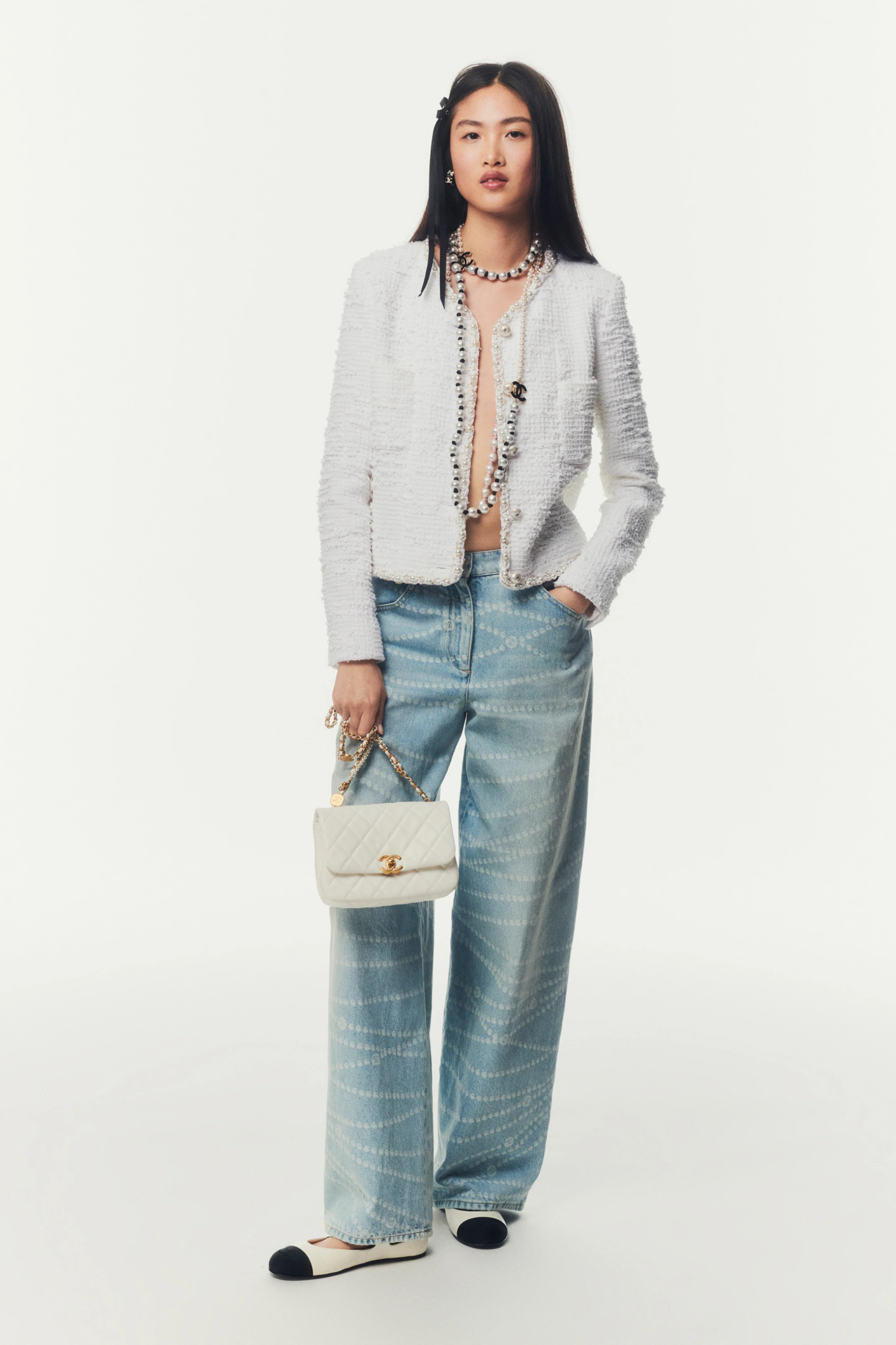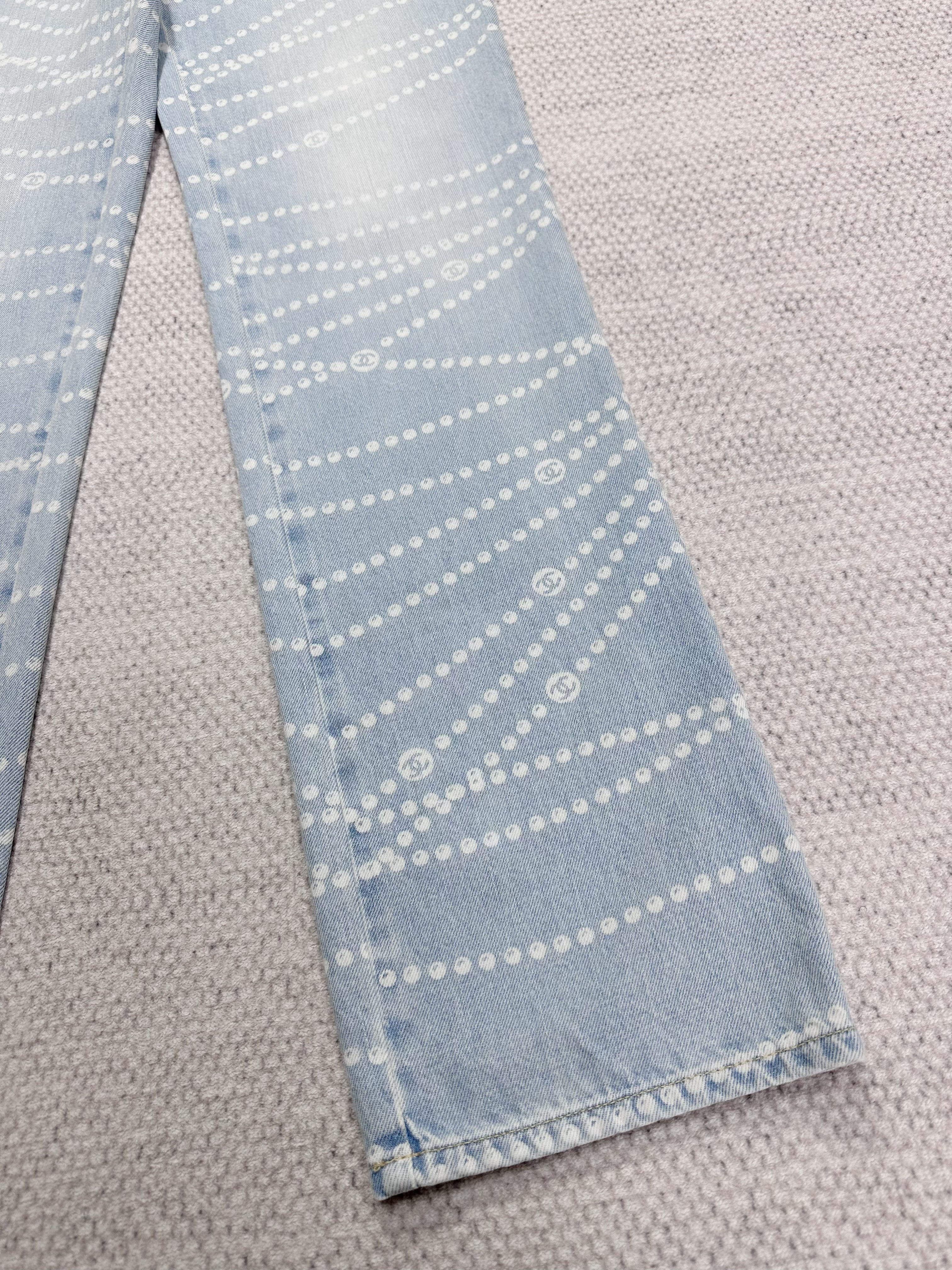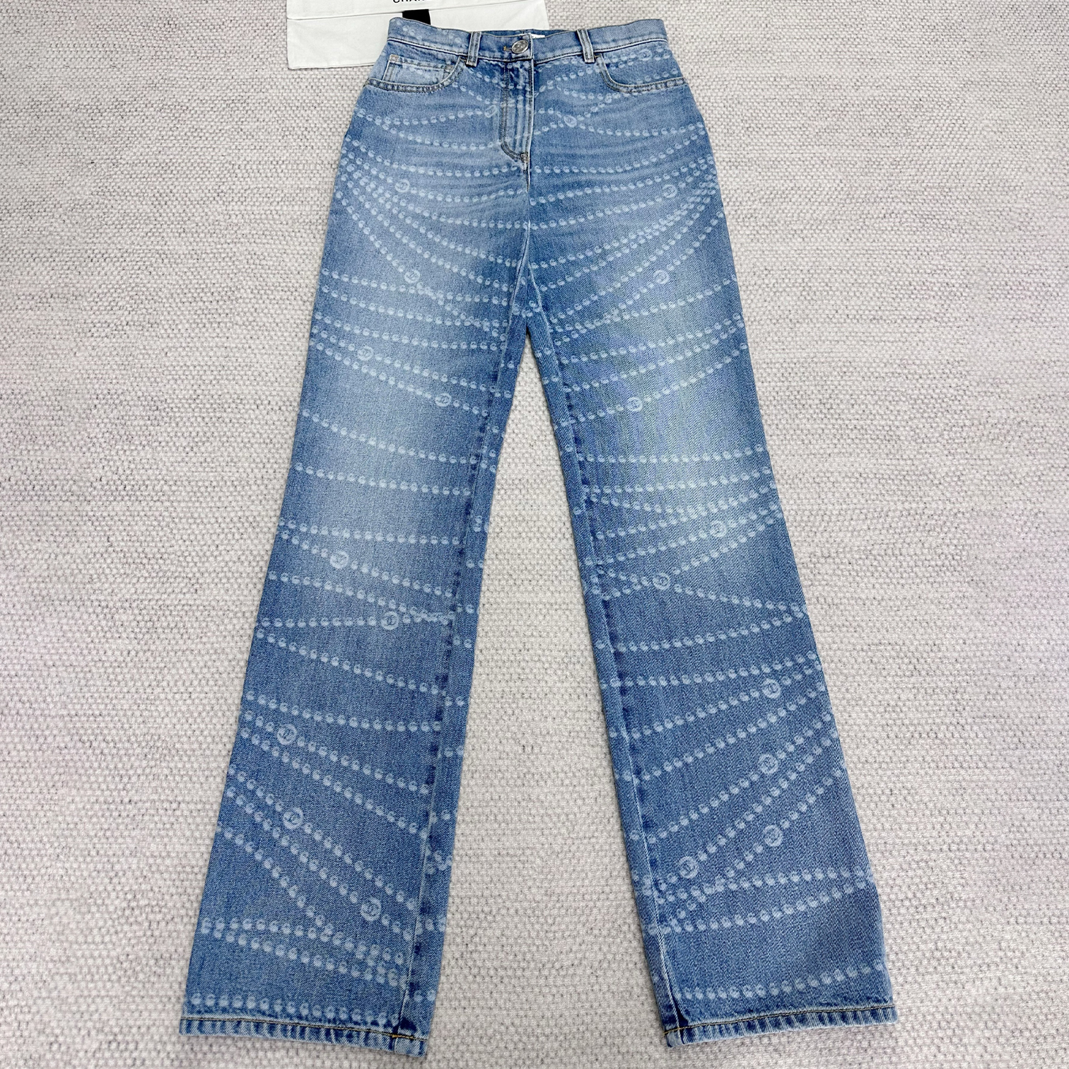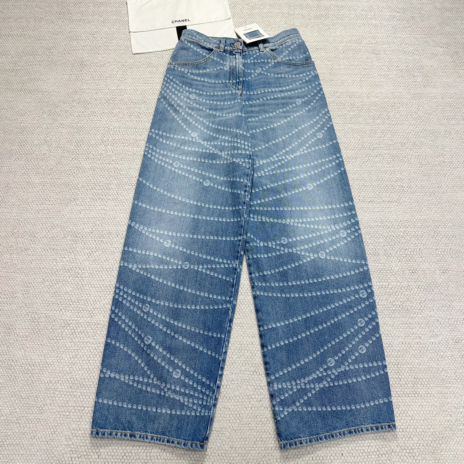 NIGO Chanel Women's Four Seasons Pearl Chain Print Cotton Casual Solid Color Straight Jeans Denim Pants #nigo76229