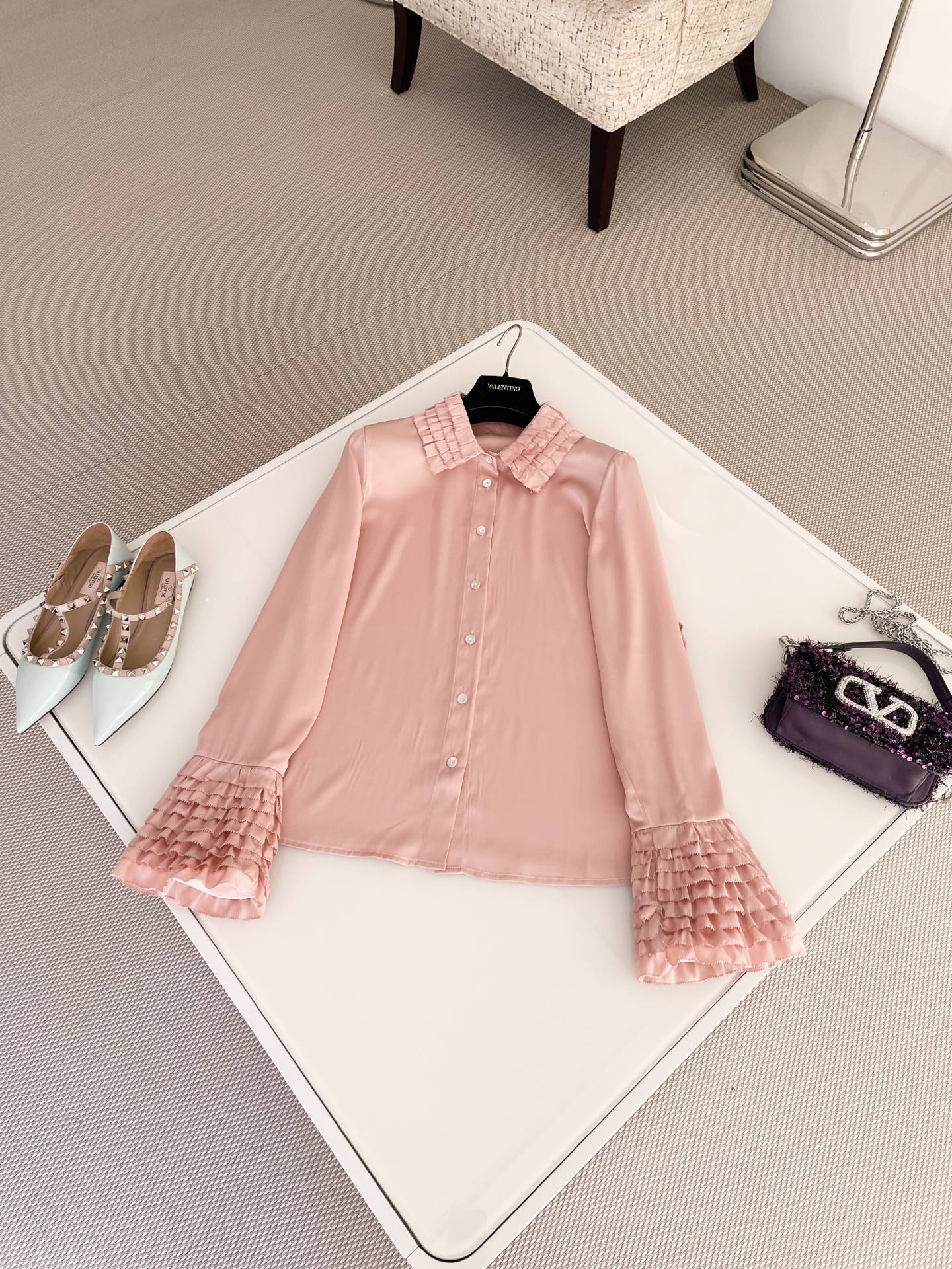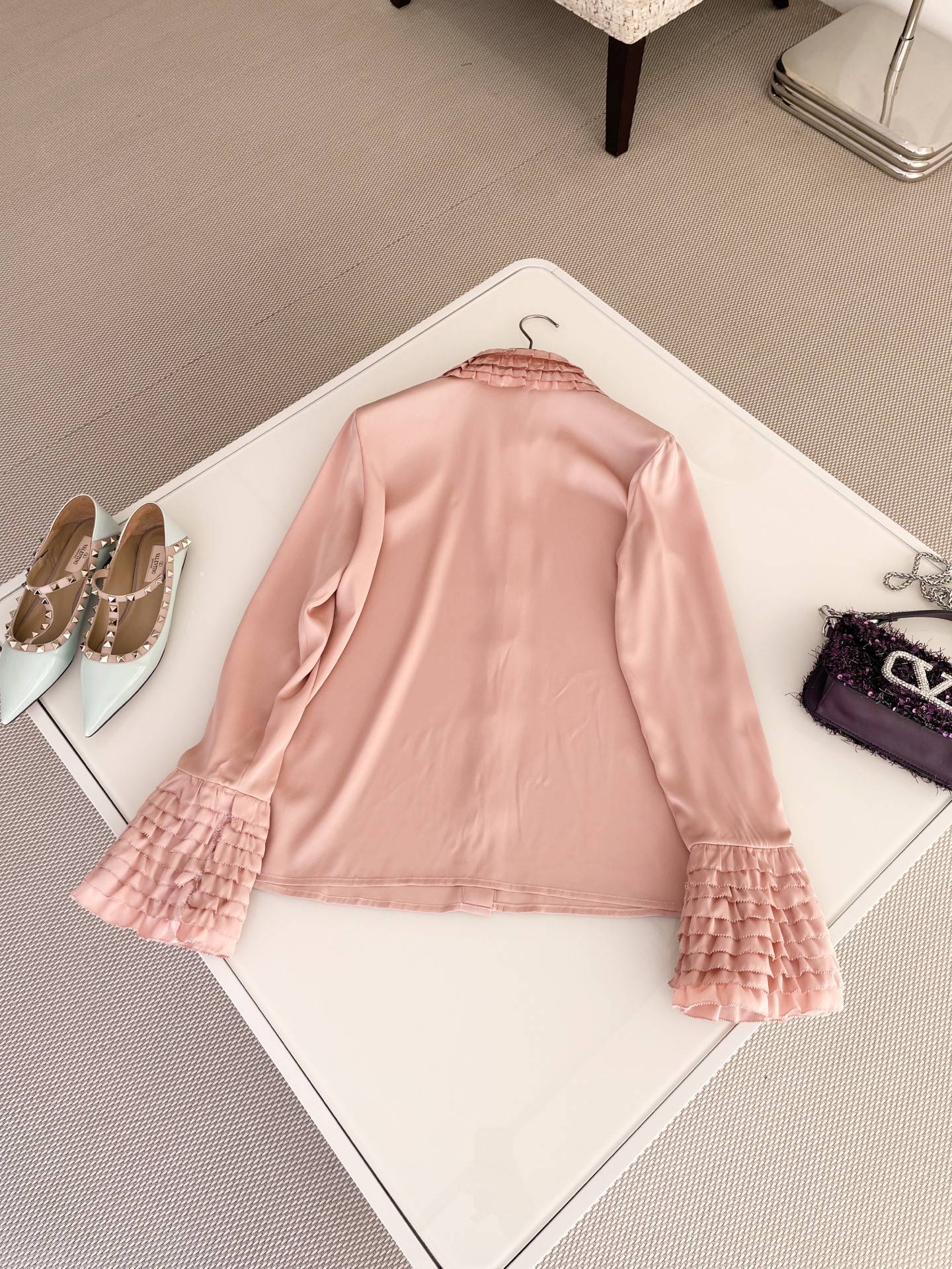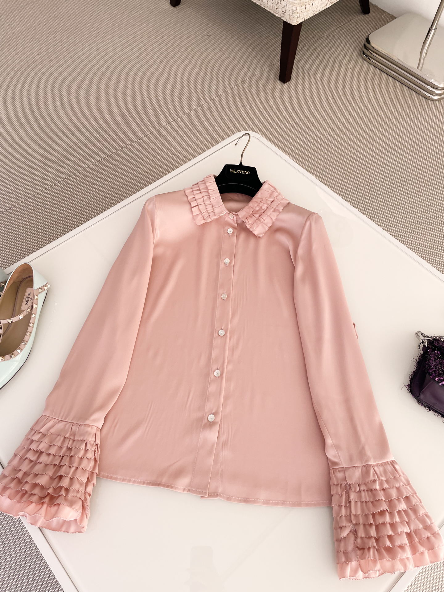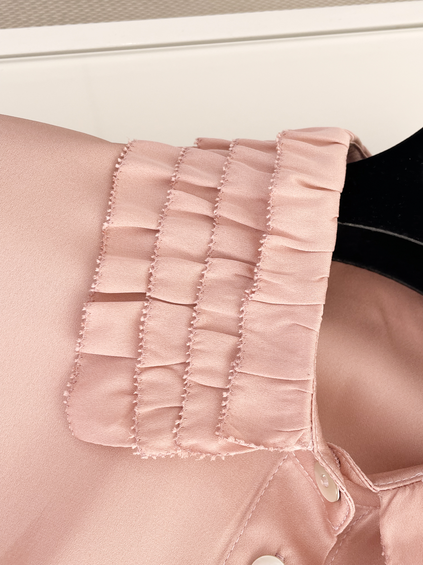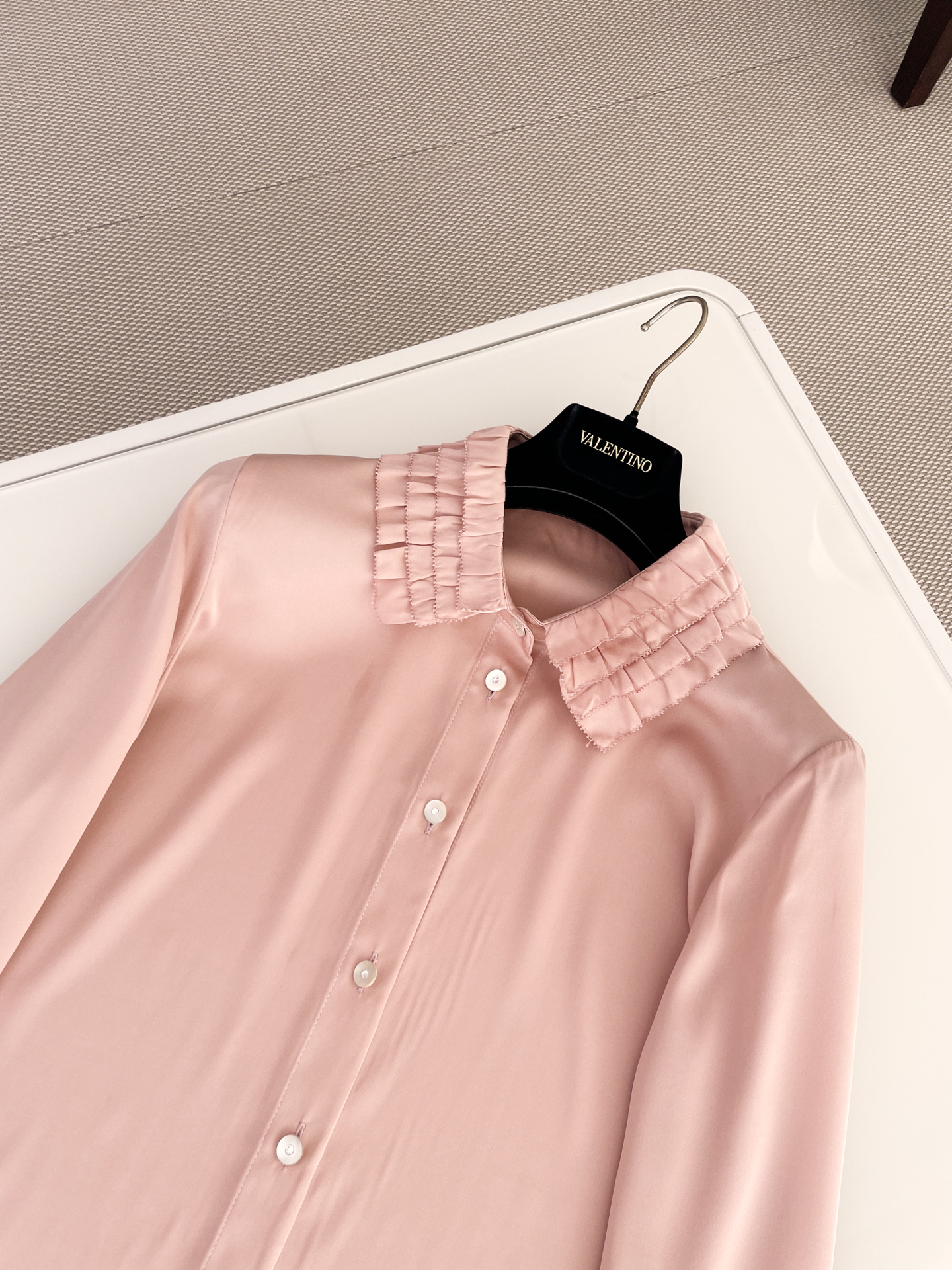 NIGO Valentino Women's Spring Pink Ruffled Lapel Single-breasted Silk Shirt Fashionable Temperament Elegant Blouse Ngvp #nigo9913