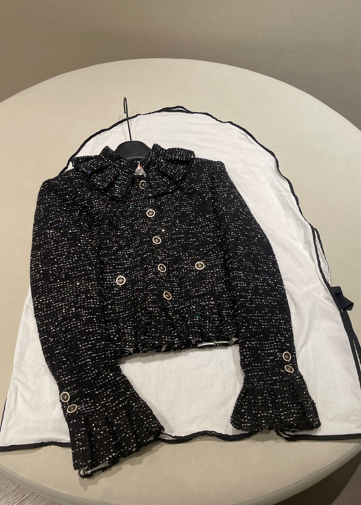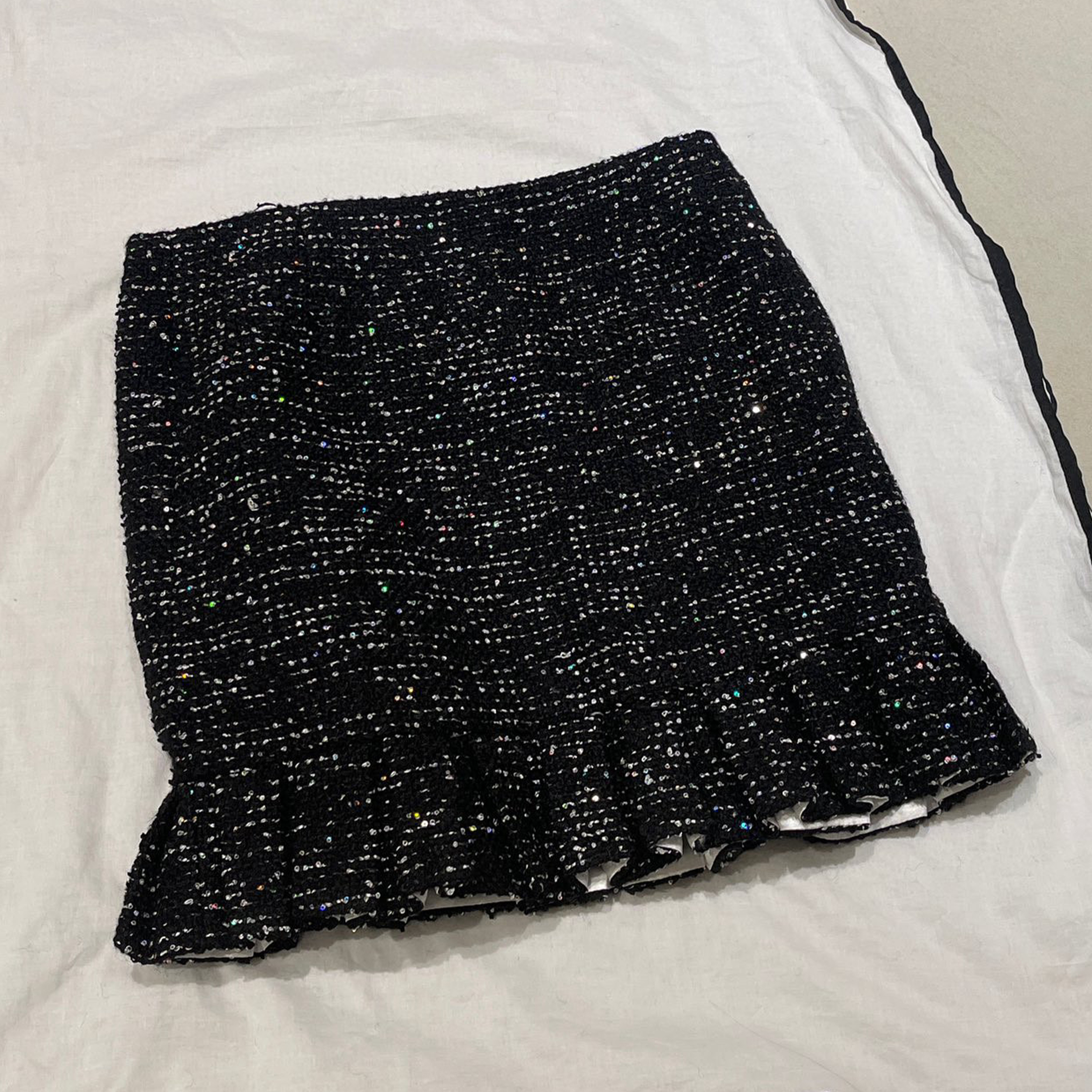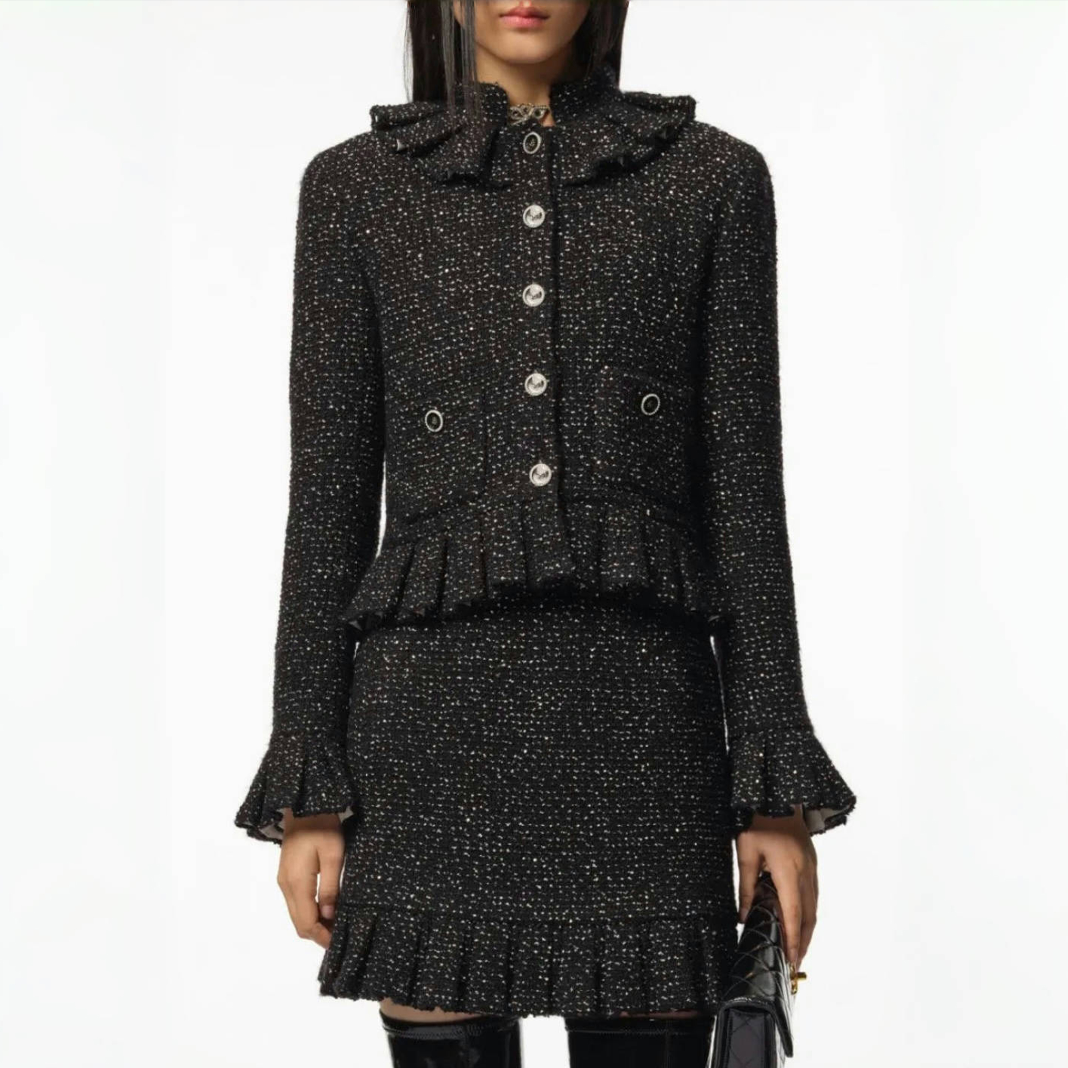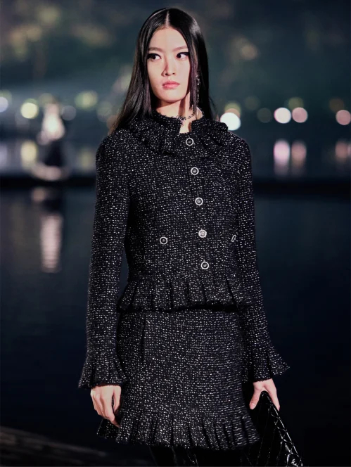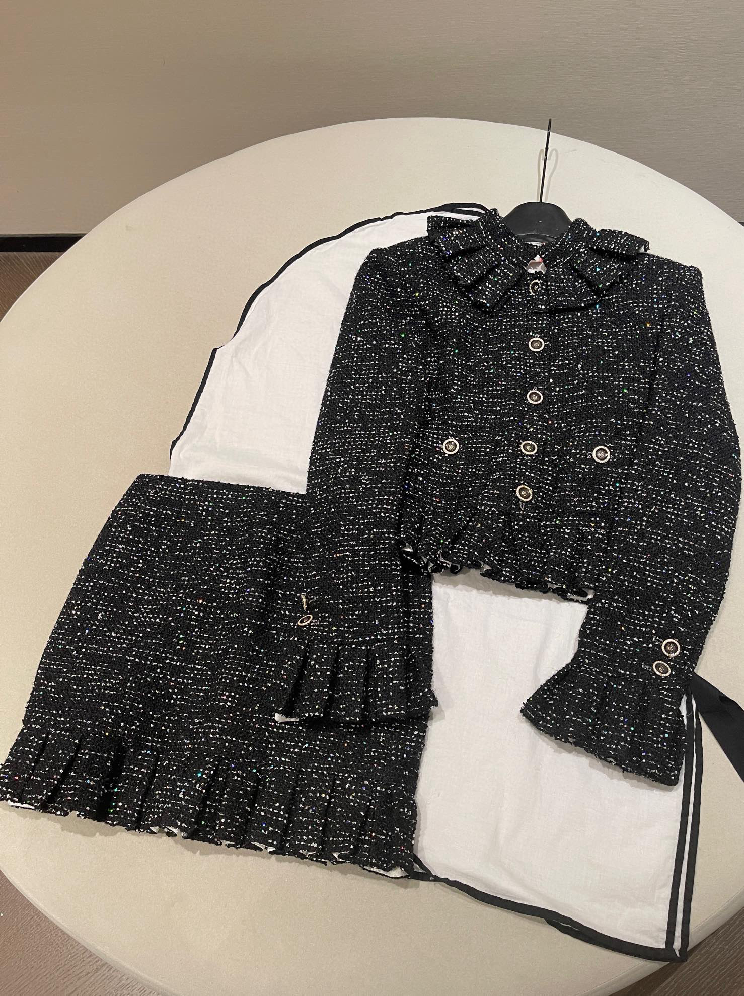 NIGO Chanel Women's Autumn/winter Black Shiny Tweed Single-breasted Jacket With Lace Collar Stylish Mini Skirt Suit Set Ngvp #nigo2172