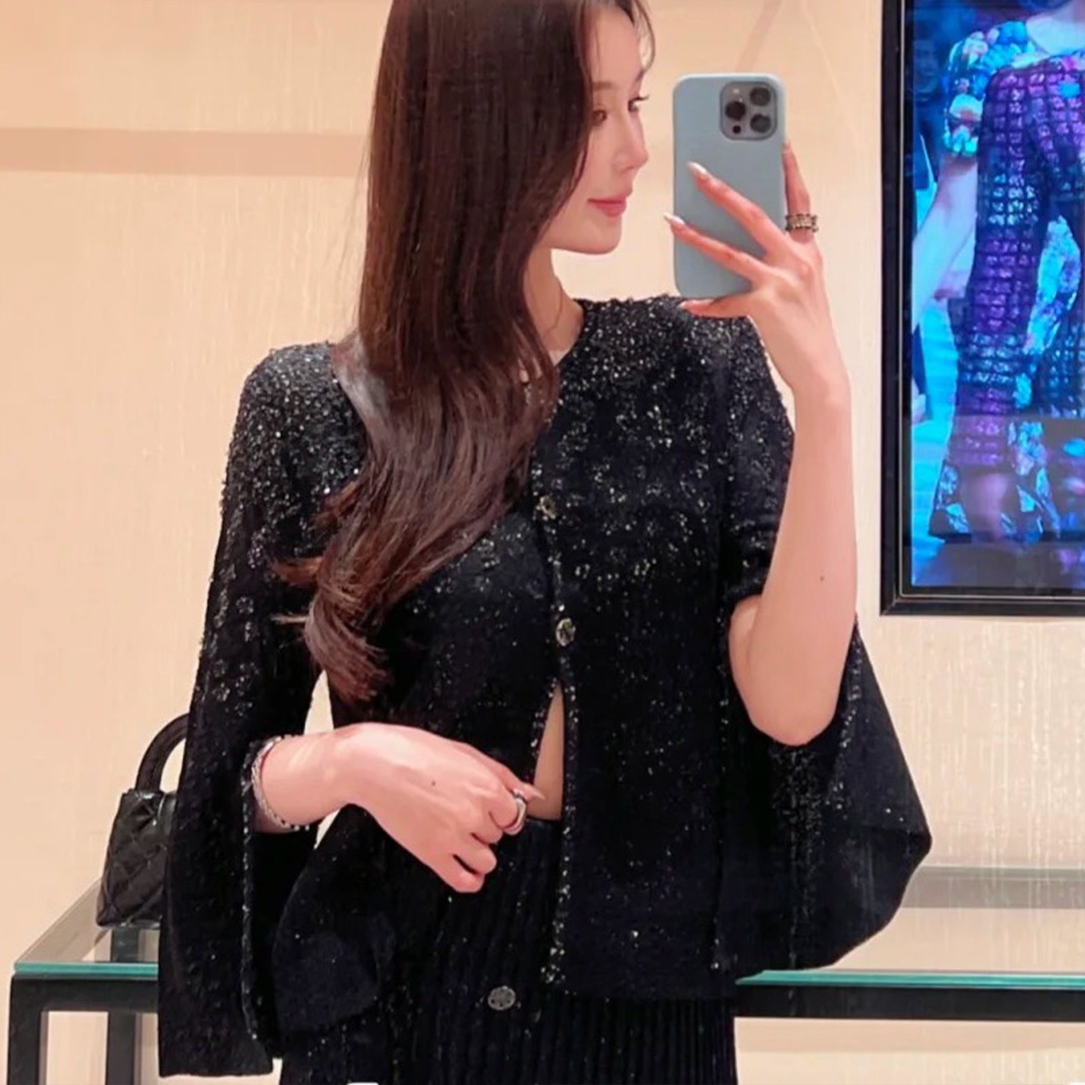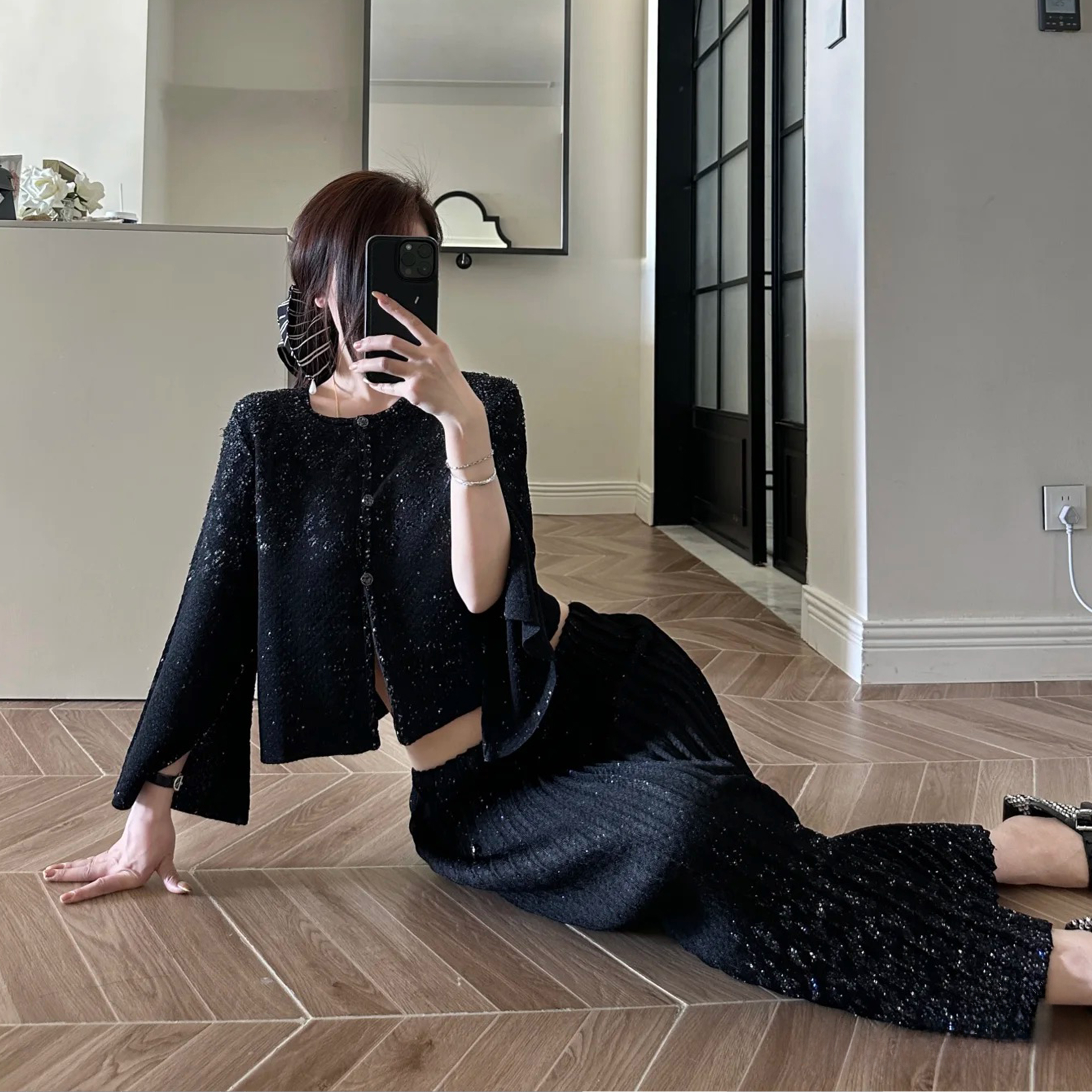 NIGO Chanel Women's Spring And Summer Black Temperament Elegant Cape Short Sequins Tweed Jacket Long Straight Thin Long Skirt Suit Set Ngvp #nigo1345