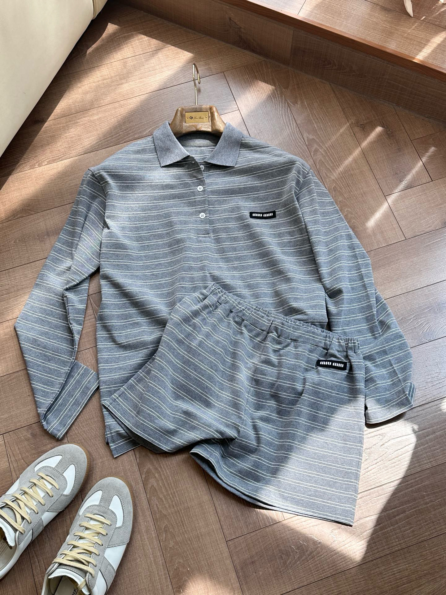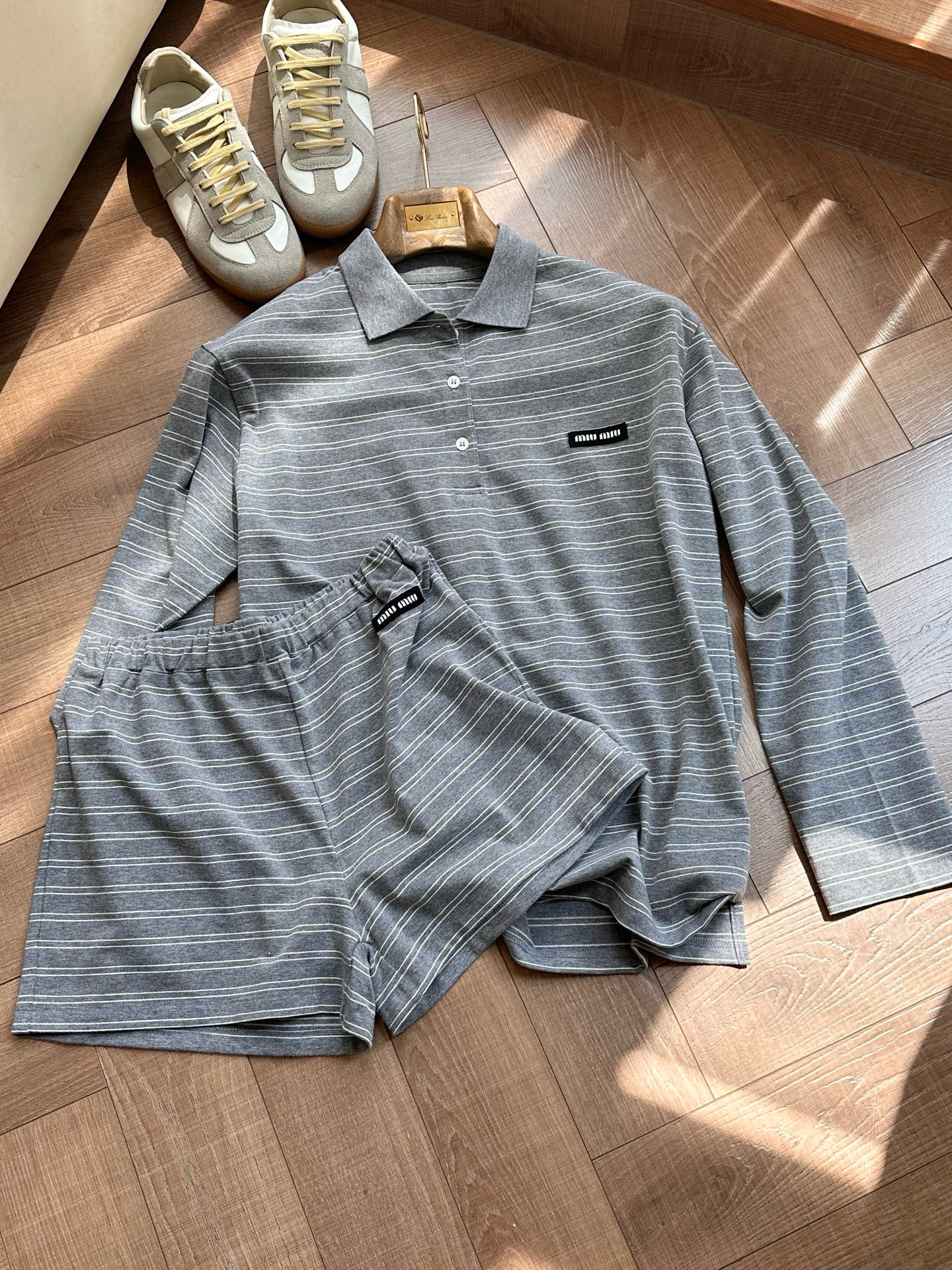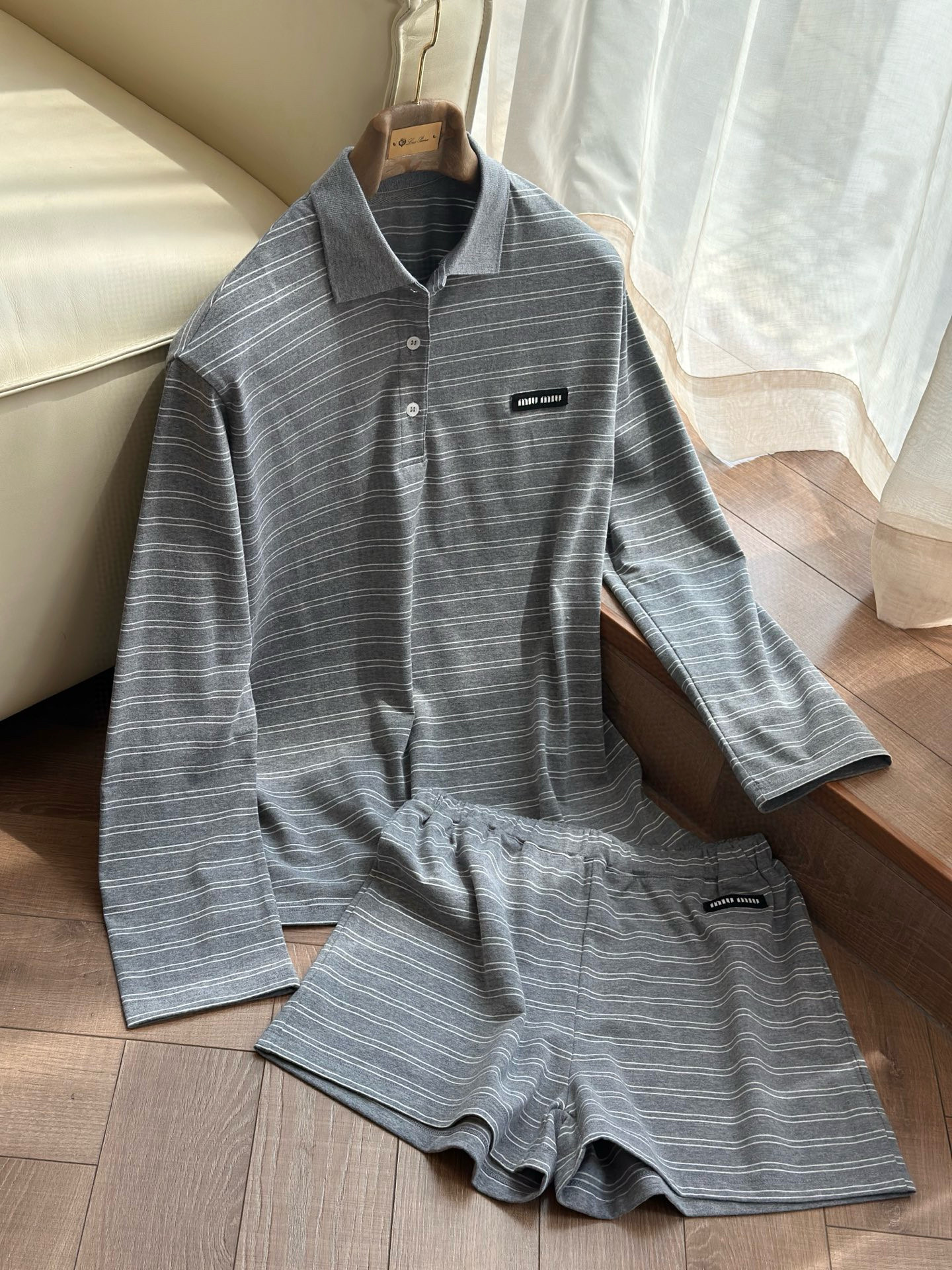 NIGO MiuMiu Women's Spring Summer Striped Printed Polo Neck Long Sleeve T-Shirt Cotton Casual Shorts Set Suit #nigo76691