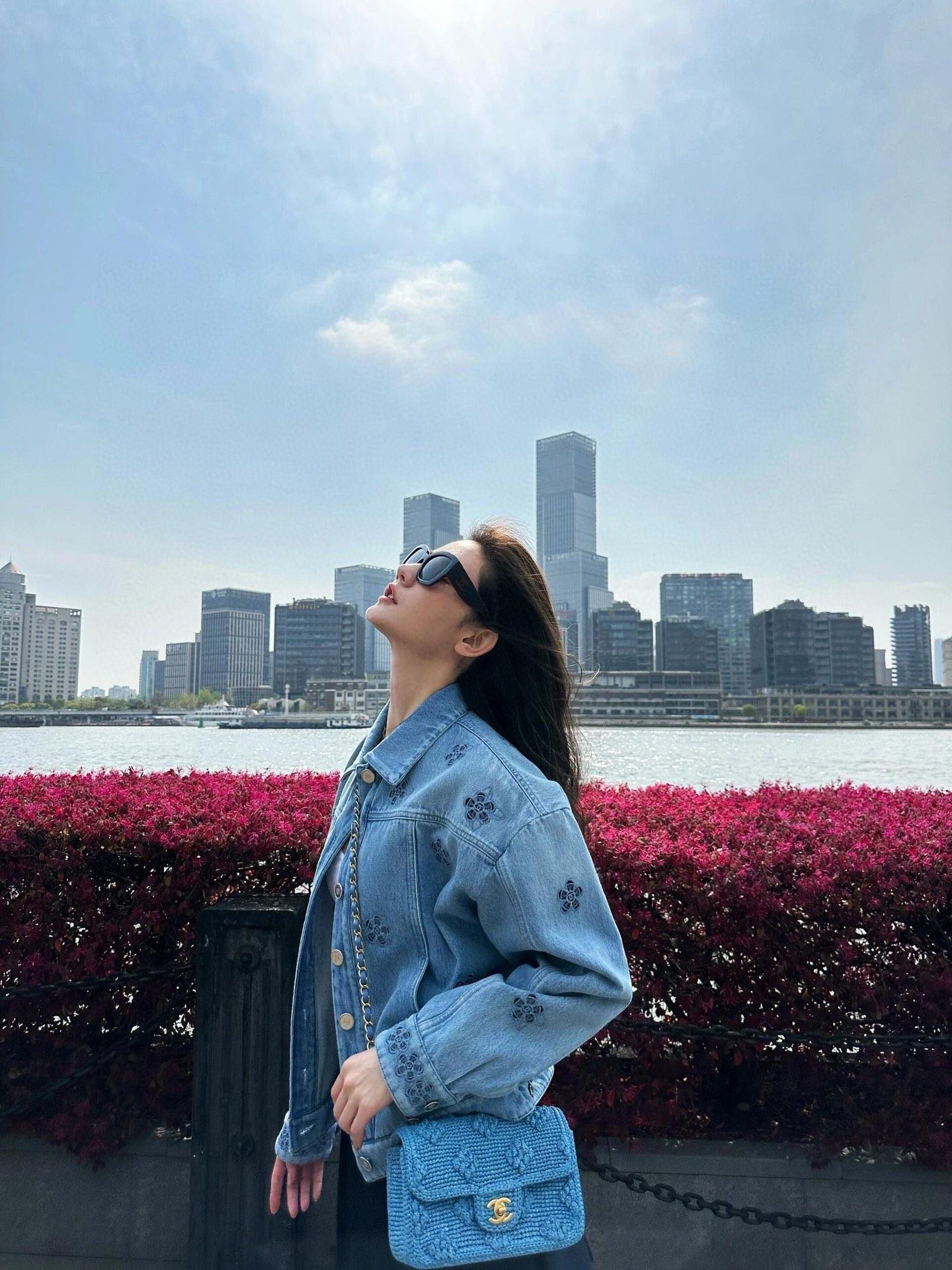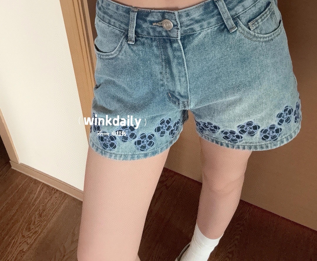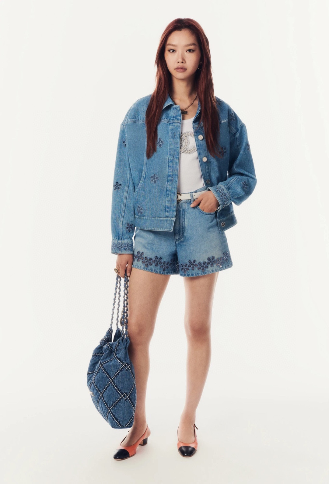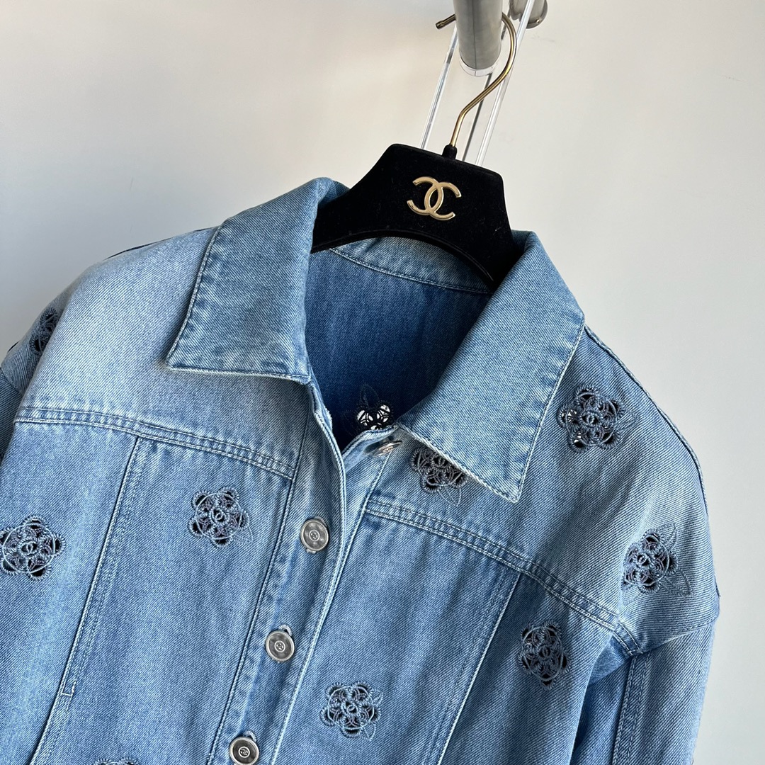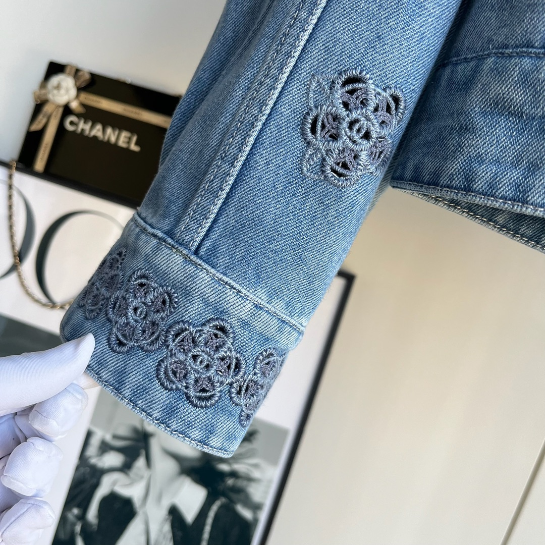 NIGO Chanel Women's Spring And Fall Blue Hollow Camellia Embroidery Printing Single breasted Long sleeved Denim Jacket Denim Shorts Suit Set #nigo72615