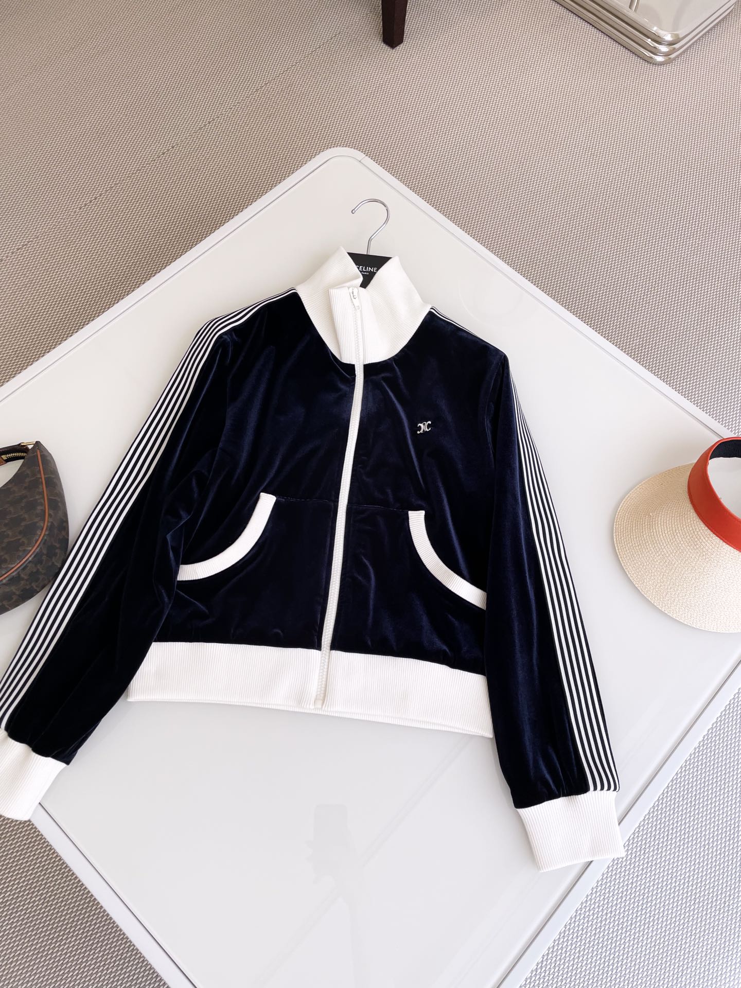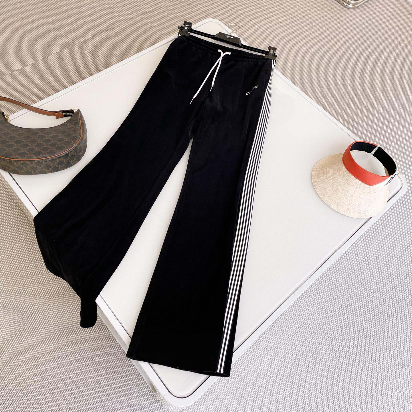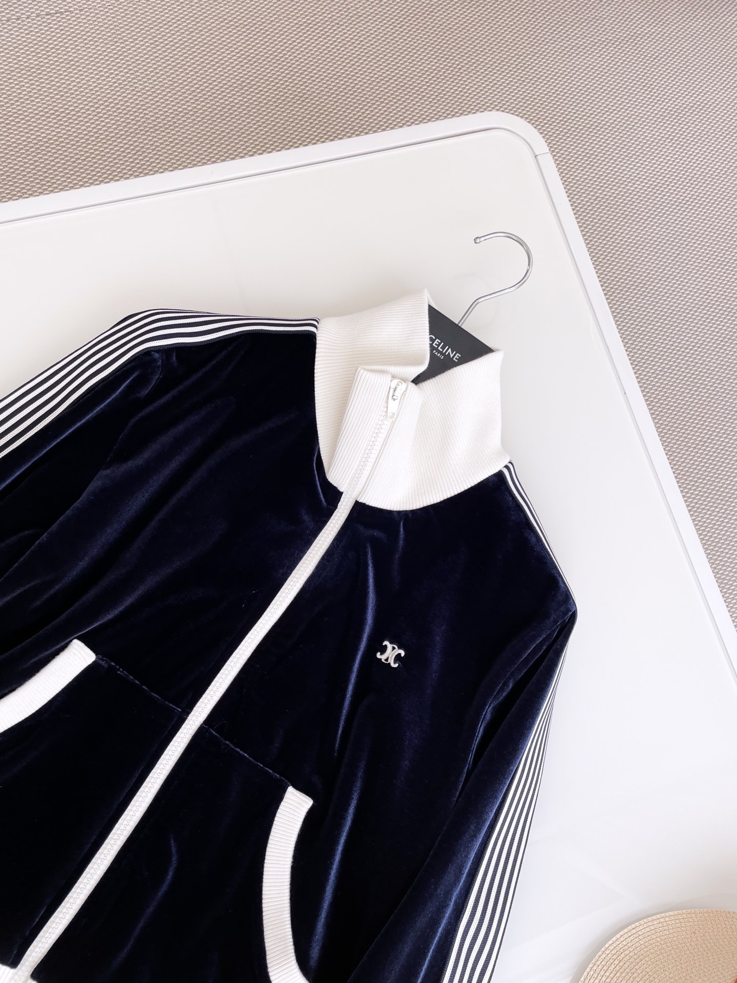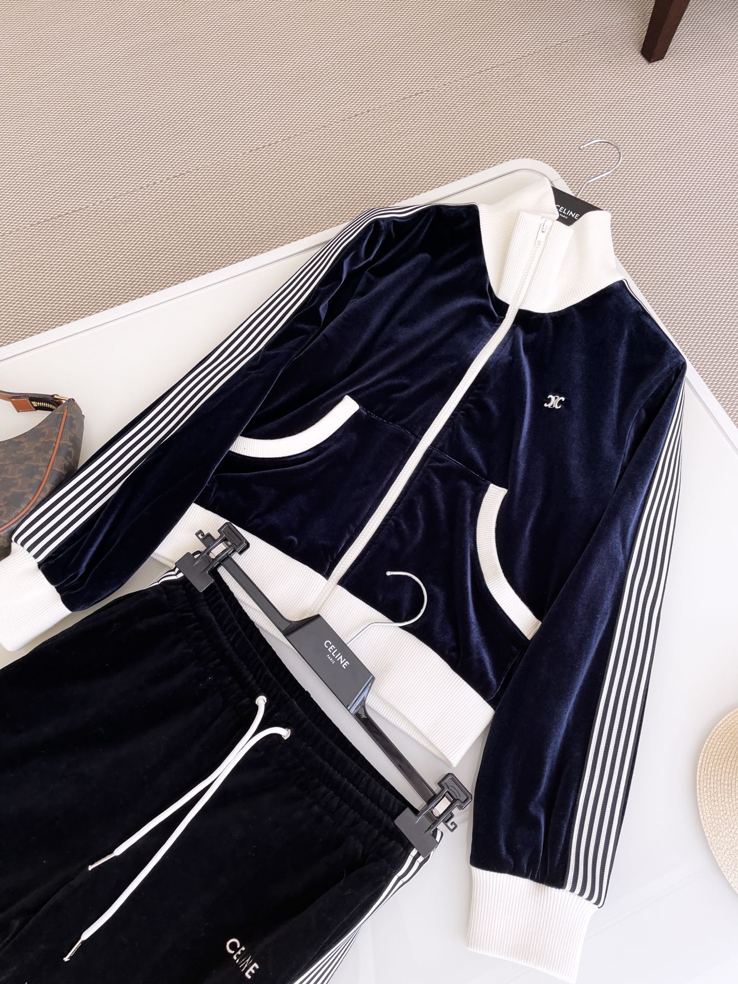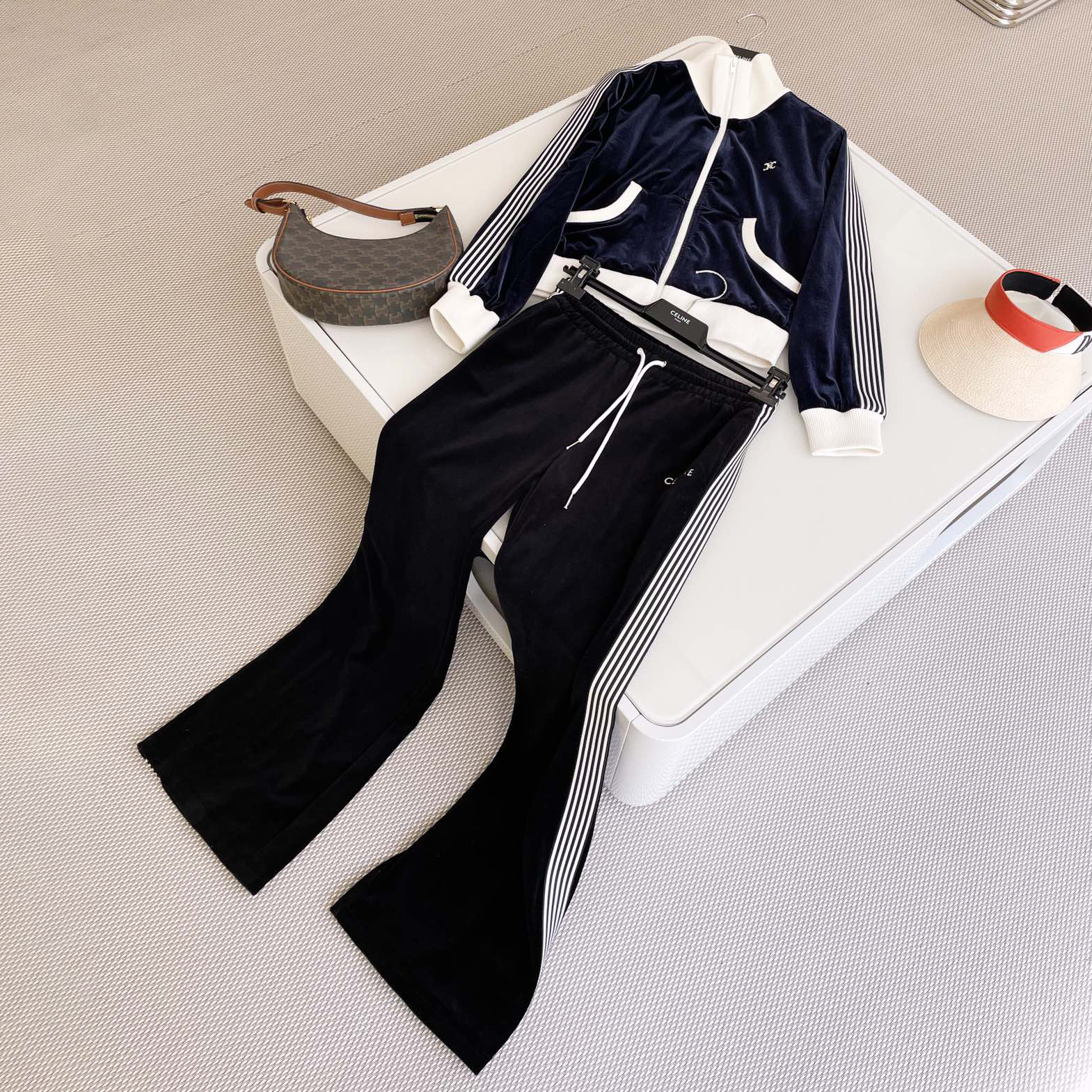 NIGO Celine Women's Spring and Autumn Navy Blue Stripe Printed Zipper Plain Knit Jacket Lace-Up Lounge Pants Set Suit #nigo72867