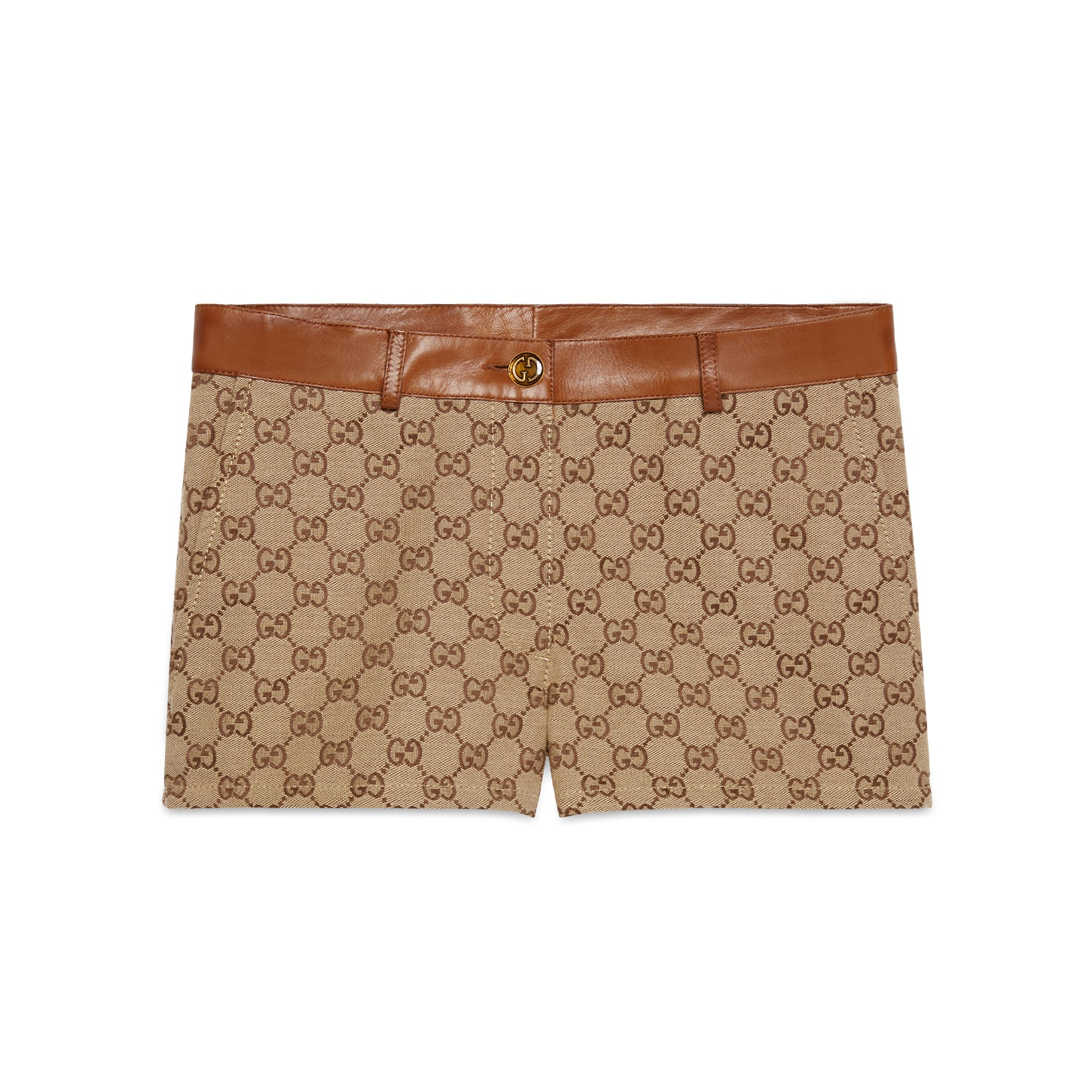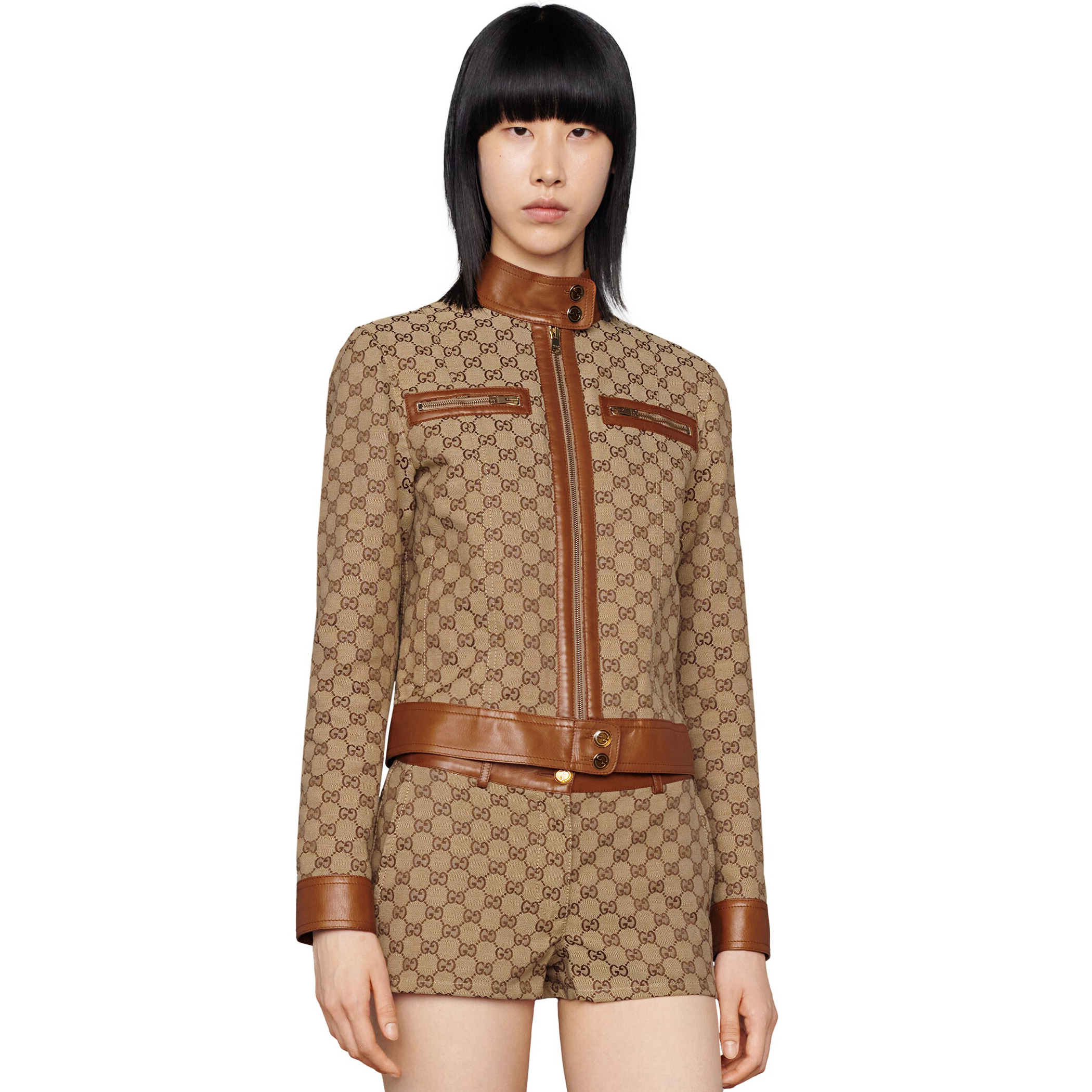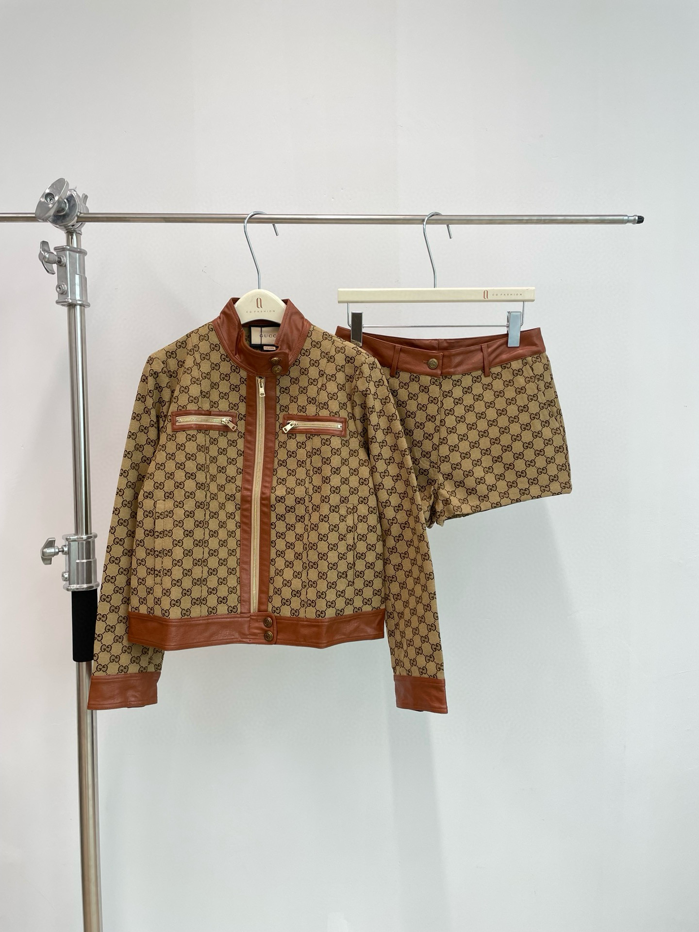 NIGO Gucci Women's Autumn Winter Khaki Leather Tumbled GG Canvas Jacket Shorts Pants Suit Set #nigo98491
