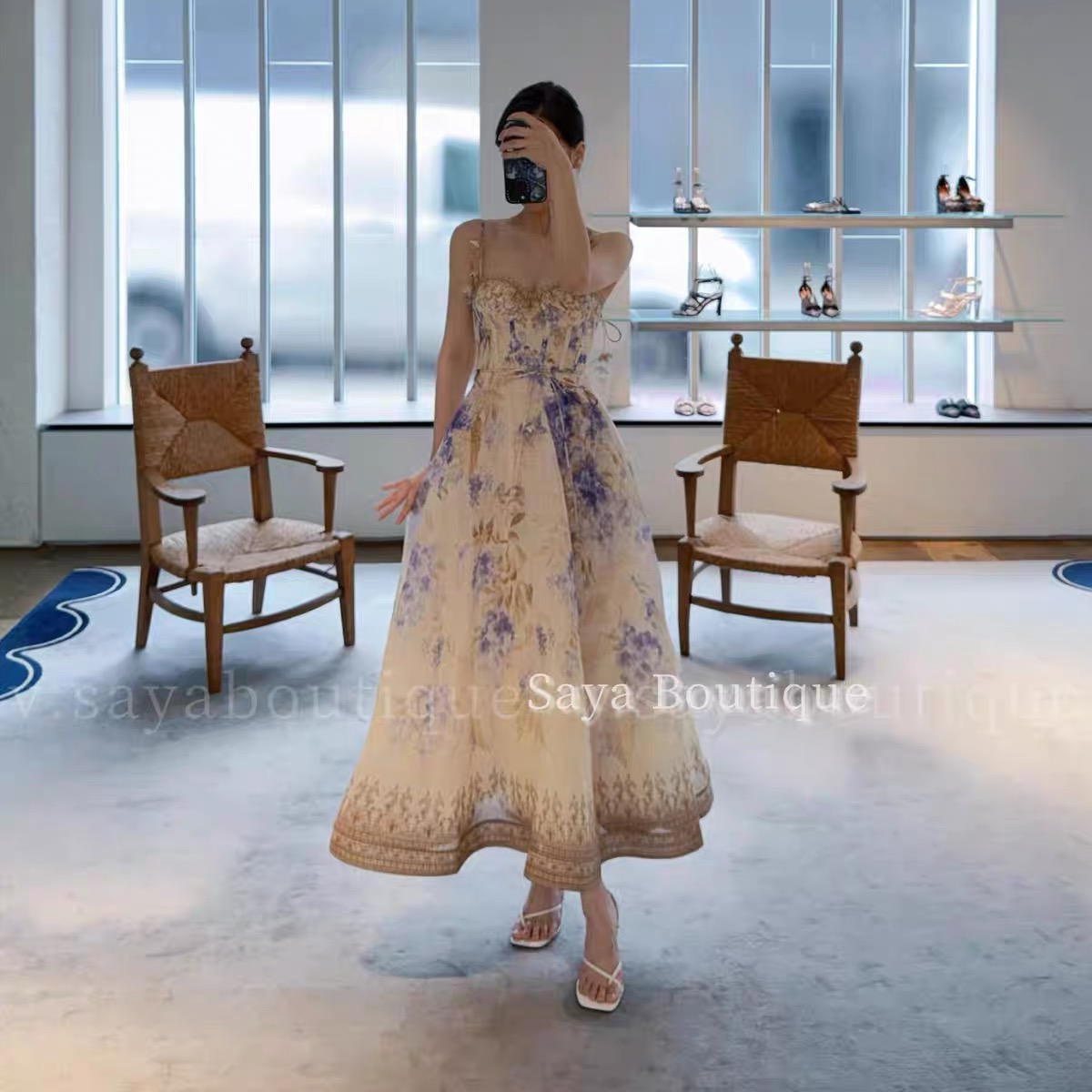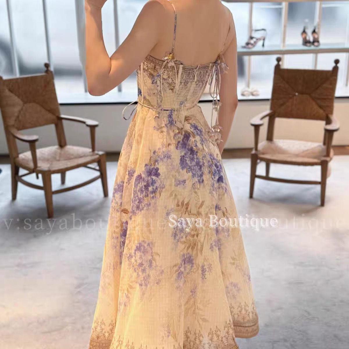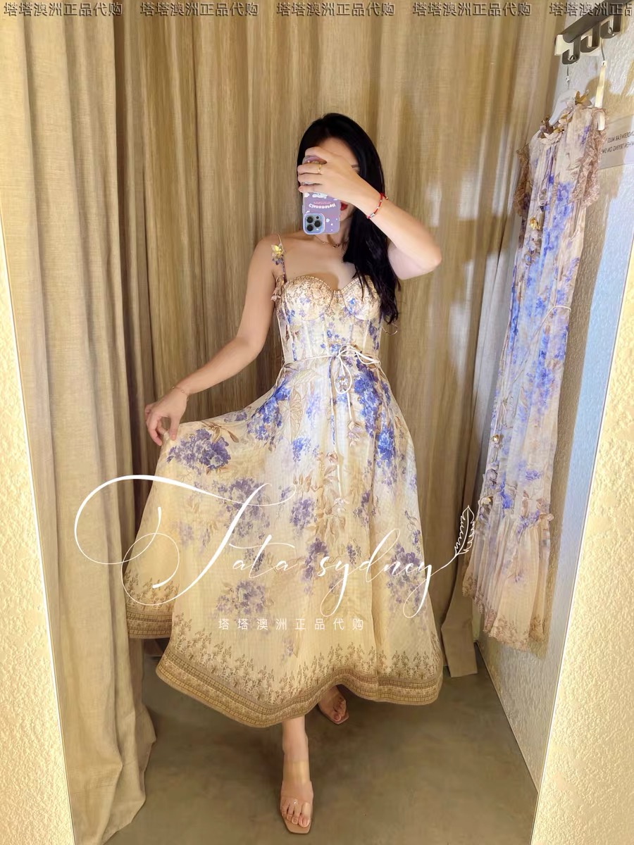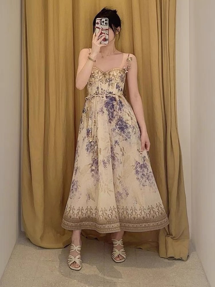 NIGO Zimmermann Dawning Picnic Dress Women's Spring And Summer Silk Linen Mid-length Dress Heart-shaped Neckline Spaghetti Straps Large Hem Dress Fashionable Temperament Elegant Luxury Dresses #nigo81131