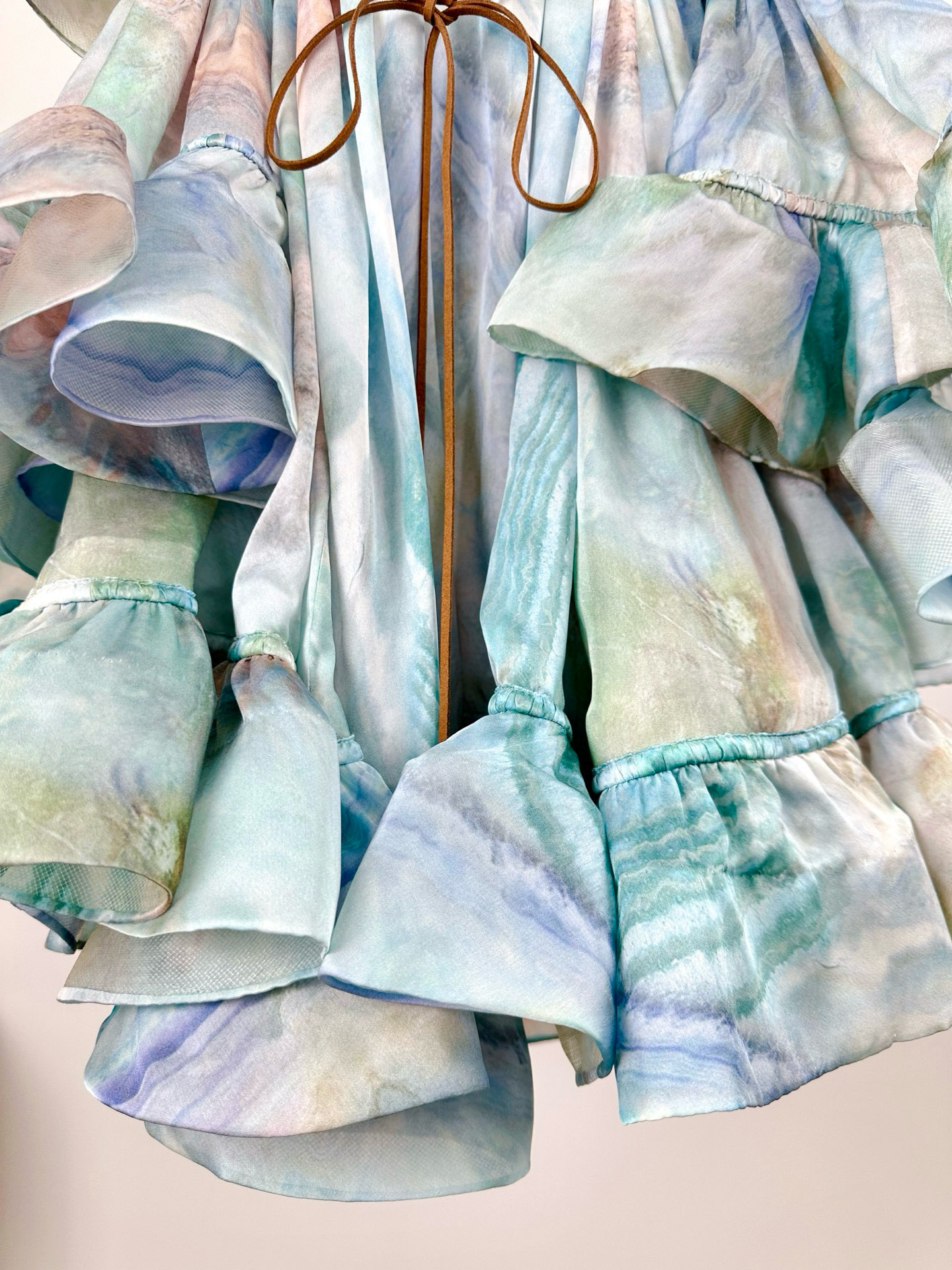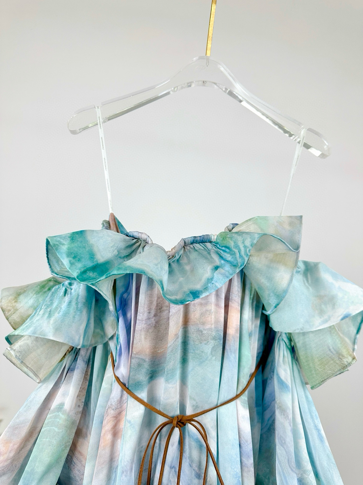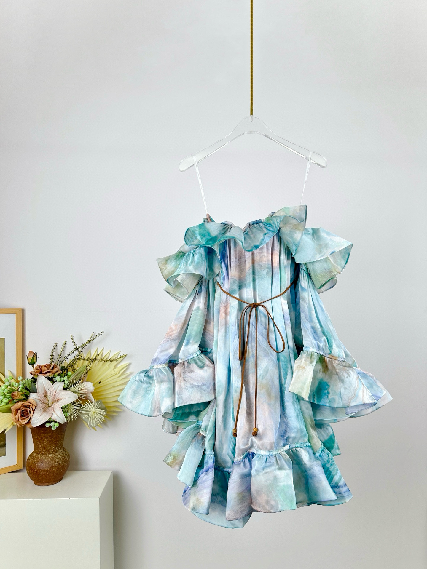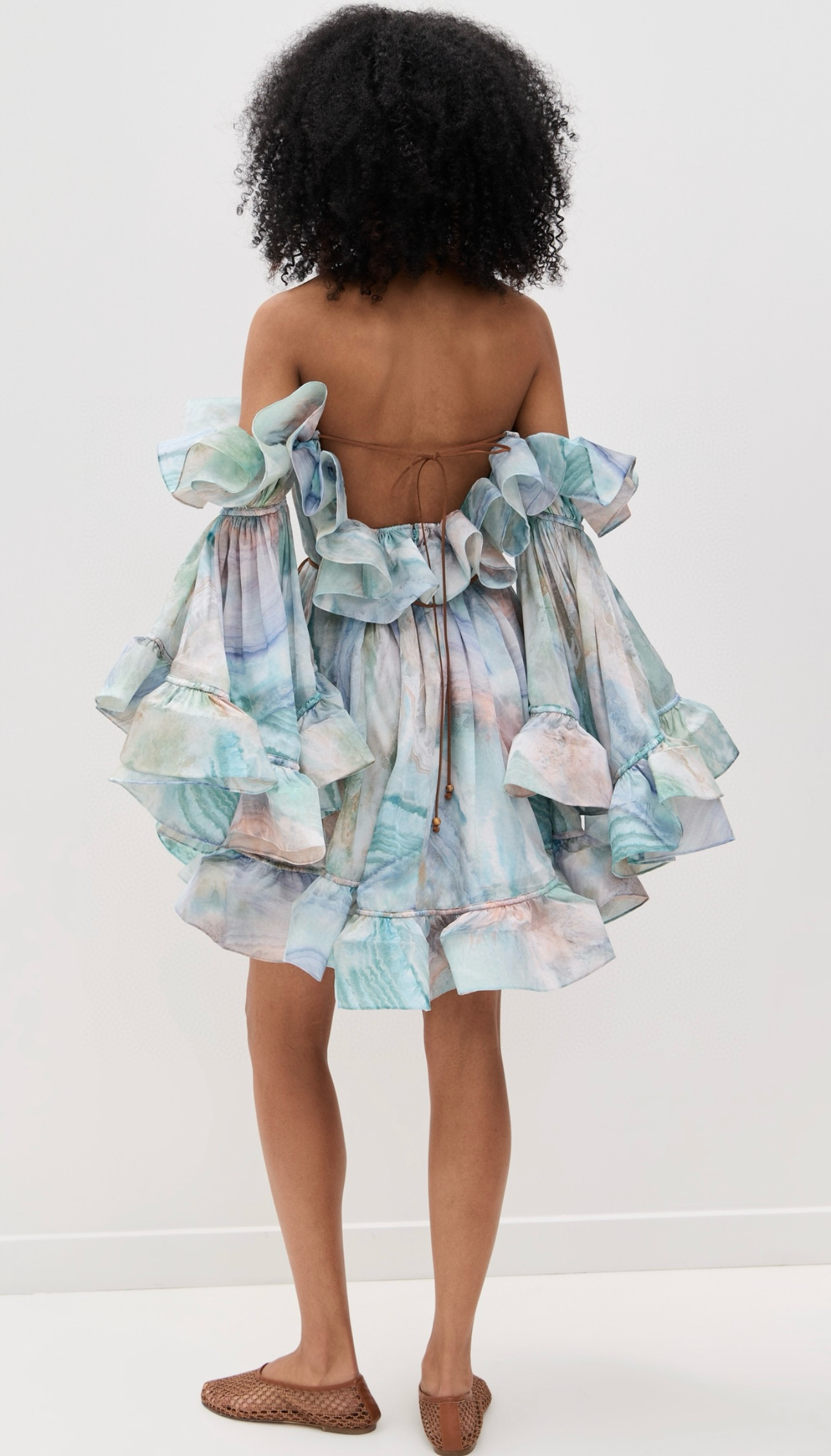 NIGO Zimmermann Women's Summer Blue Printed Silk Ruffle Strapless Mini Silk Dress #nigo77178