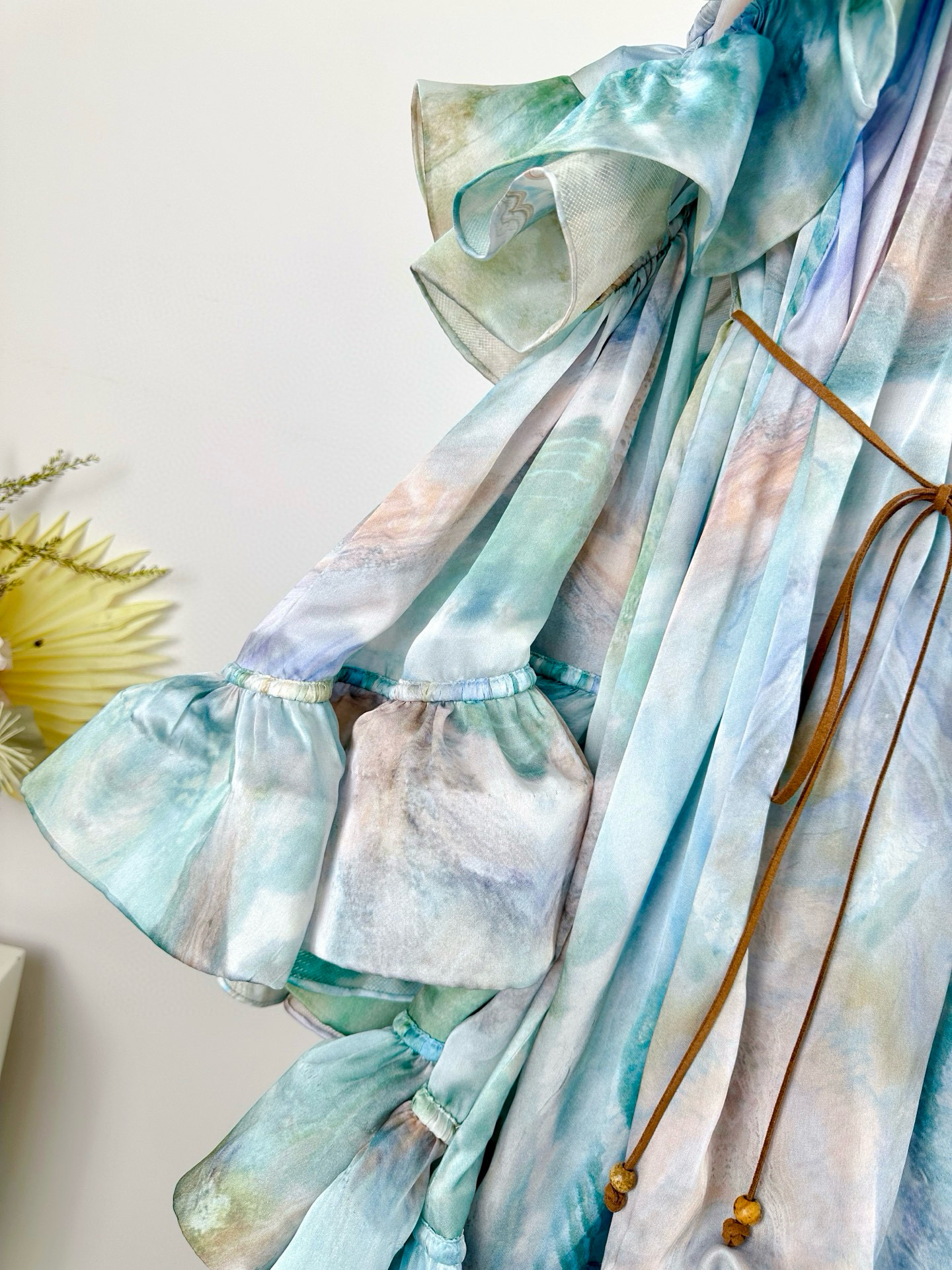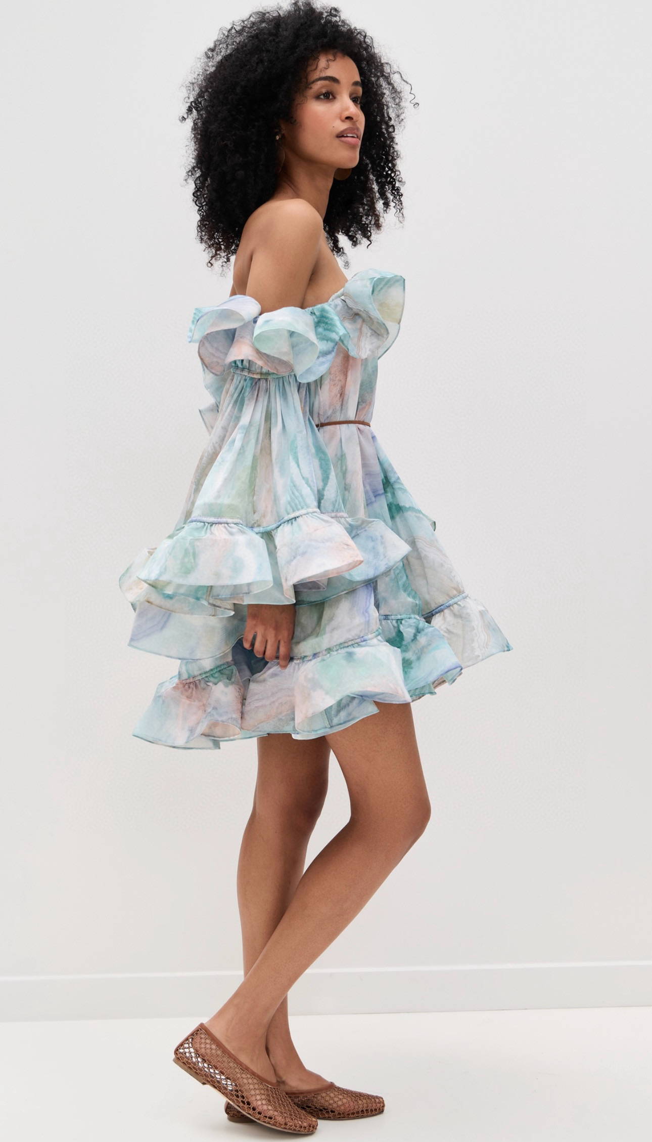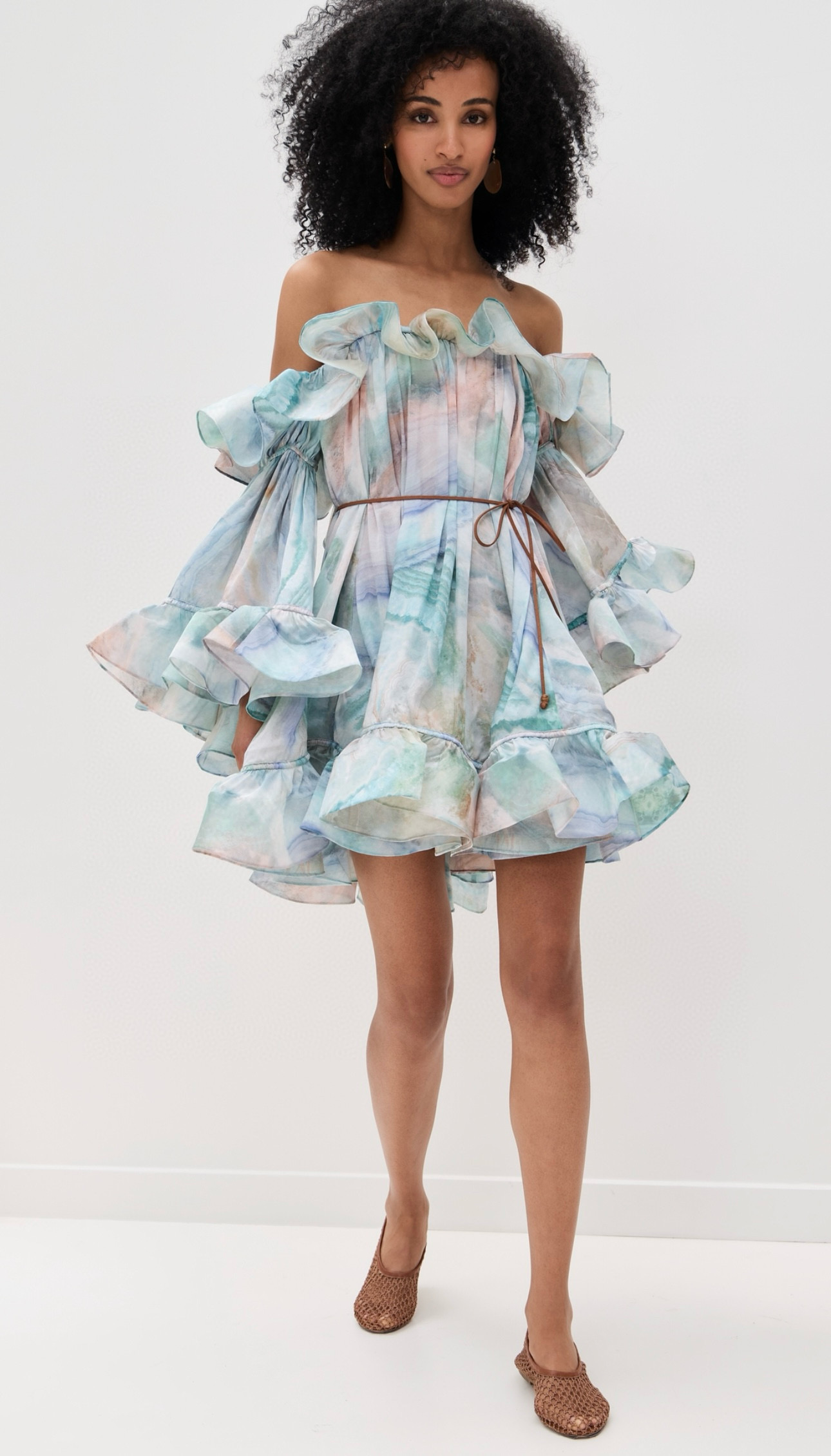 NIGO Zimmermann Women's Summer Blue Printed Silk Ruffle Strapless Mini Silk Dress #nigo77178