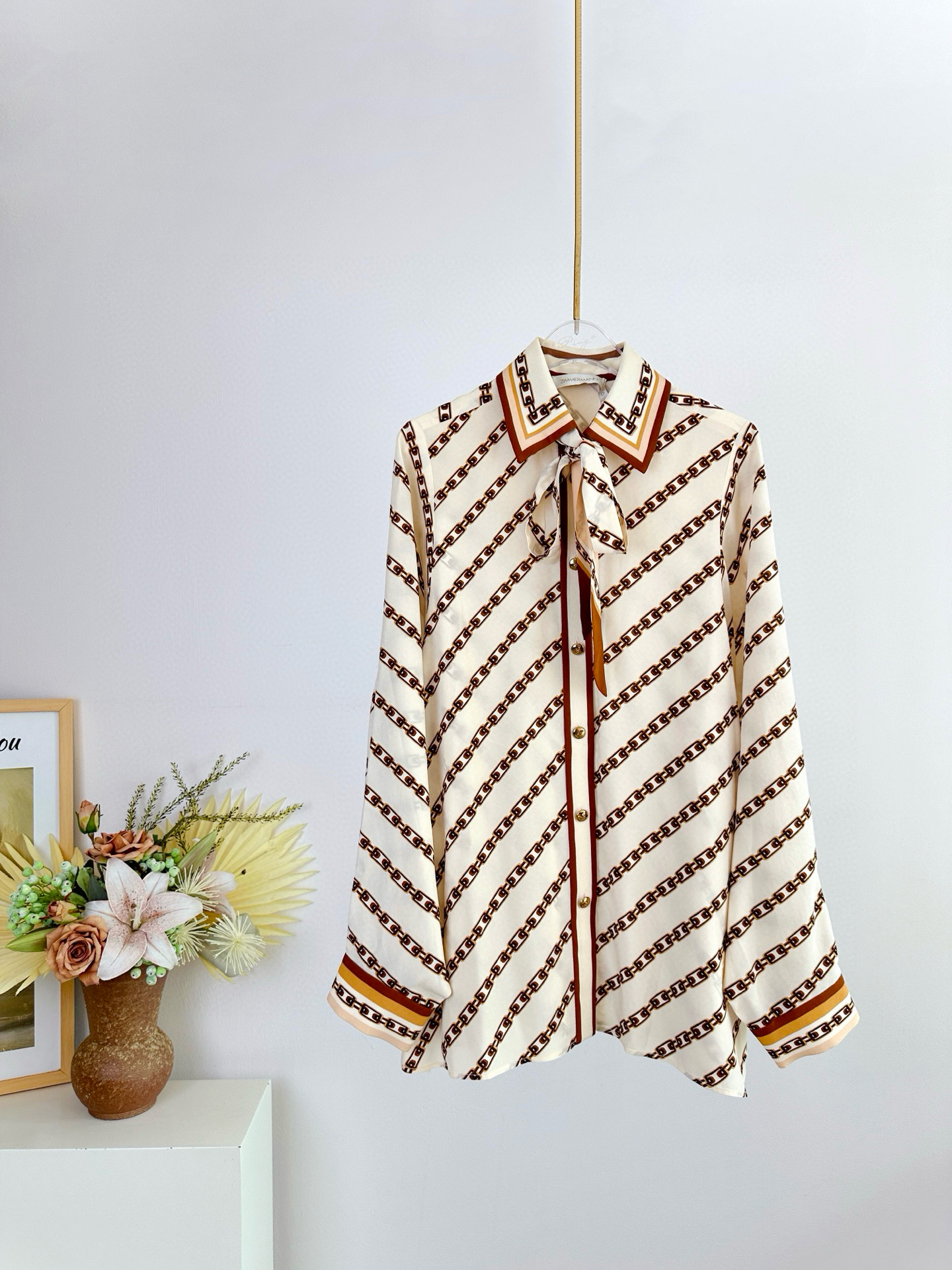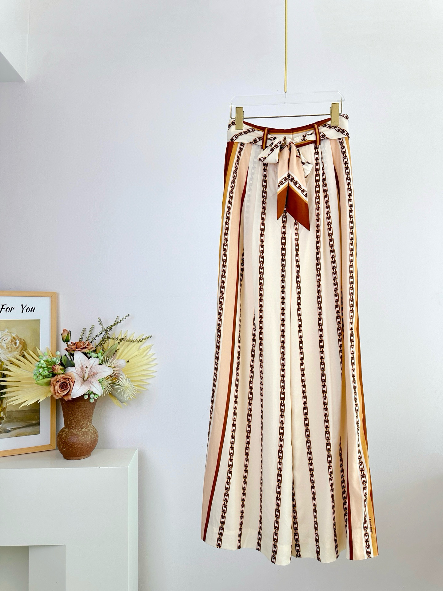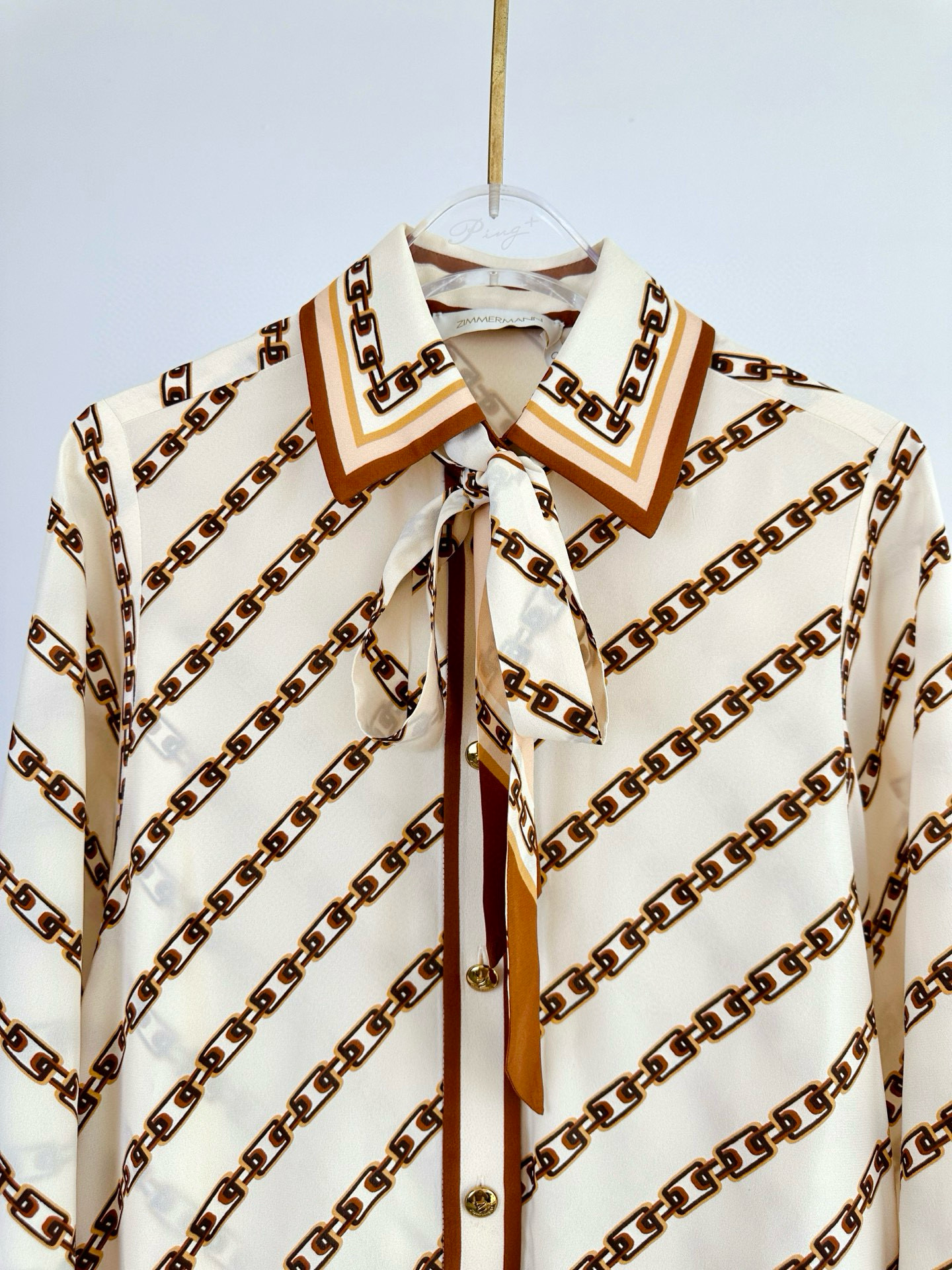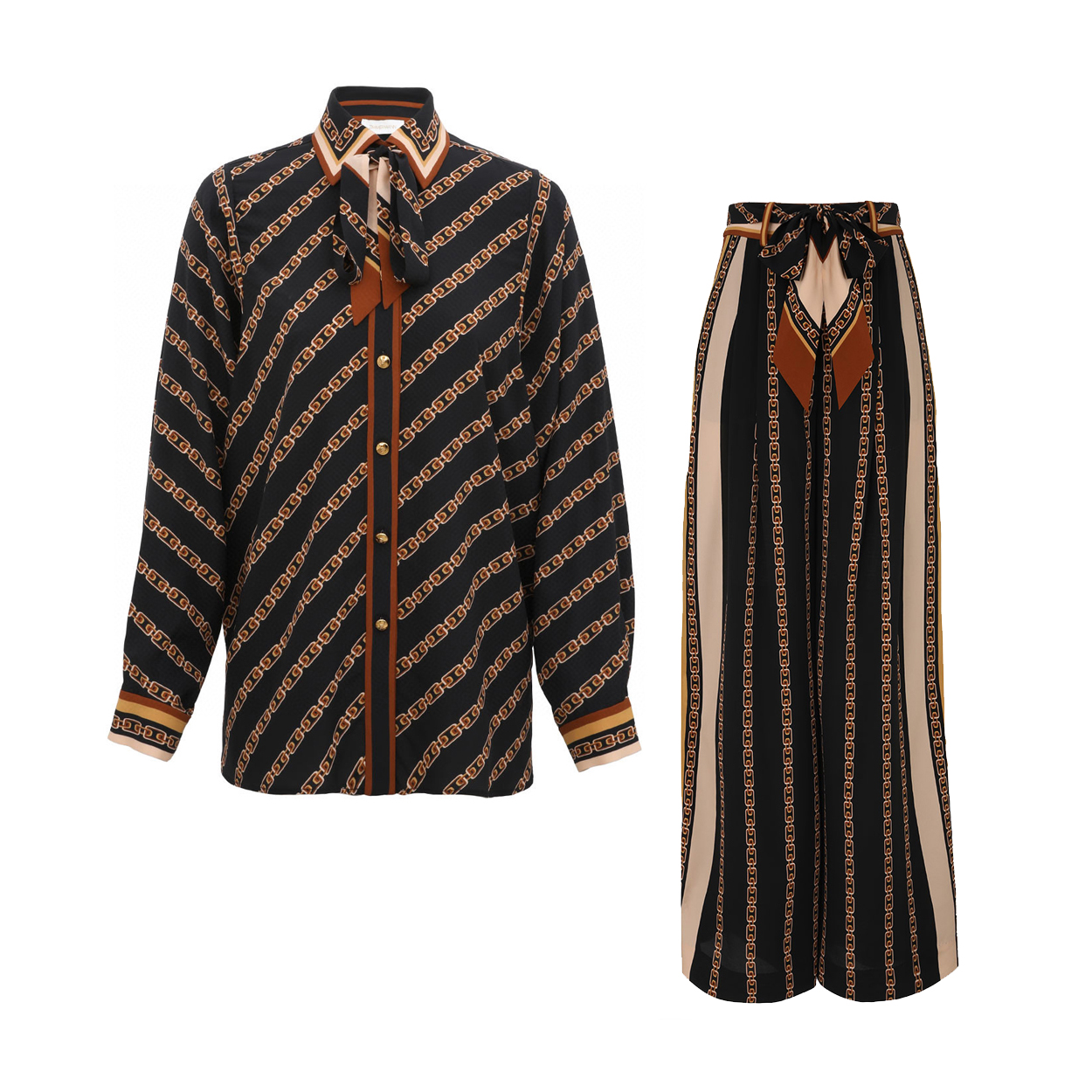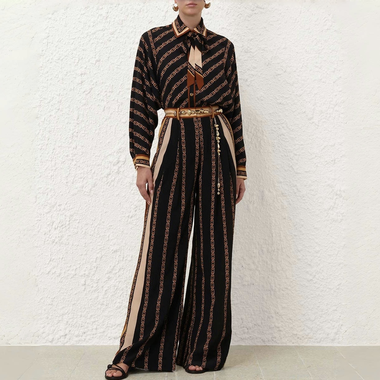 NIGO Zimmermann Women's Summer Bow Tie Neckline Chain Print Single Breasted Long Sleeved Shirt Casual Wide Leg Pants Suit Set #nigo76595