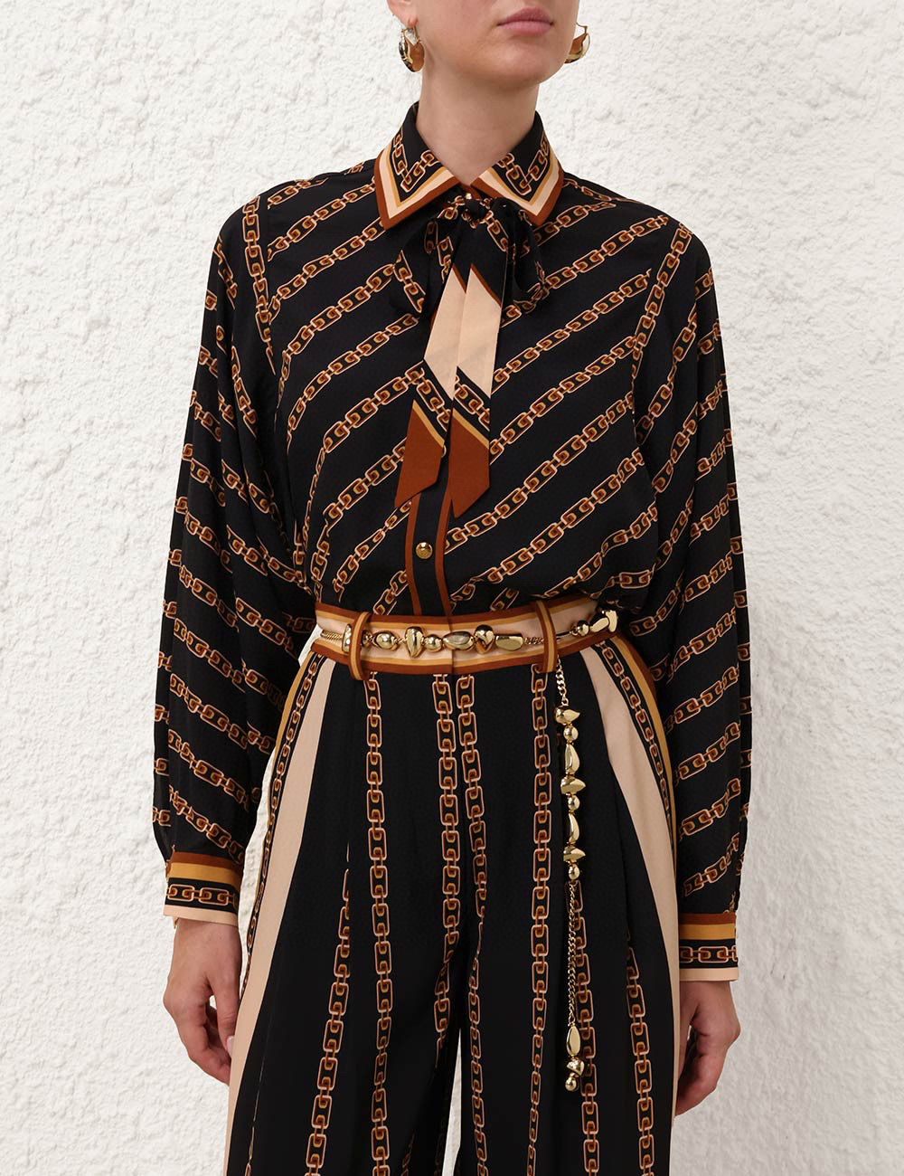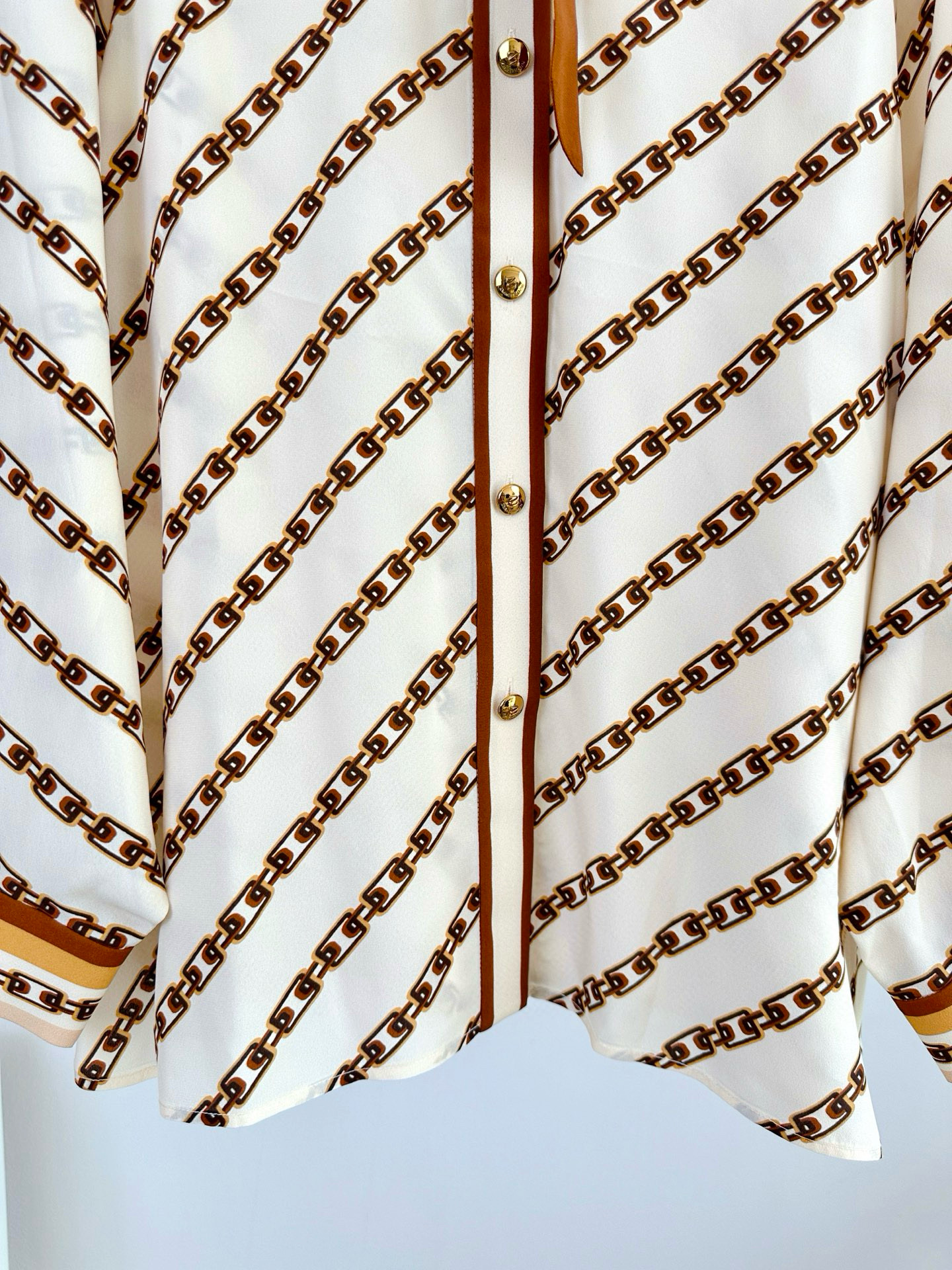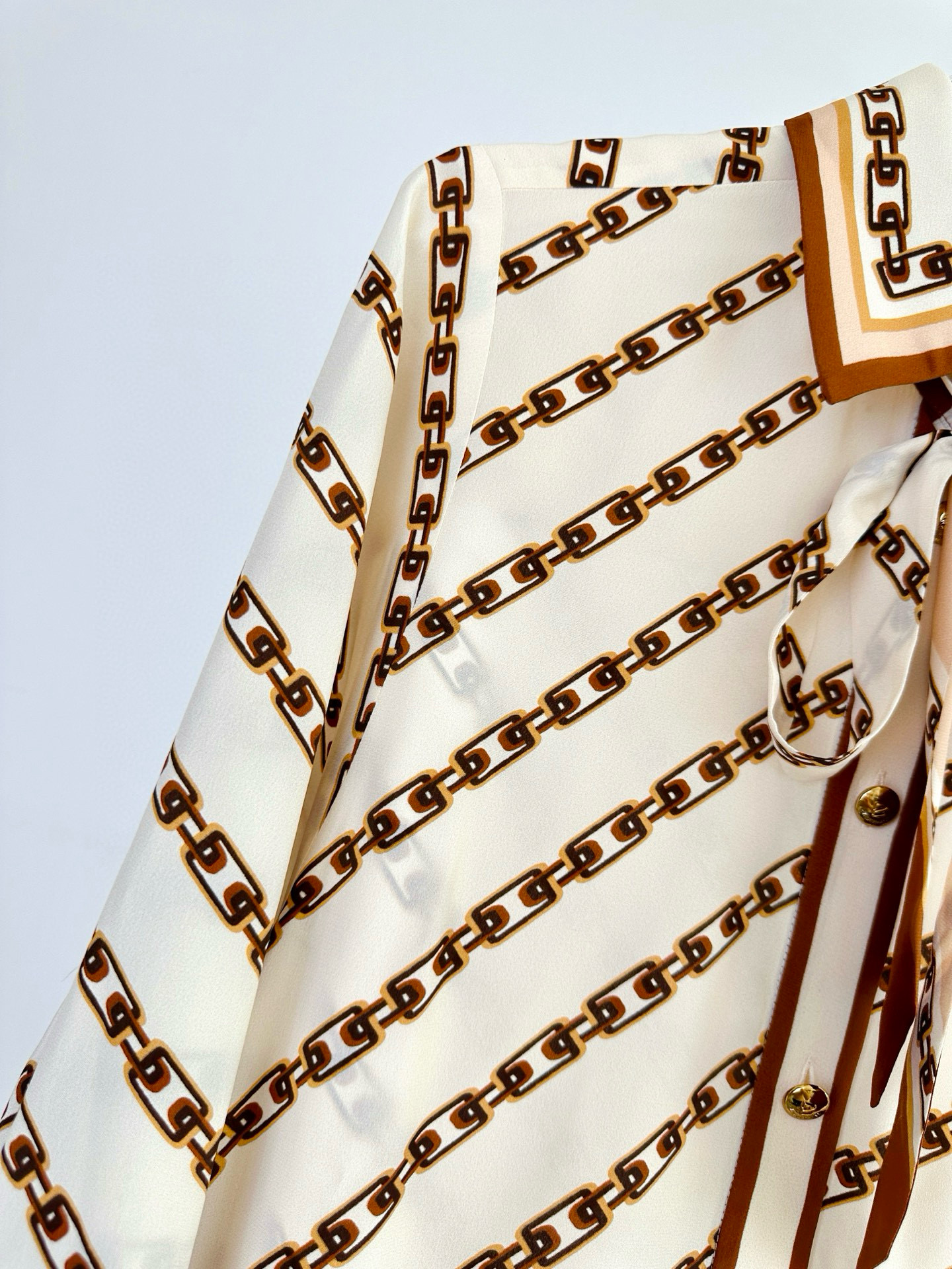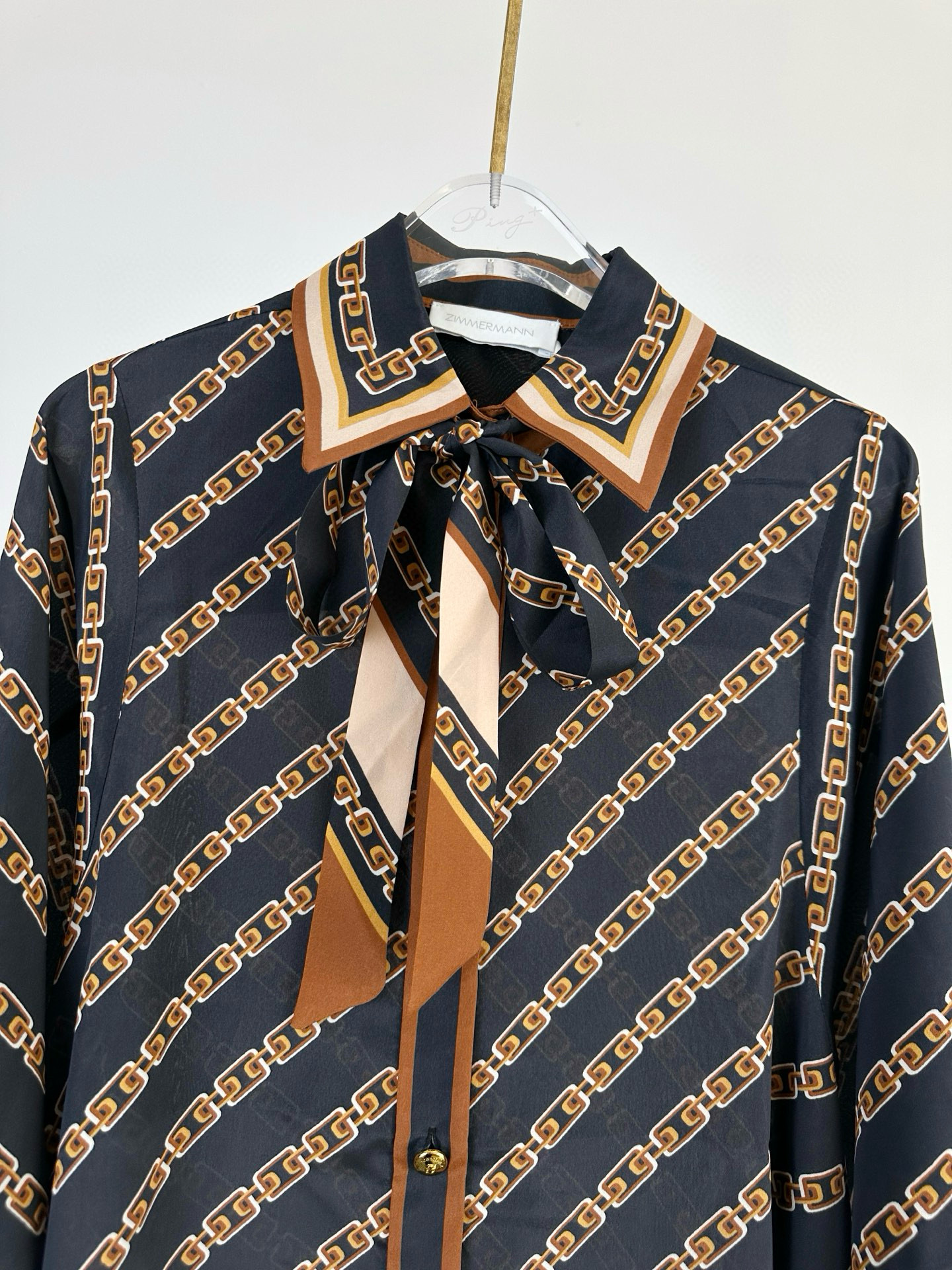 NIGO Zimmermann Women's Summer Bow Tie Neckline Chain Print Single Breasted Long Sleeved Shirt Casual Wide Leg Pants Suit Set #nigo76595