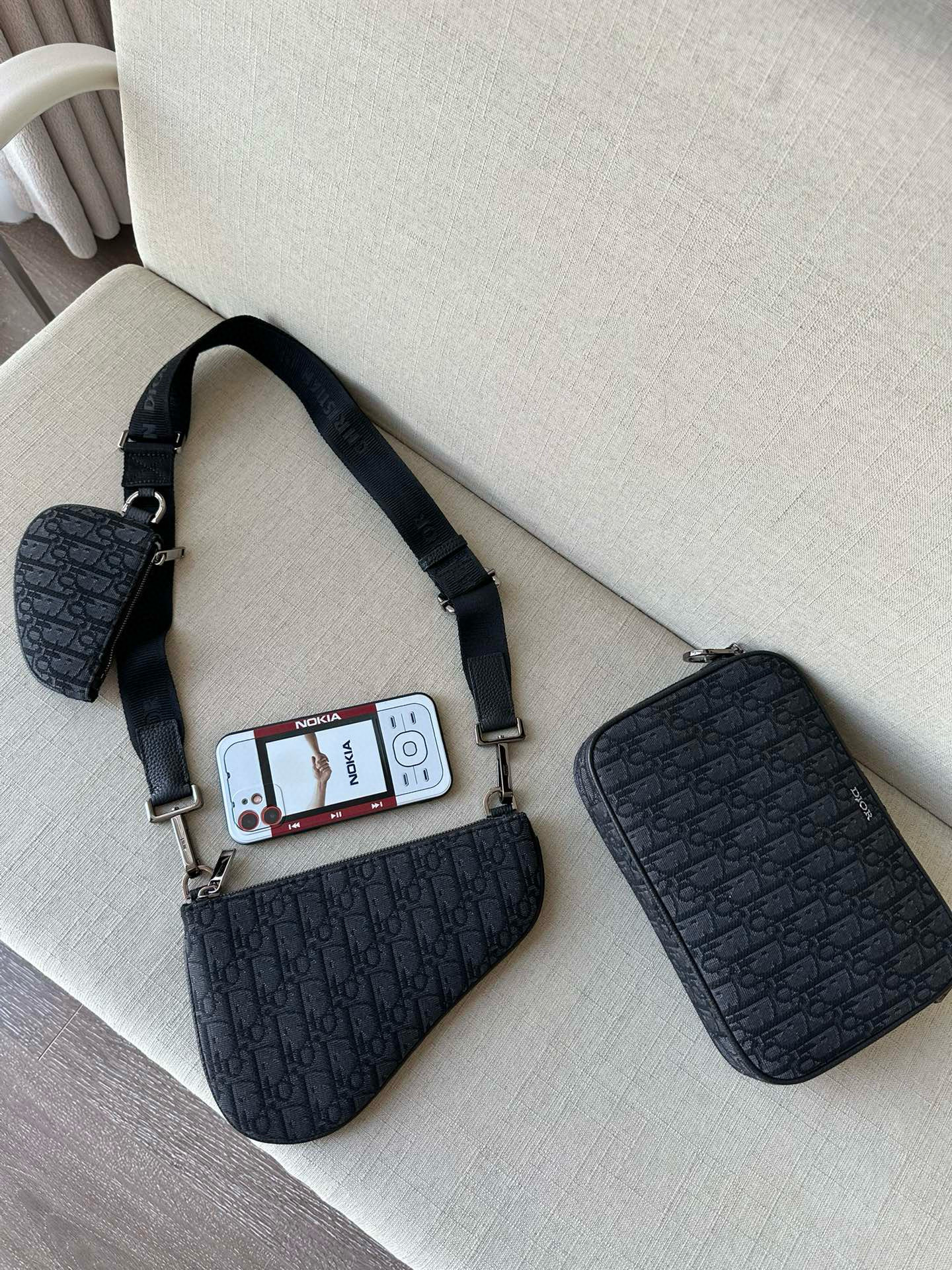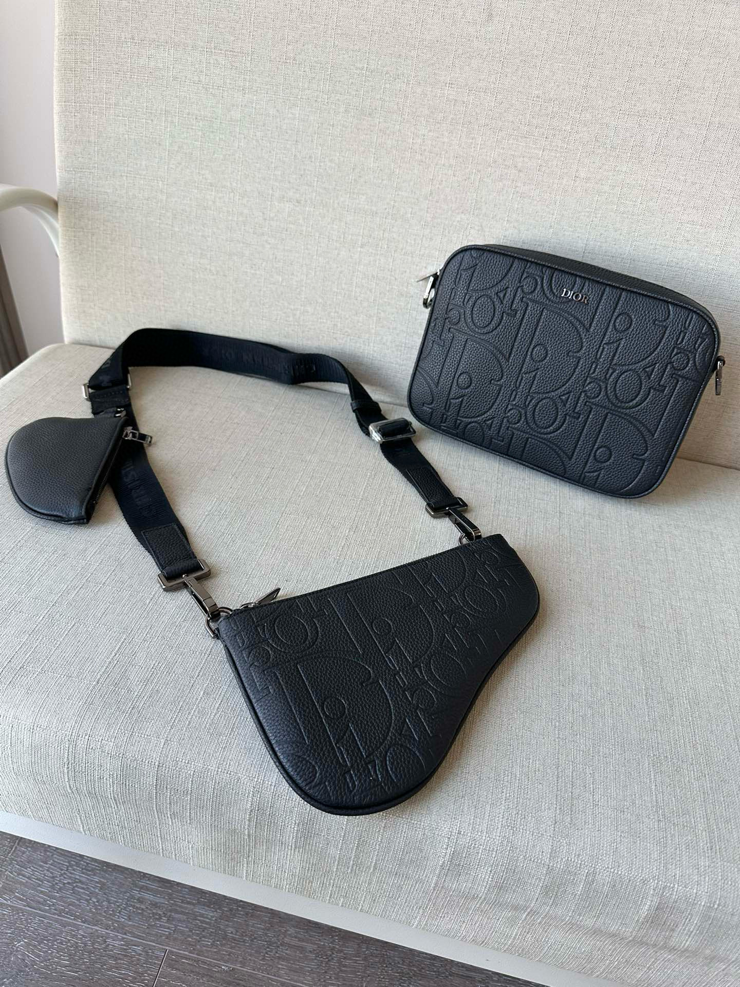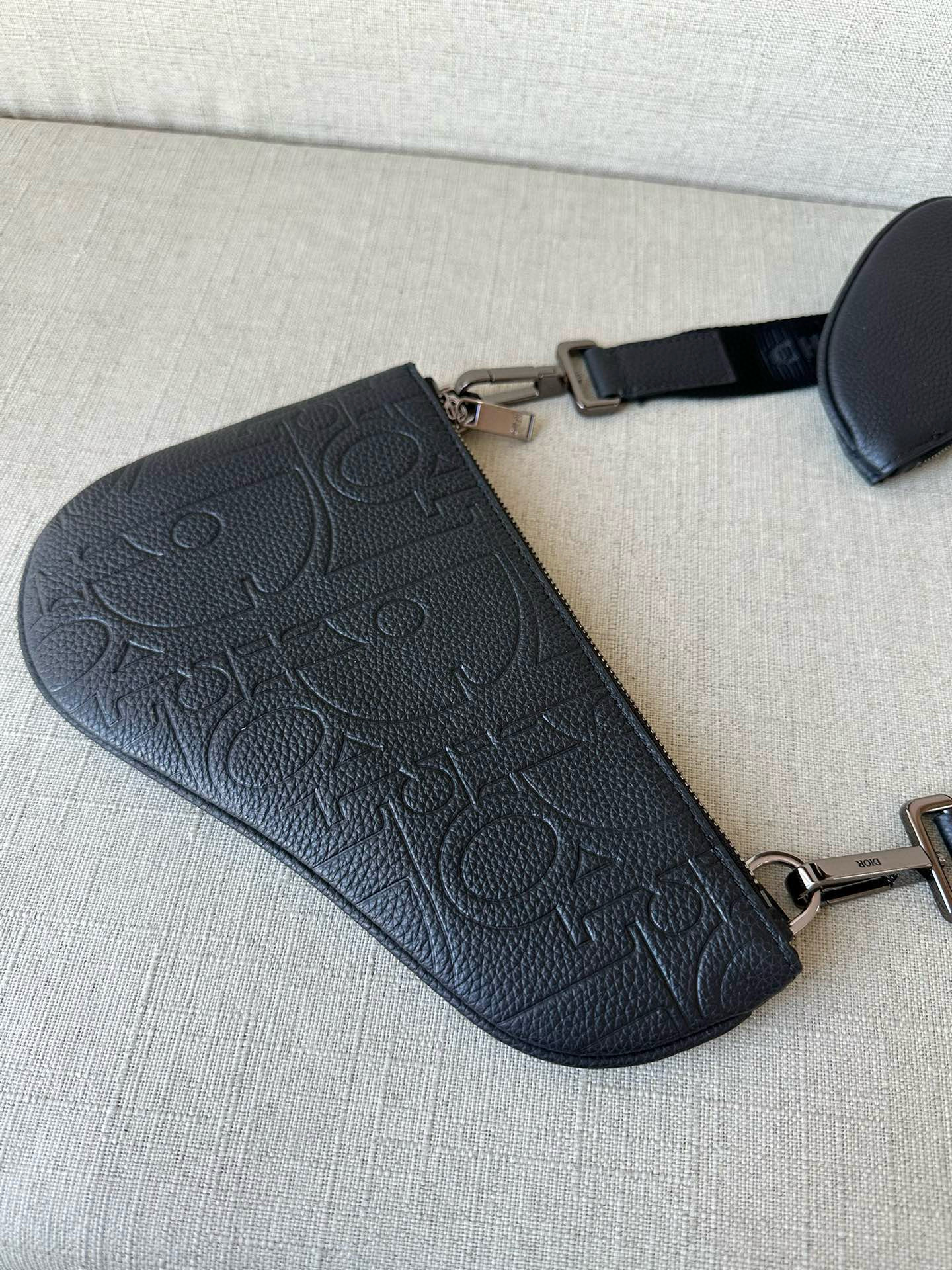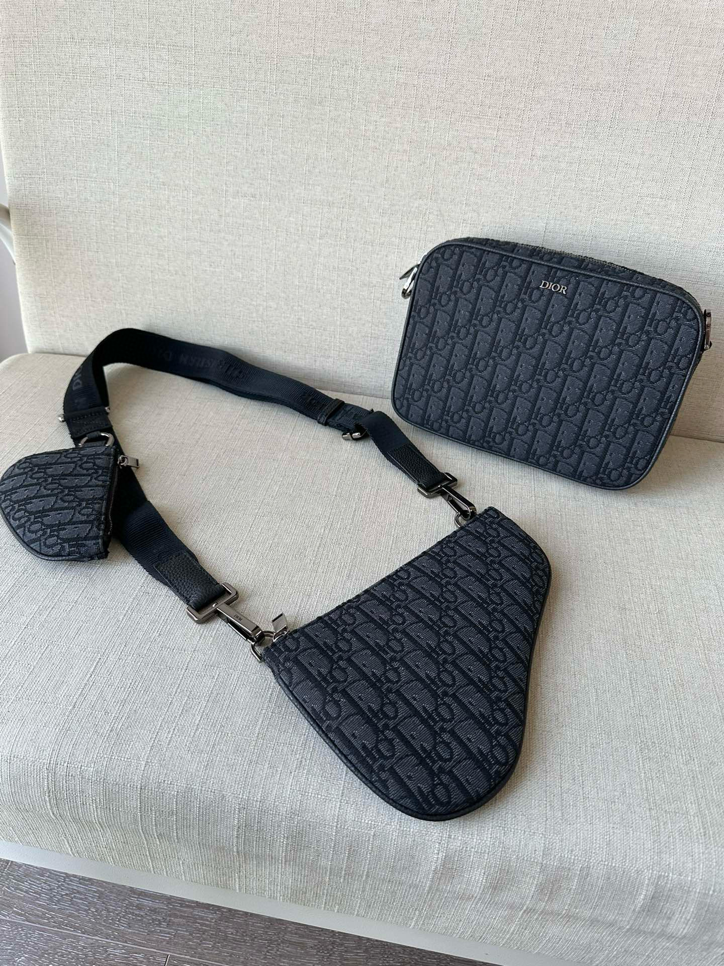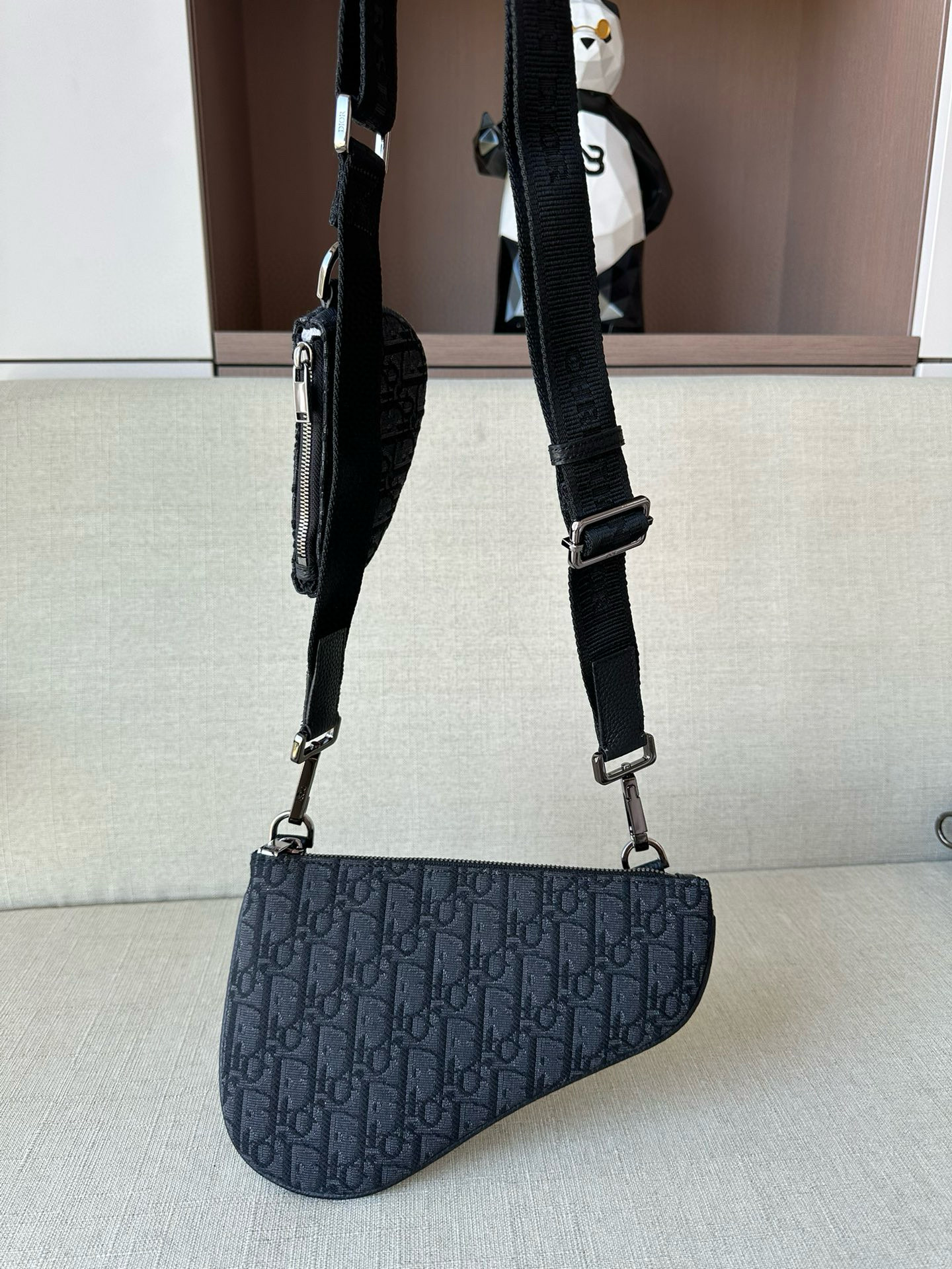 NIGO Dior Men's Black Embossed Pattern Magnetic Flap Leather Quilted Canvas Crossbody Saddle Bag Set of 3 #nigo74786
