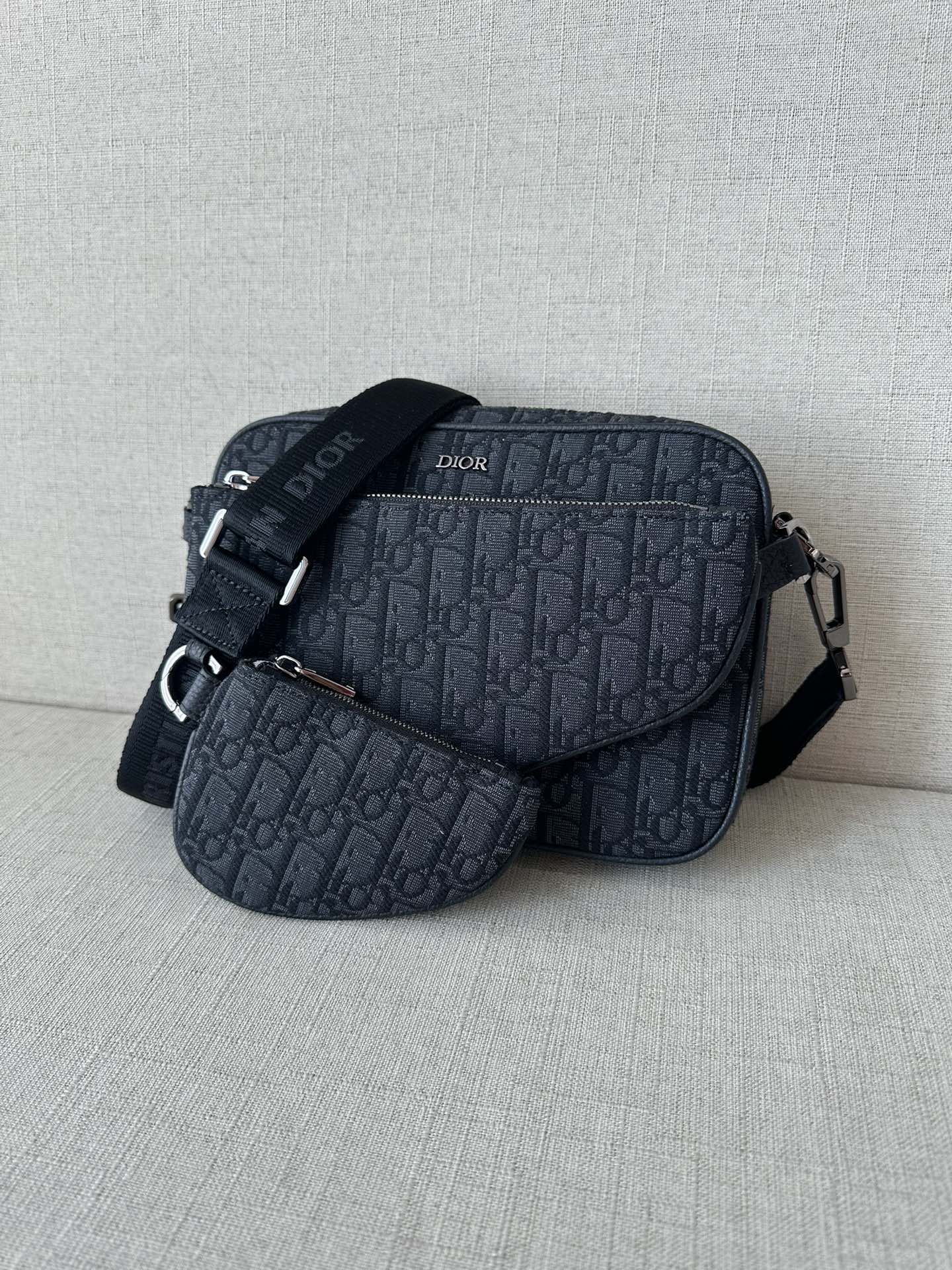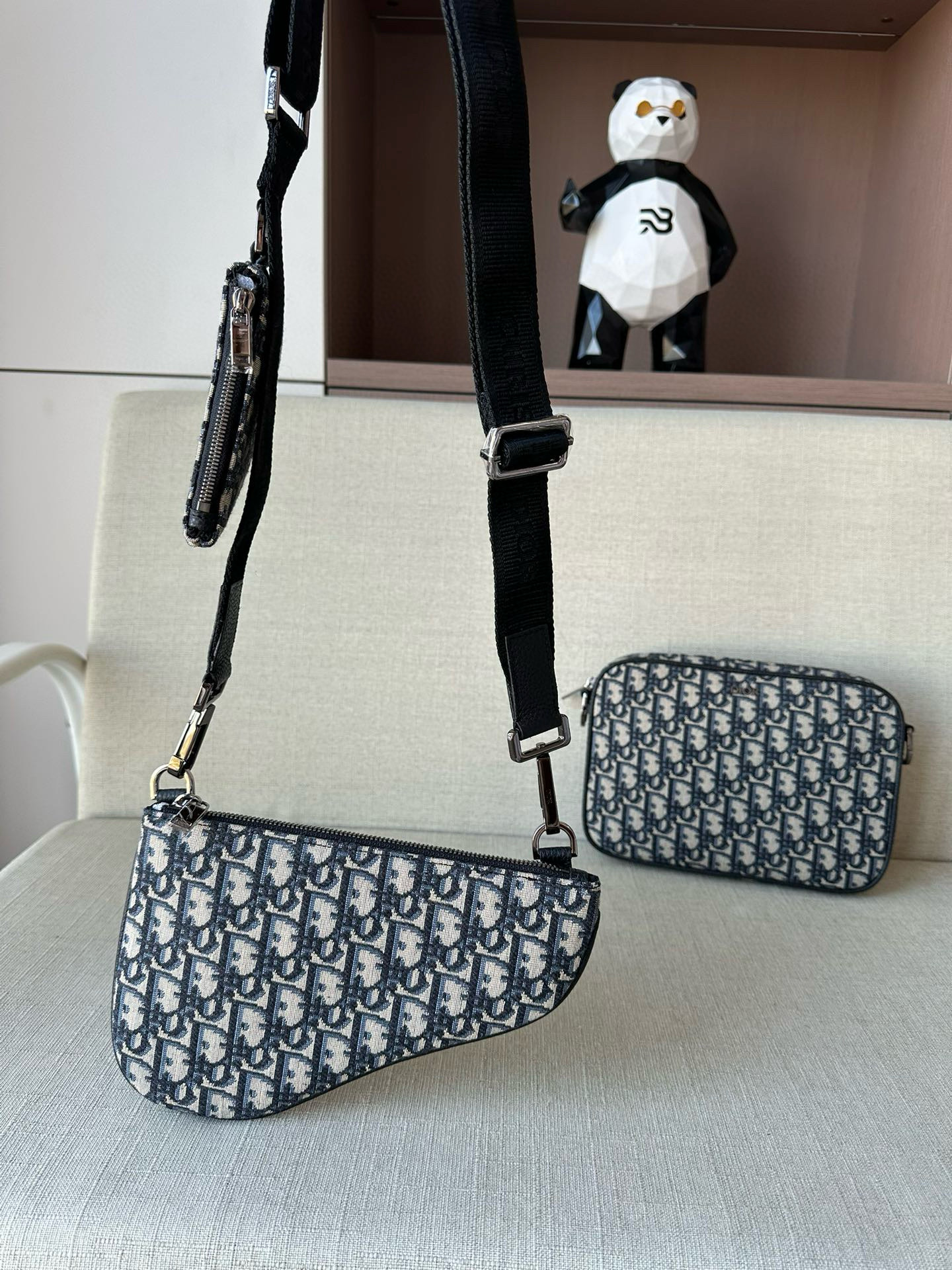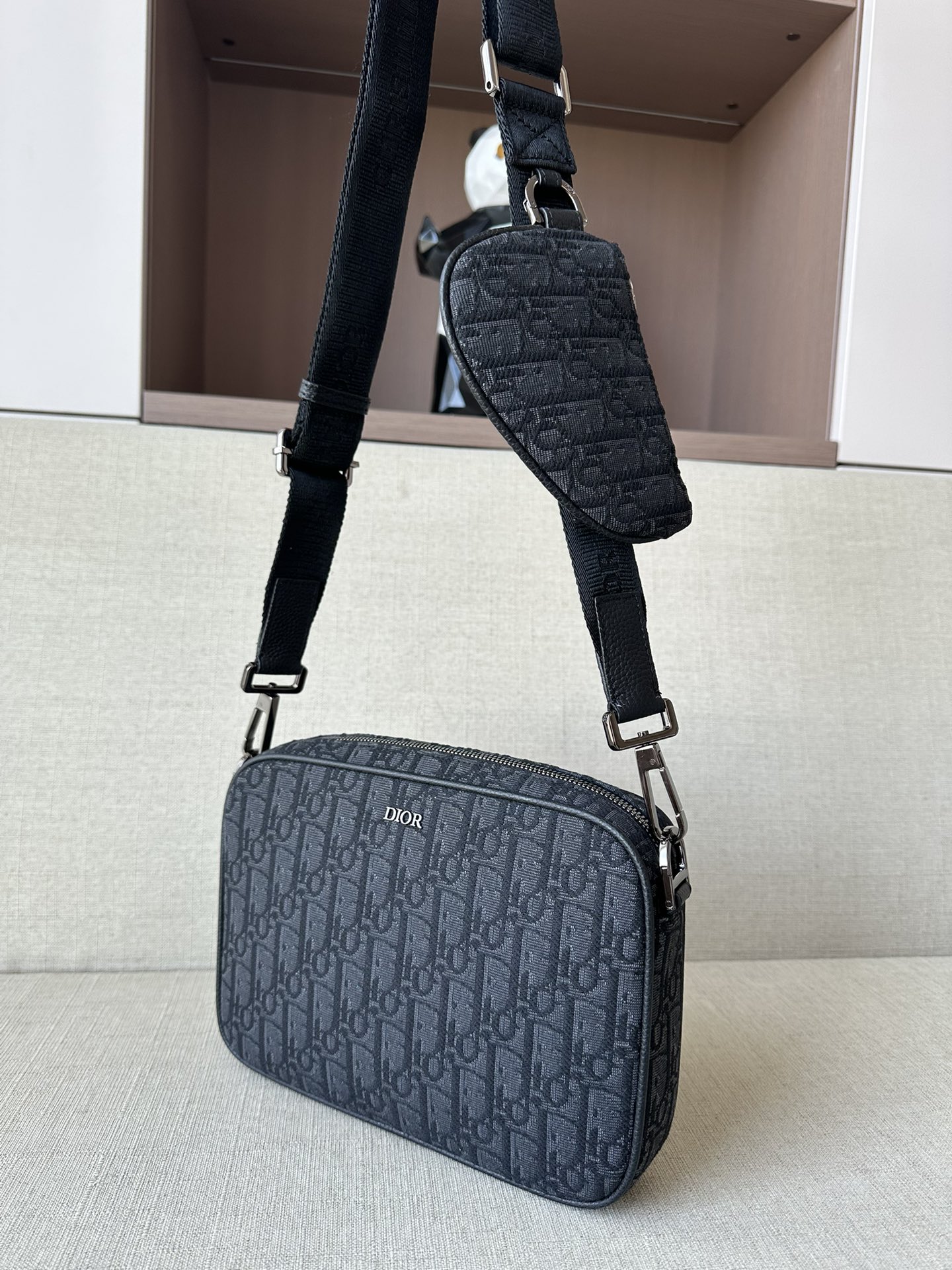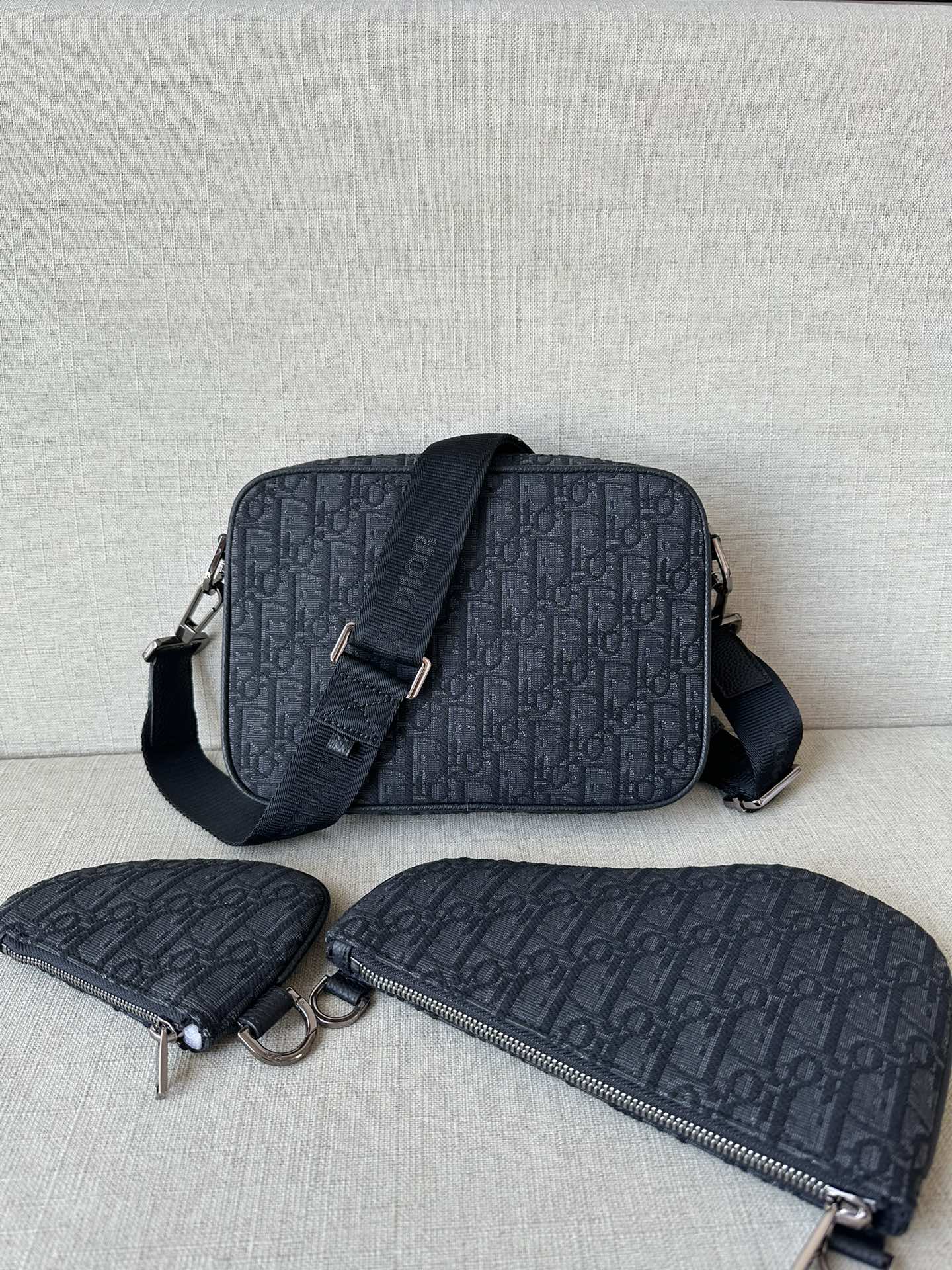 NIGO Dior Men's Black Embossed Pattern Magnetic Flap Leather Quilted Canvas Crossbody Saddle Bag Set of 3 #nigo74786