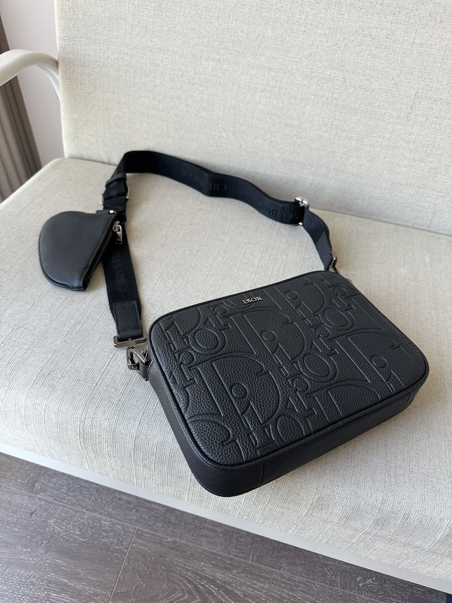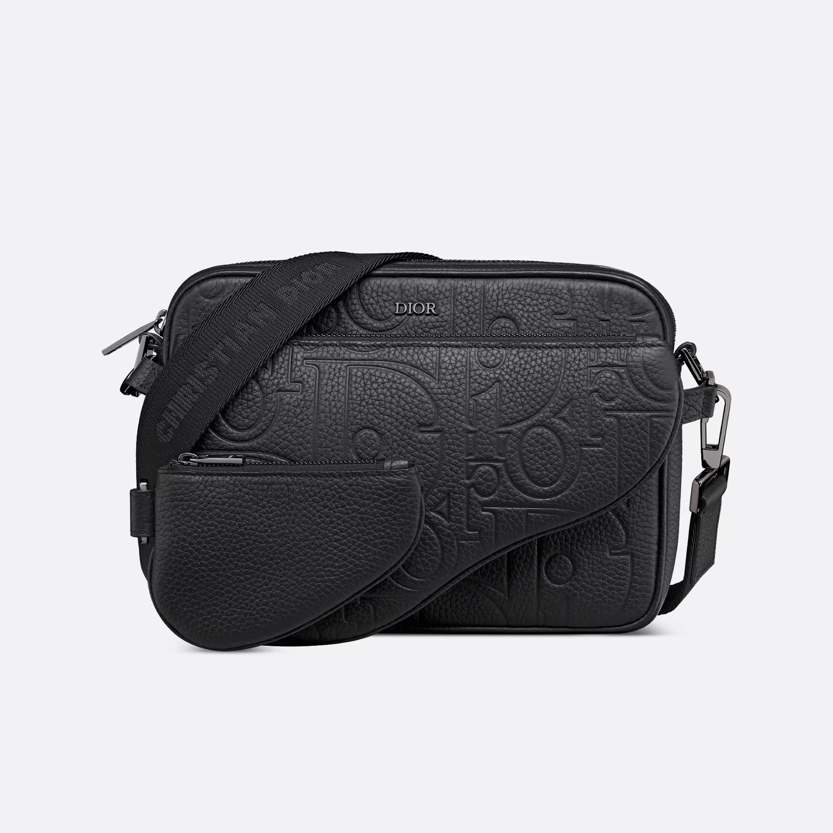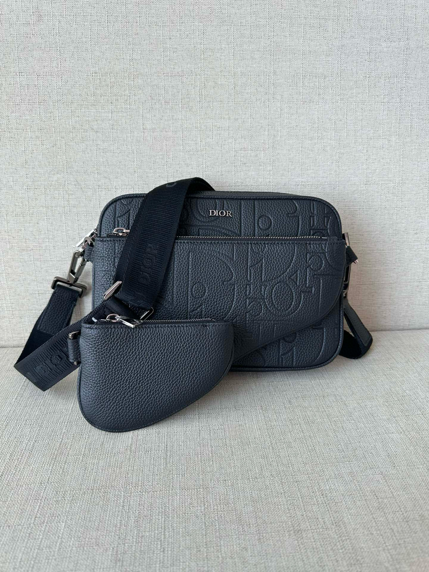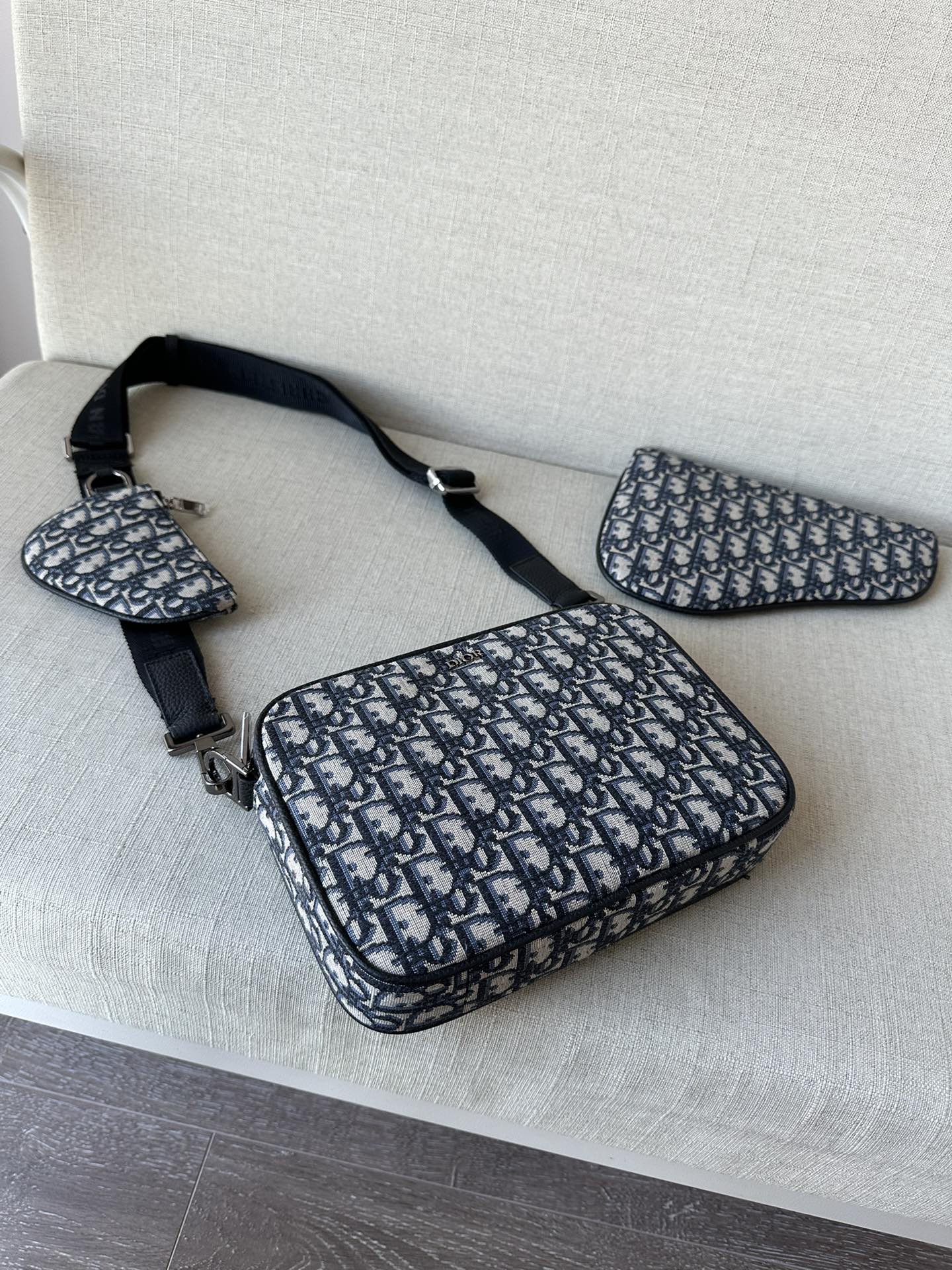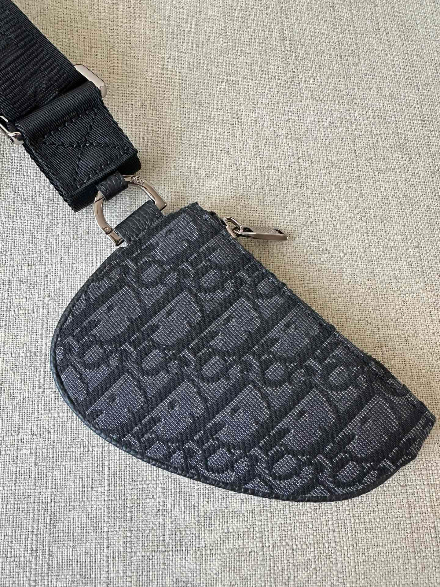 NIGO Dior Men's Black Embossed Pattern Magnetic Flap Leather Quilted Canvas Crossbody Saddle Bag Set of 3 #nigo74786