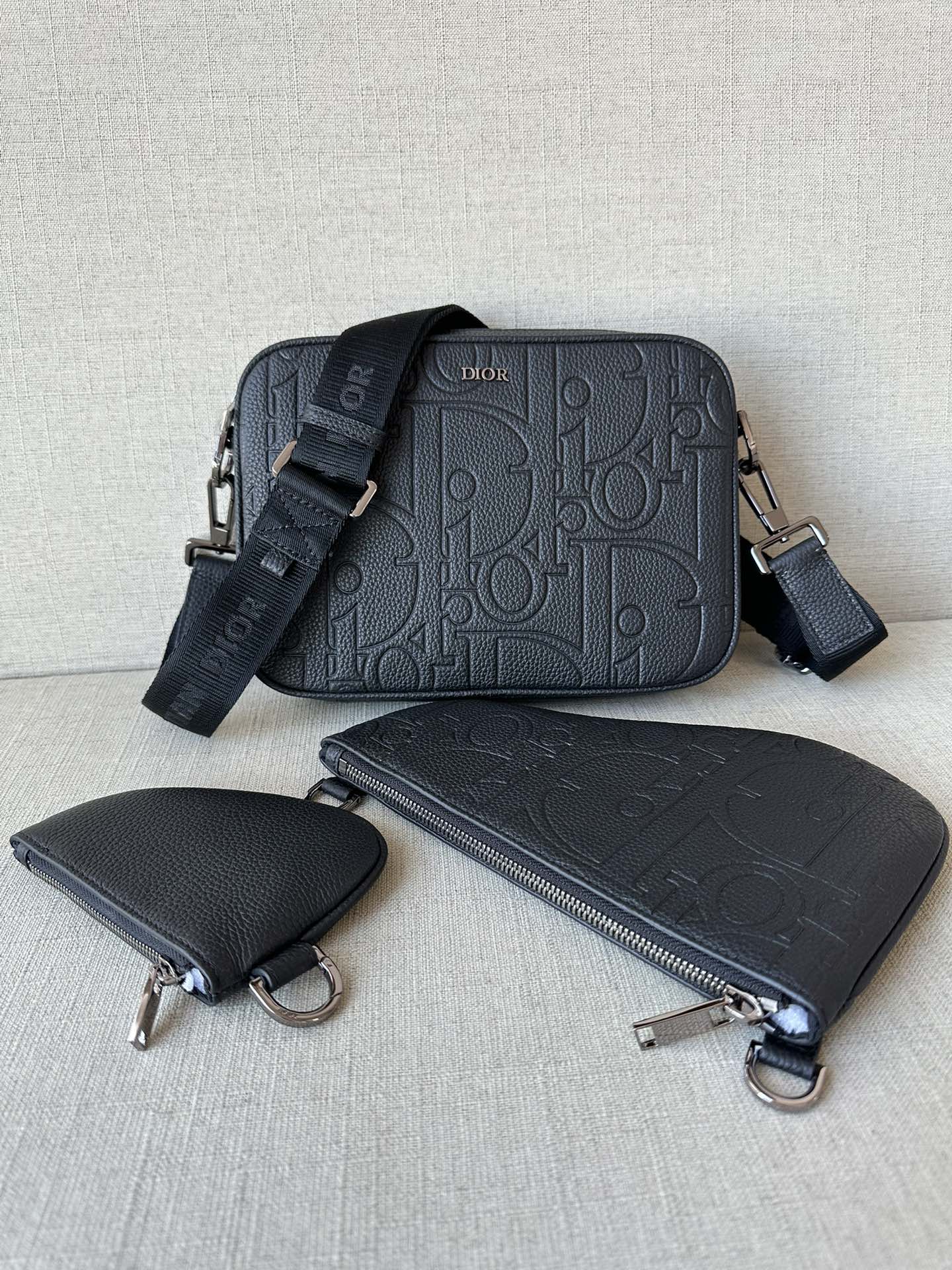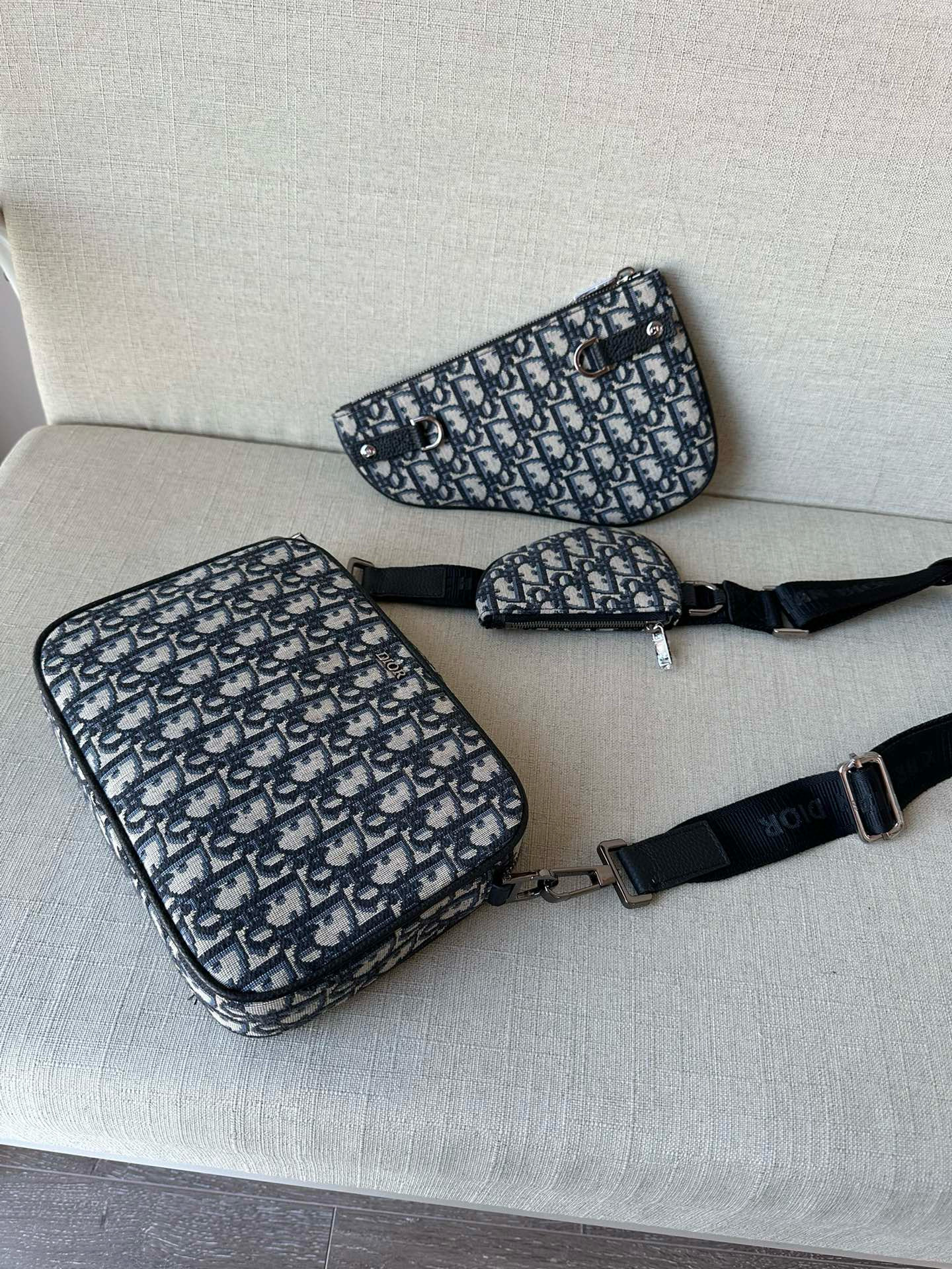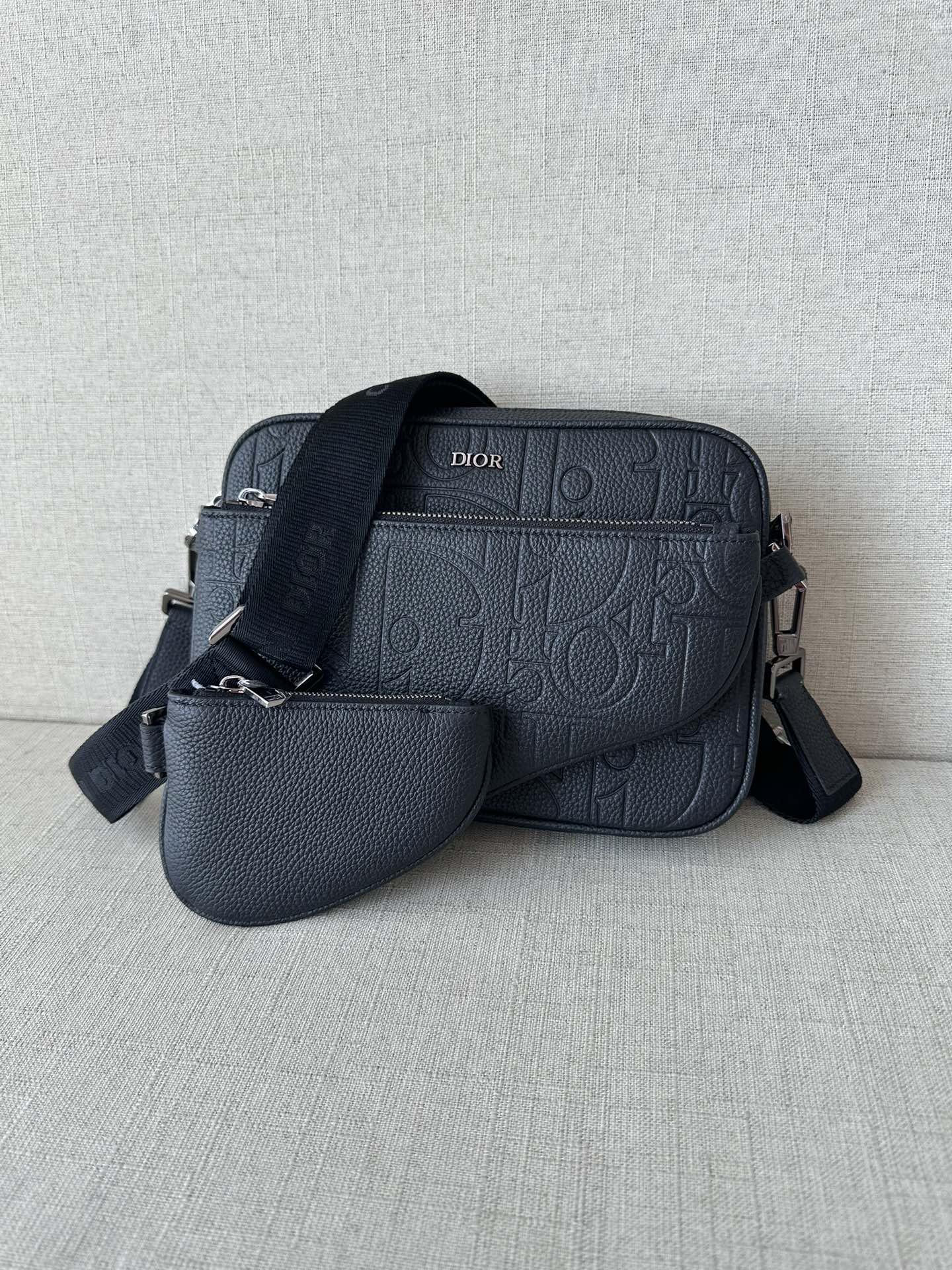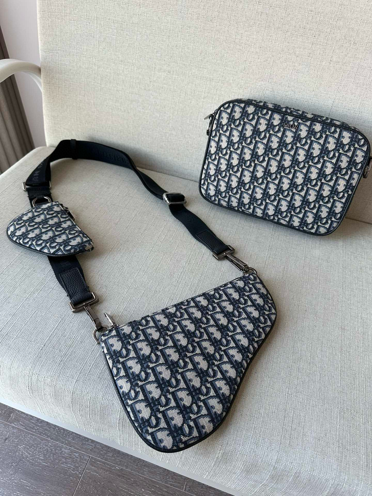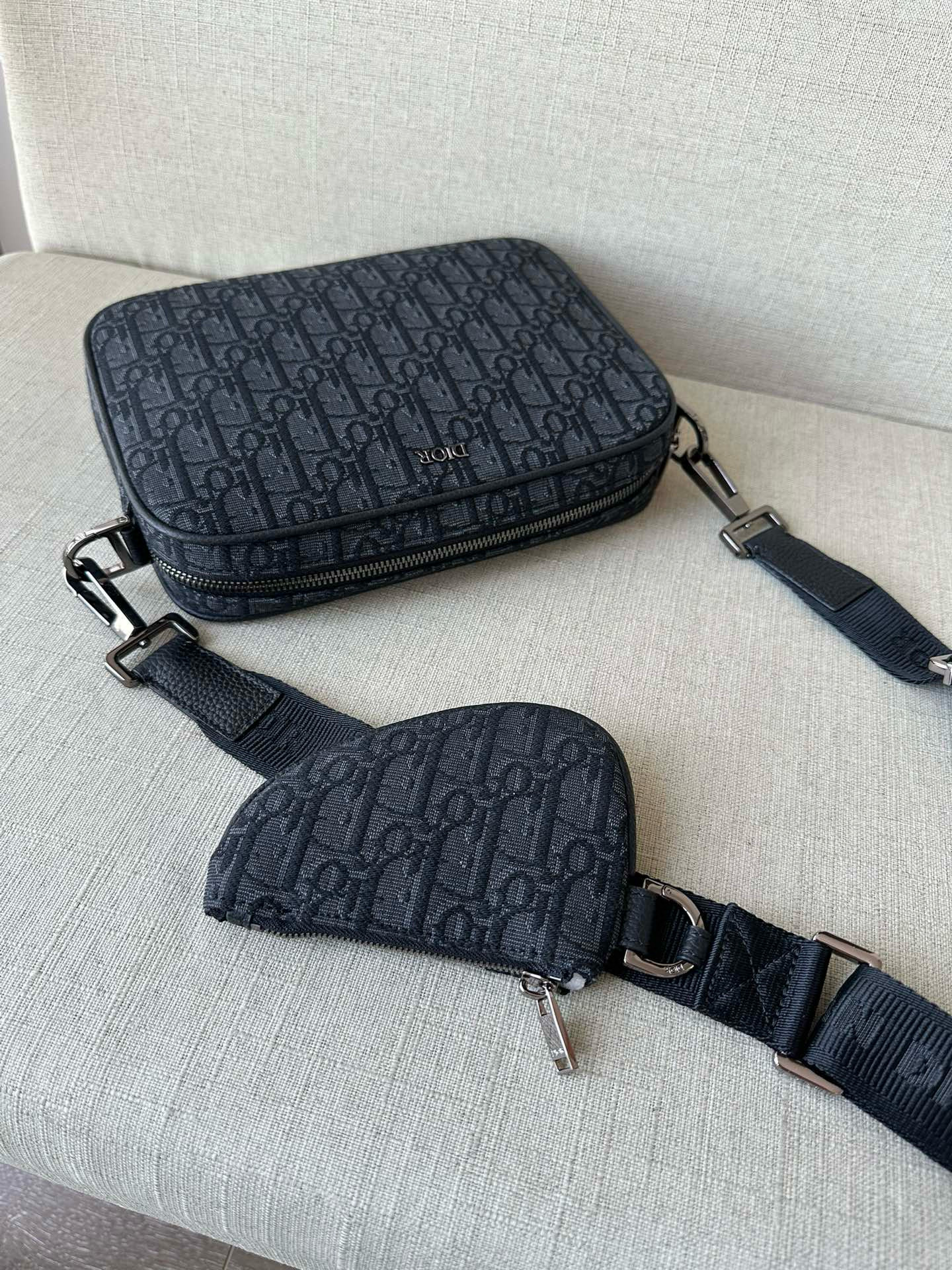 NIGO Dior Men's Black Embossed Pattern Magnetic Flap Leather Quilted Canvas Crossbody Saddle Bag Set of 3 #nigo74786