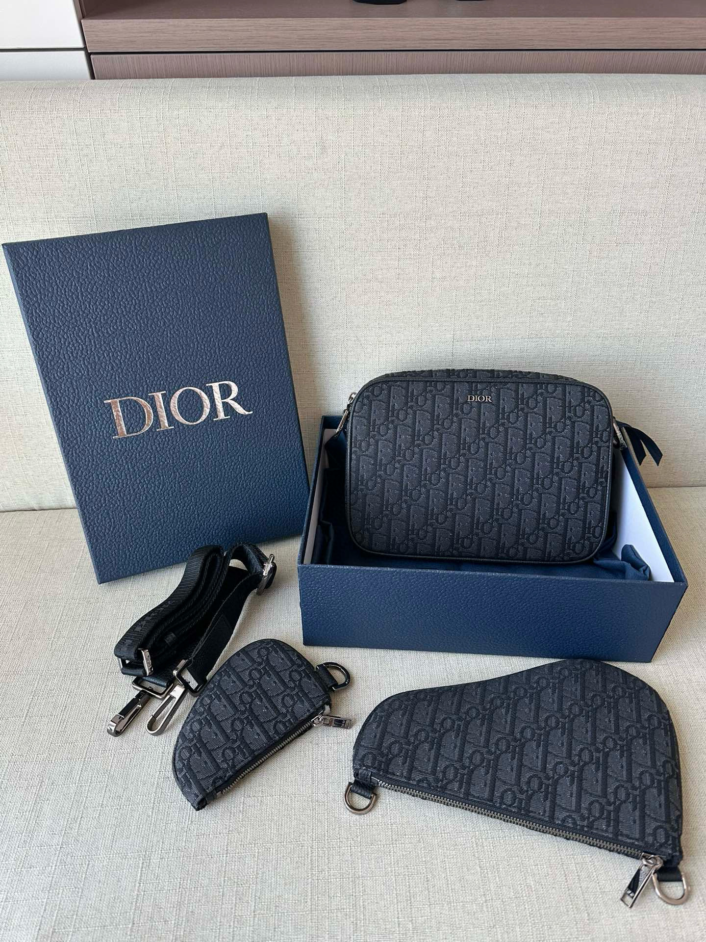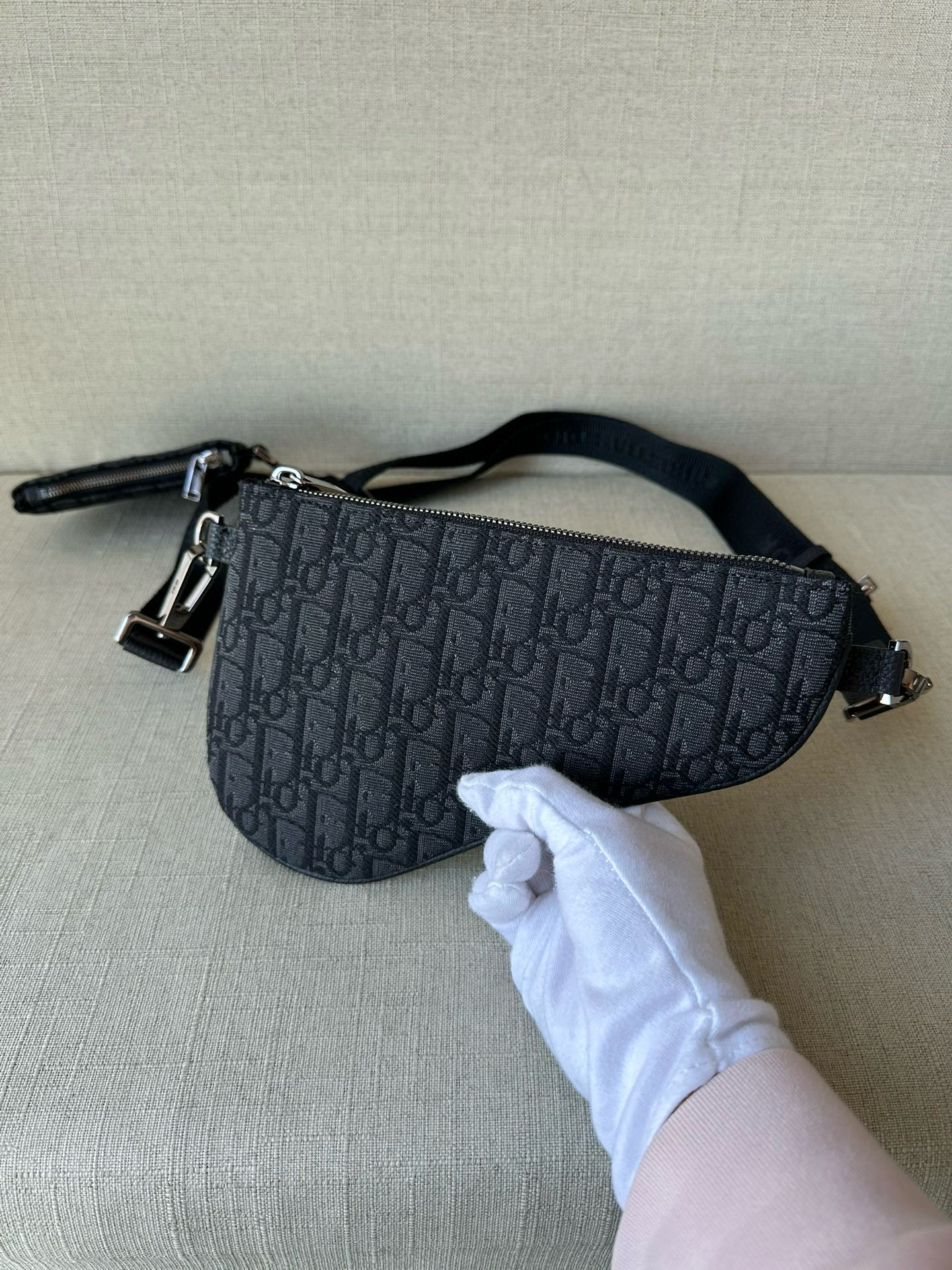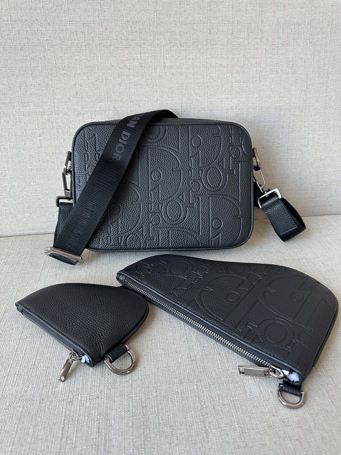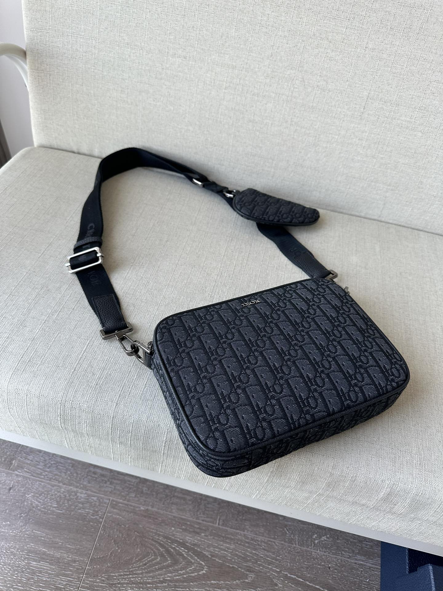 NIGO Dior Men's Black Embossed Pattern Magnetic Flap Leather Quilted Canvas Crossbody Saddle Bag Set of 3 #nigo74786