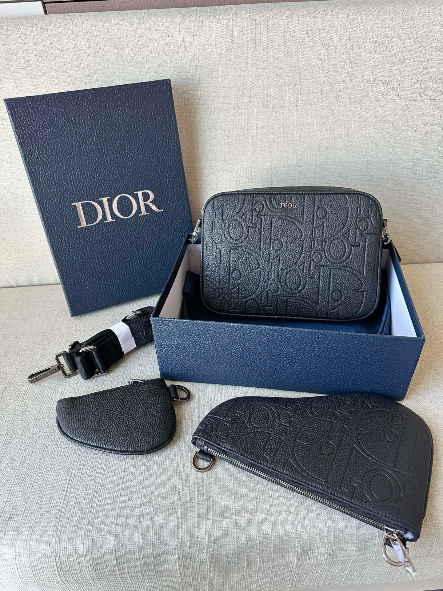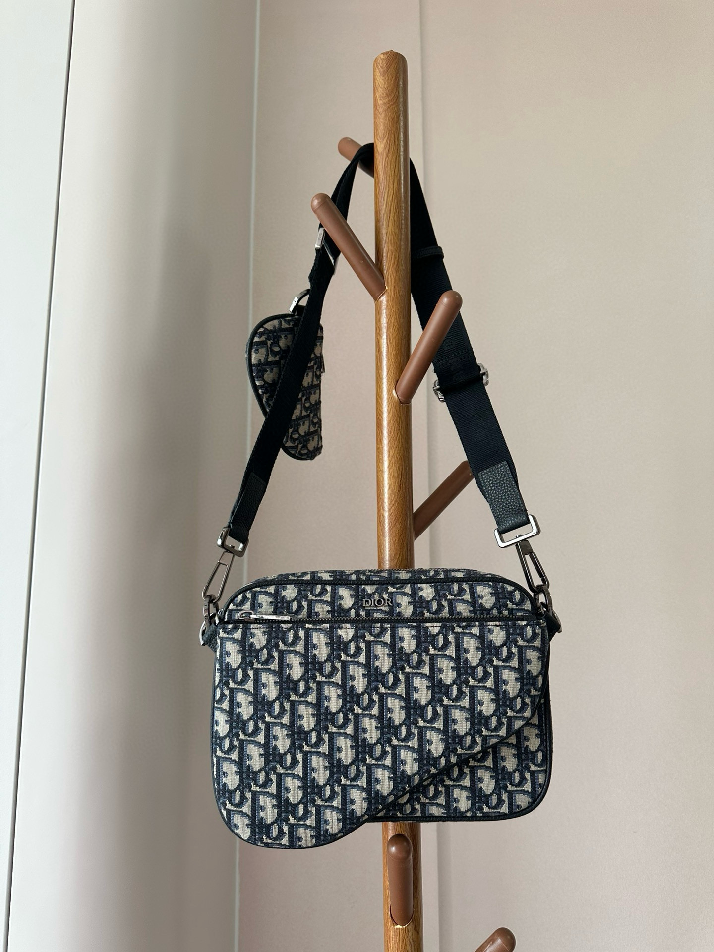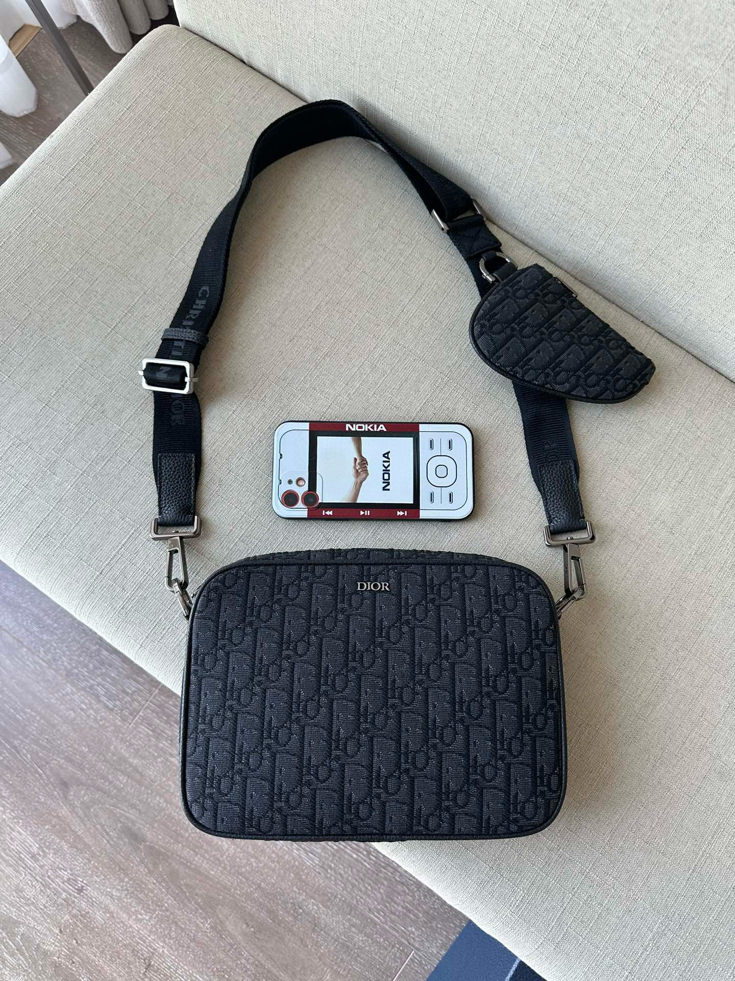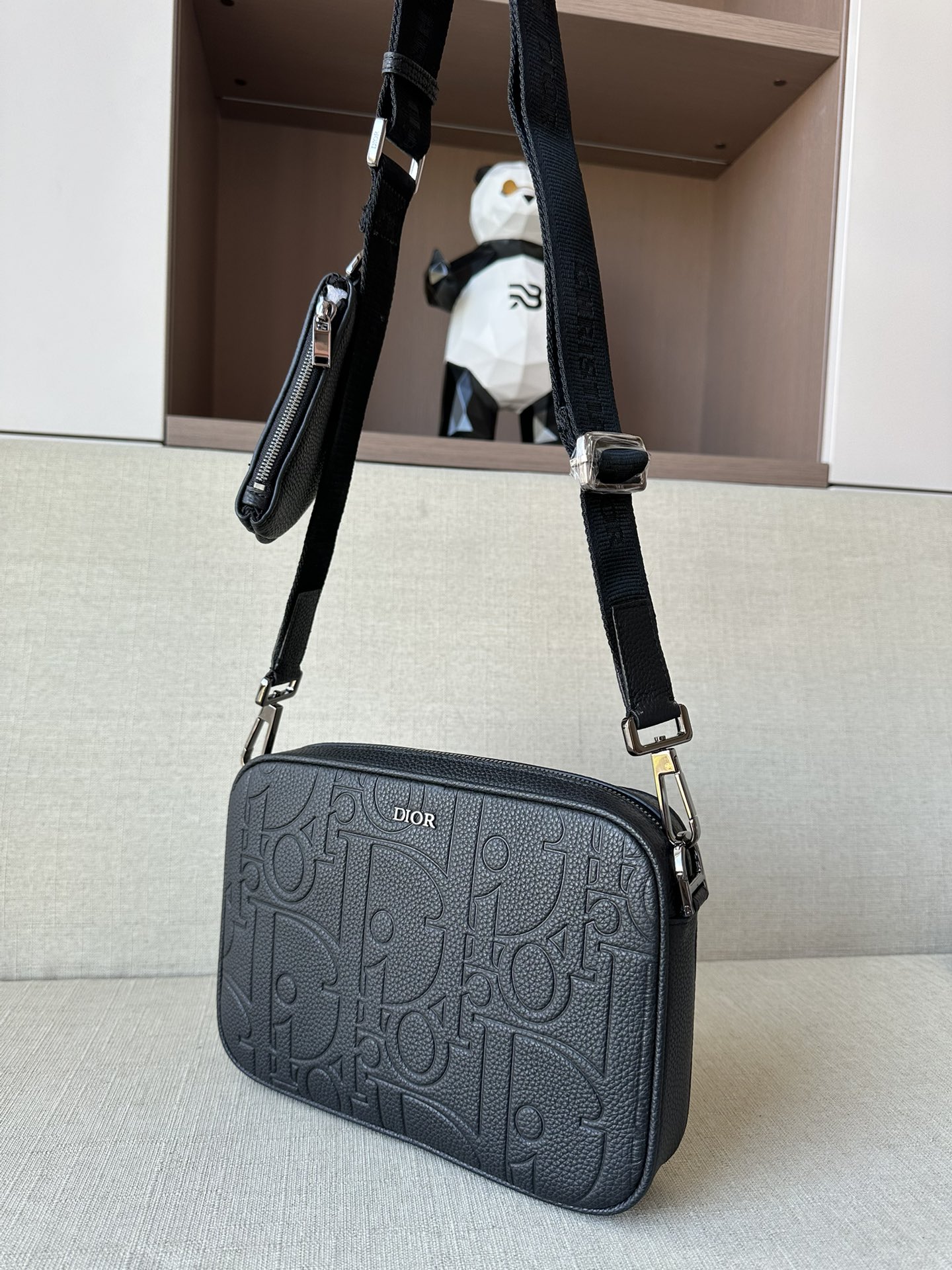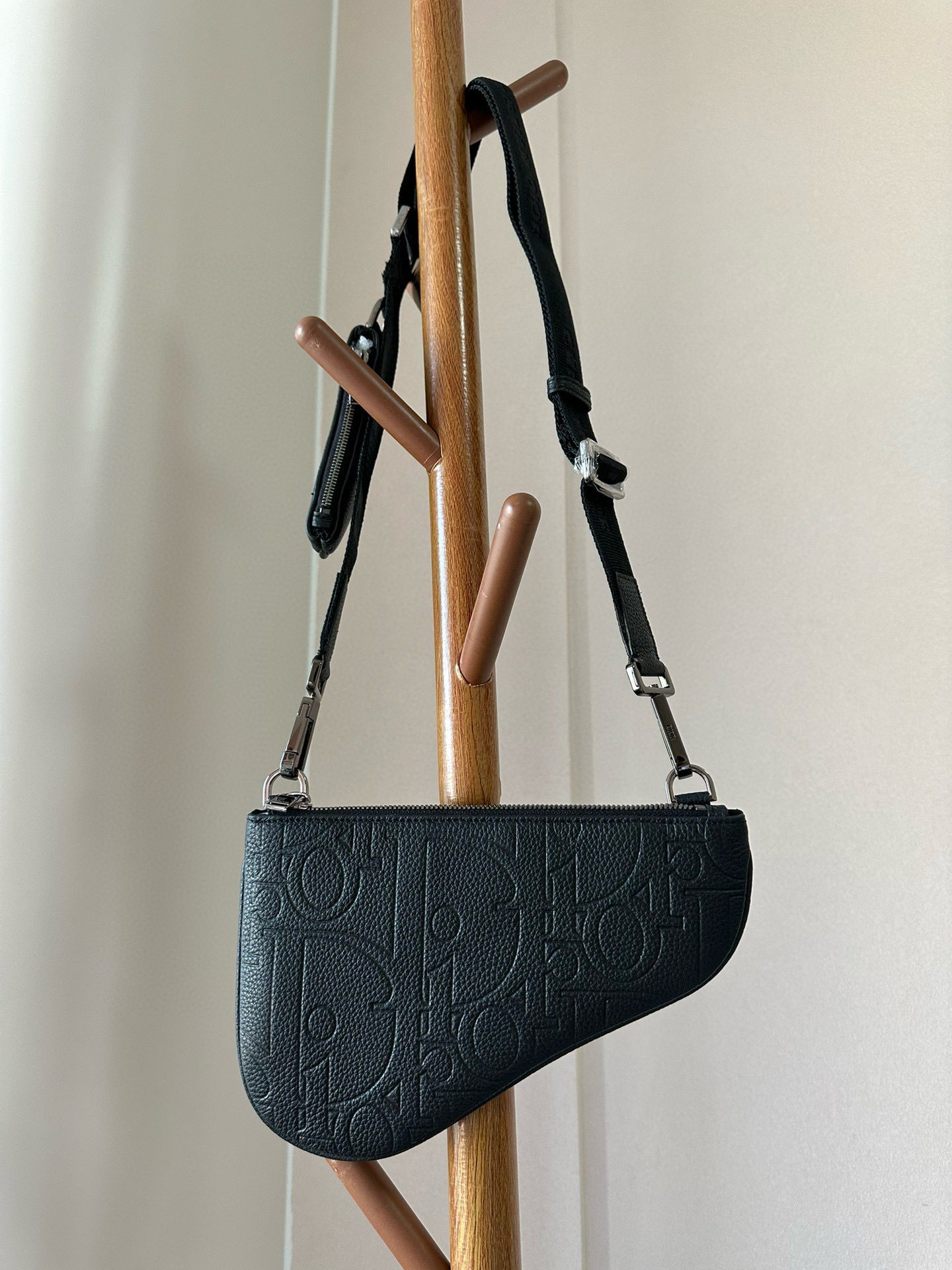 NIGO Dior Men's Black Embossed Pattern Magnetic Flap Leather Quilted Canvas Crossbody Saddle Bag Set of 3 #nigo74786