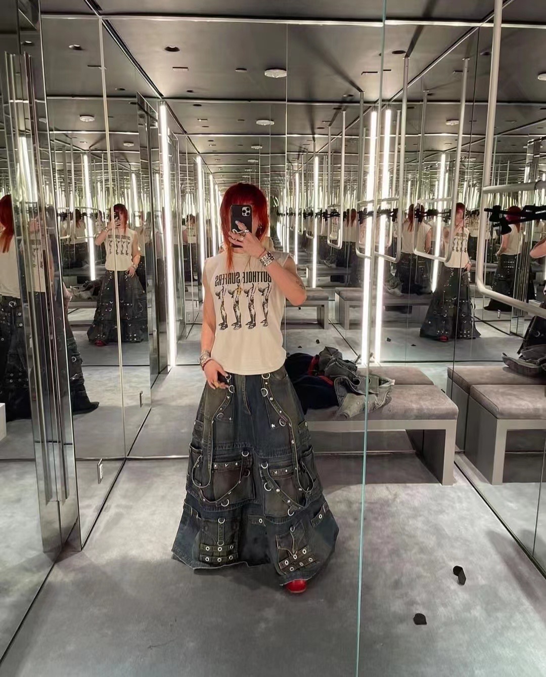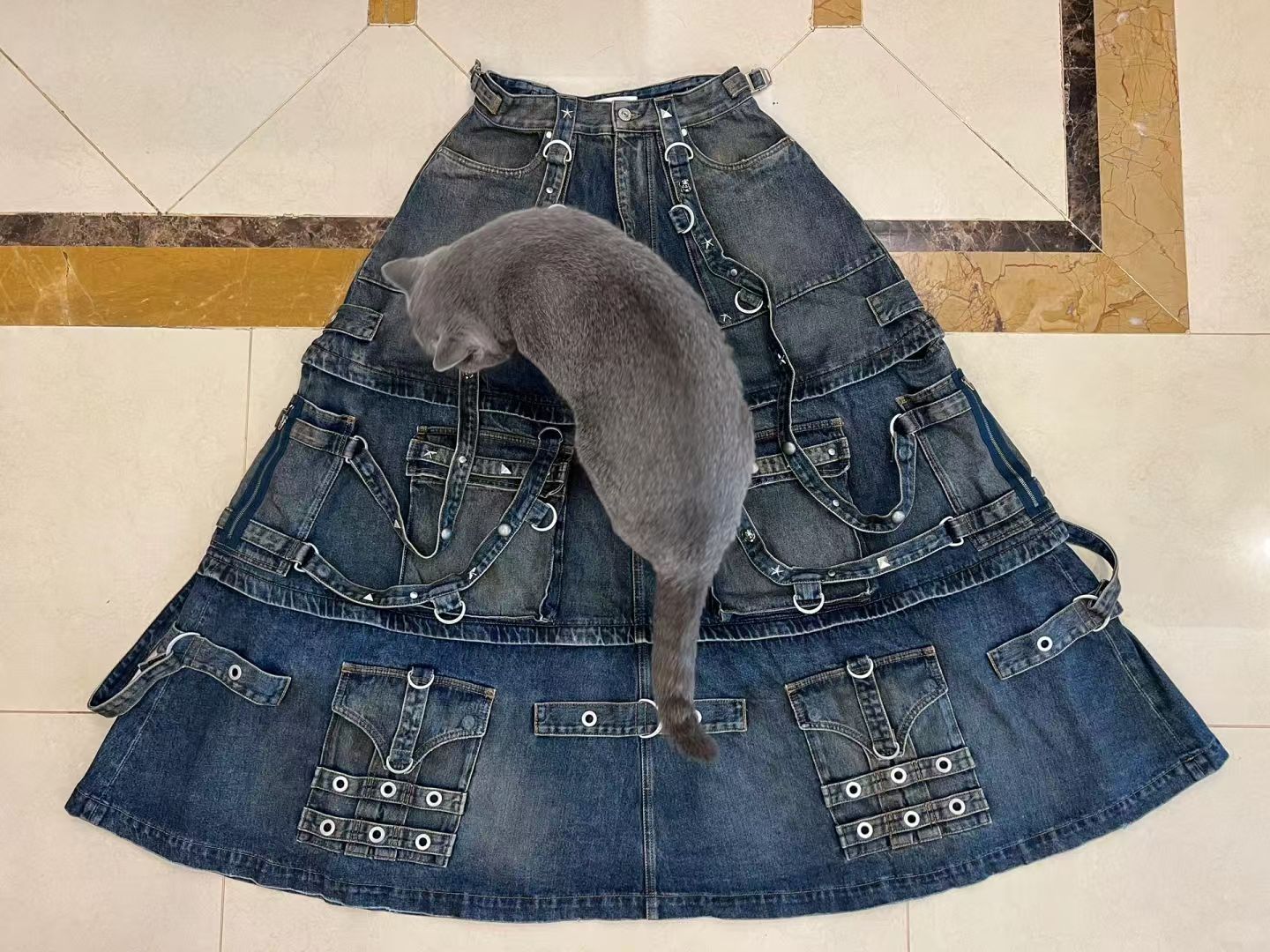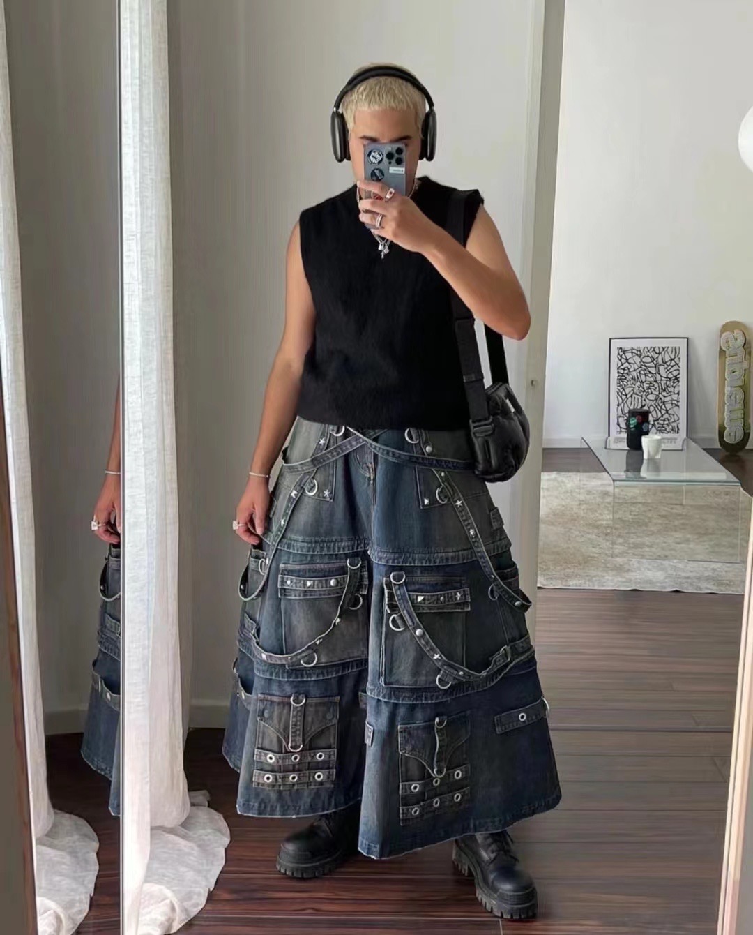 NIGO Balenciaga Men's Skirt Vintage Rivets Straps Detachable Denim Skirt High Street Ragged Trend Punk Style Jeans Pants #nigo71841