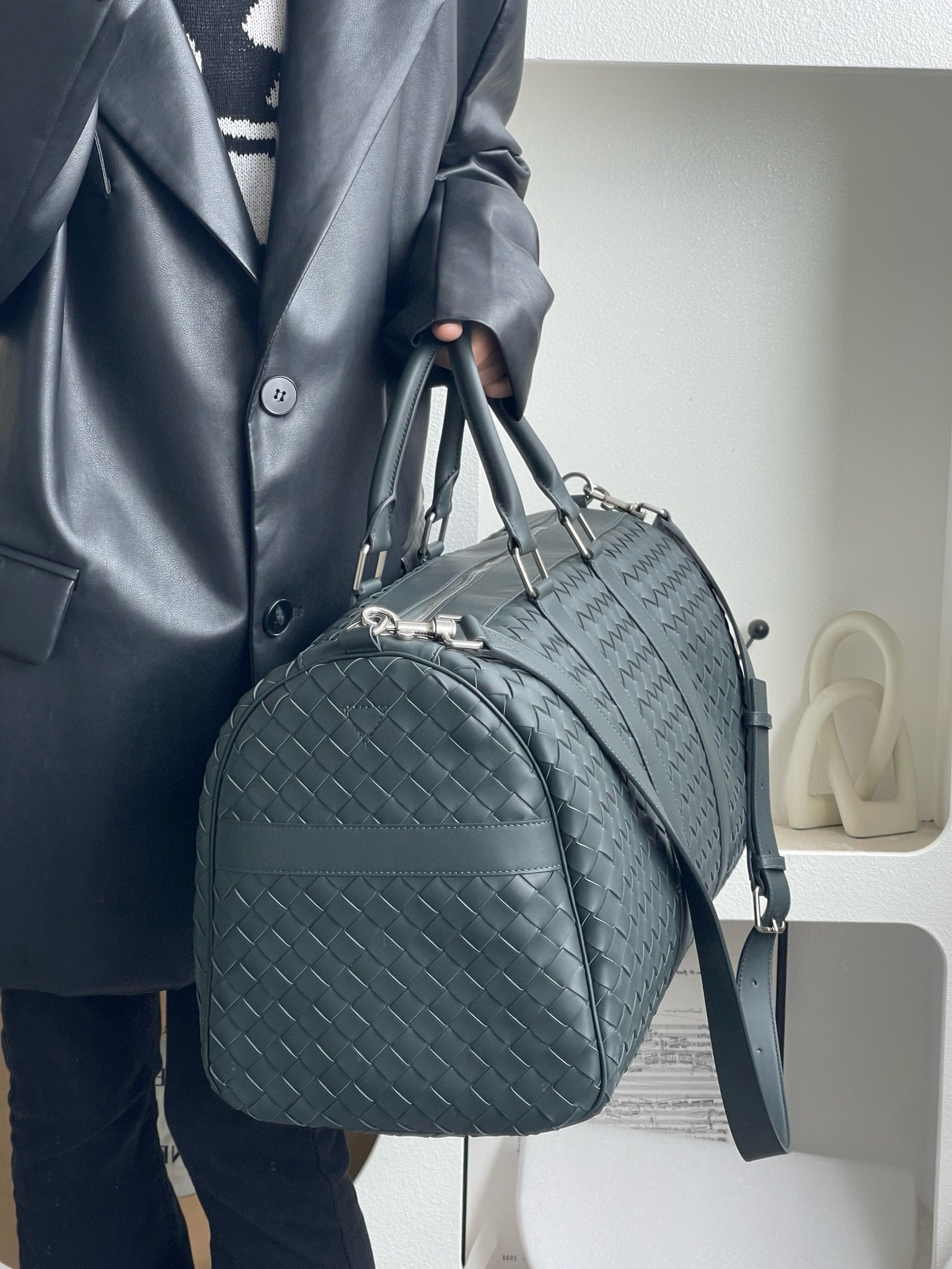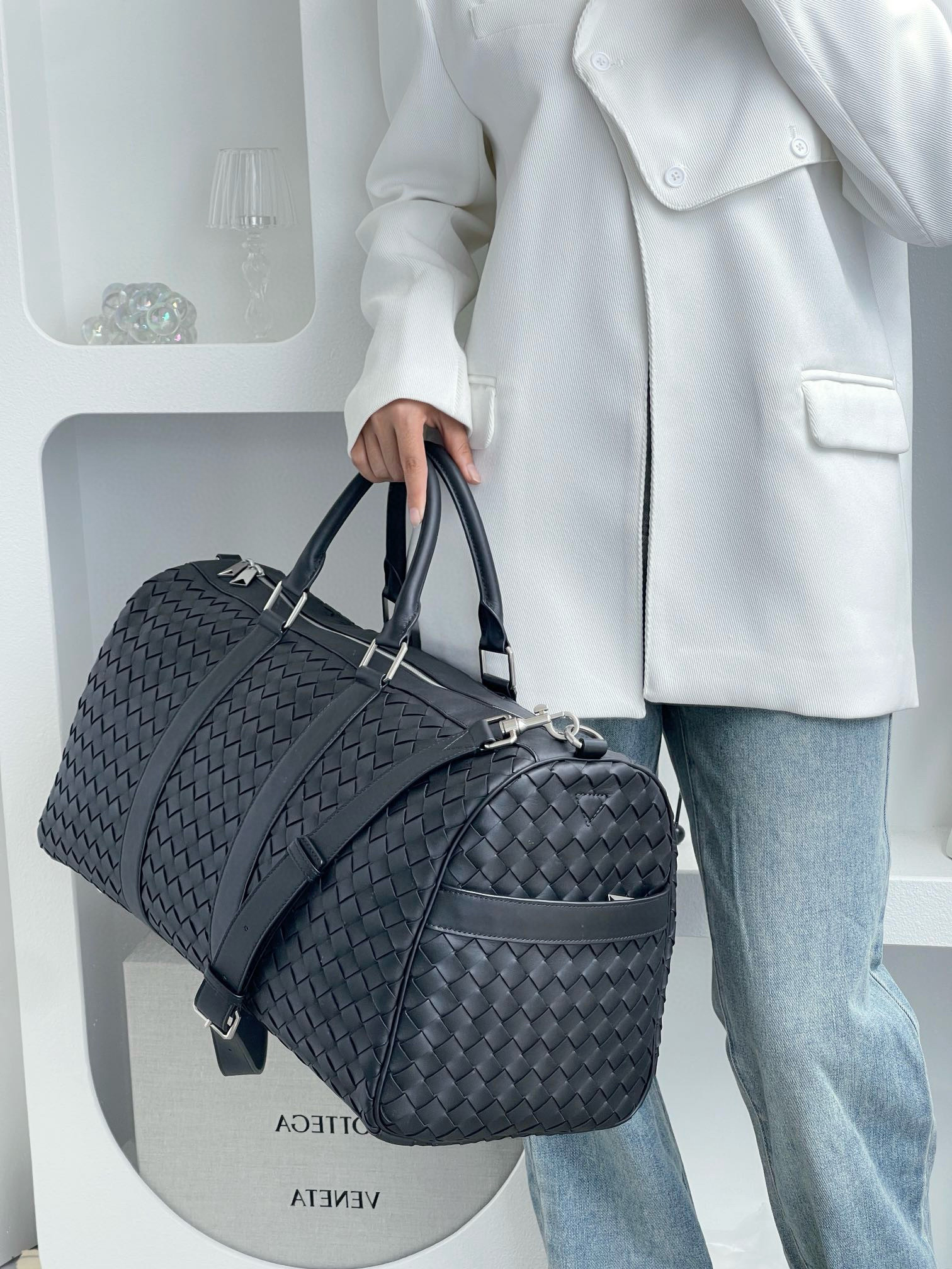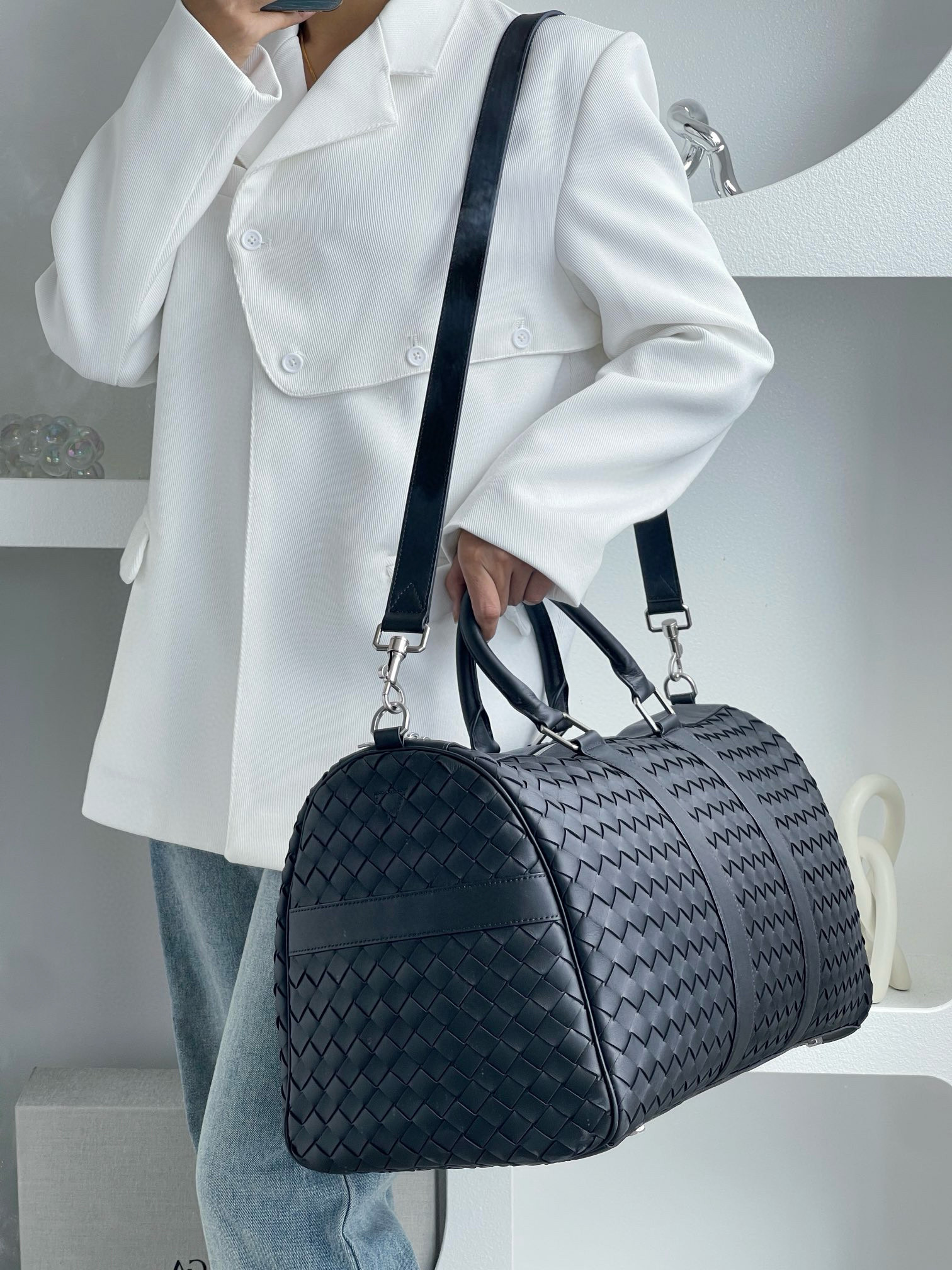 NIGO Bottega Veneta Intrecciato Men's Solid Color Adjustable Detachable Shoulder Strap Woven Calfskin Travel Bag #nigo77472