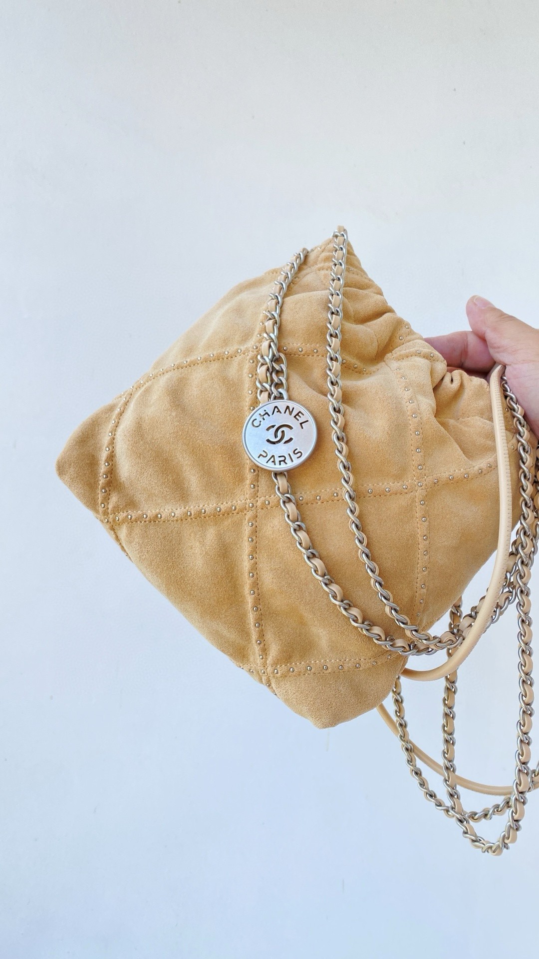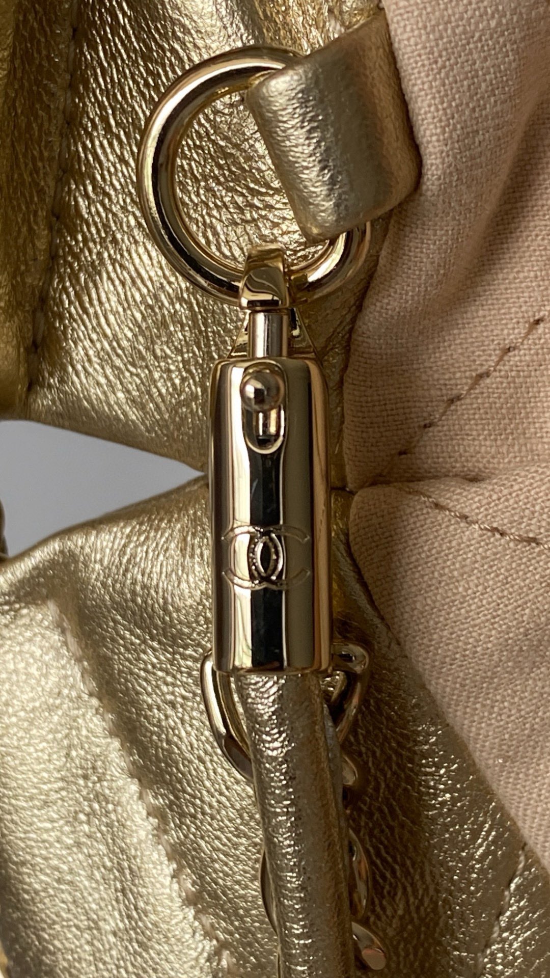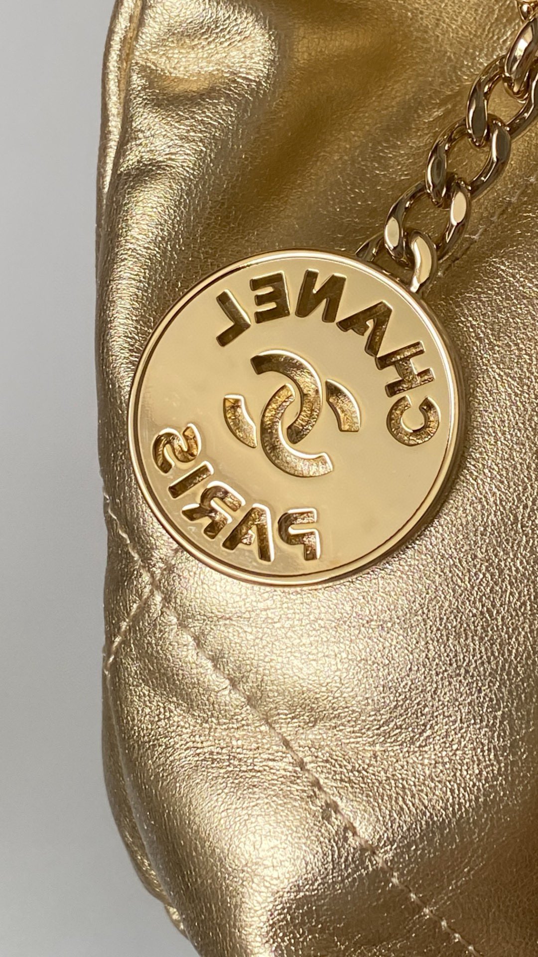 This Chanel handbag showcases the brand's exceptional craftsmanship and attention to detail. Crafted from premium calfskin, gold, in a stunning gold colorway, this piece combines timeless luxury with modern style.