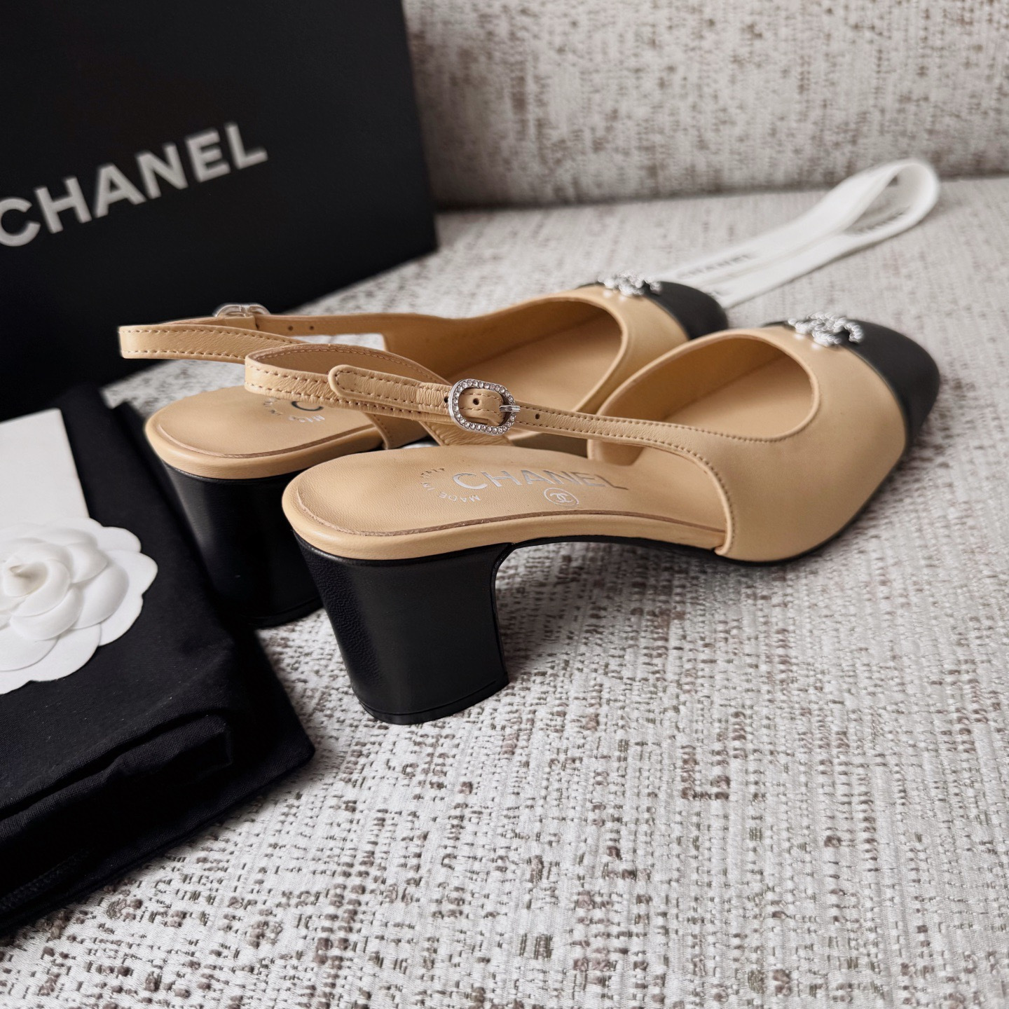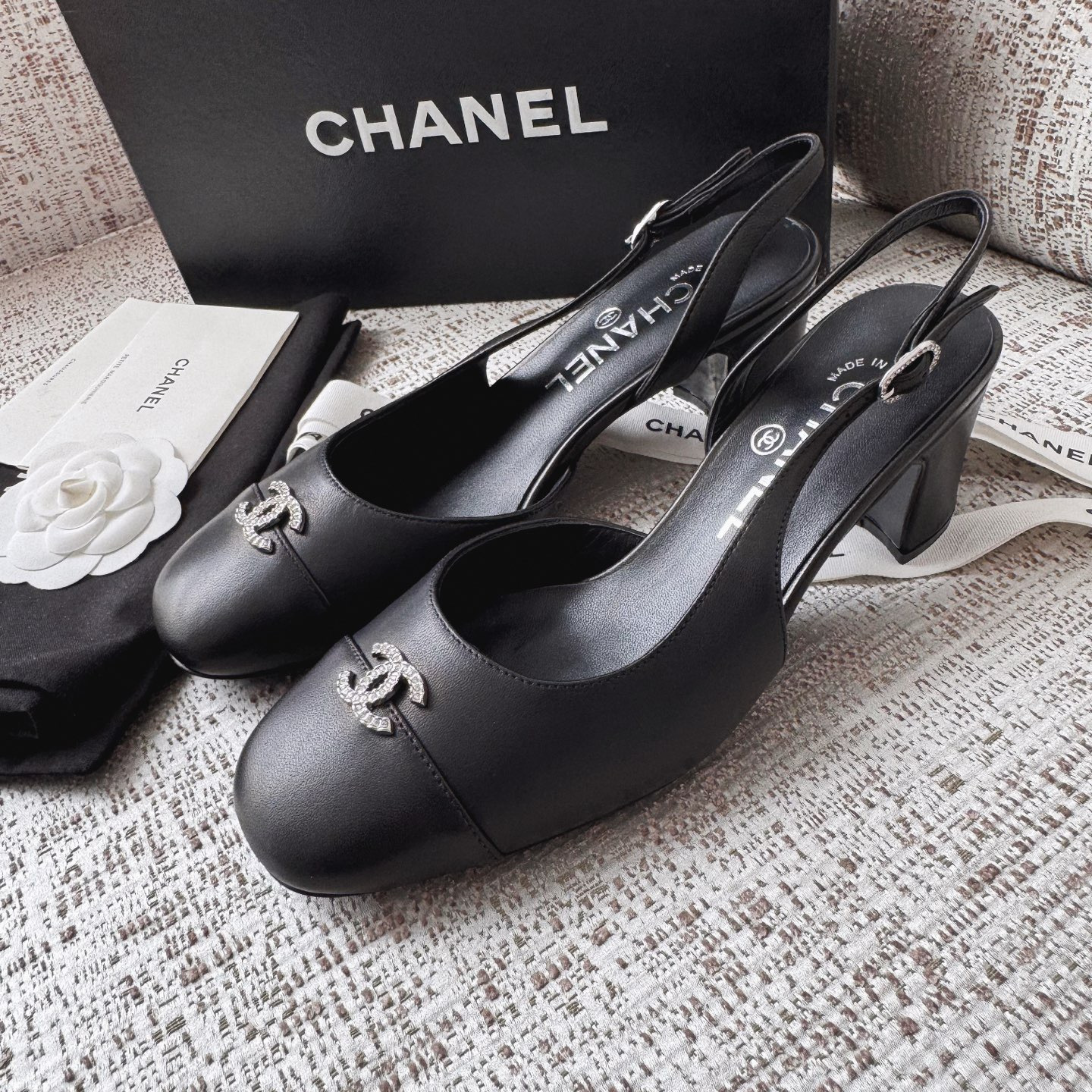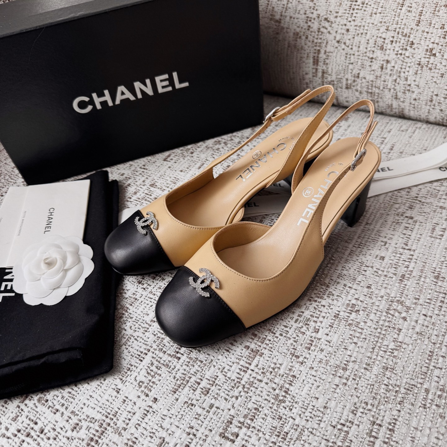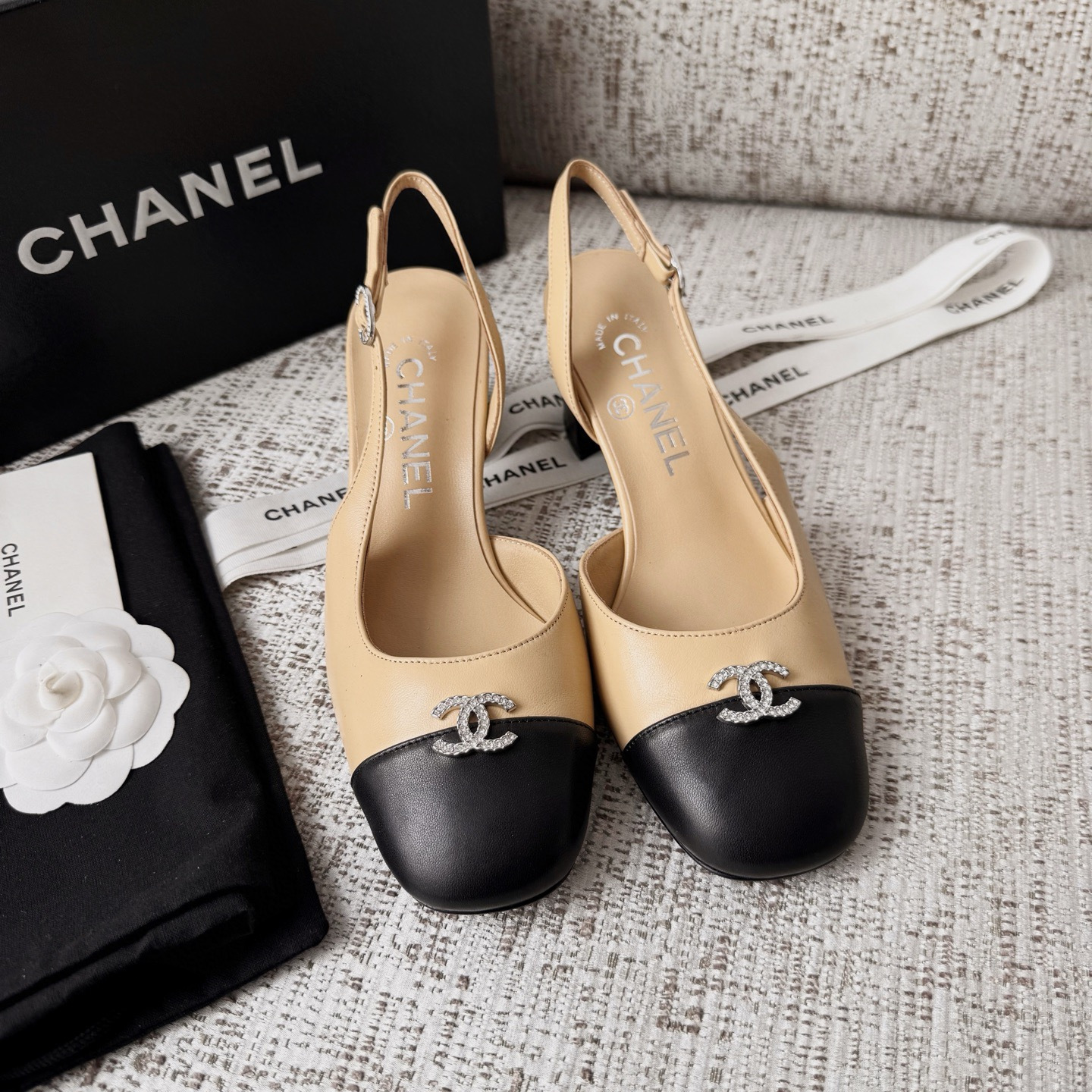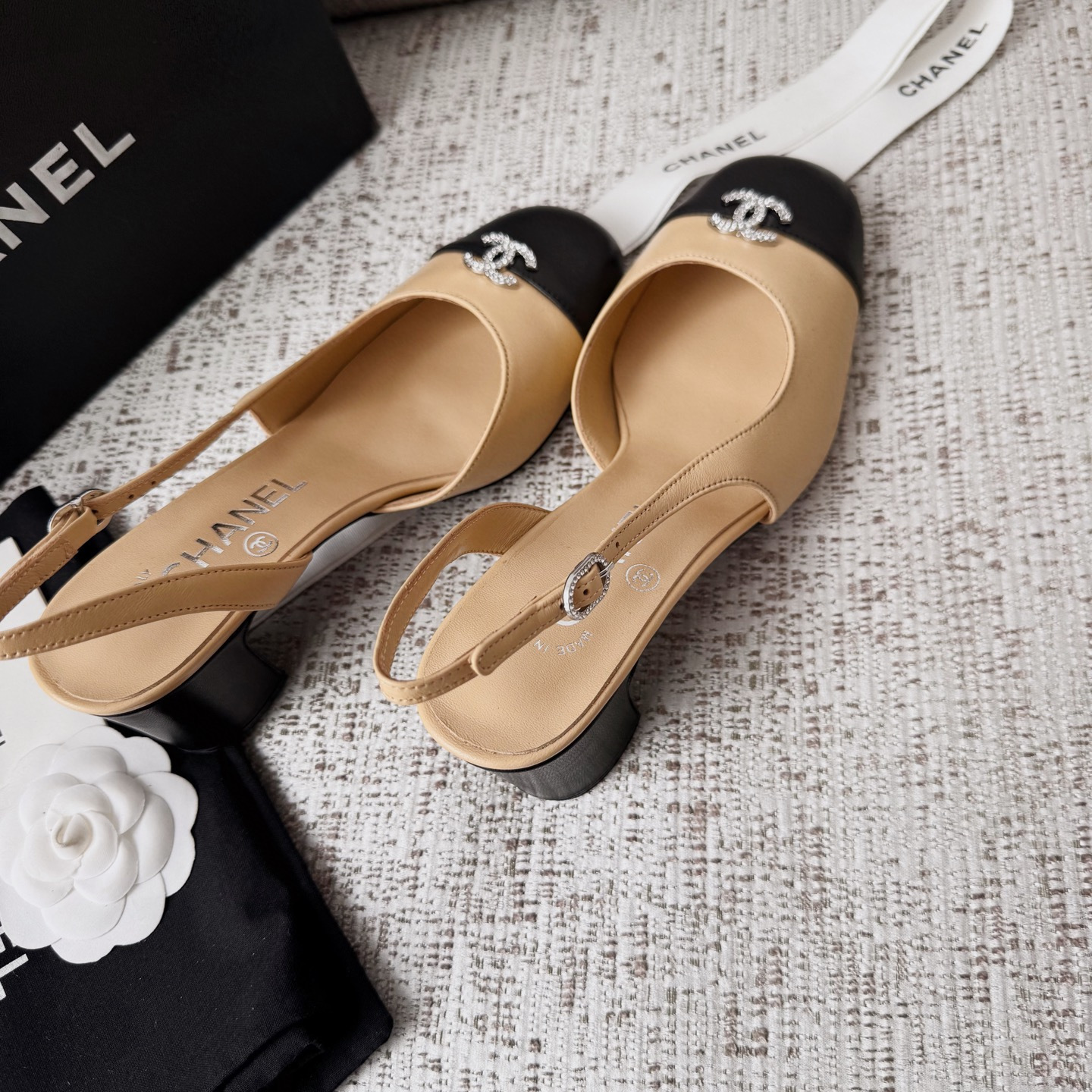 This Chanel shoes showcases the brand's exceptional craftsmanship and attention to detail. Crafted from premium lambskin, this piece combines timeless luxury with modern style.