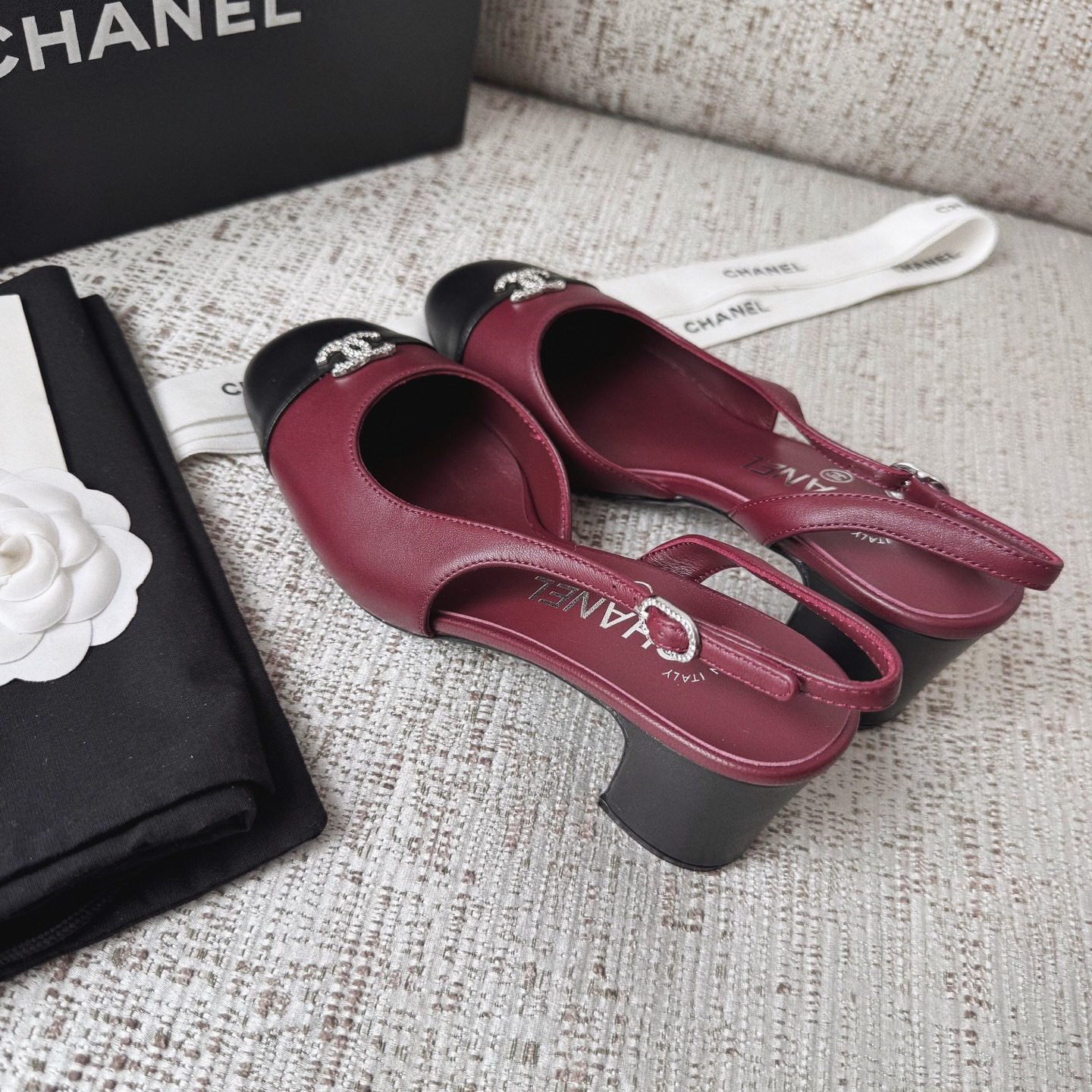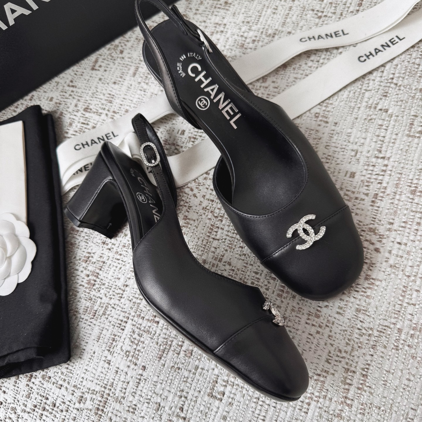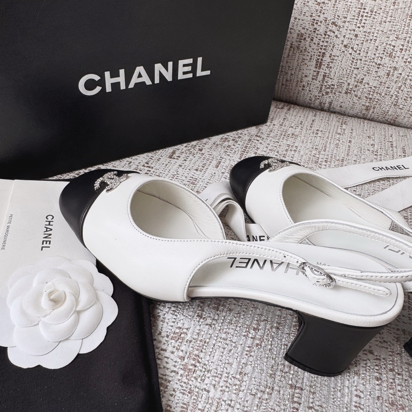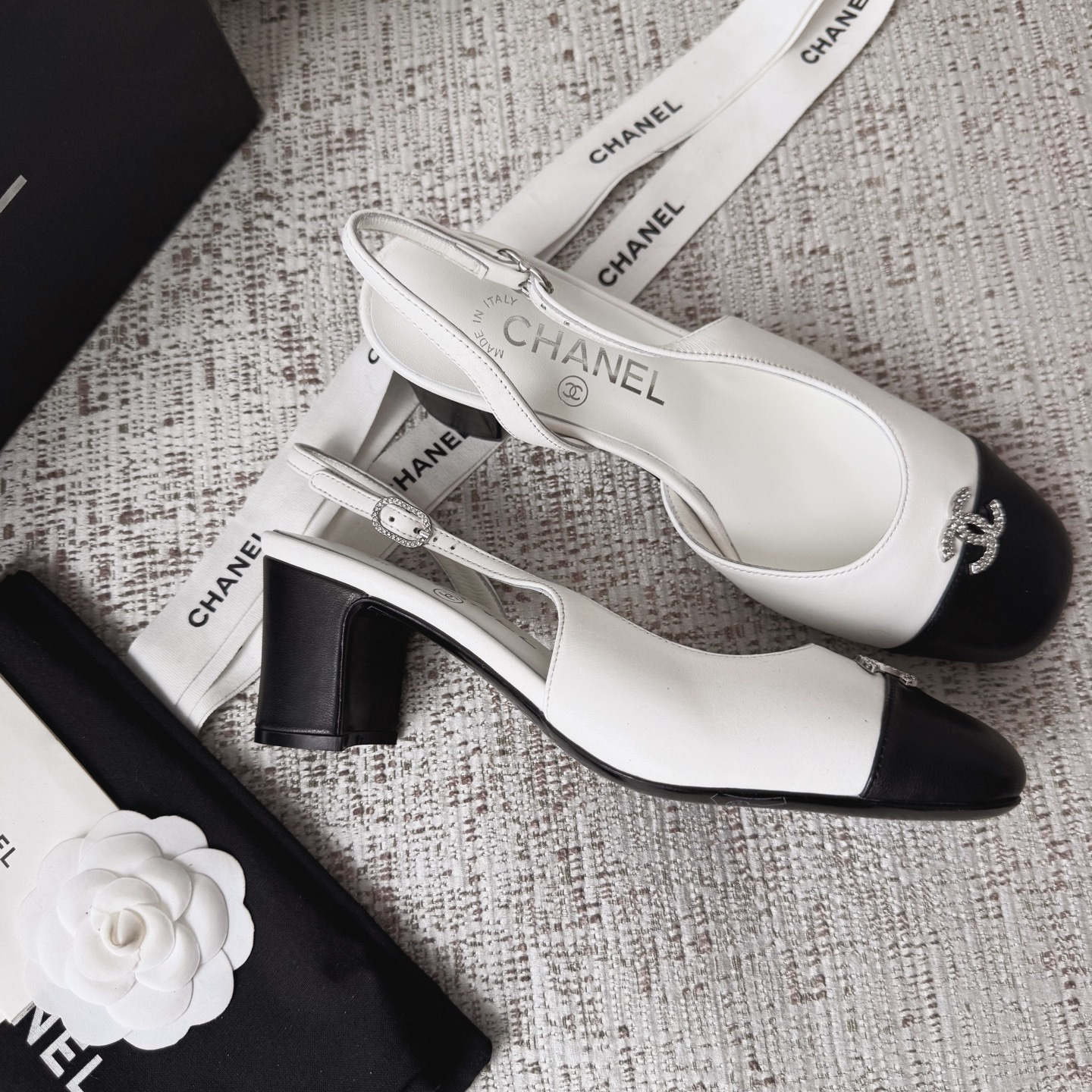 This Chanel shoes showcases the brand's exceptional craftsmanship and attention to detail. Crafted from premium lambskin, this piece combines timeless luxury with modern style.
