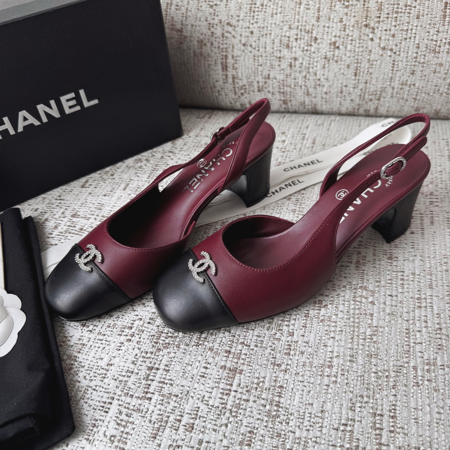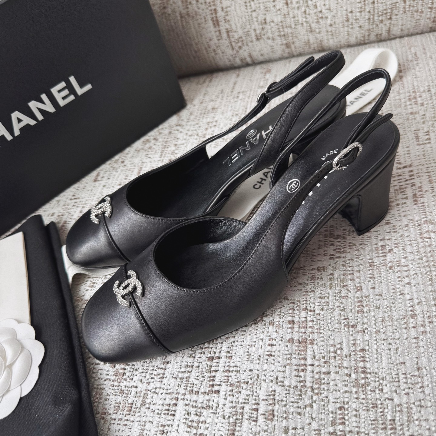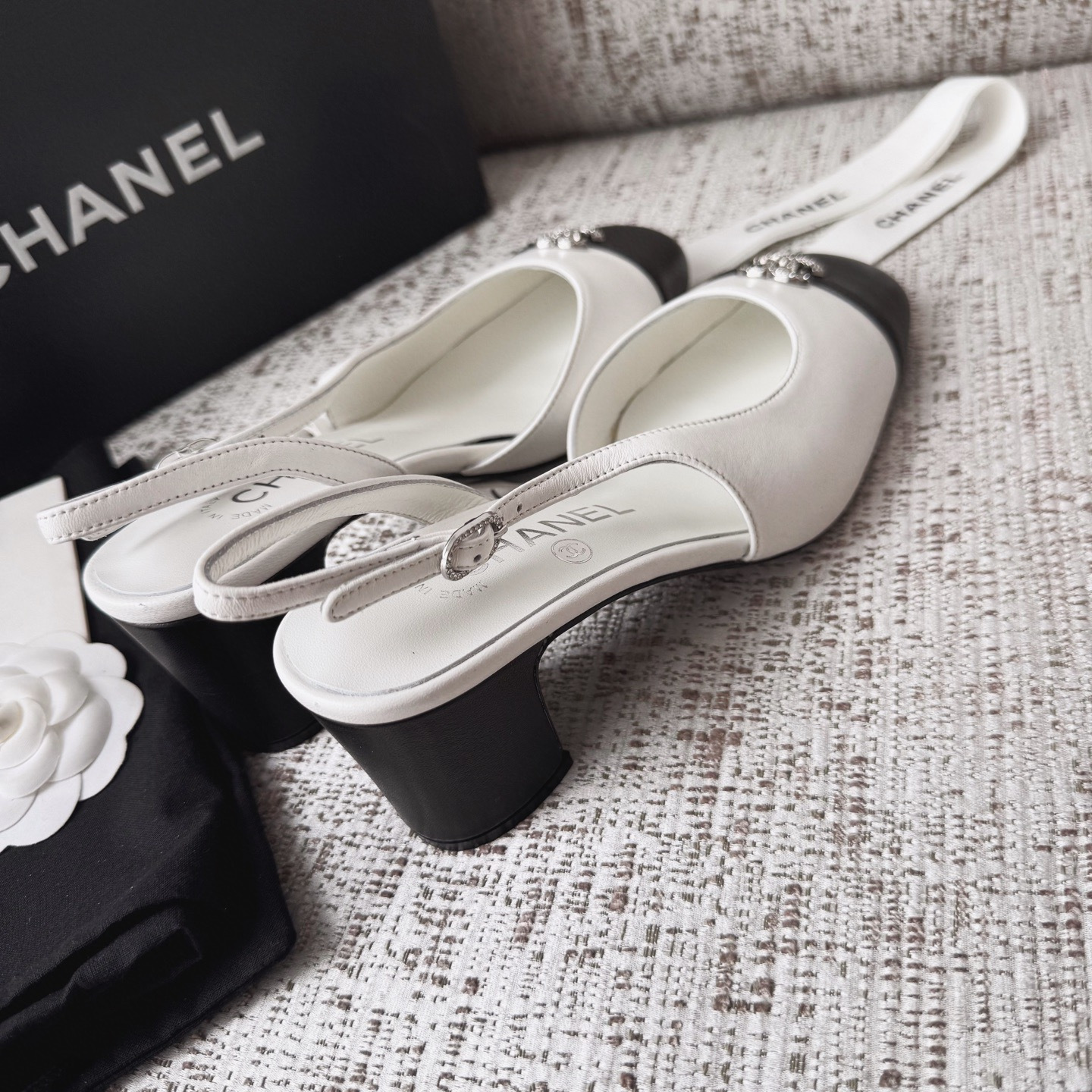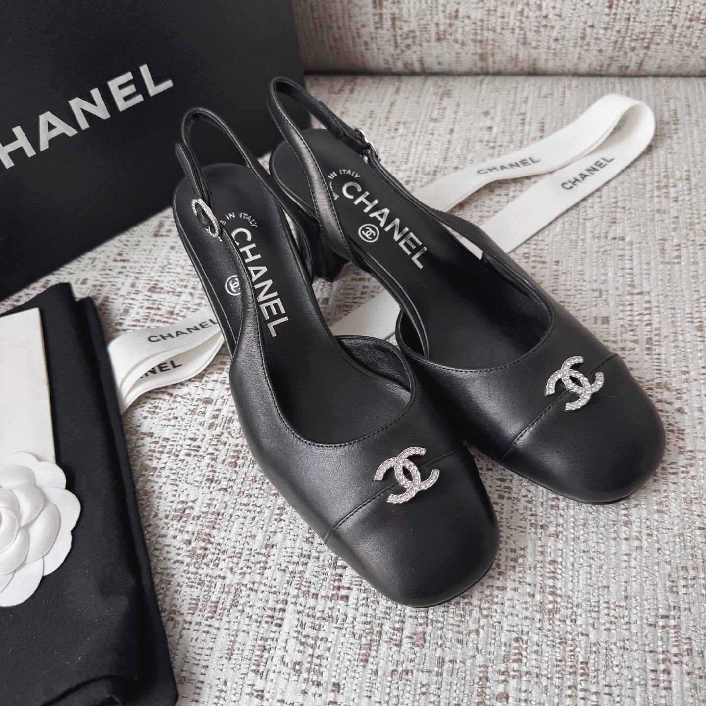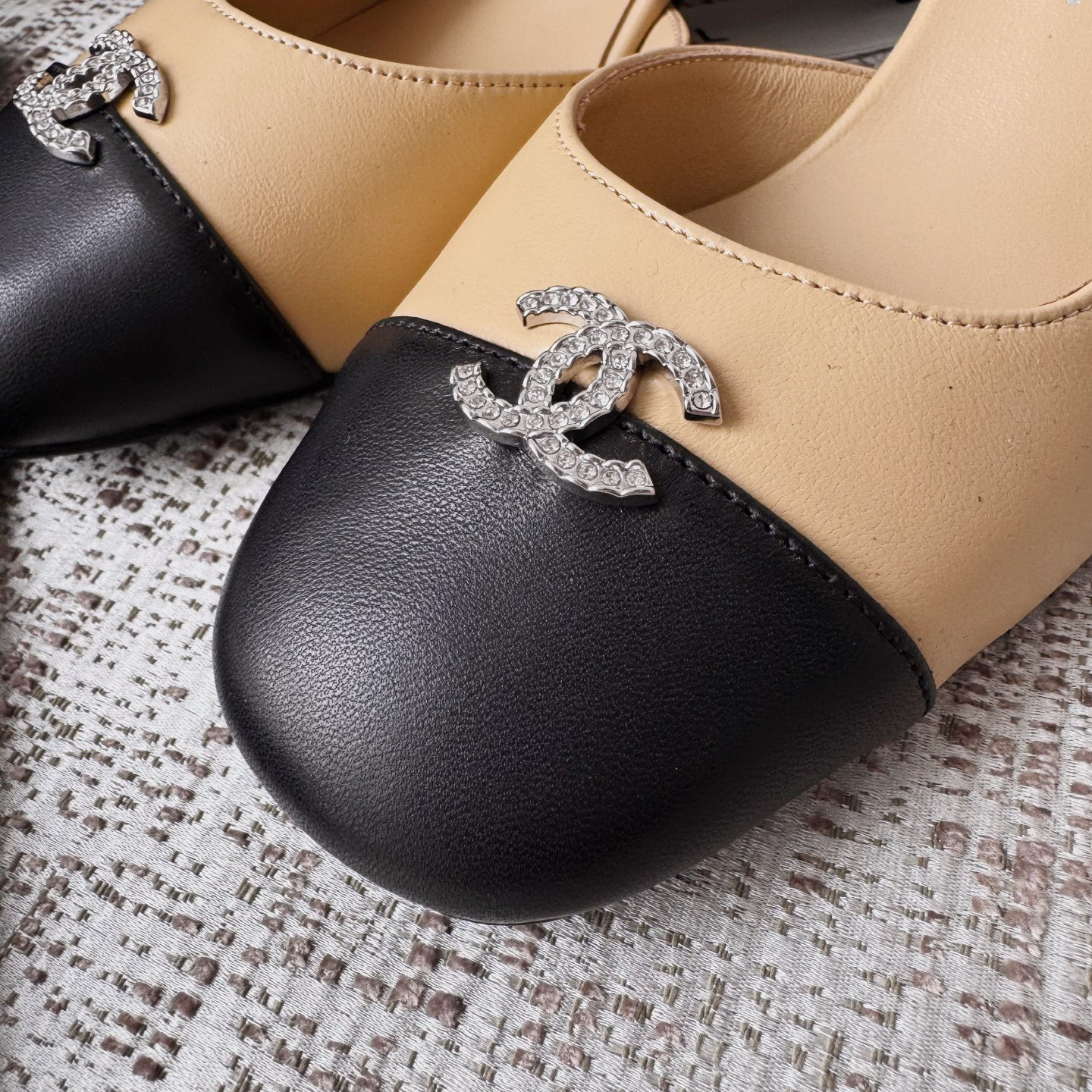 This Chanel shoes showcases the brand's exceptional craftsmanship and attention to detail. Crafted from premium lambskin, this piece combines timeless luxury with modern style.
