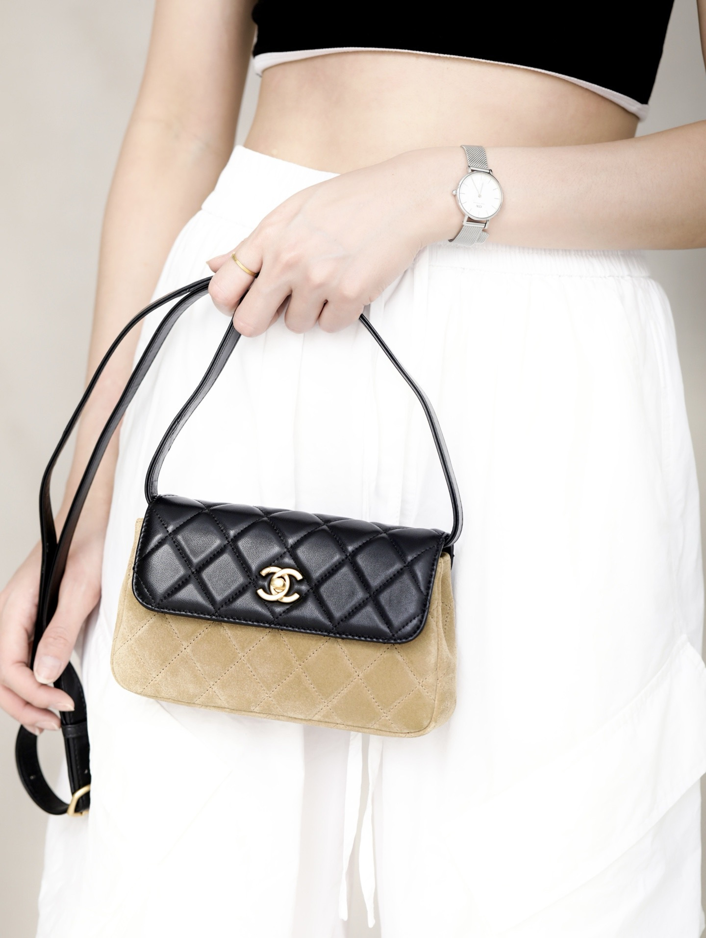 This Chanel handbag showcases the brand's exceptional craftsmanship and attention to detail. this piece combines timeless luxury with modern style.