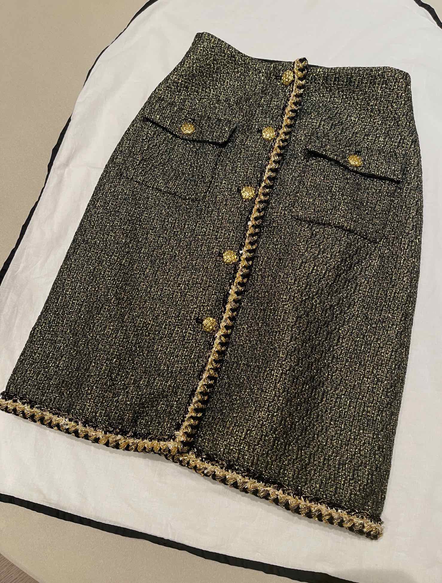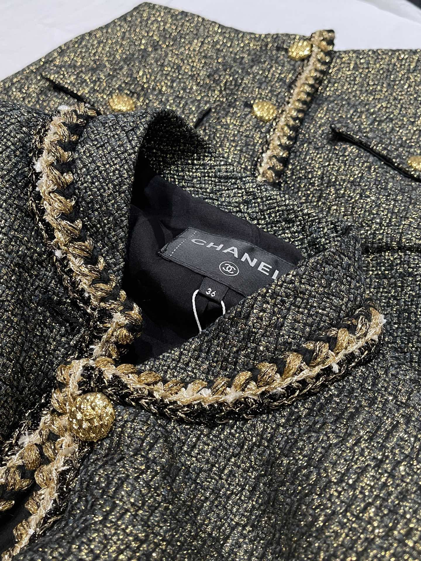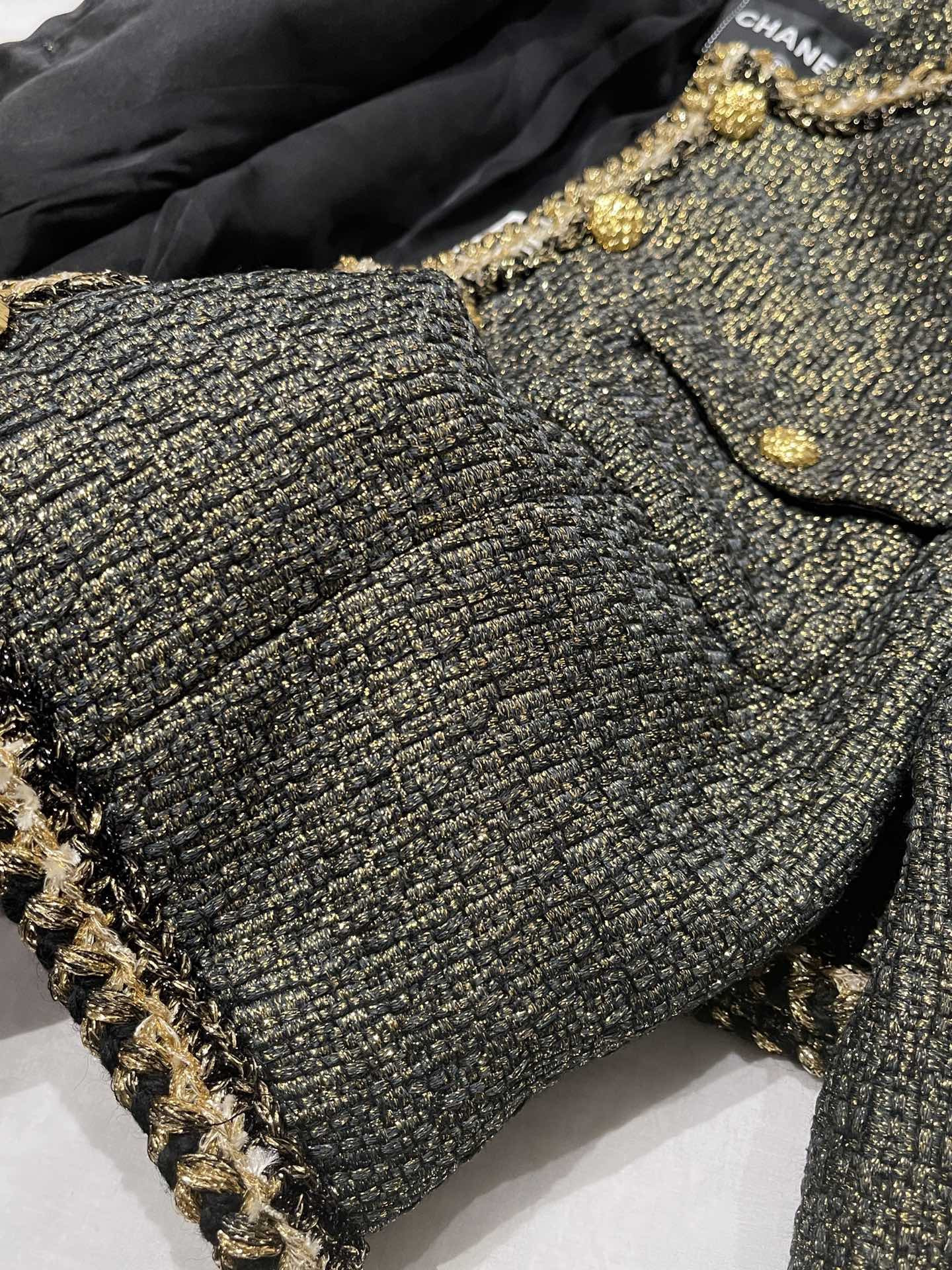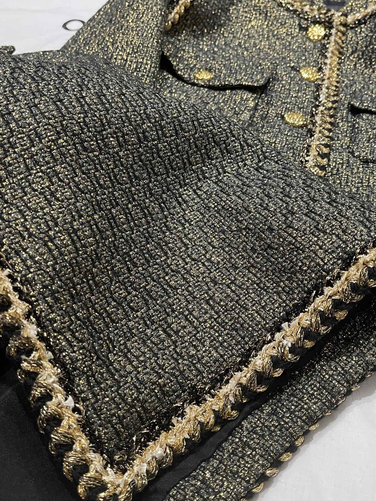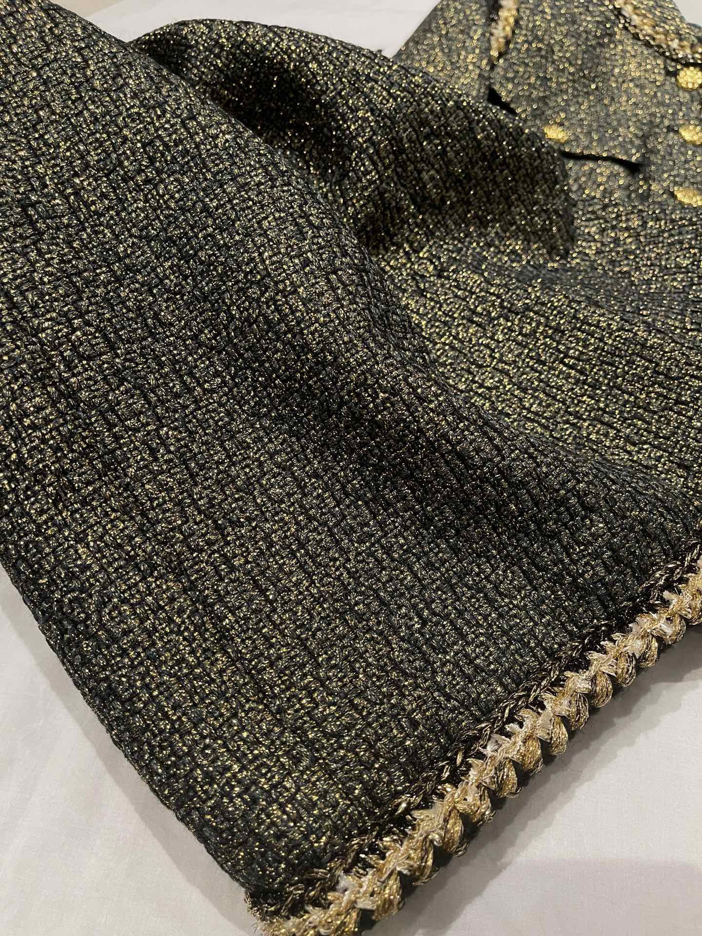 This Chanel clothing showcases the brand's exceptional craftsmanship and attention to detail. Crafted from premium tweed, gold, in a stunning black / gold colorway, this piece combines timeless luxury with modern style.