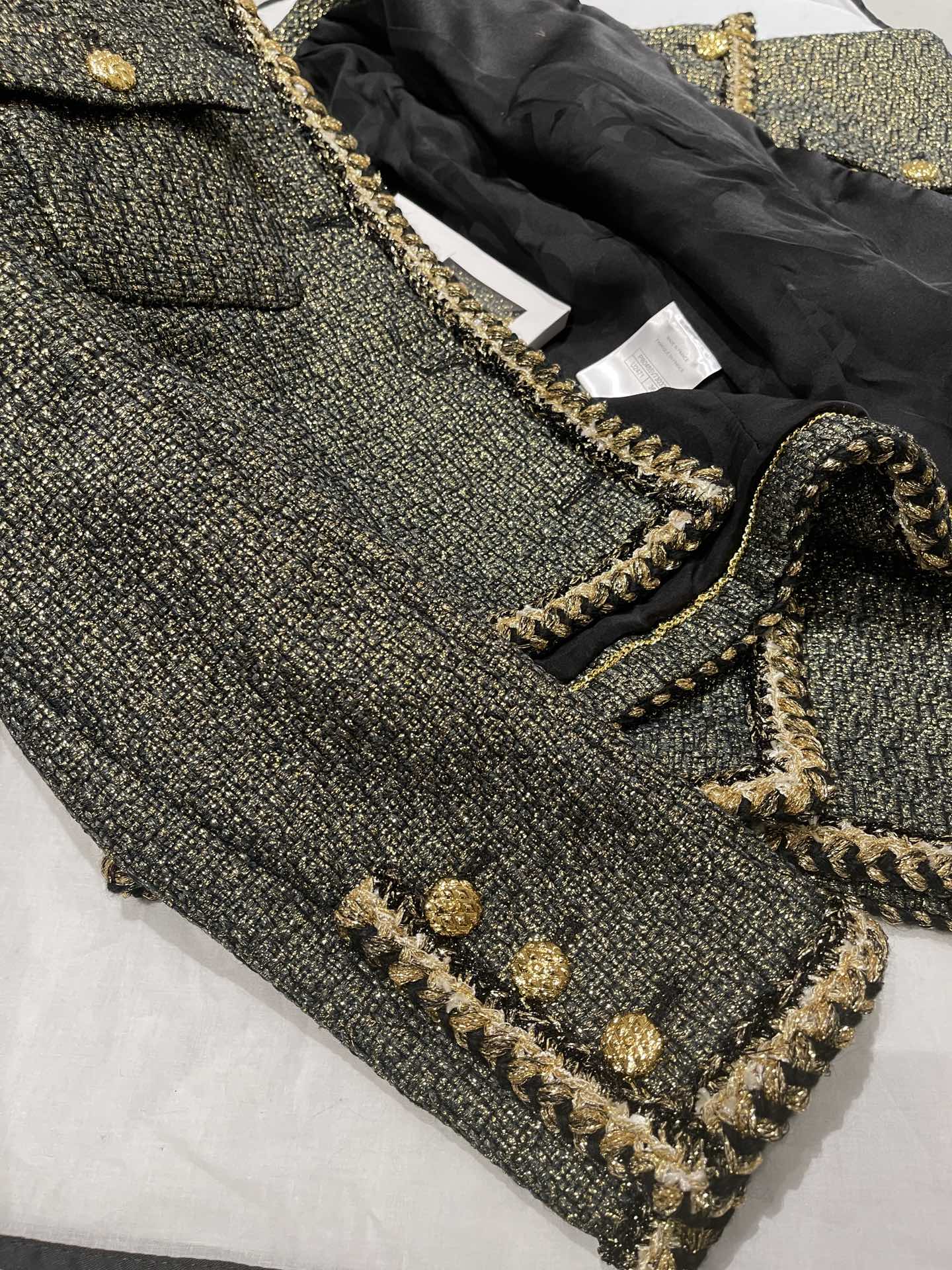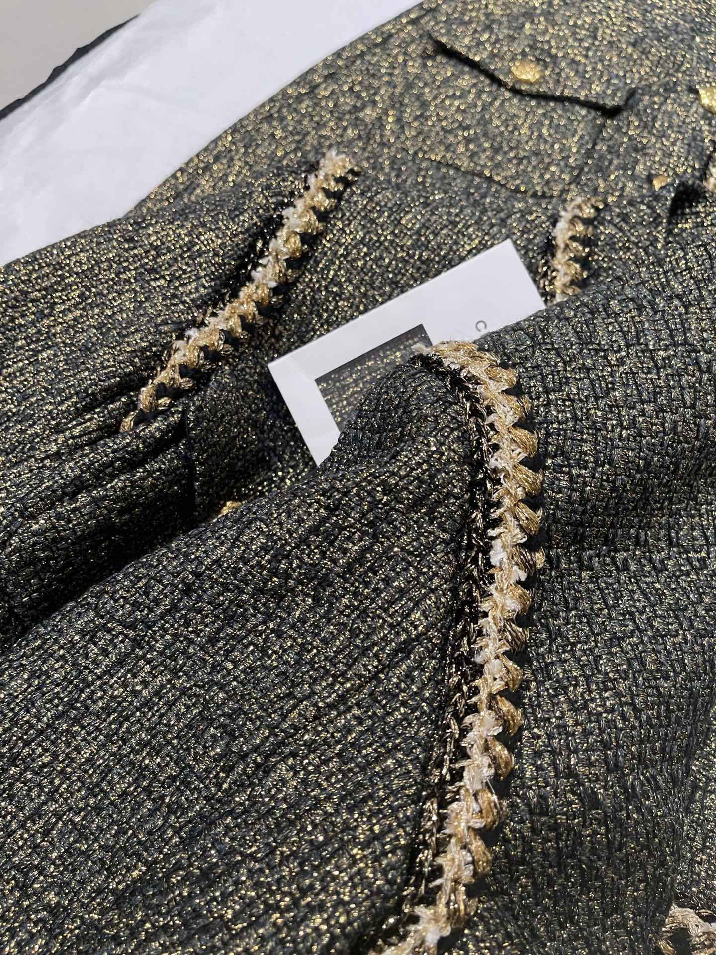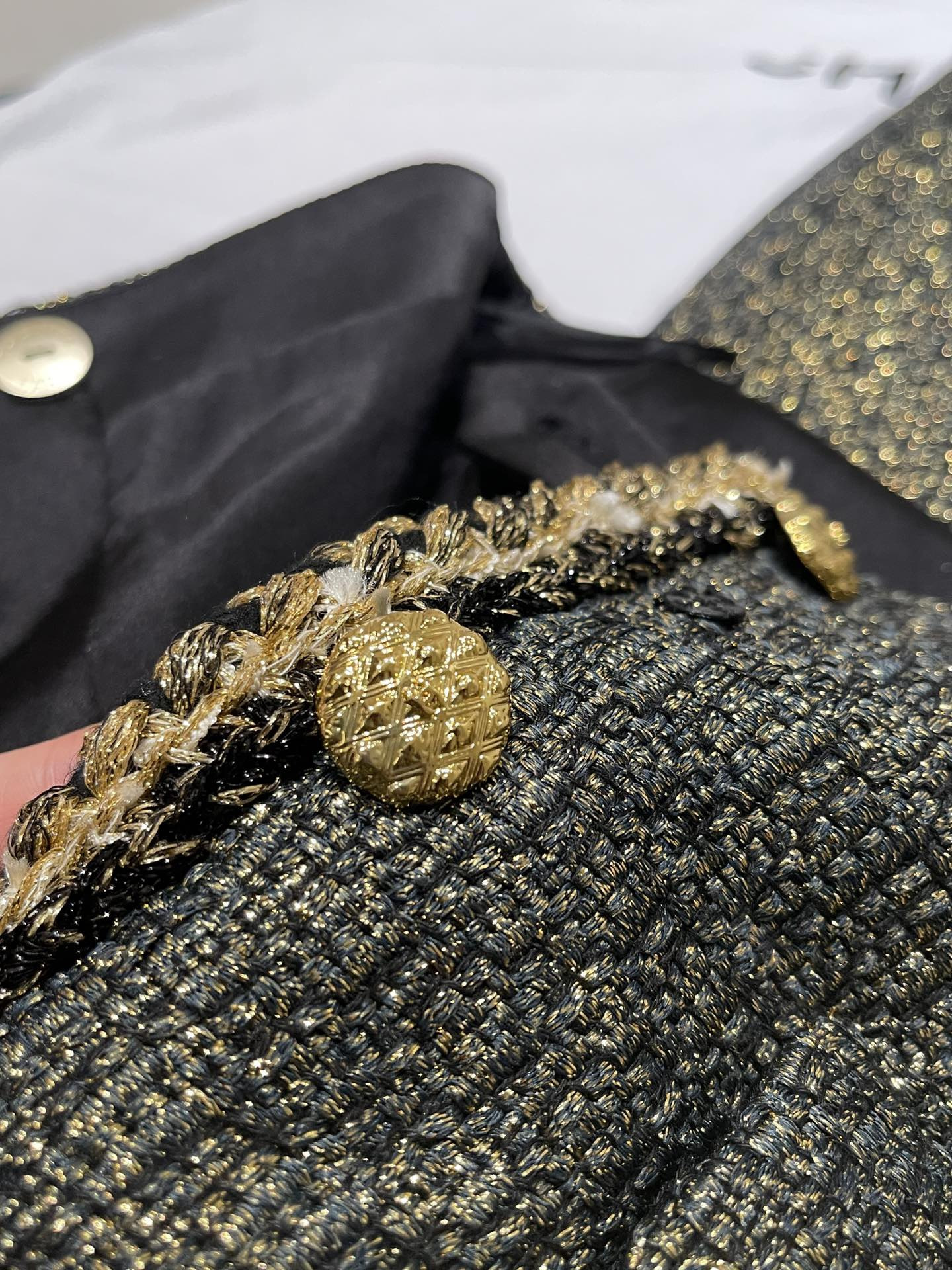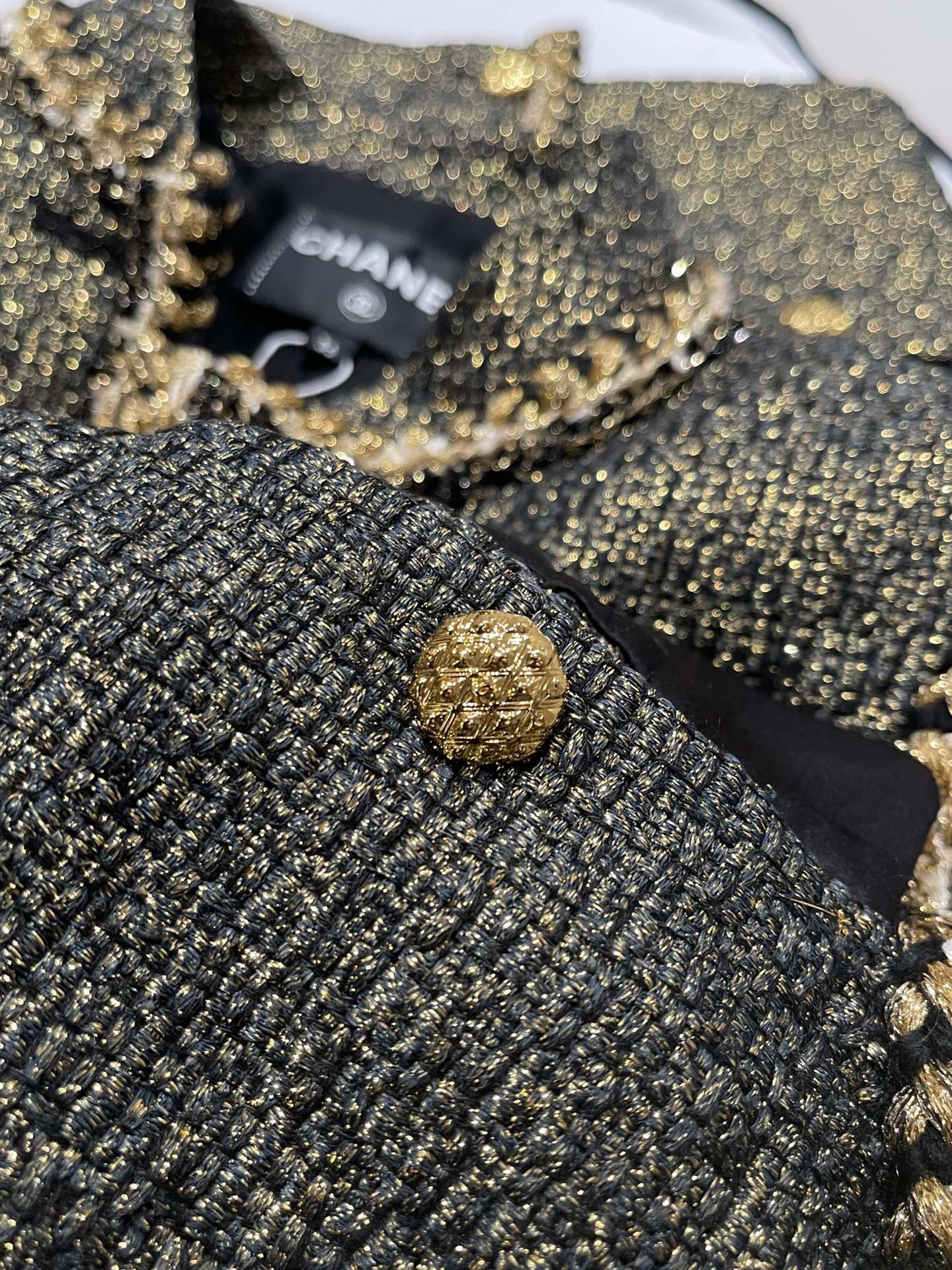 This Chanel clothing showcases the brand's exceptional craftsmanship and attention to detail. Crafted from premium tweed, gold, in a stunning black / gold colorway, this piece combines timeless luxury with modern style.