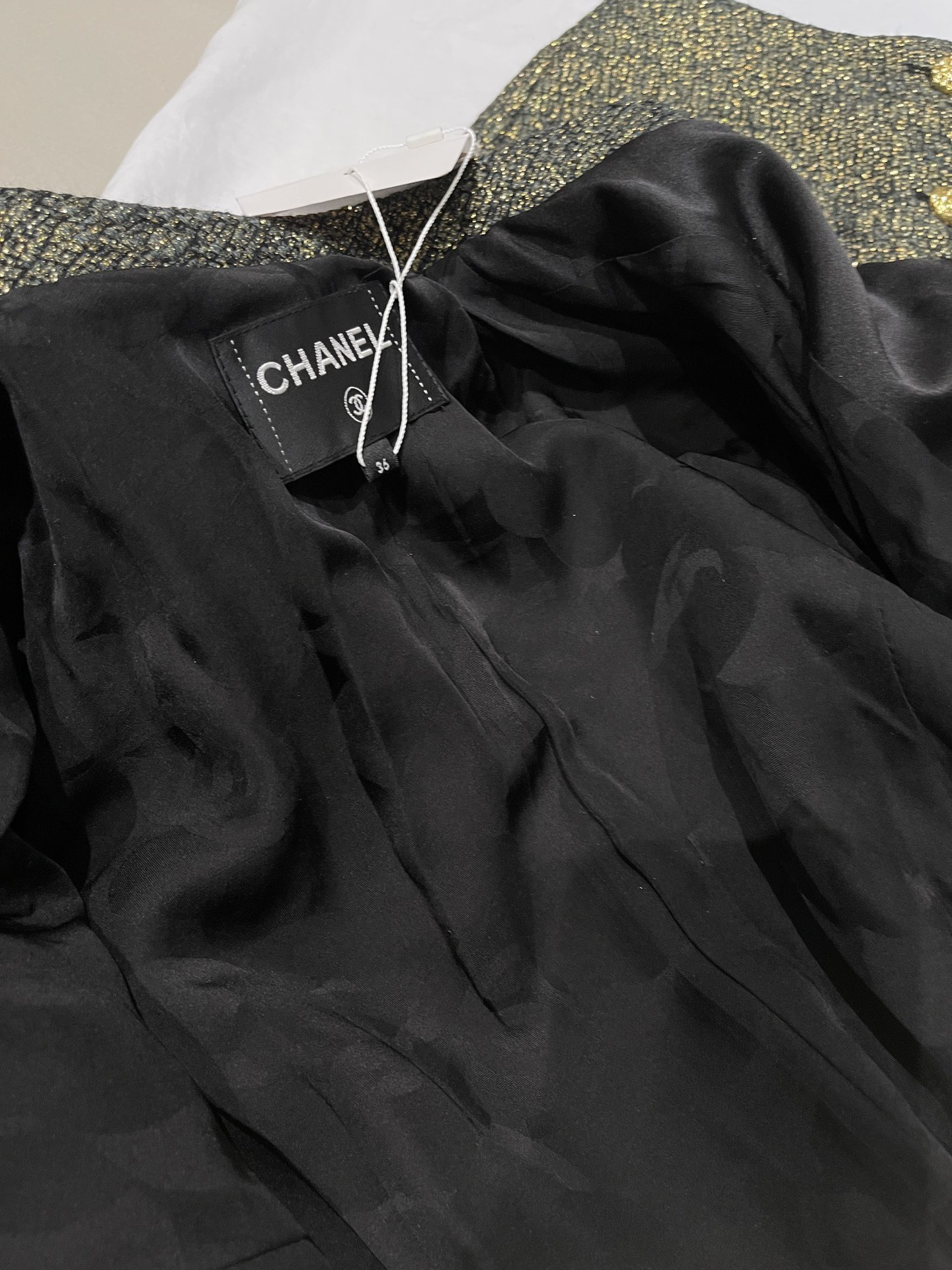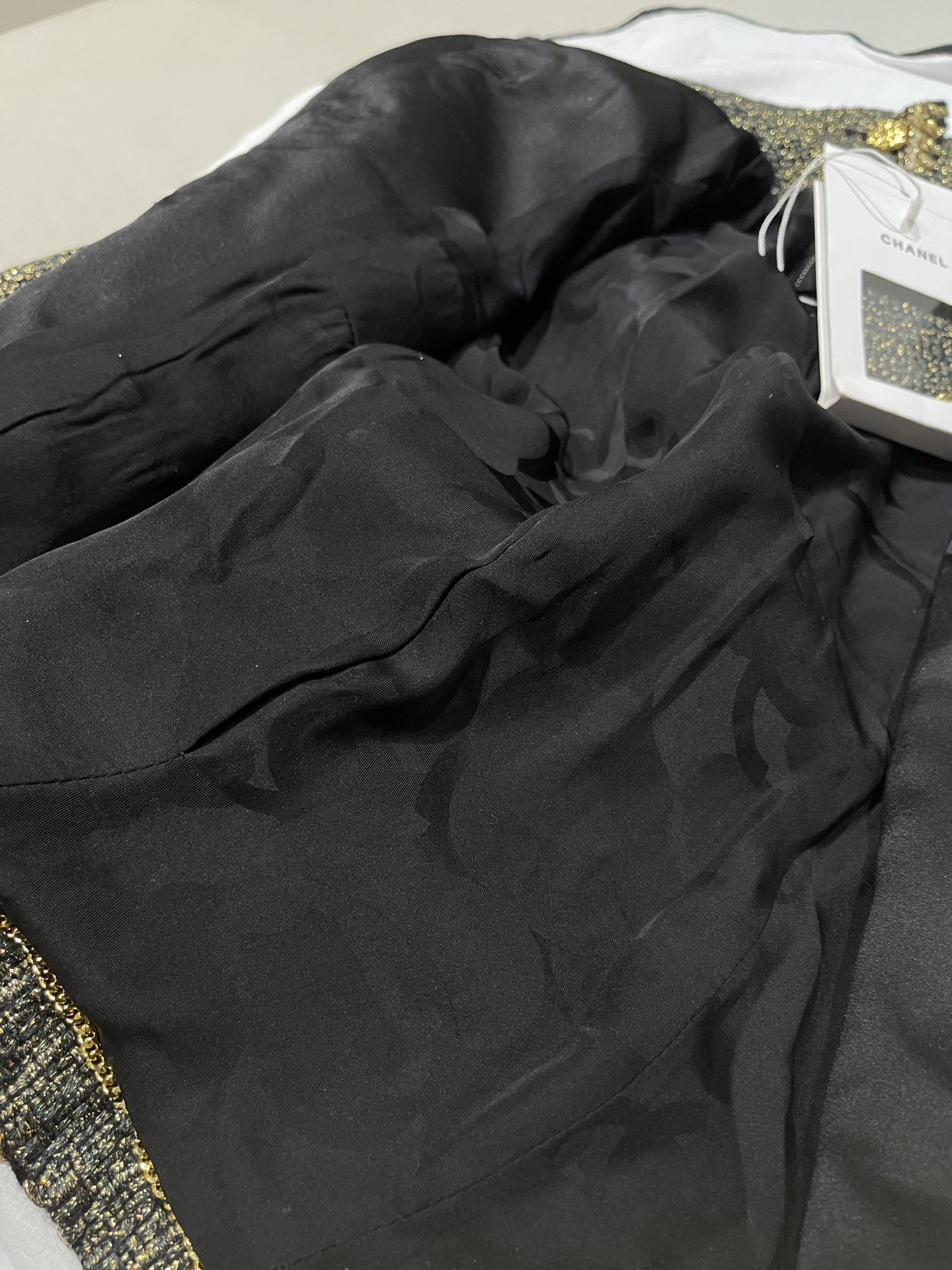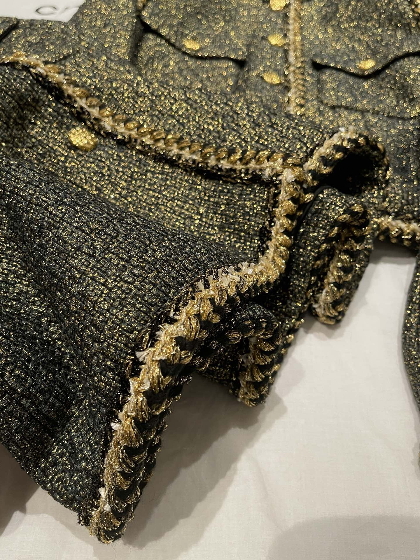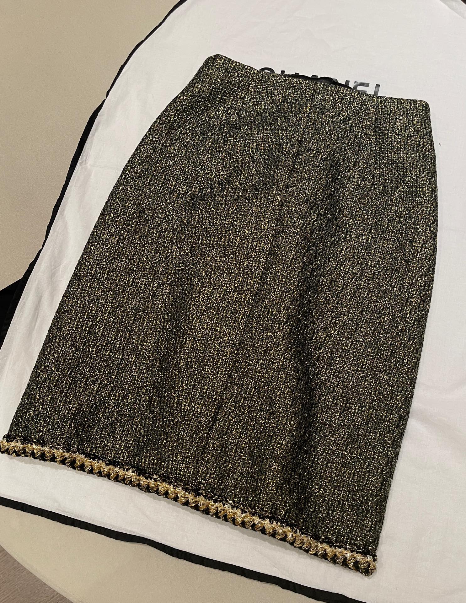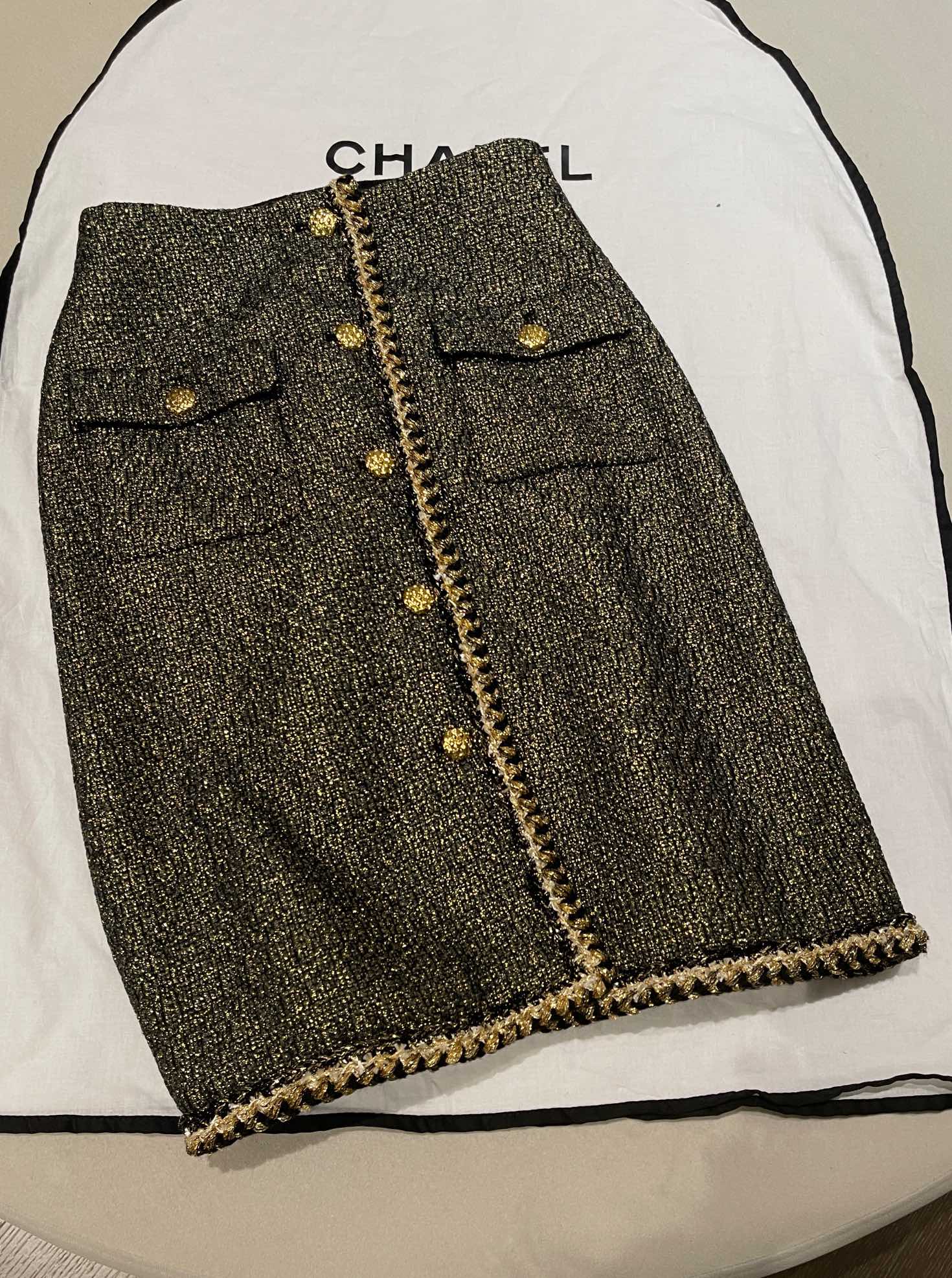 This Chanel clothing showcases the brand's exceptional craftsmanship and attention to detail. Crafted from premium tweed, gold, in a stunning black / gold colorway, this piece combines timeless luxury with modern style.