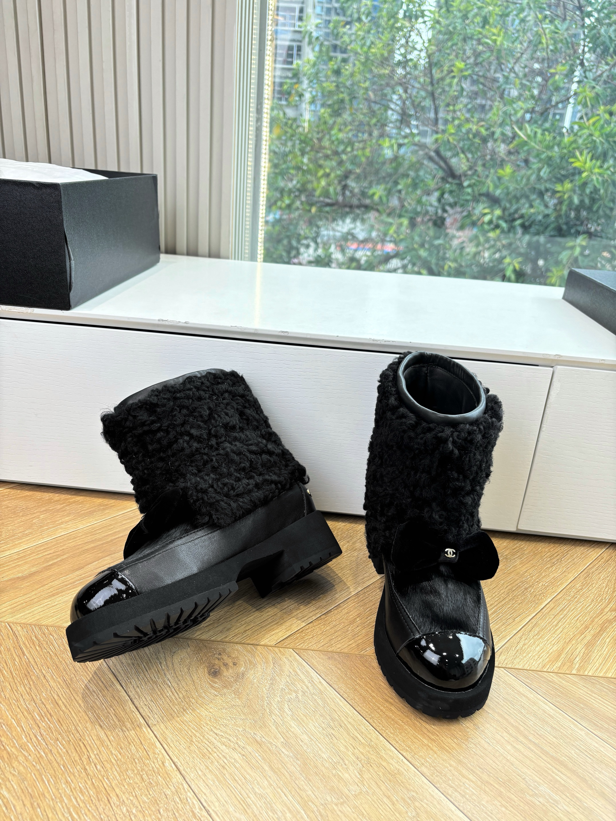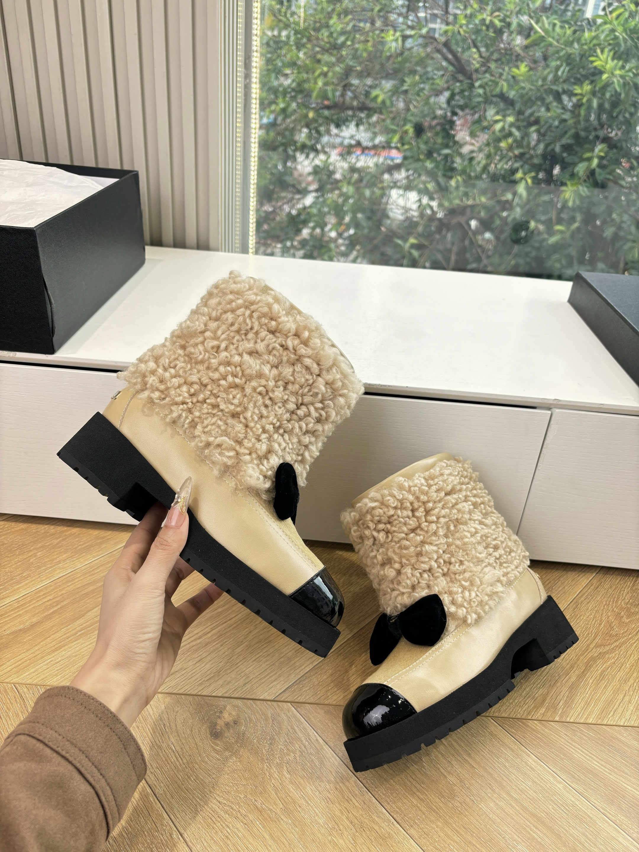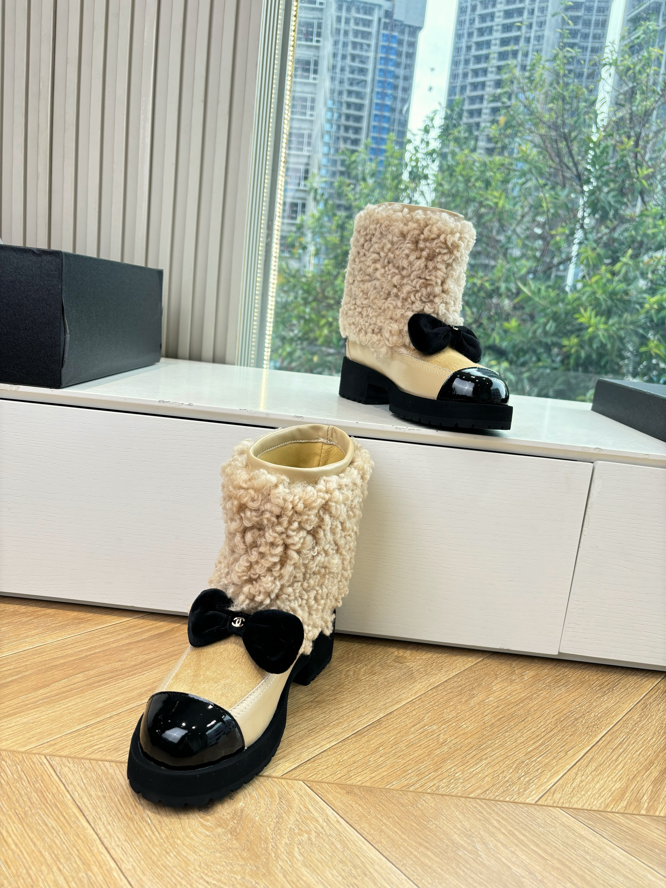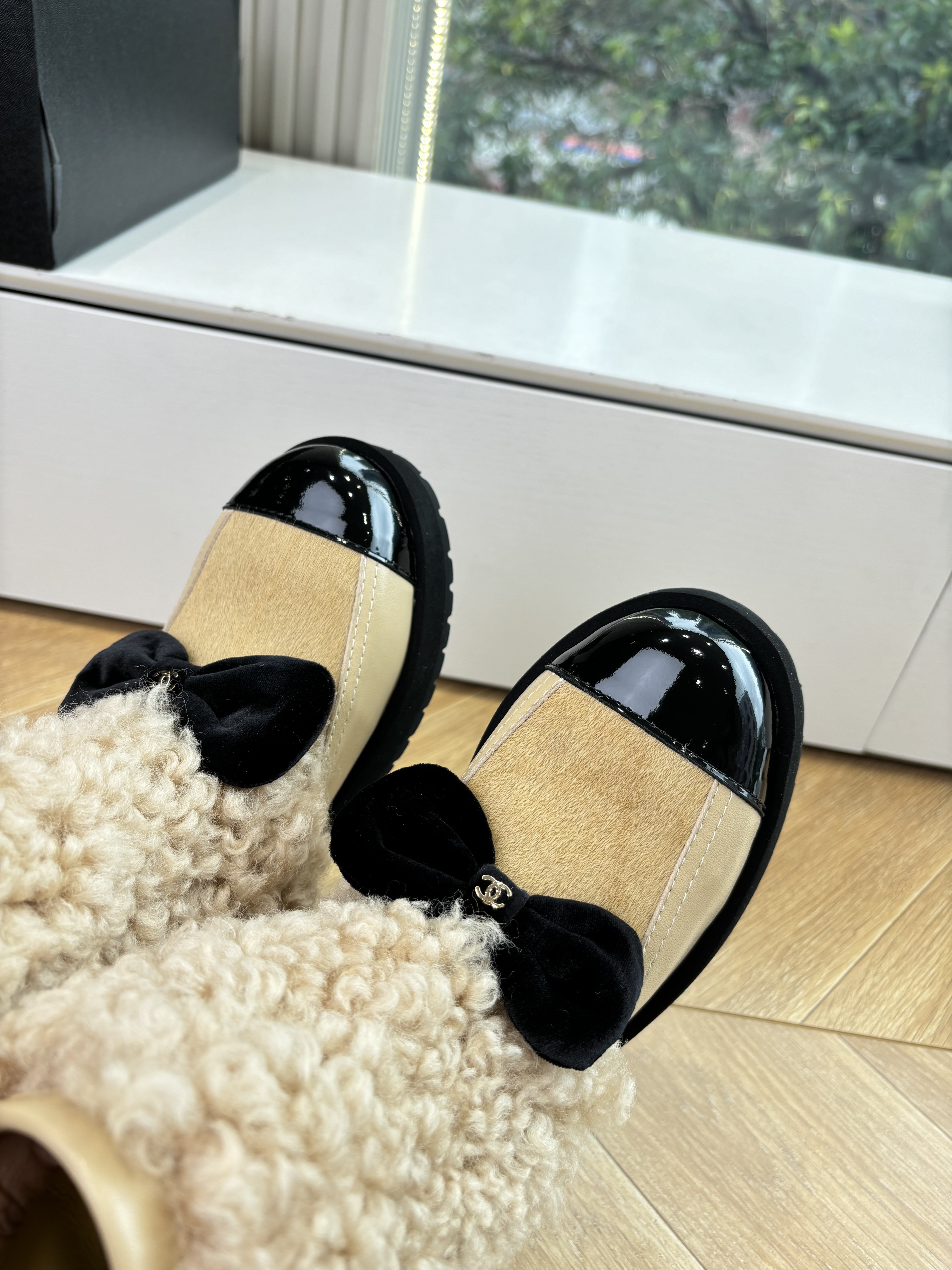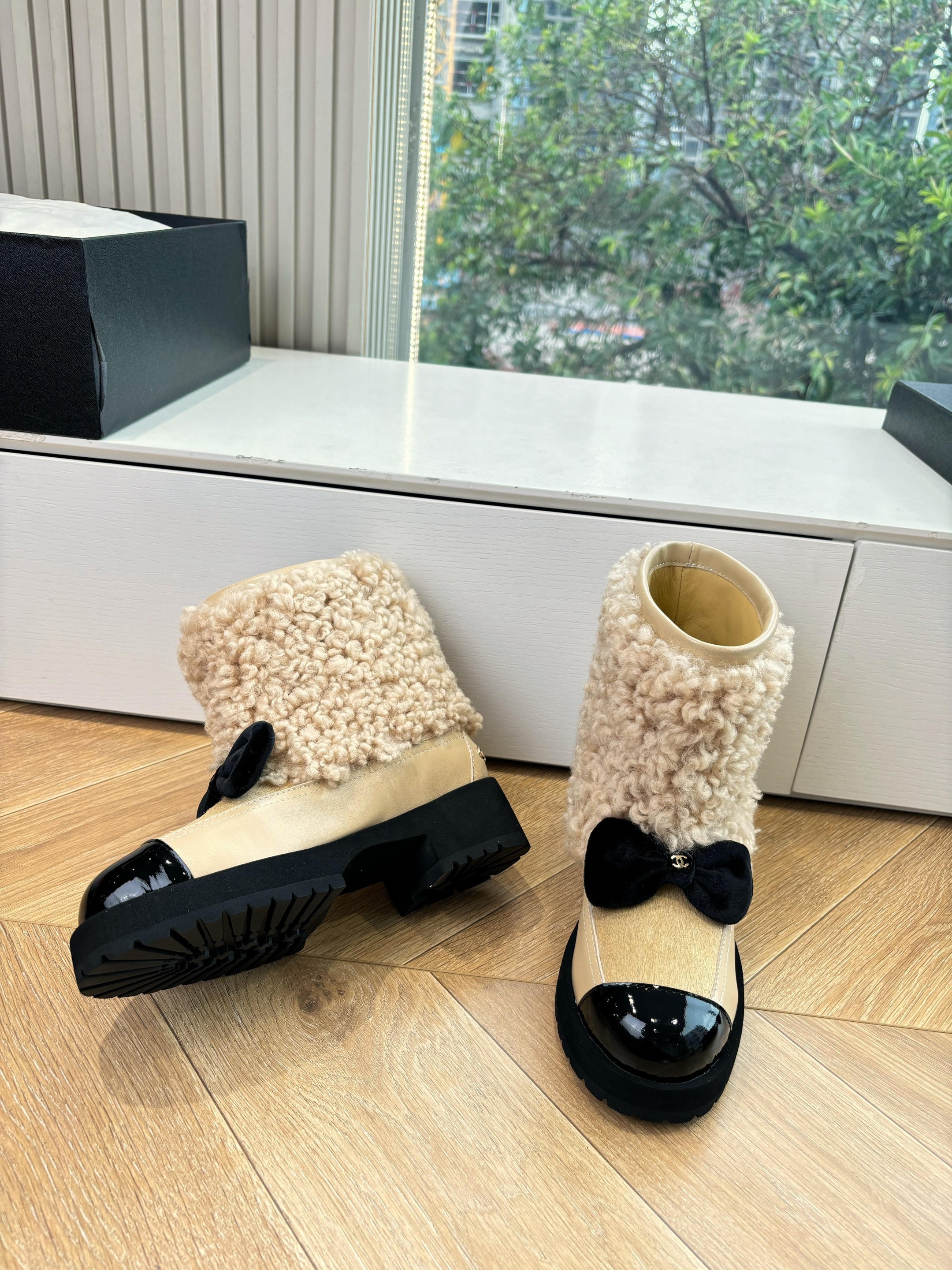 NIGO Chanel Short Boots Shearling Lambskin Calfskin Lambskin Patent Calfskin Beige Black #nigo334244