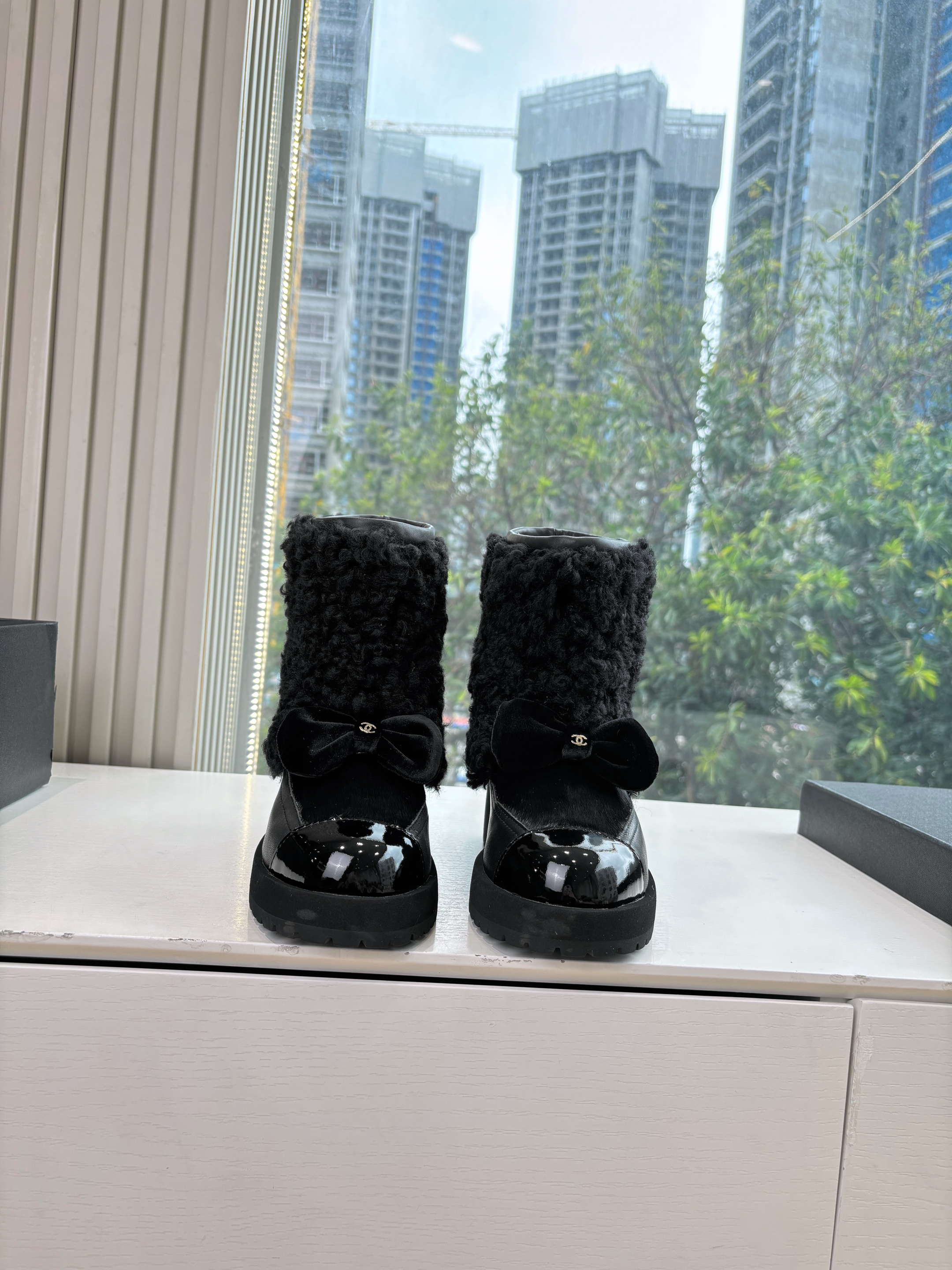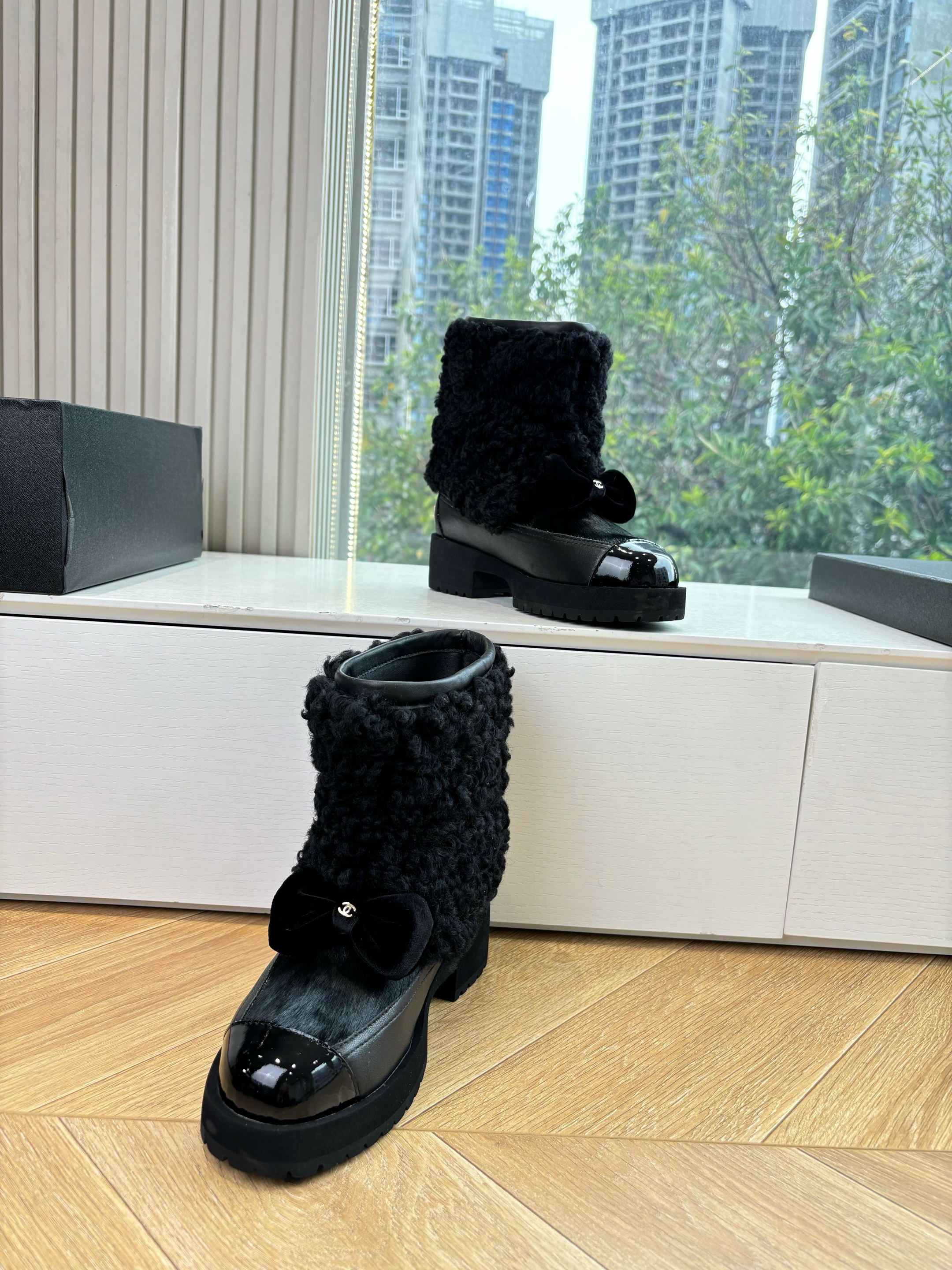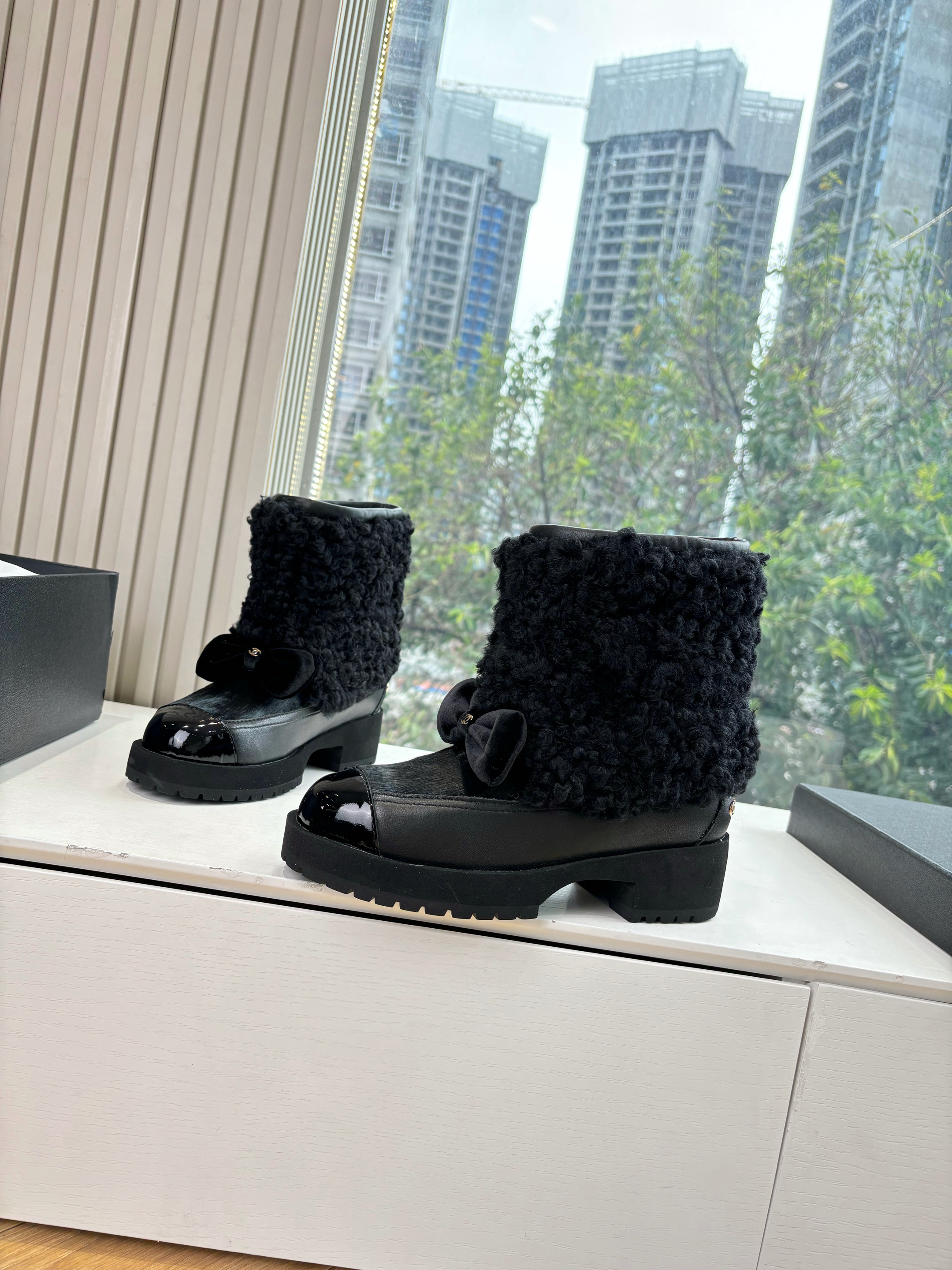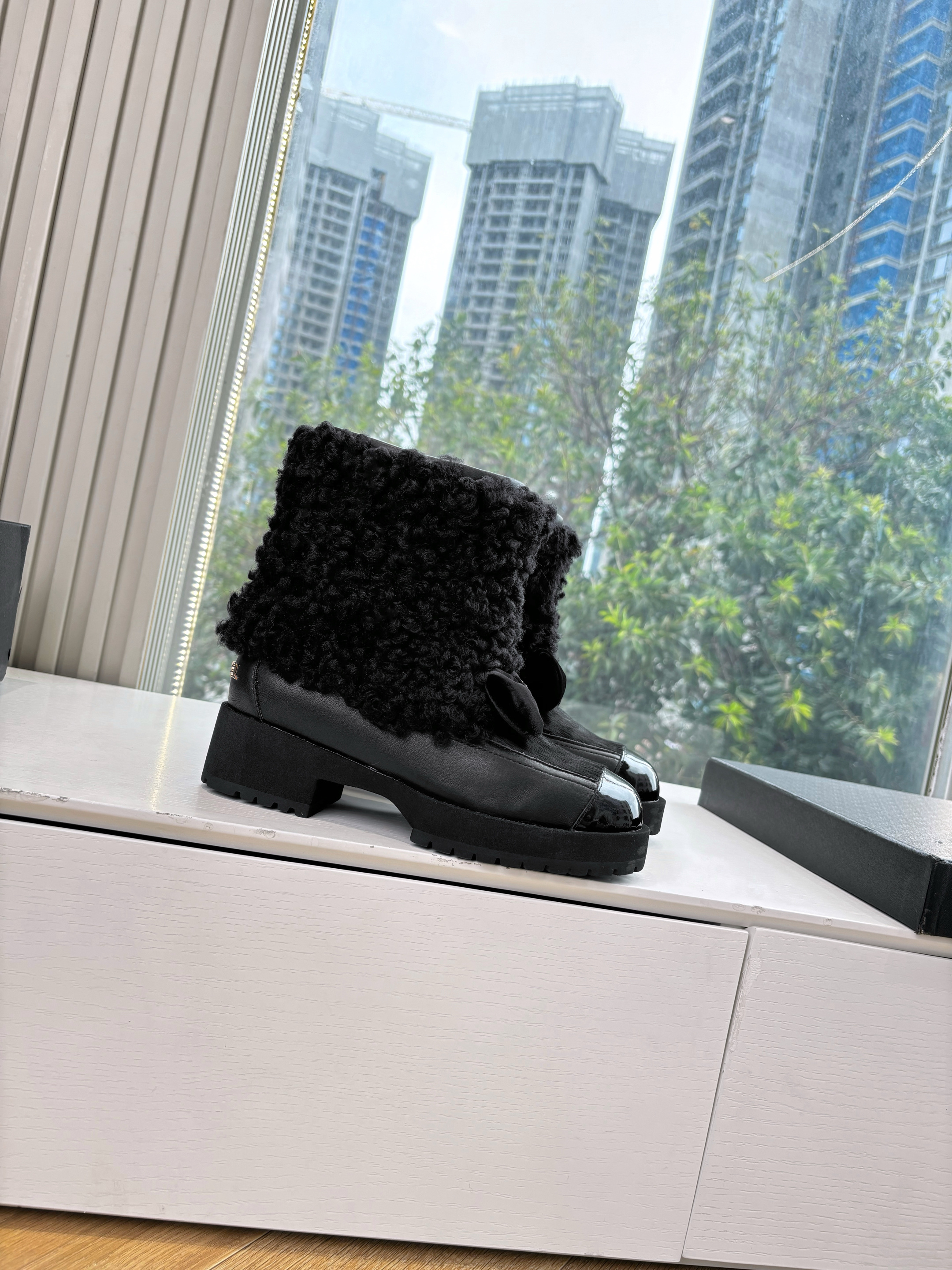 NIGO Chanel Short Boots Shearling Lambskin Calfskin Lambskin Patent Calfskin Beige Black #nigo334244