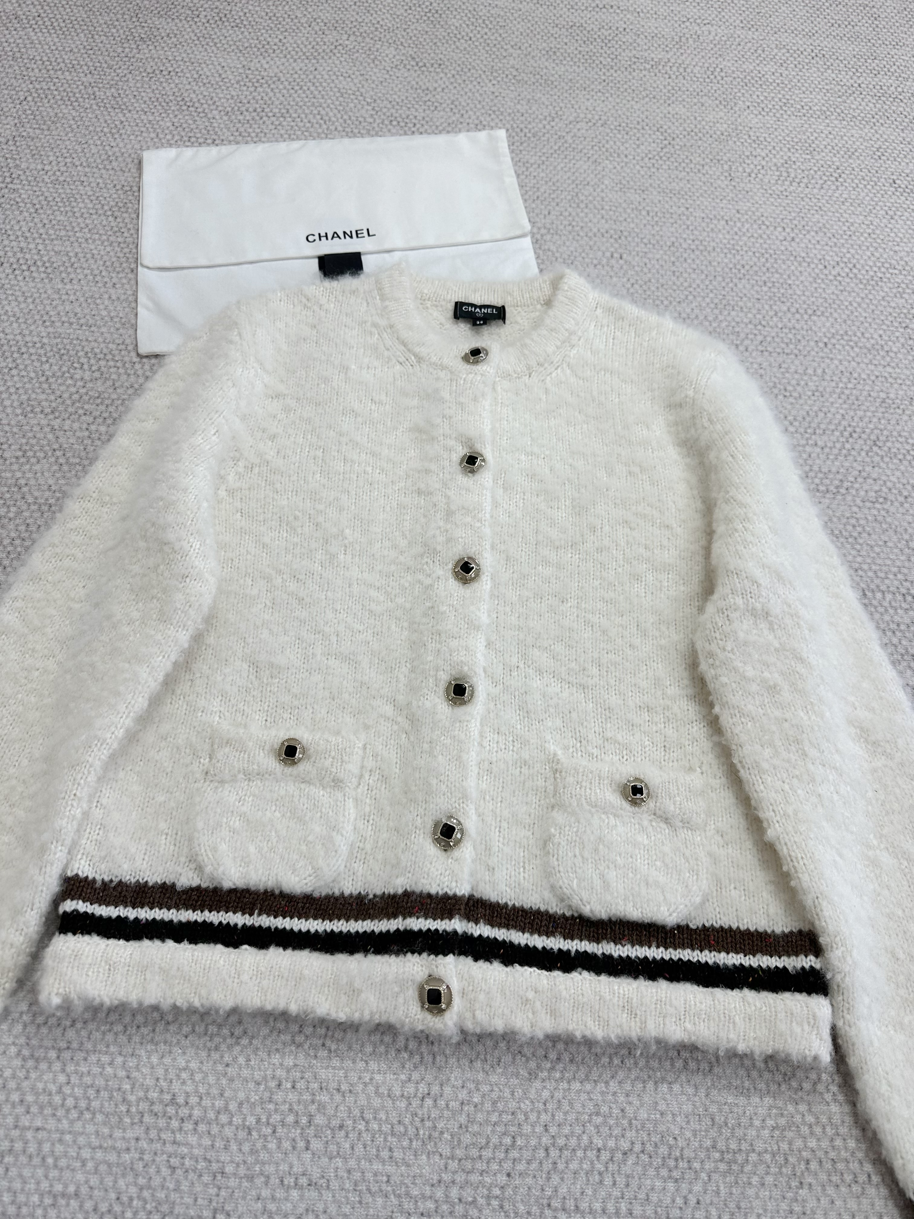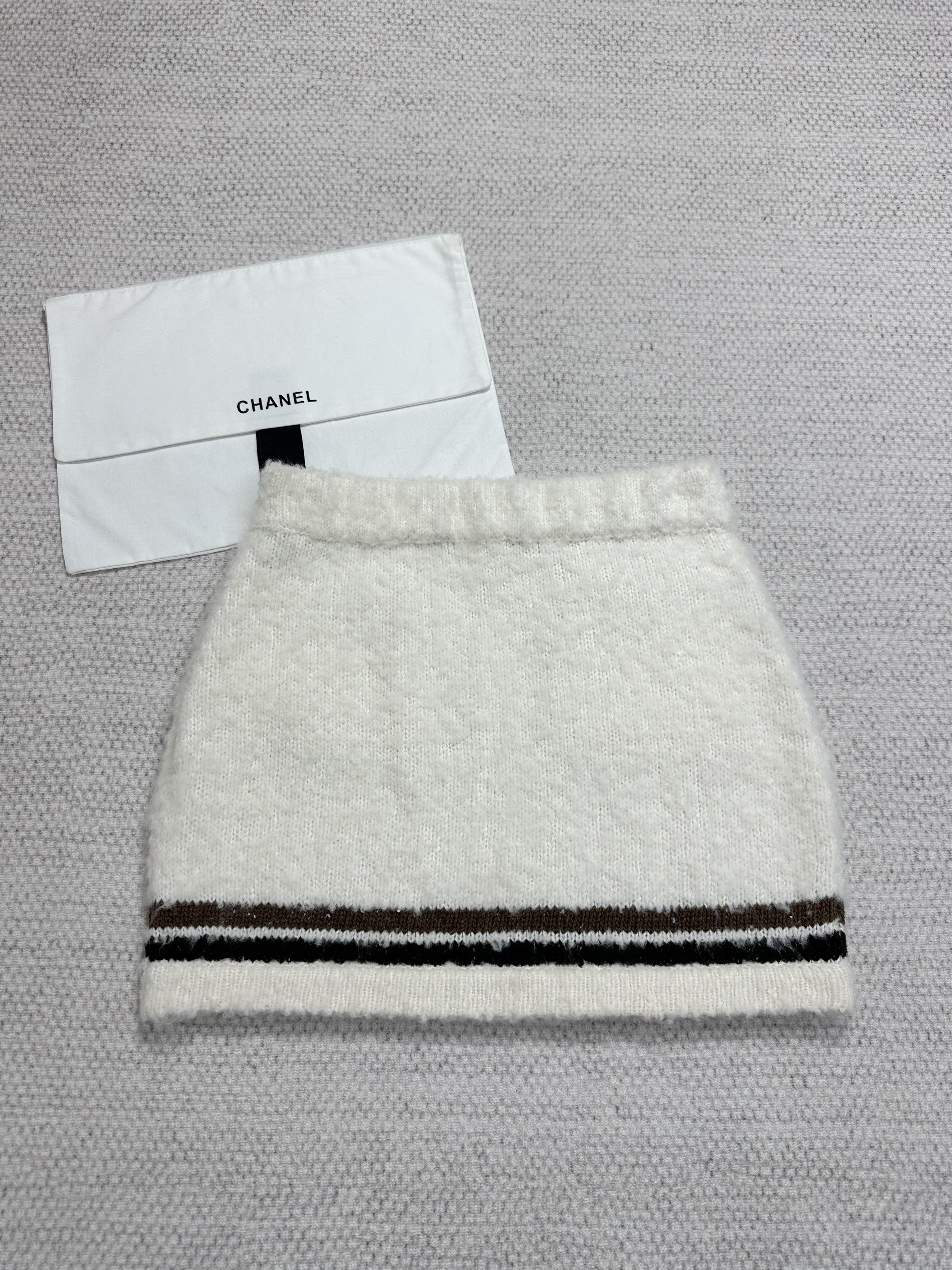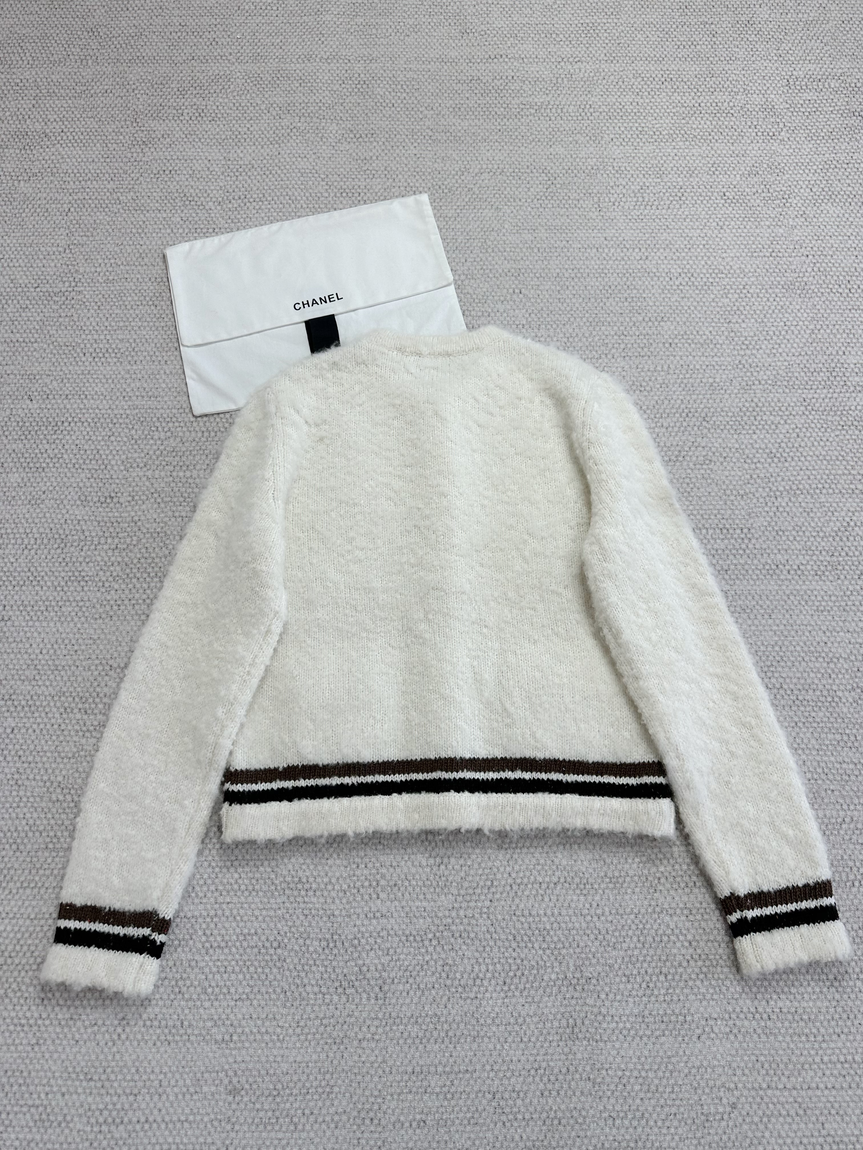 This Chanel clothing showcases the brand's exceptional craftsmanship and attention to detail. Crafted from premium cashmere, in a stunning white / brown colorway, this piece combines timeless luxury with modern style.