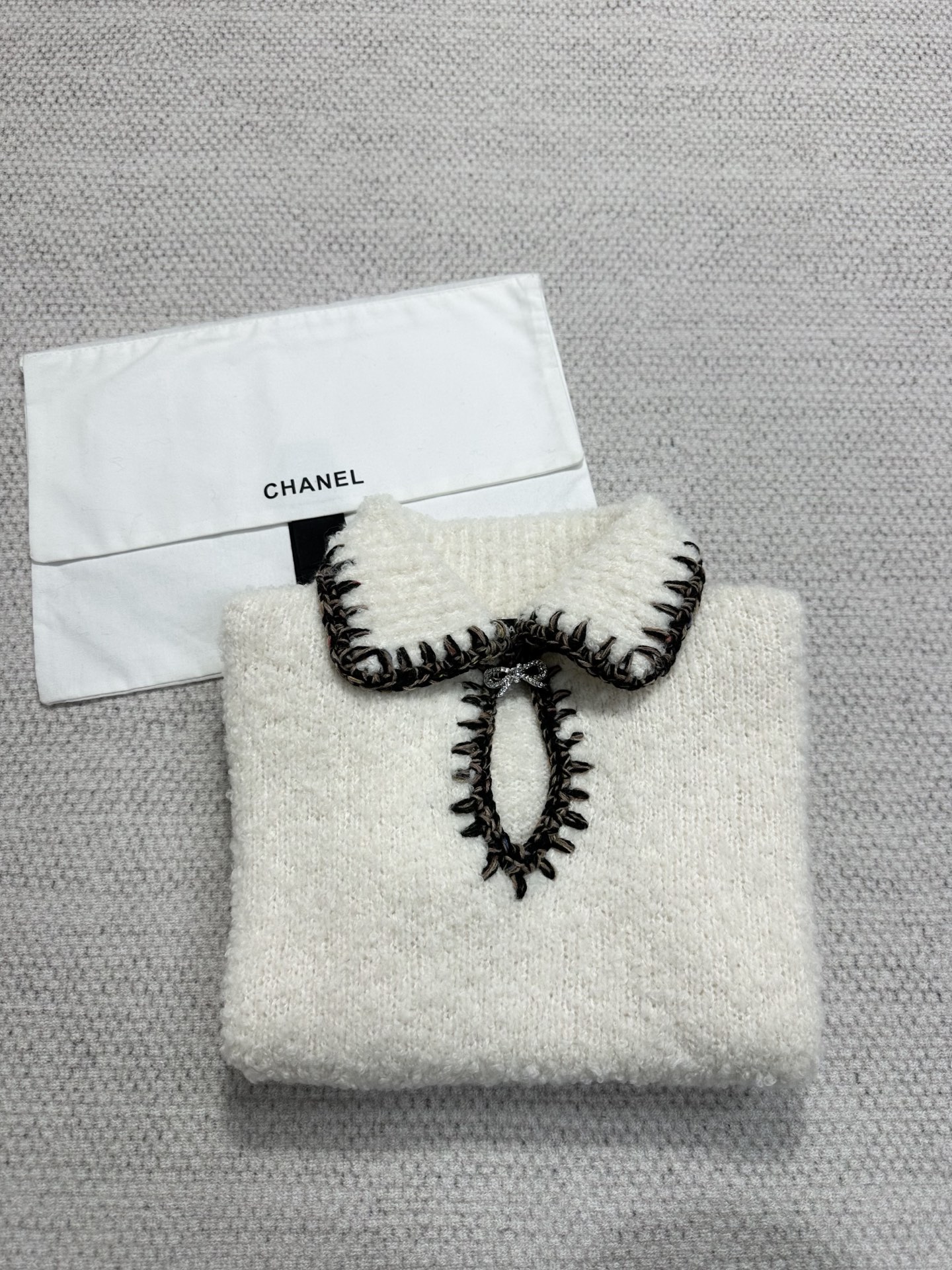 This Chanel accessory showcases the brand's exceptional craftsmanship and attention to detail. Crafted from premium cashmere, in a stunning white / brown colorway, this piece combines timeless luxury with modern style.