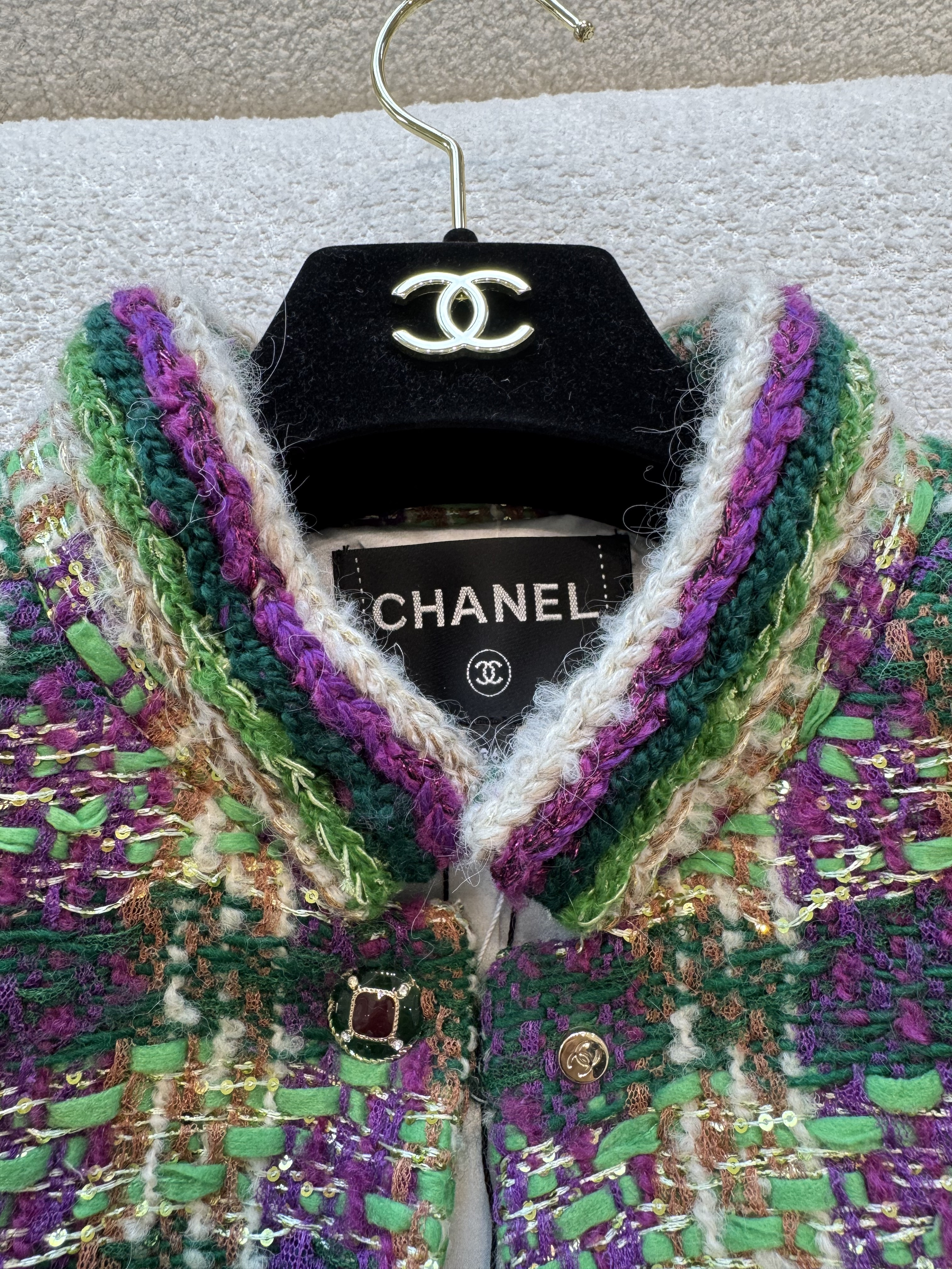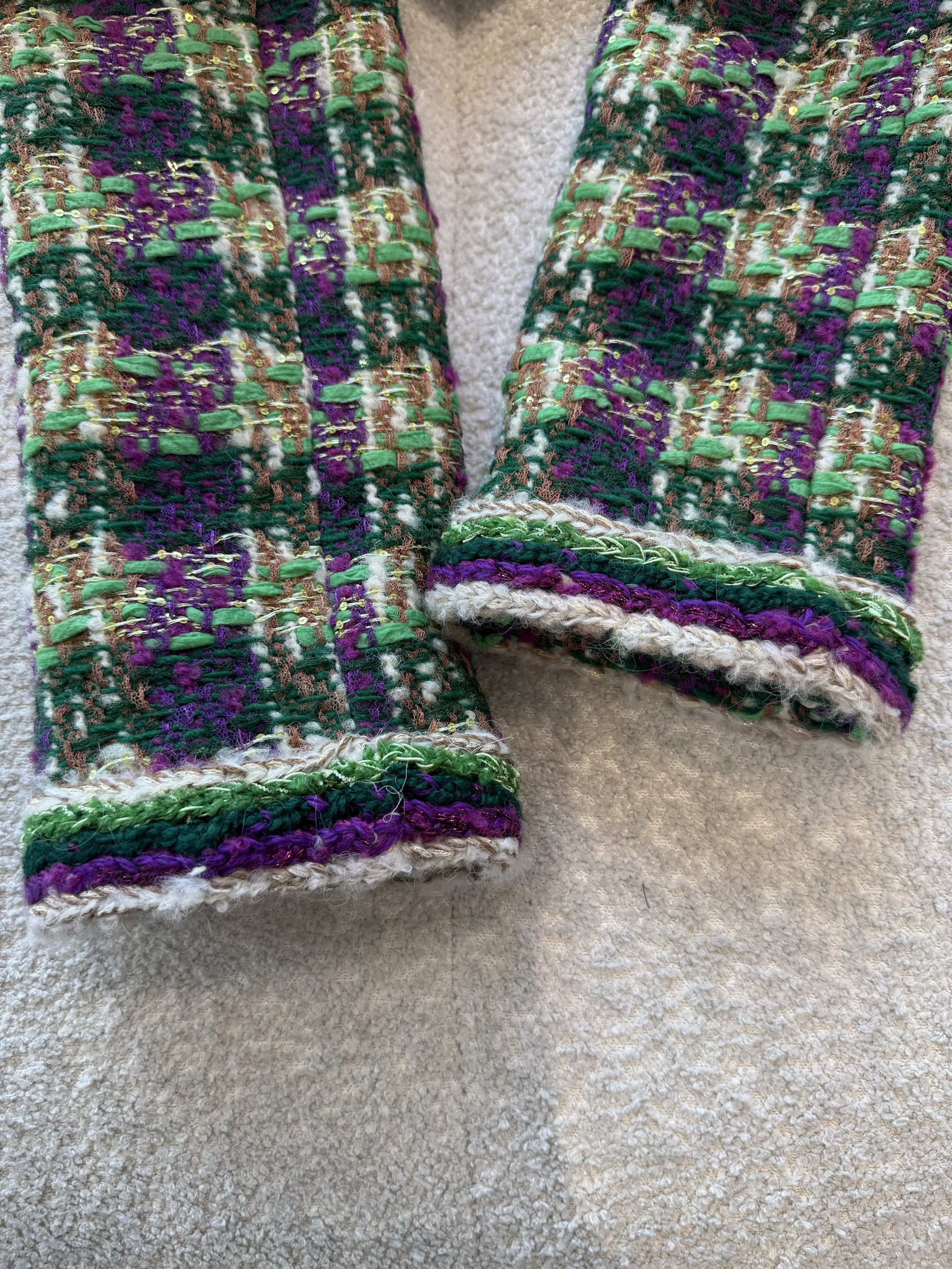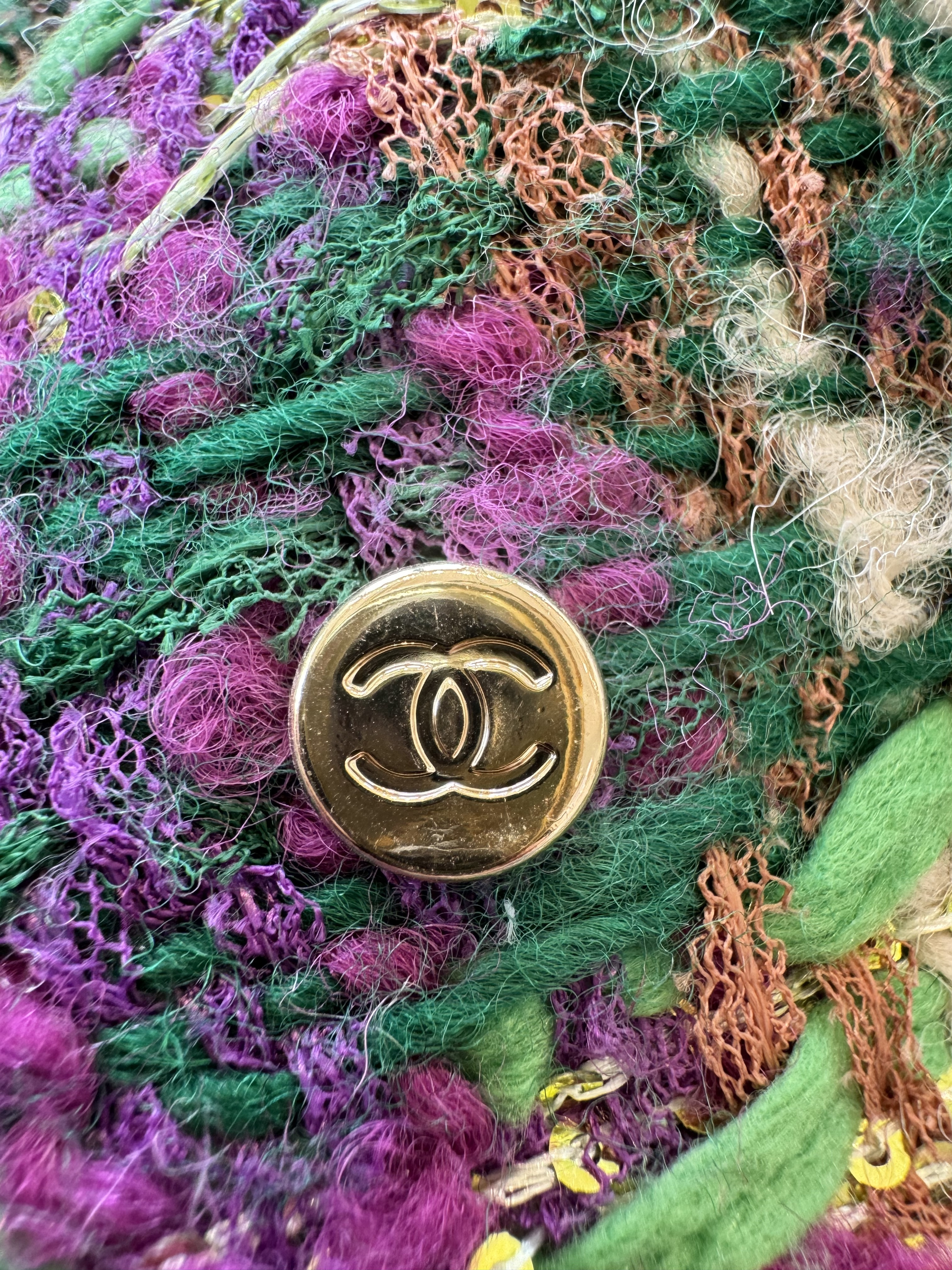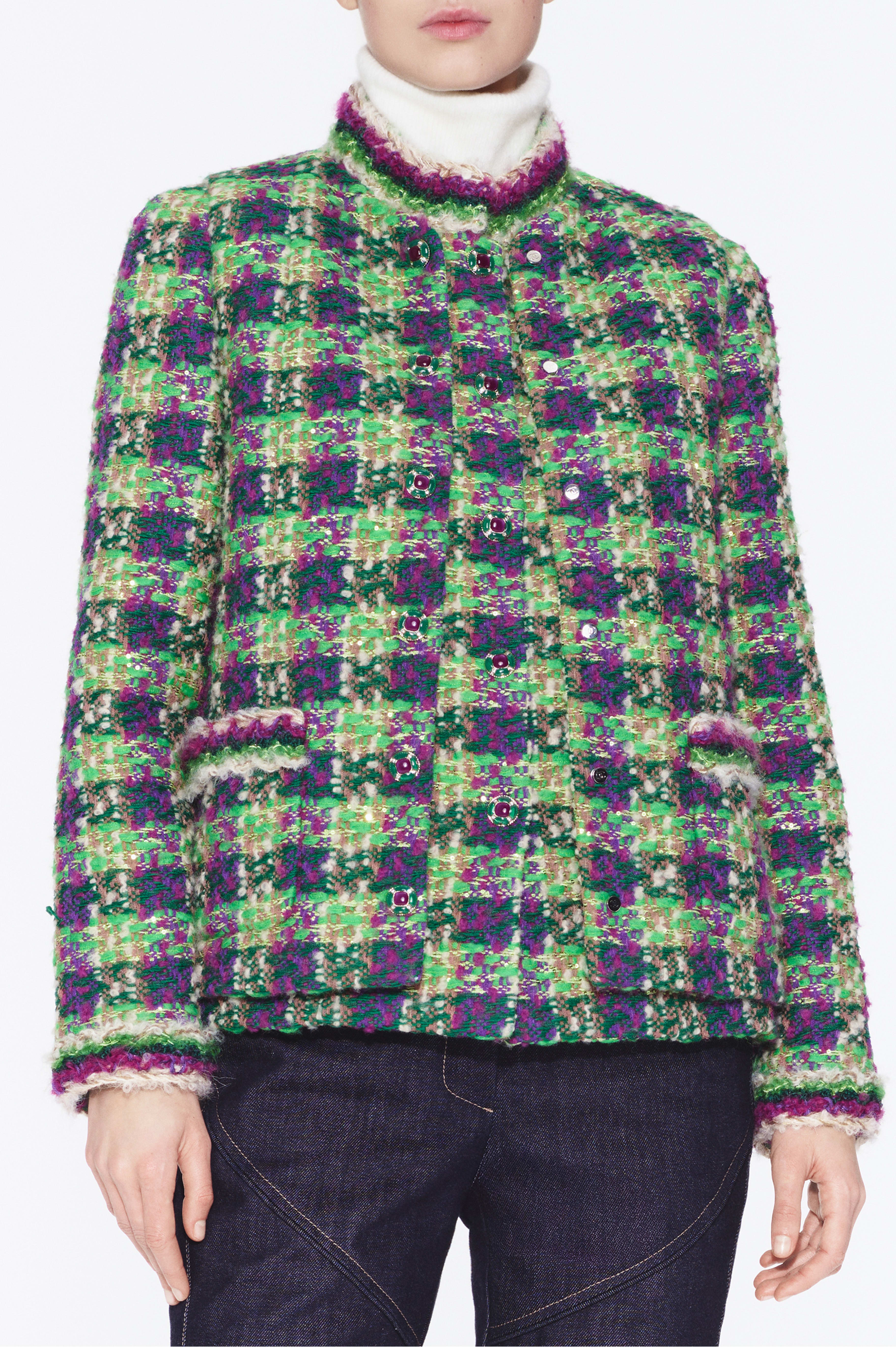 This Chanel clothing showcases the brand's exceptional craftsmanship and attention to detail. Crafted from premium tweed, in a stunning green / purple colorway, this piece combines timeless luxury with modern style.
