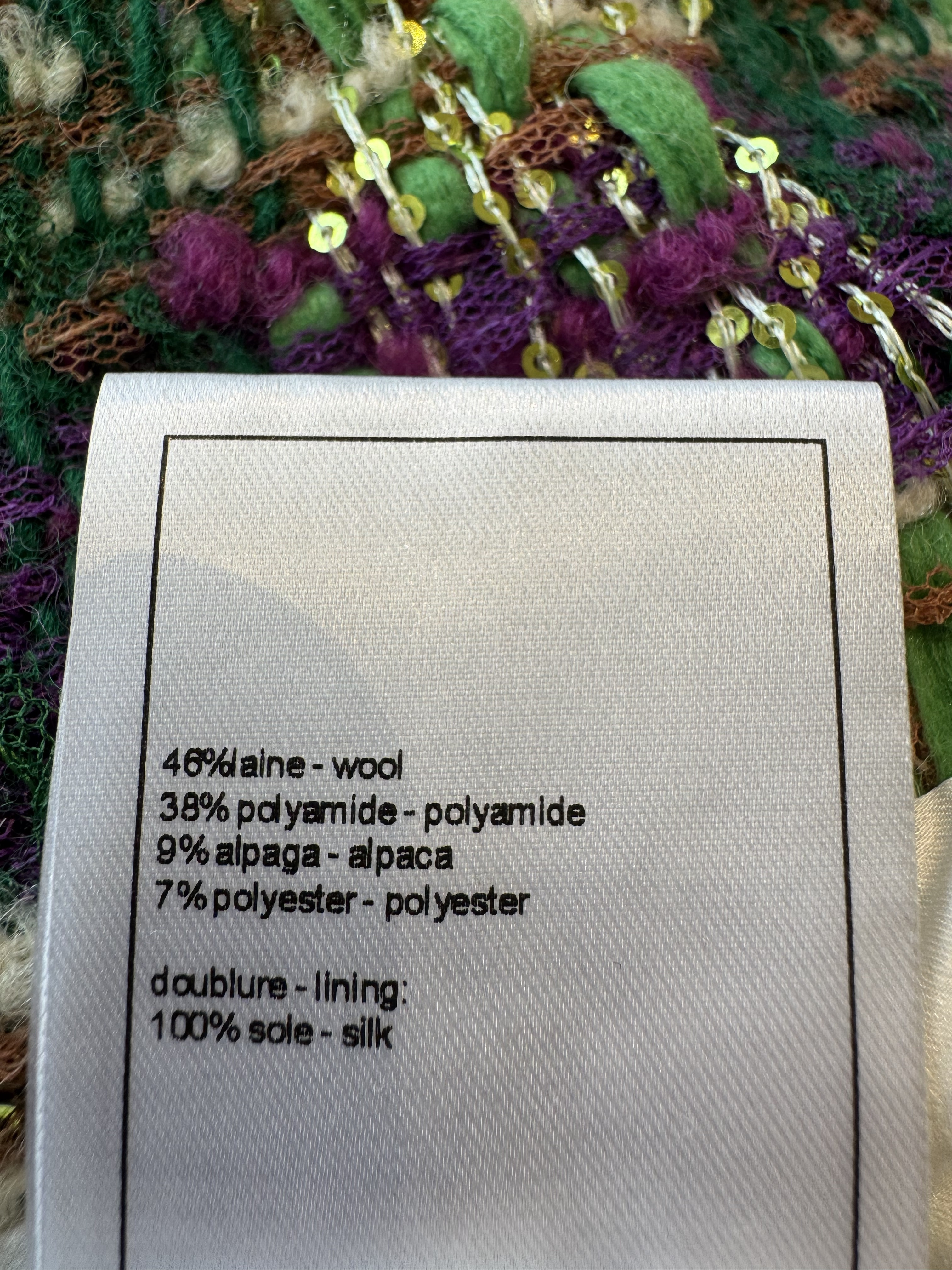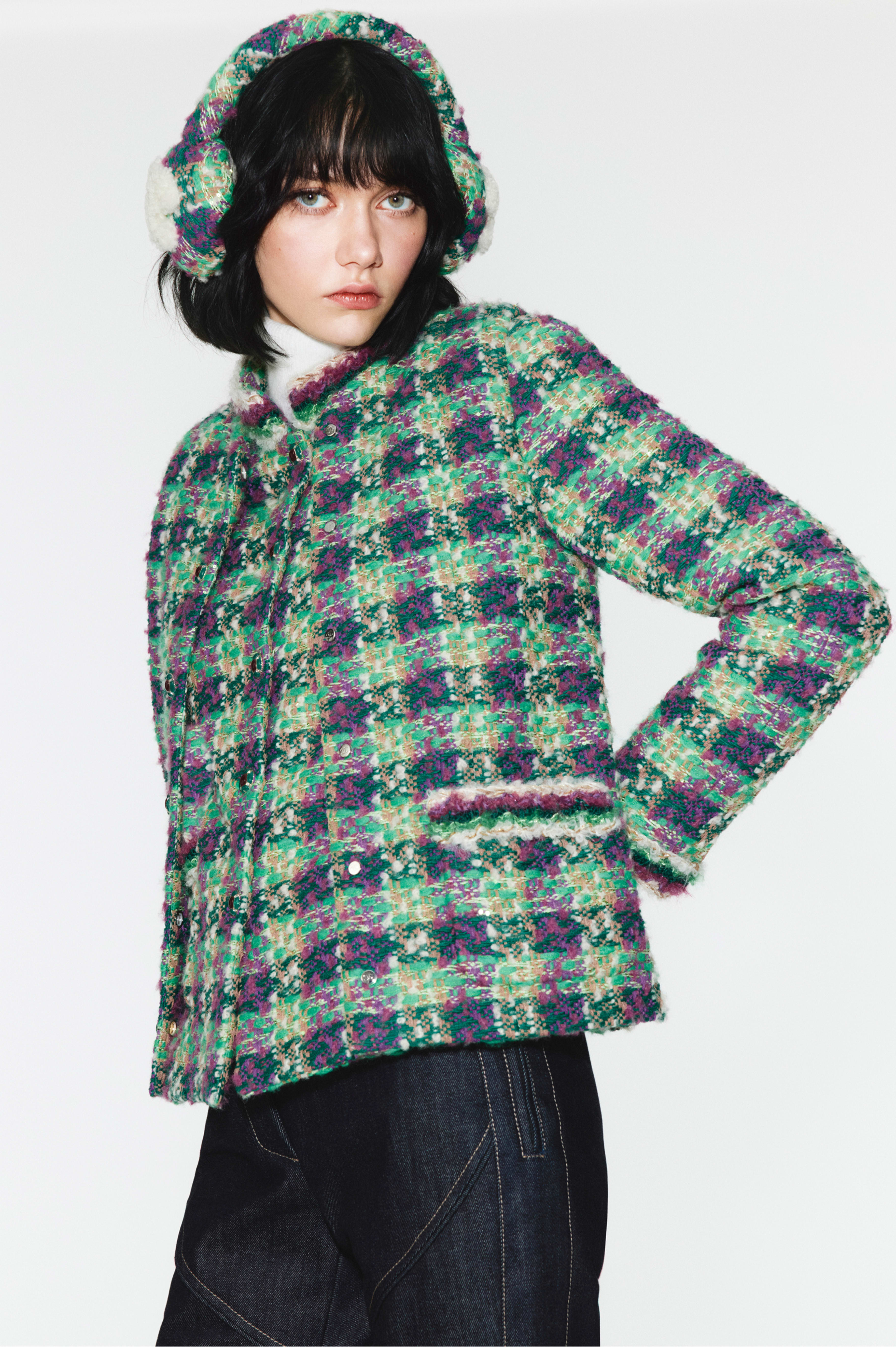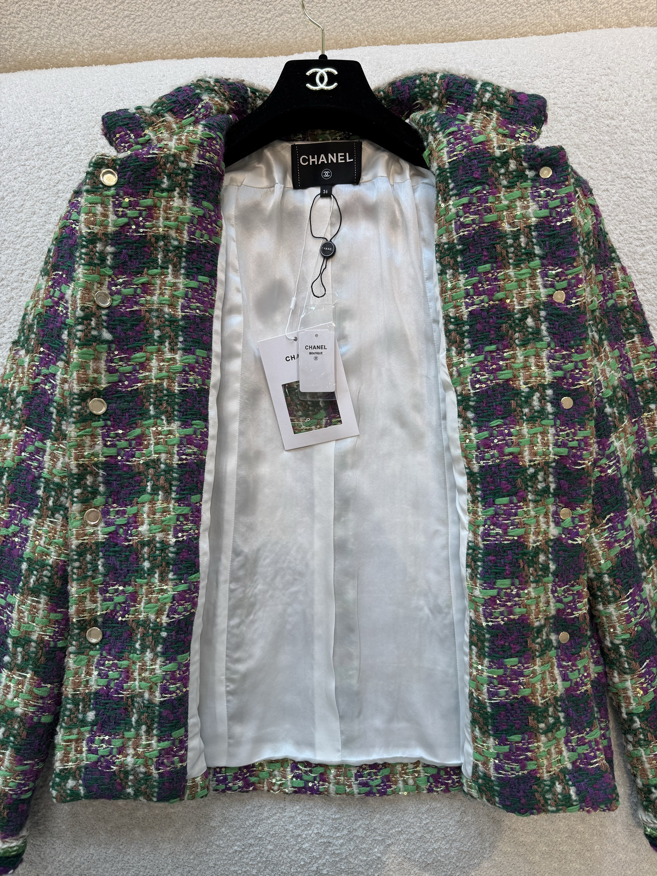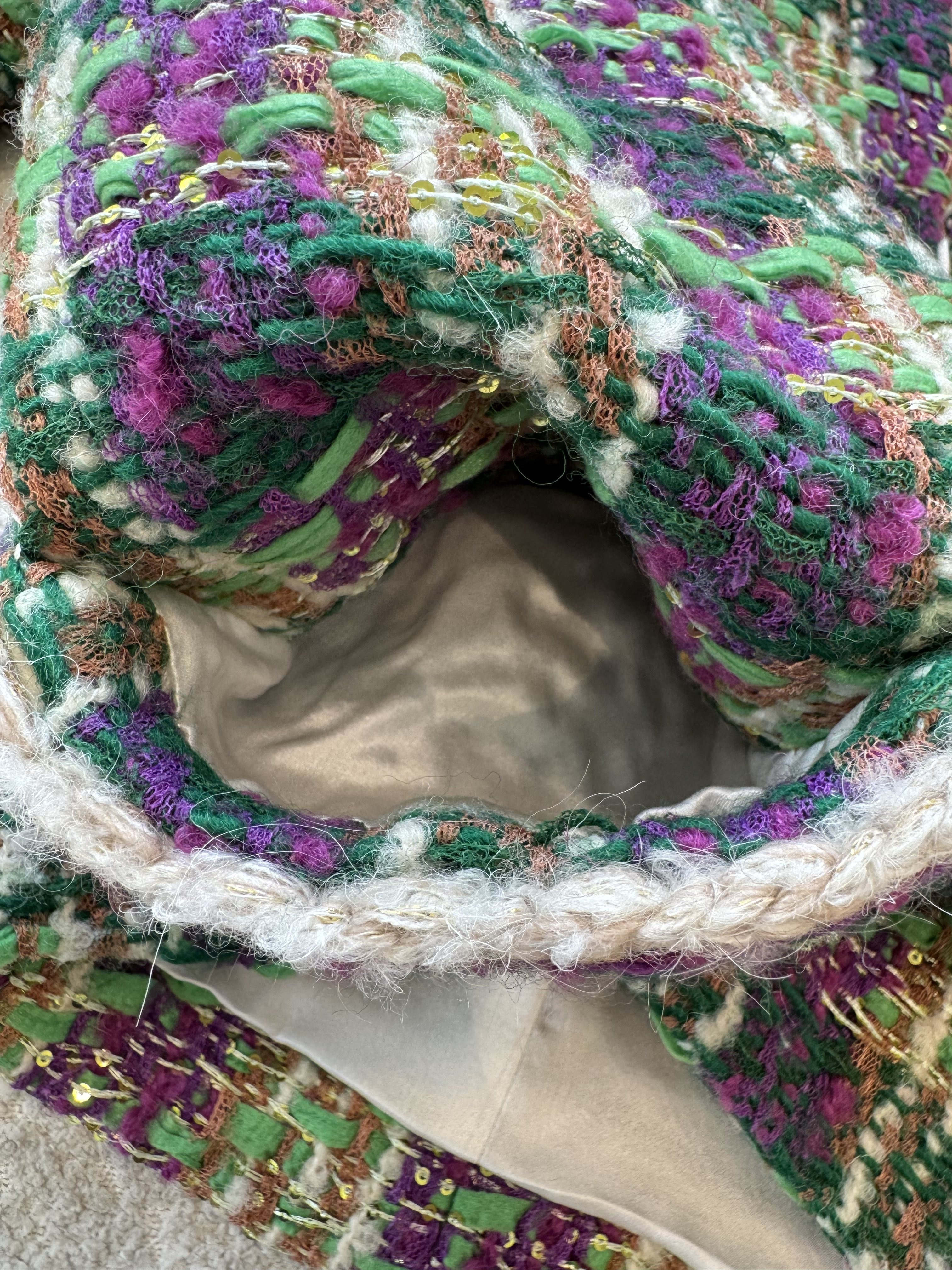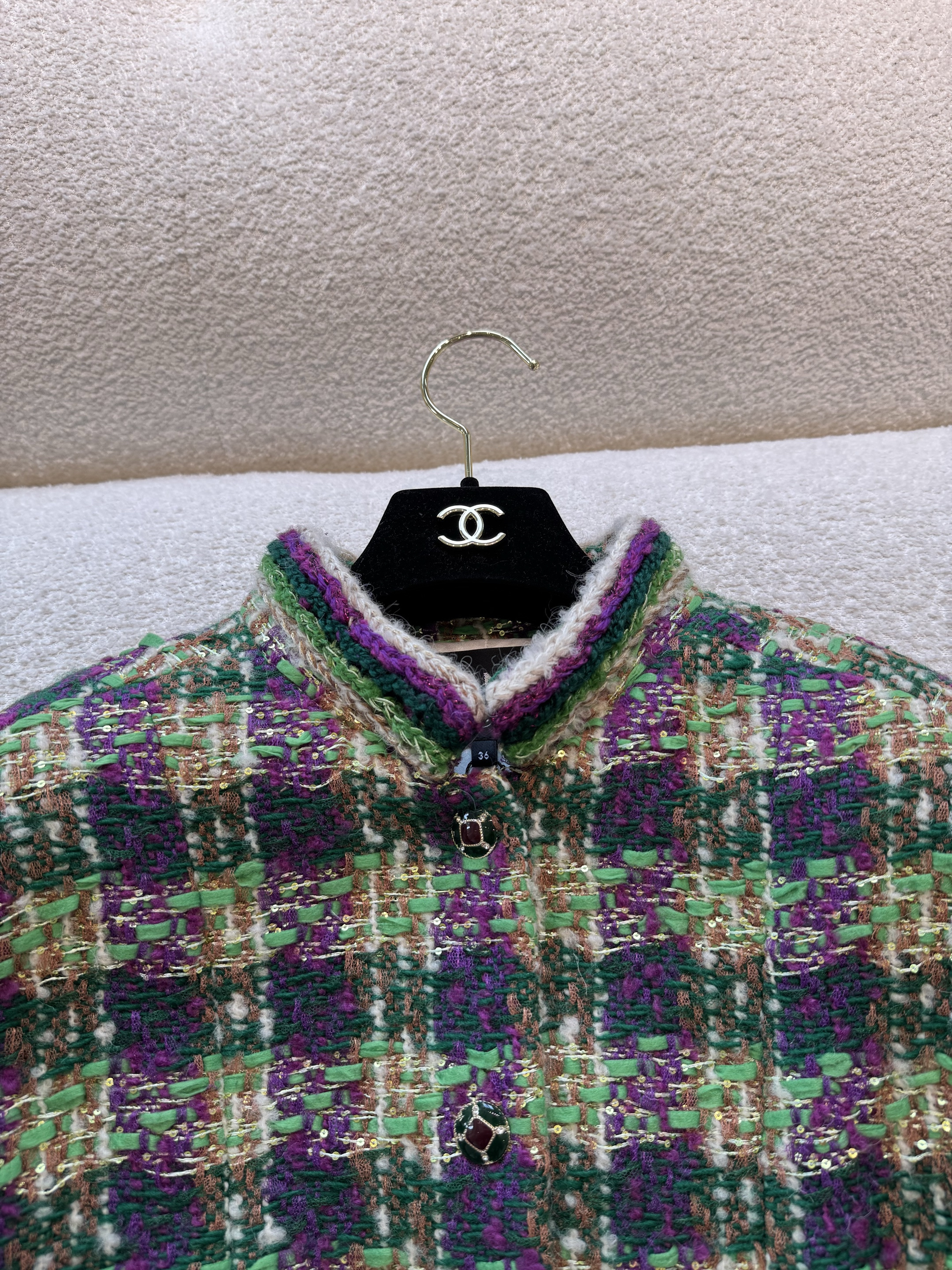 This Chanel clothing showcases the brand's exceptional craftsmanship and attention to detail. Crafted from premium tweed, in a stunning green / purple colorway, this piece combines timeless luxury with modern style.