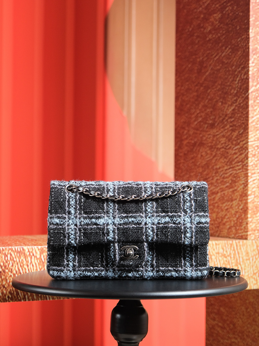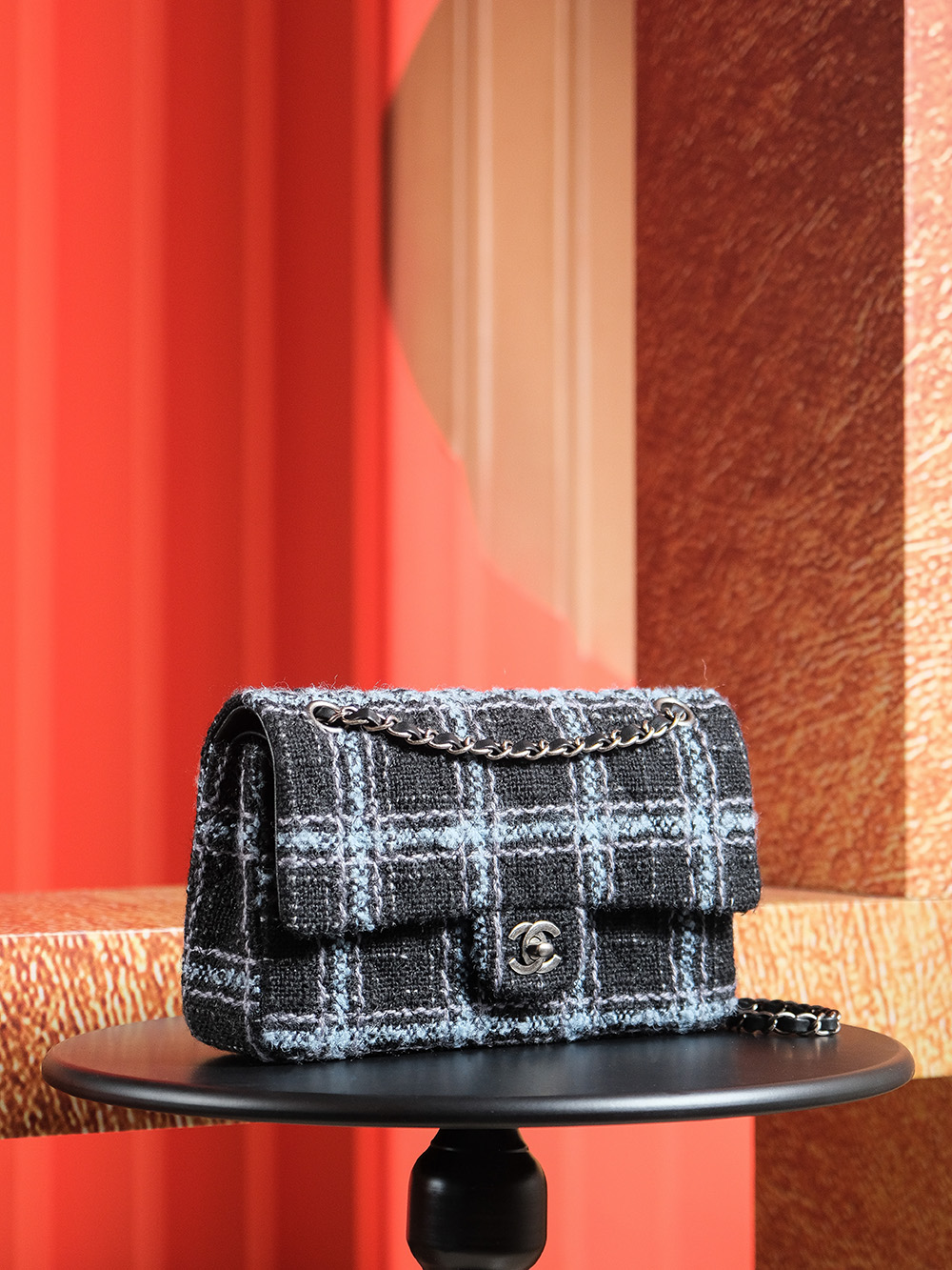 This Chanel handbag showcases the brand's exceptional craftsmanship and attention to detail. Crafted from premium tweed, wool, this piece combines timeless luxury with modern style.