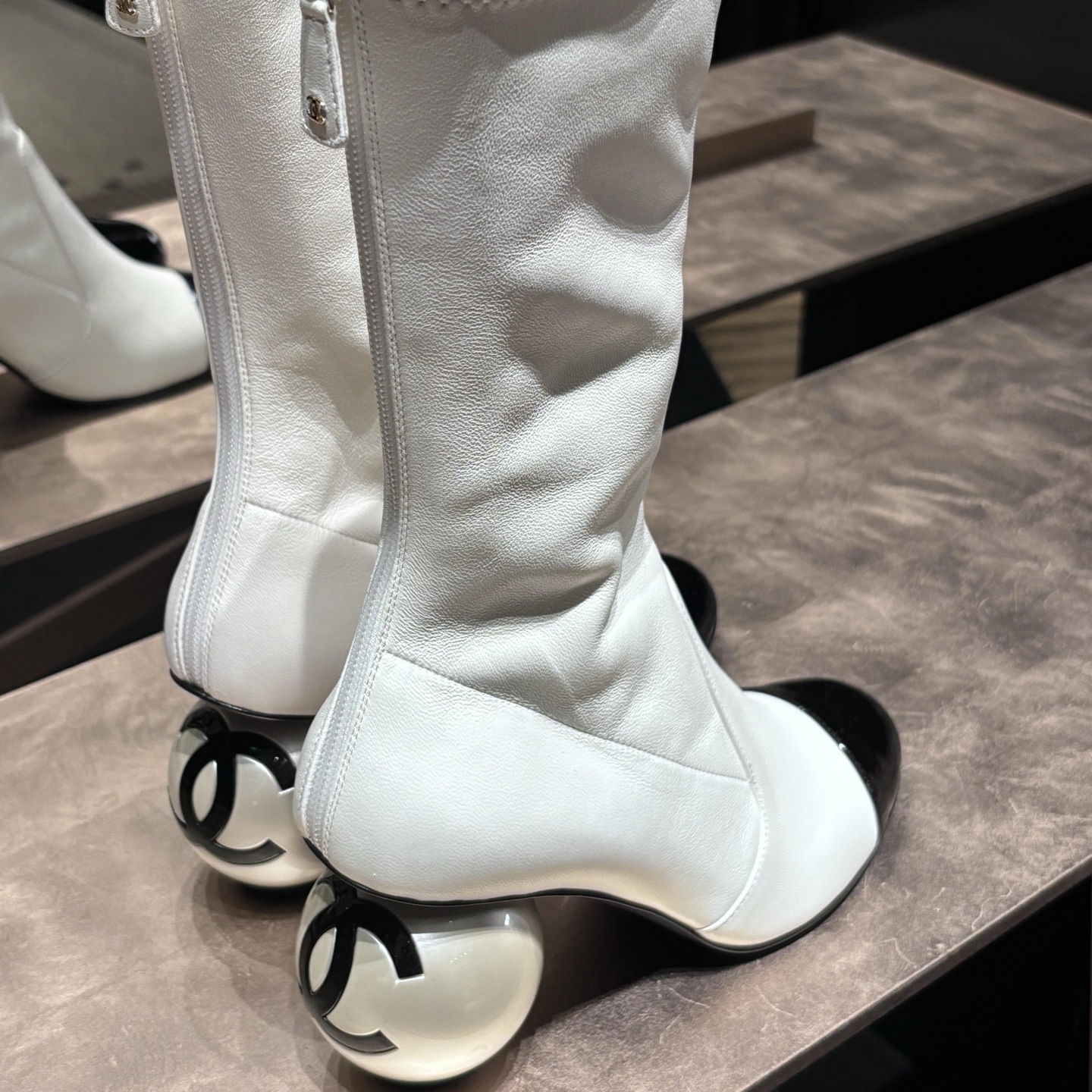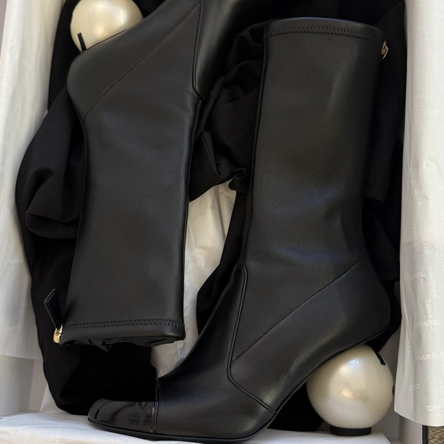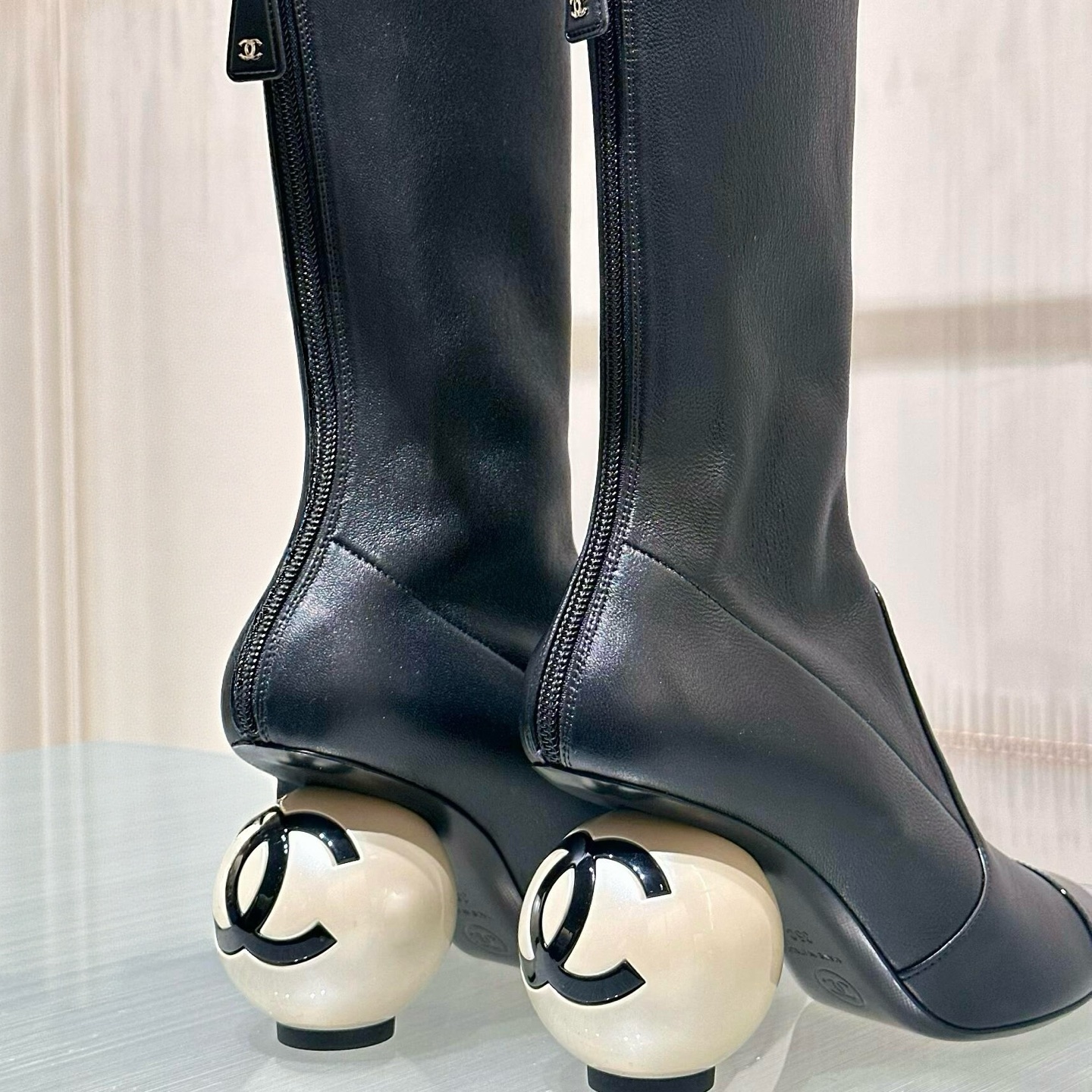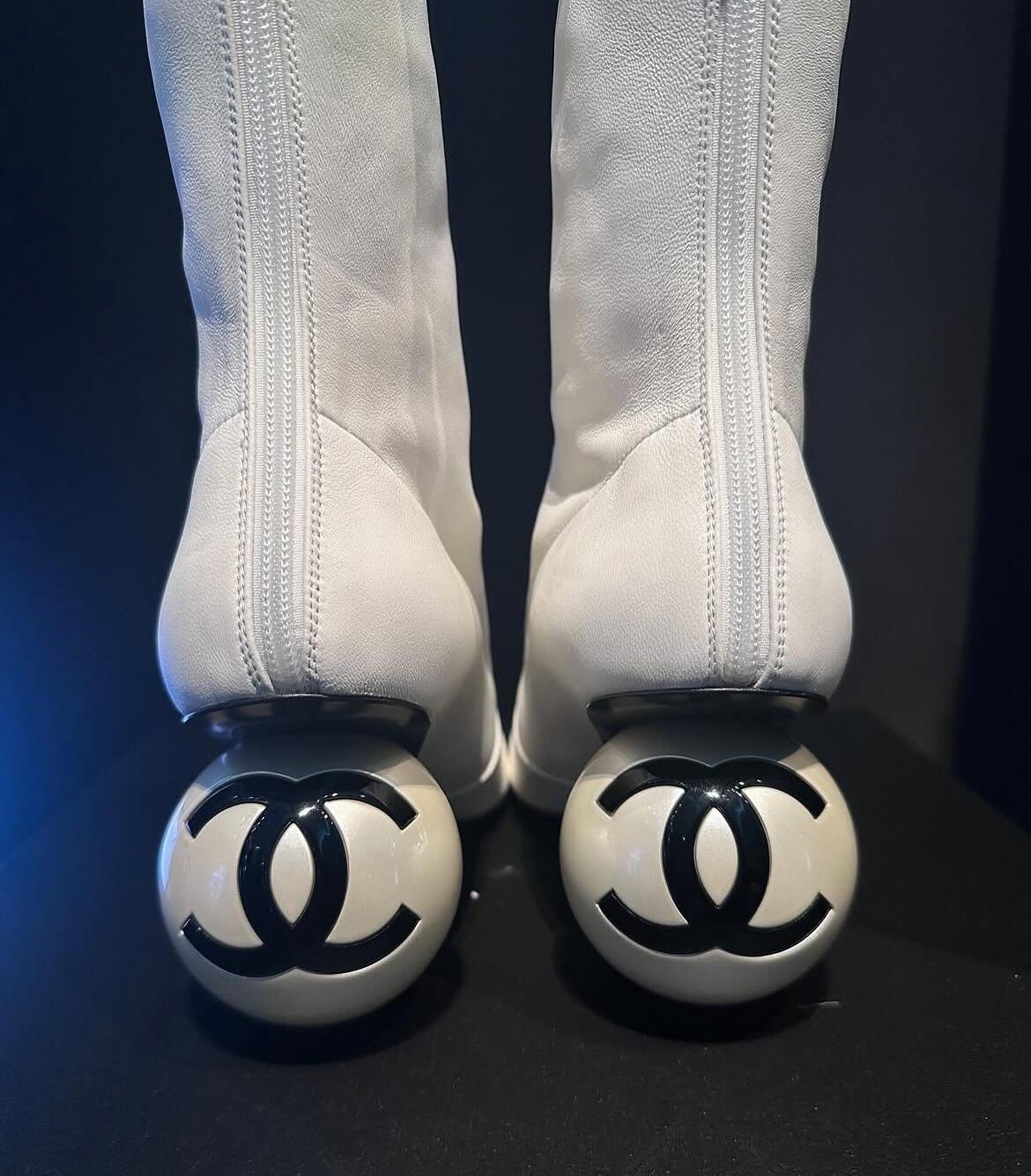 NIGO Chanel Women's Fall/Winter Fashion Classic Color Block Leather Round Toe Slip On Zipper Pearl Heel High Boots Pearl Boots Shoes #nigo330870