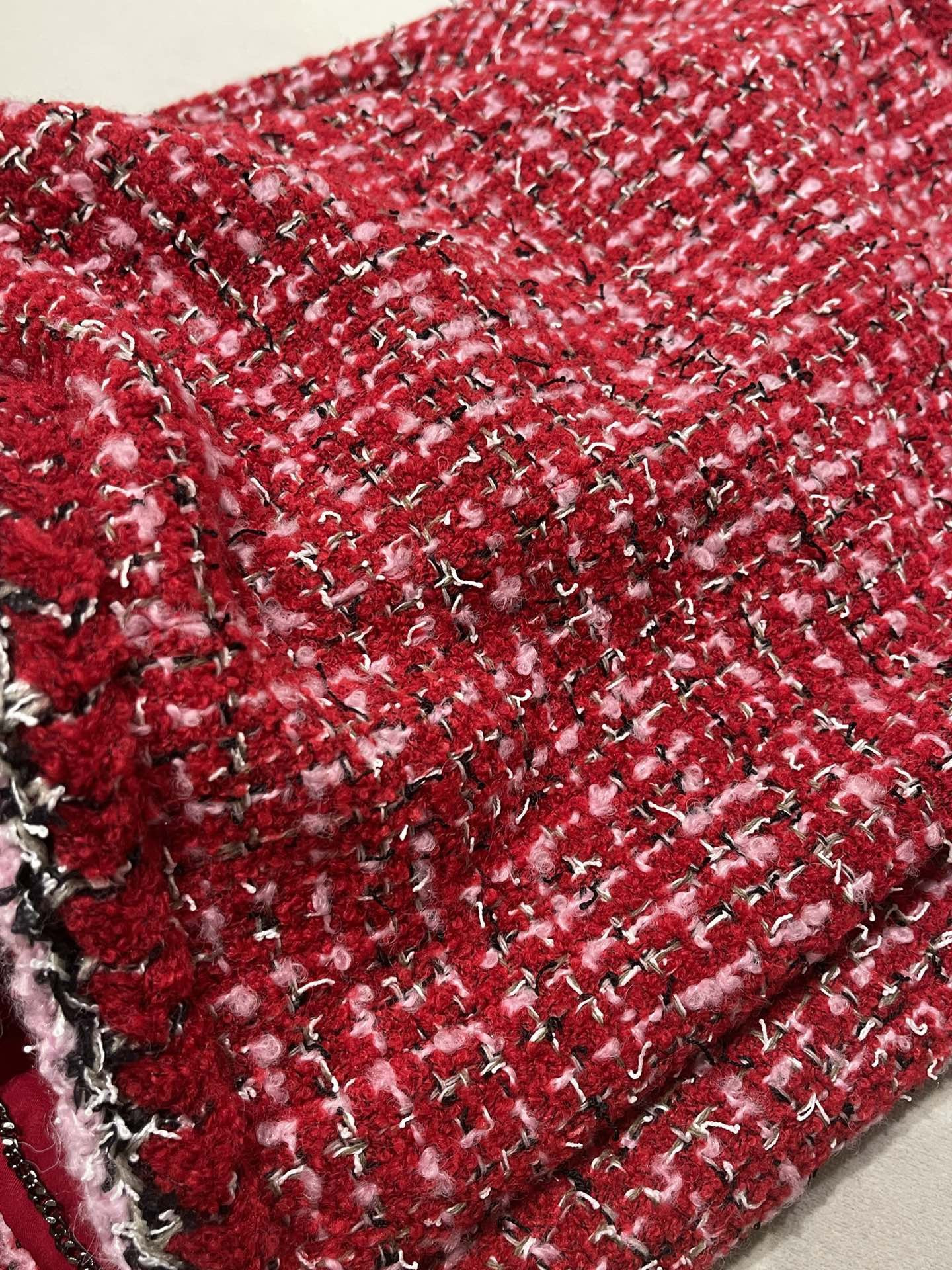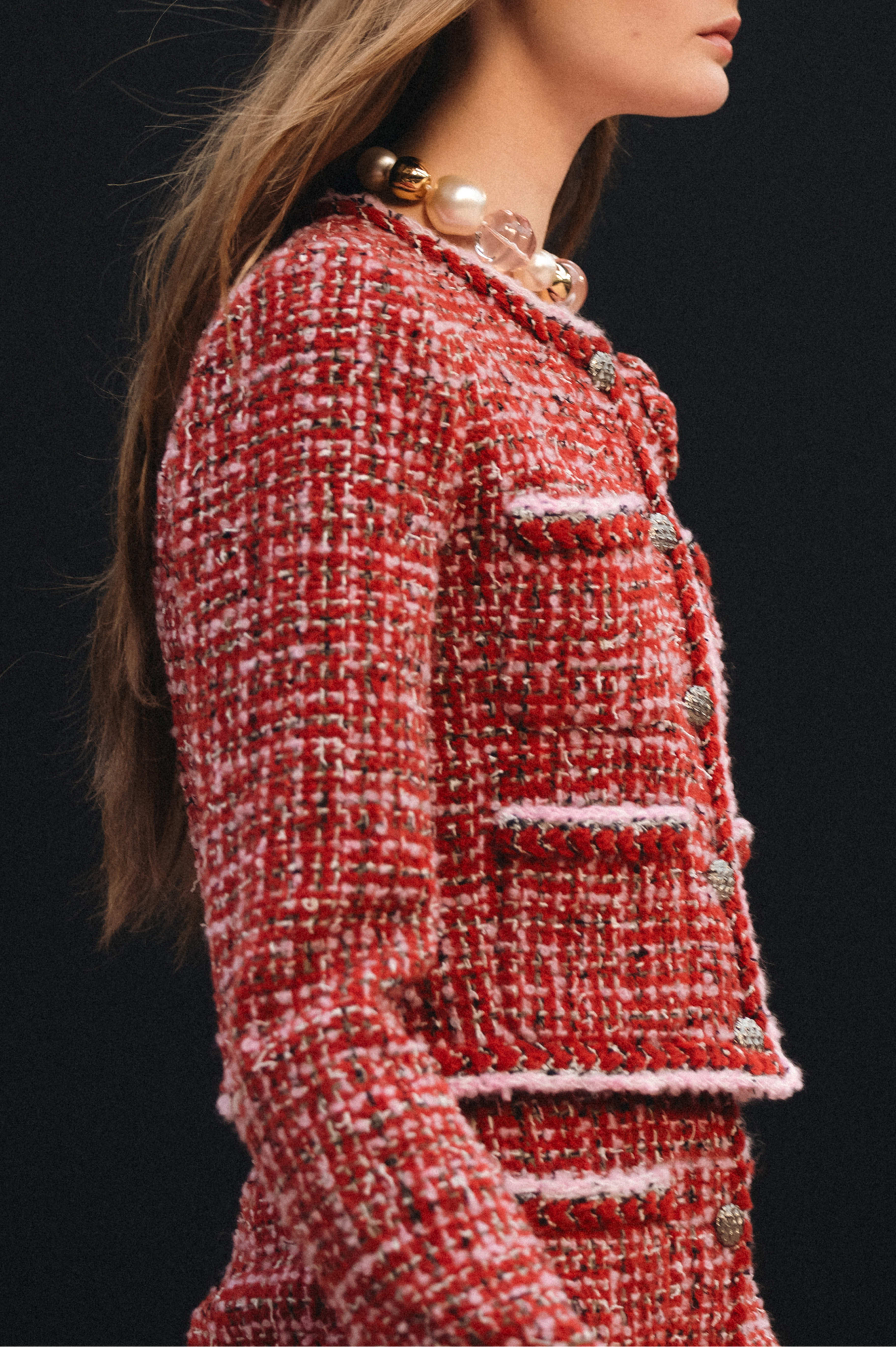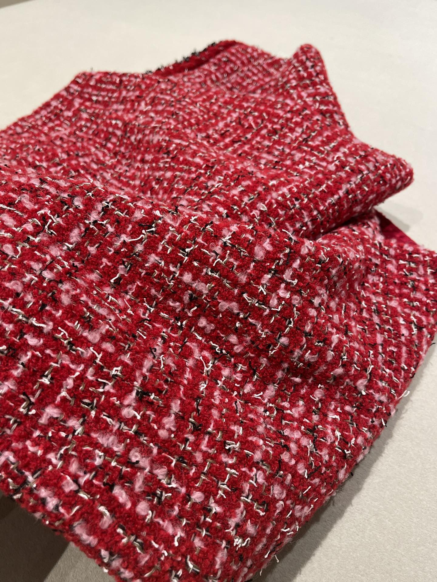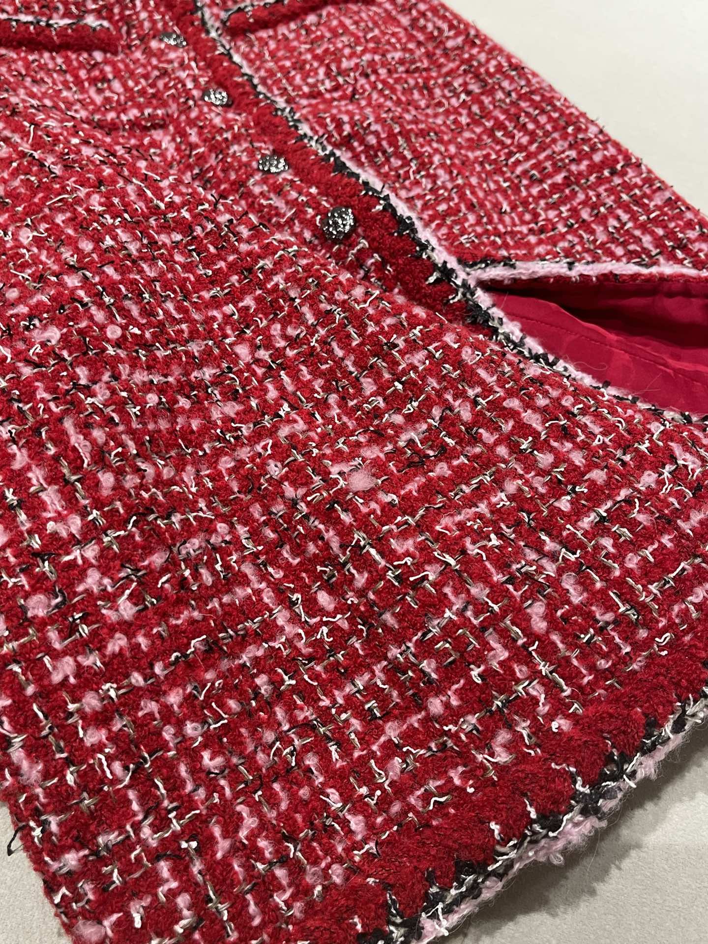 This Chanel clothing showcases the brand's exceptional craftsmanship and attention to detail. Crafted from premium tweed, in a stunning red colorway, this piece combines timeless luxury with modern style.